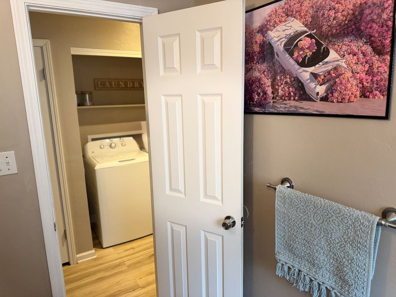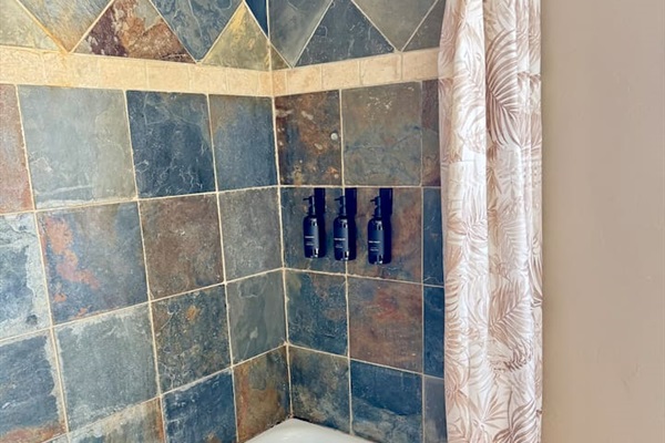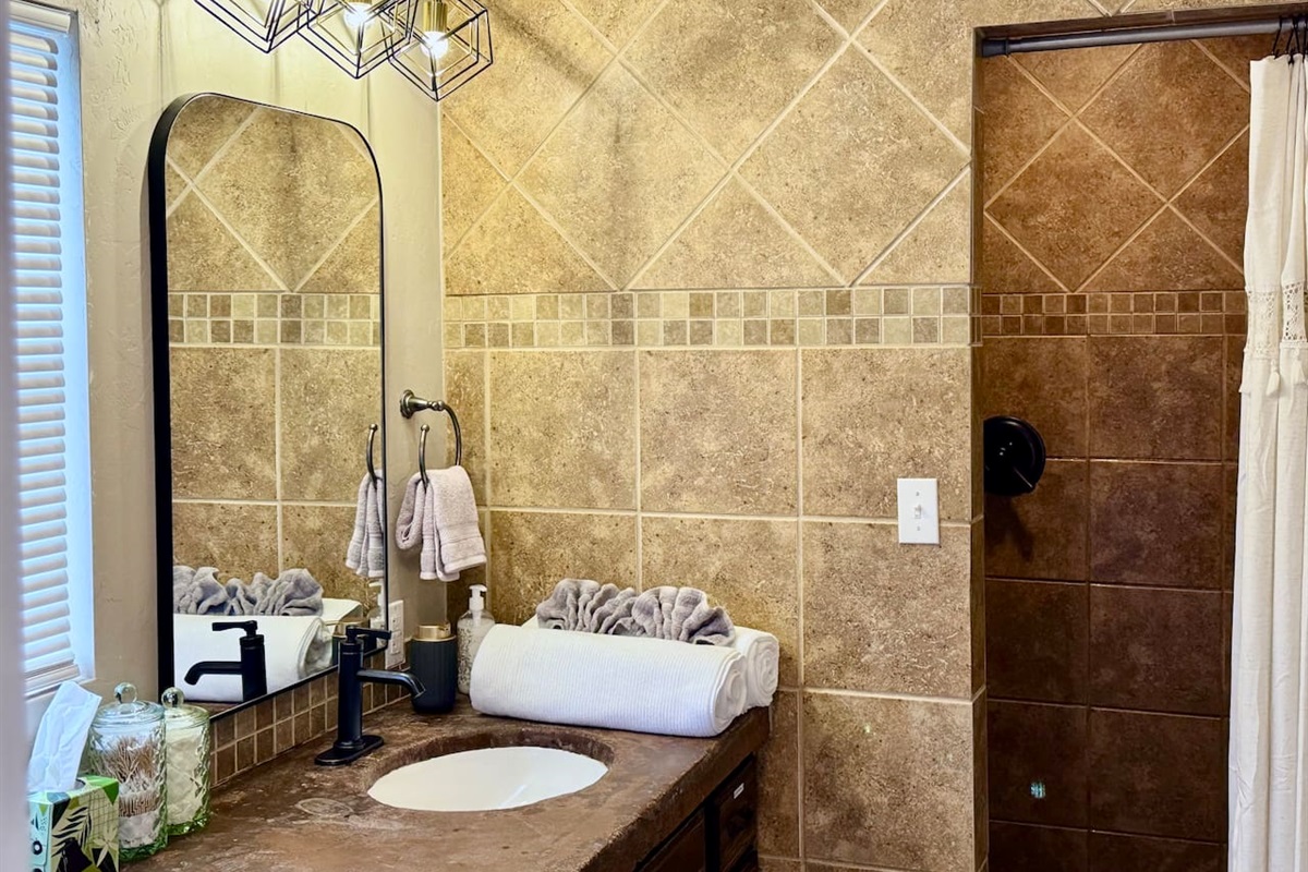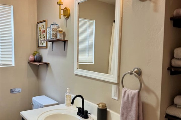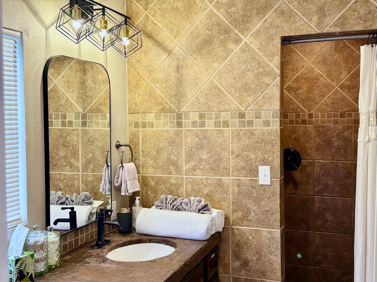 Enjoy the provided soap, soft towels, shampoo, essentials, and a hair