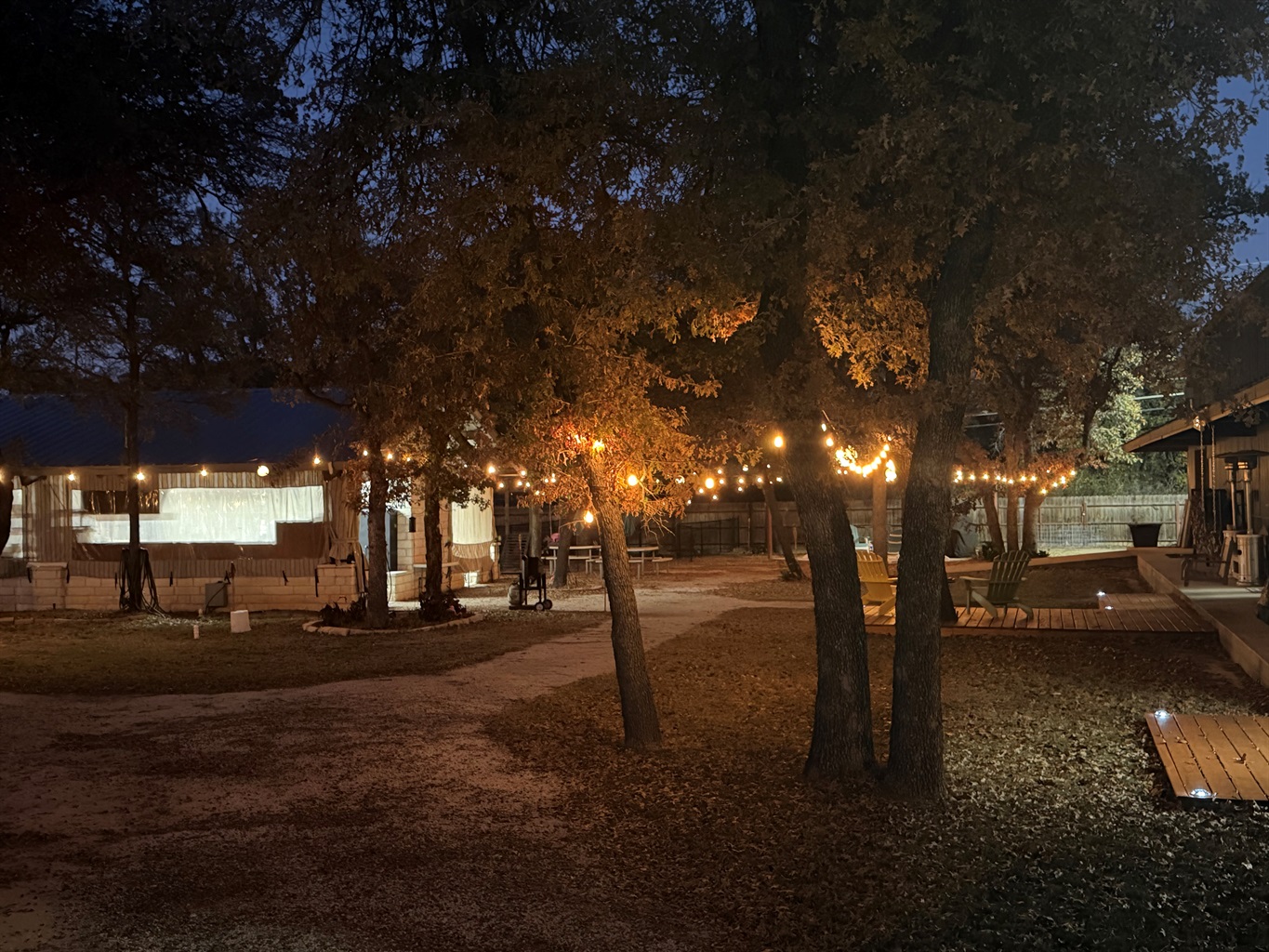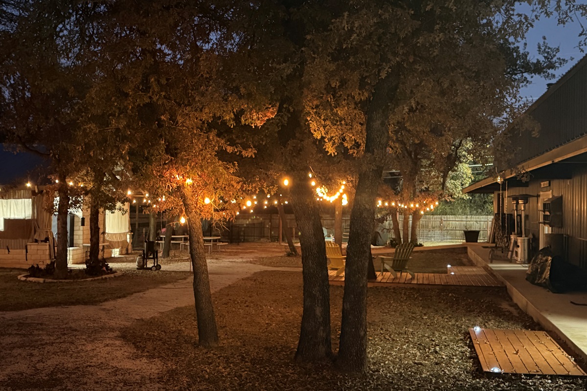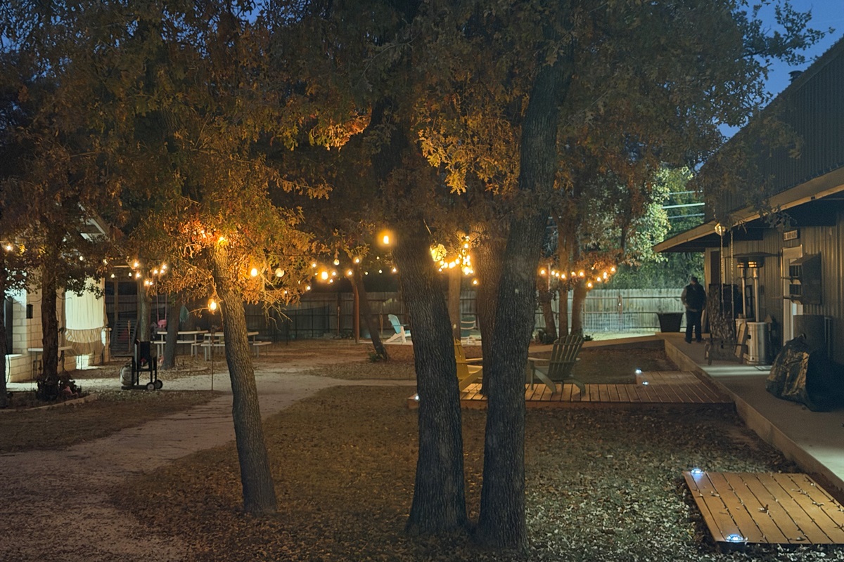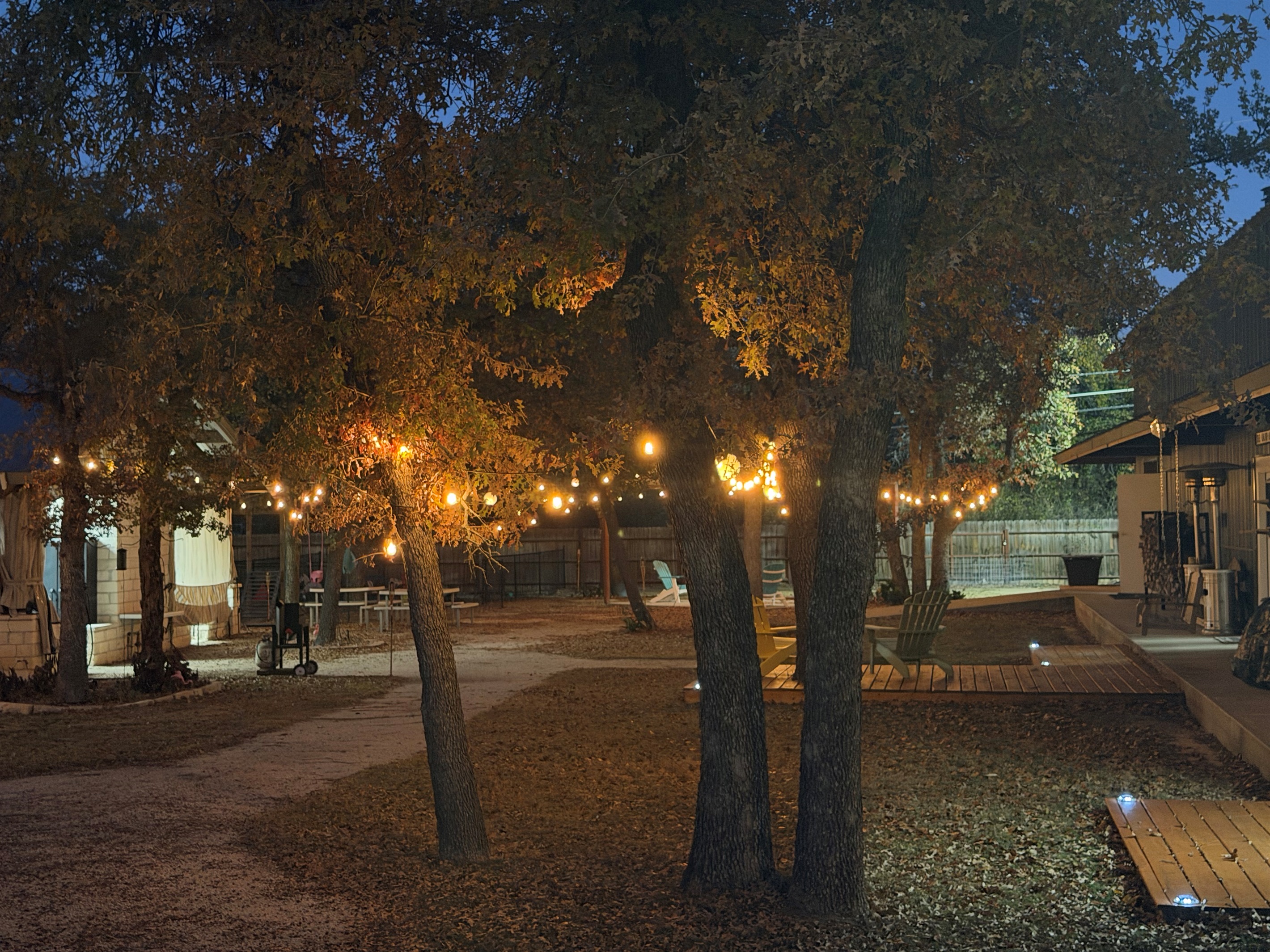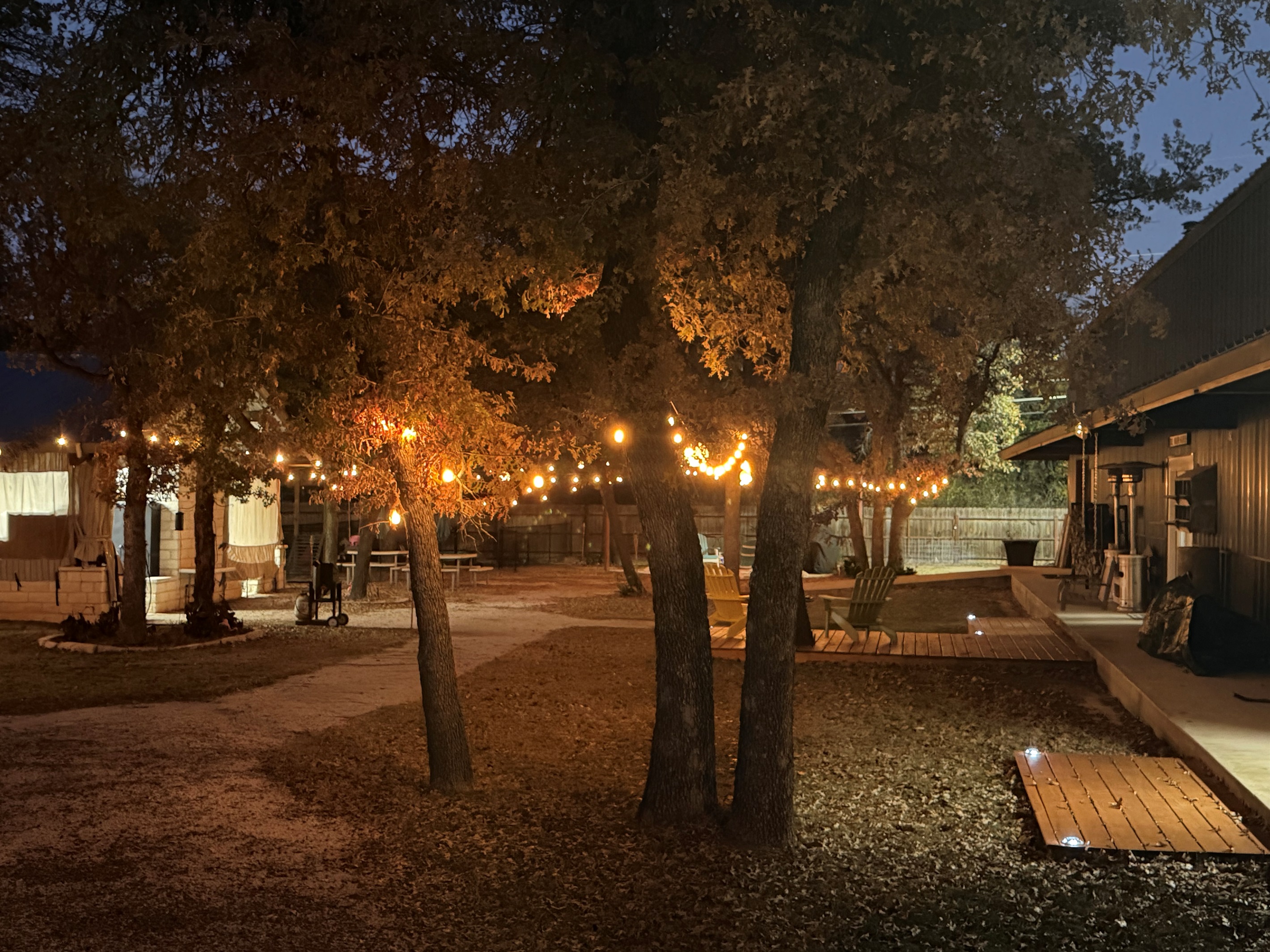 Outdoor Lighting: Extensive string lighting throughout courtyard