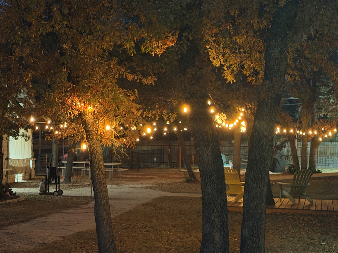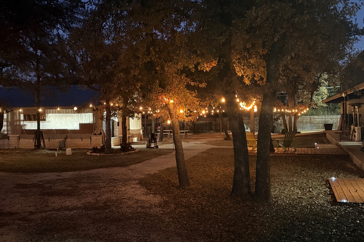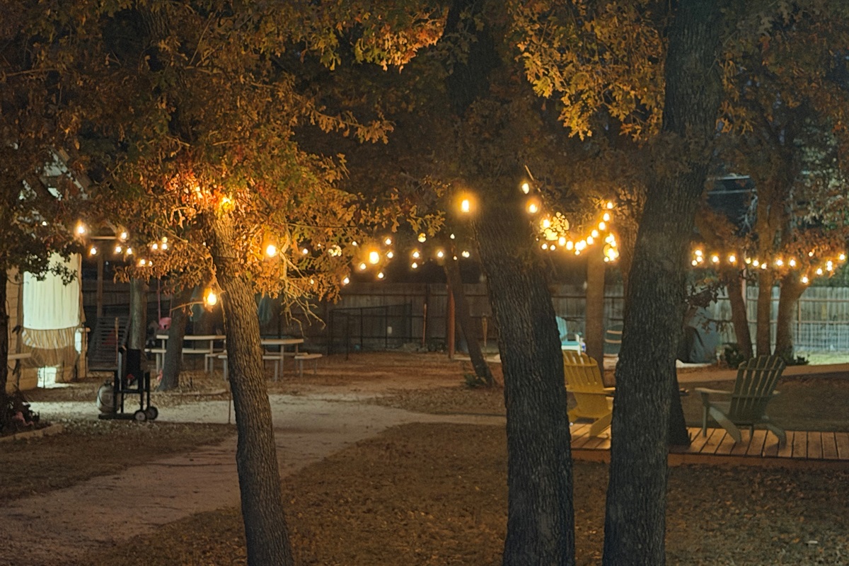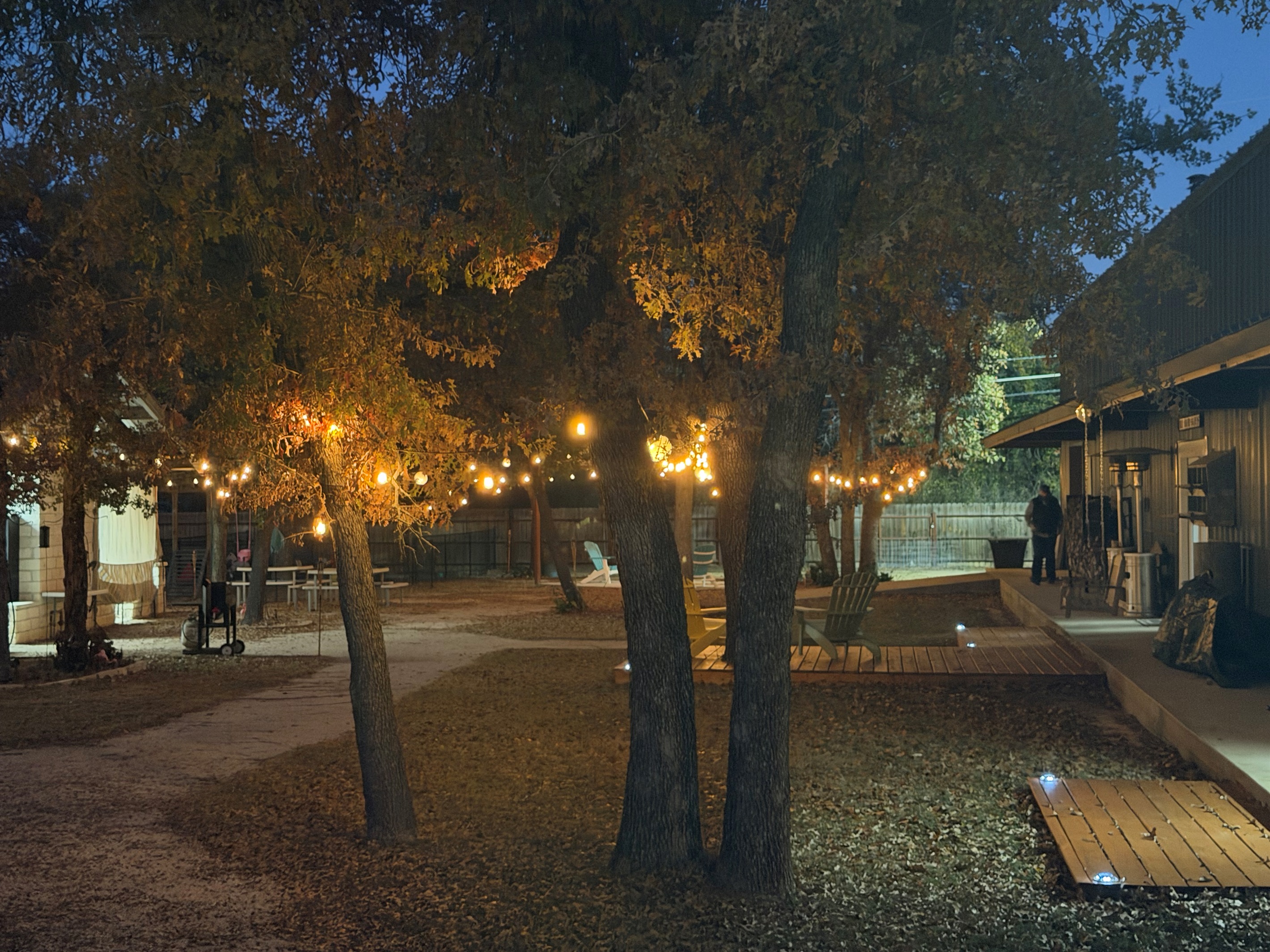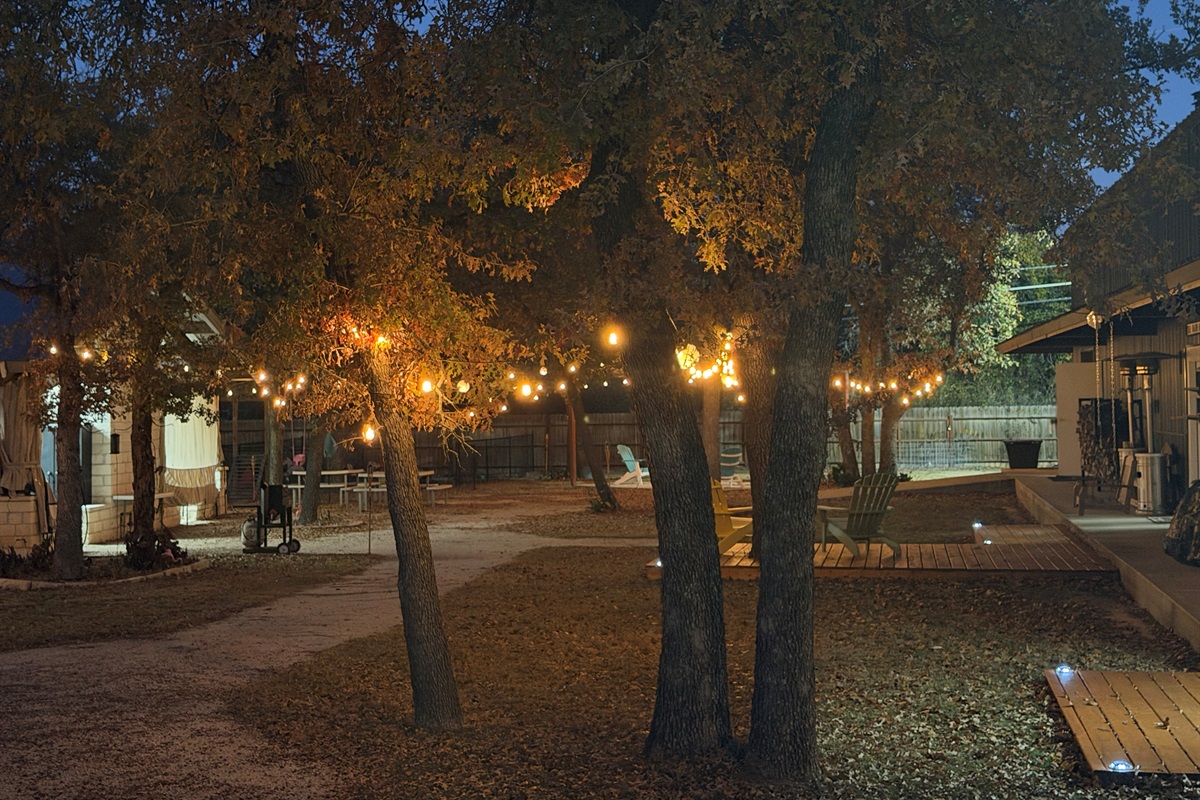 Outdoor Lighting: Extensive string lighting throughout courtyard