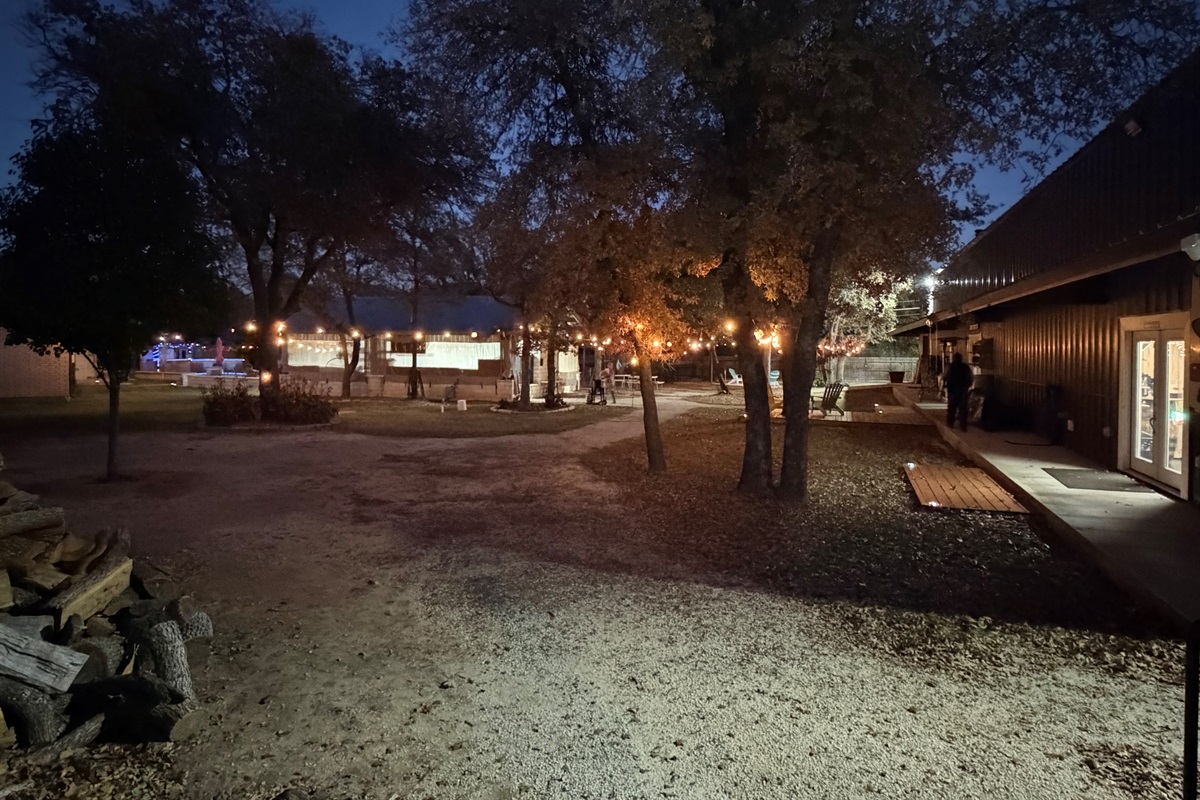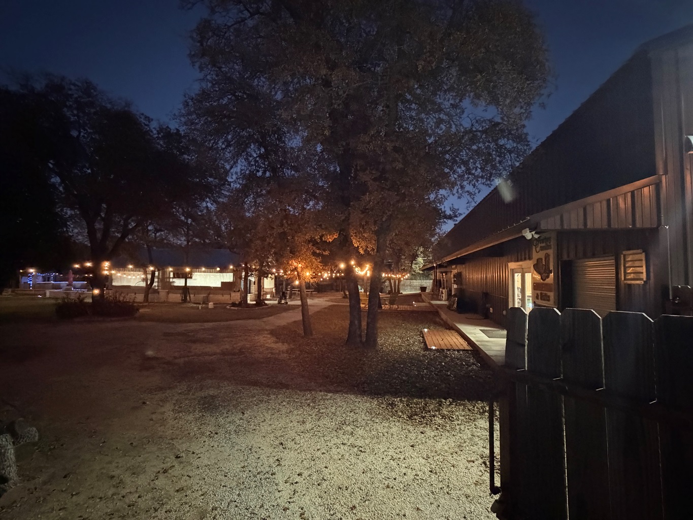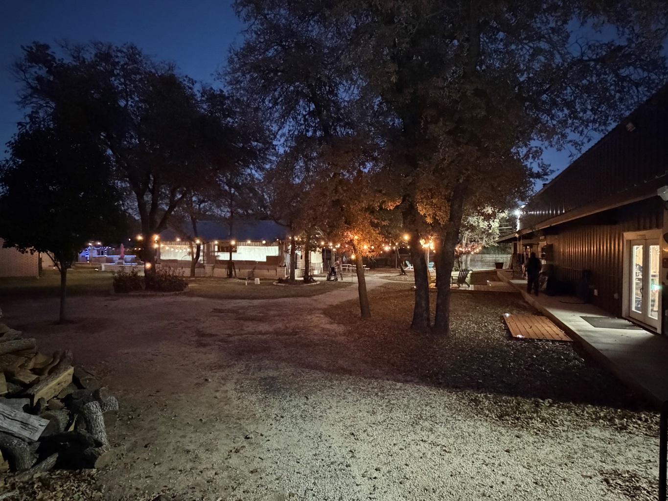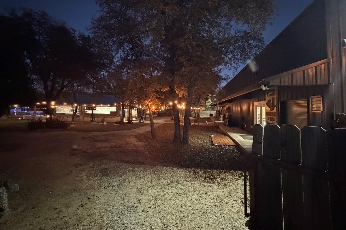 Outdoor Lighting: Extensive string lighting throughout courtyard