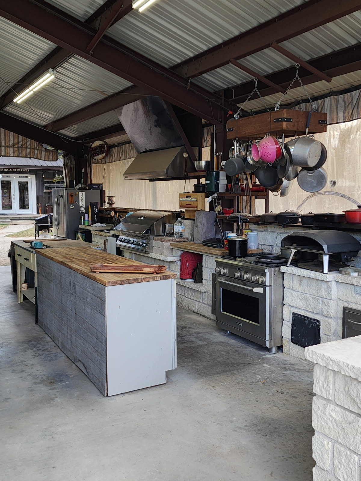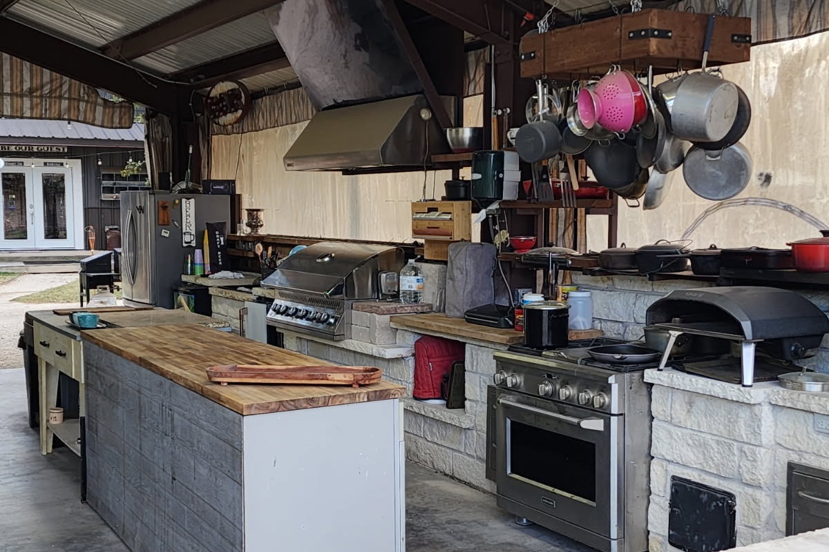 The space opens to the main living area, keeping the group connected while preparing meals.