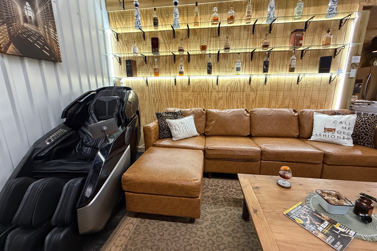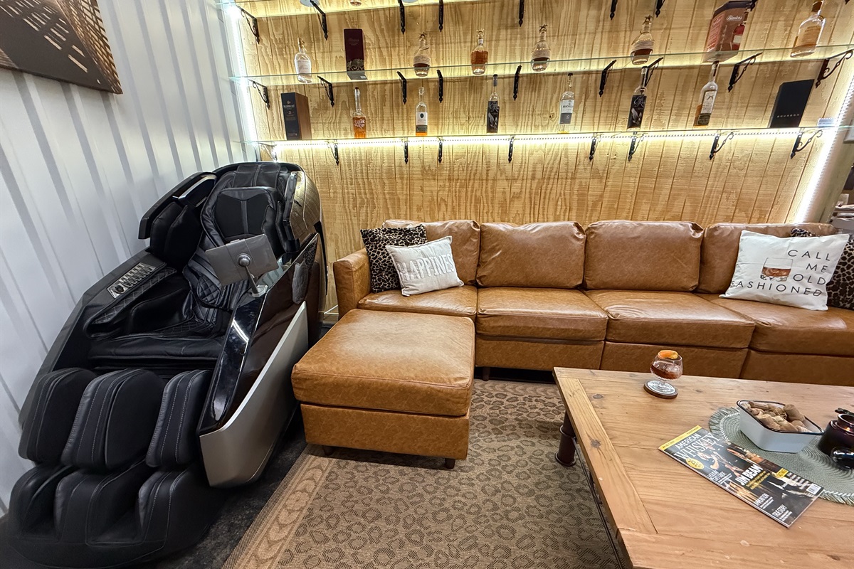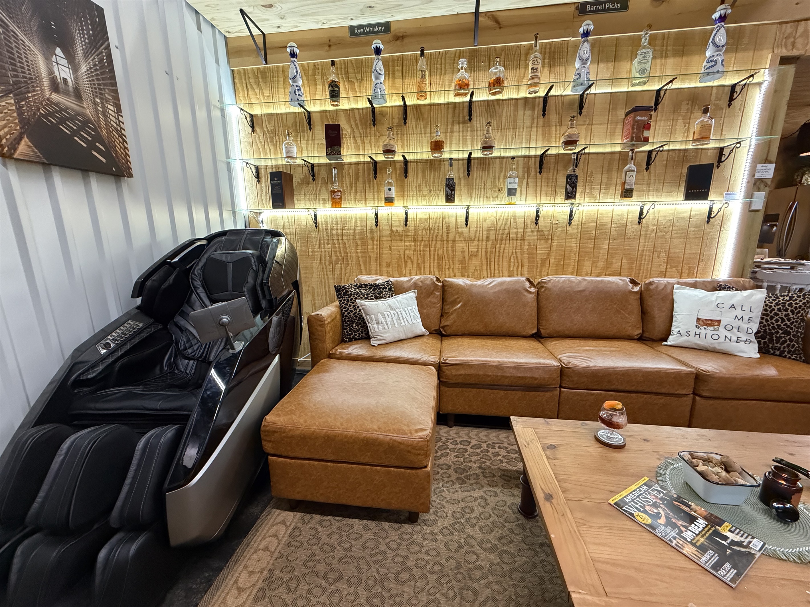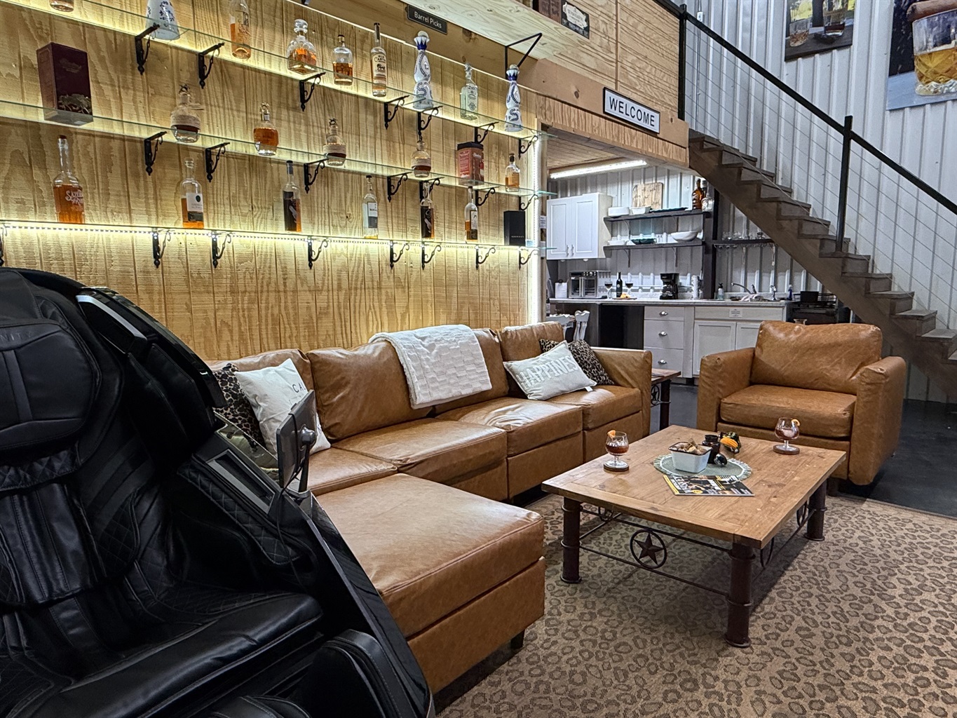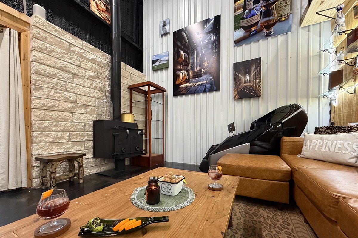 The industrial-chic design pairs black painted ceilings and exposed ductwork with warm wood accents and corrugated metal walls. Photography and artwork celebrating bourbon culture adorns the walls, creating an authentic speakeasy-meets-modern-lounge vibe. A large flat-screen TV, luxury massage chair, and rustic wood coffee table with industrial pipe legs complete this ultimate relaxation zone.