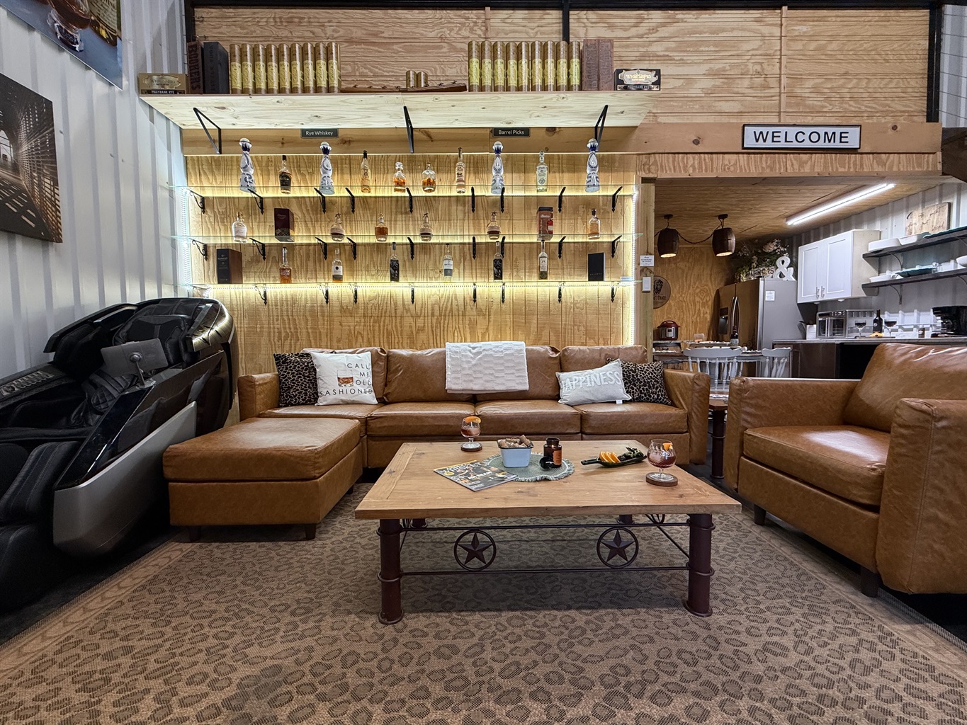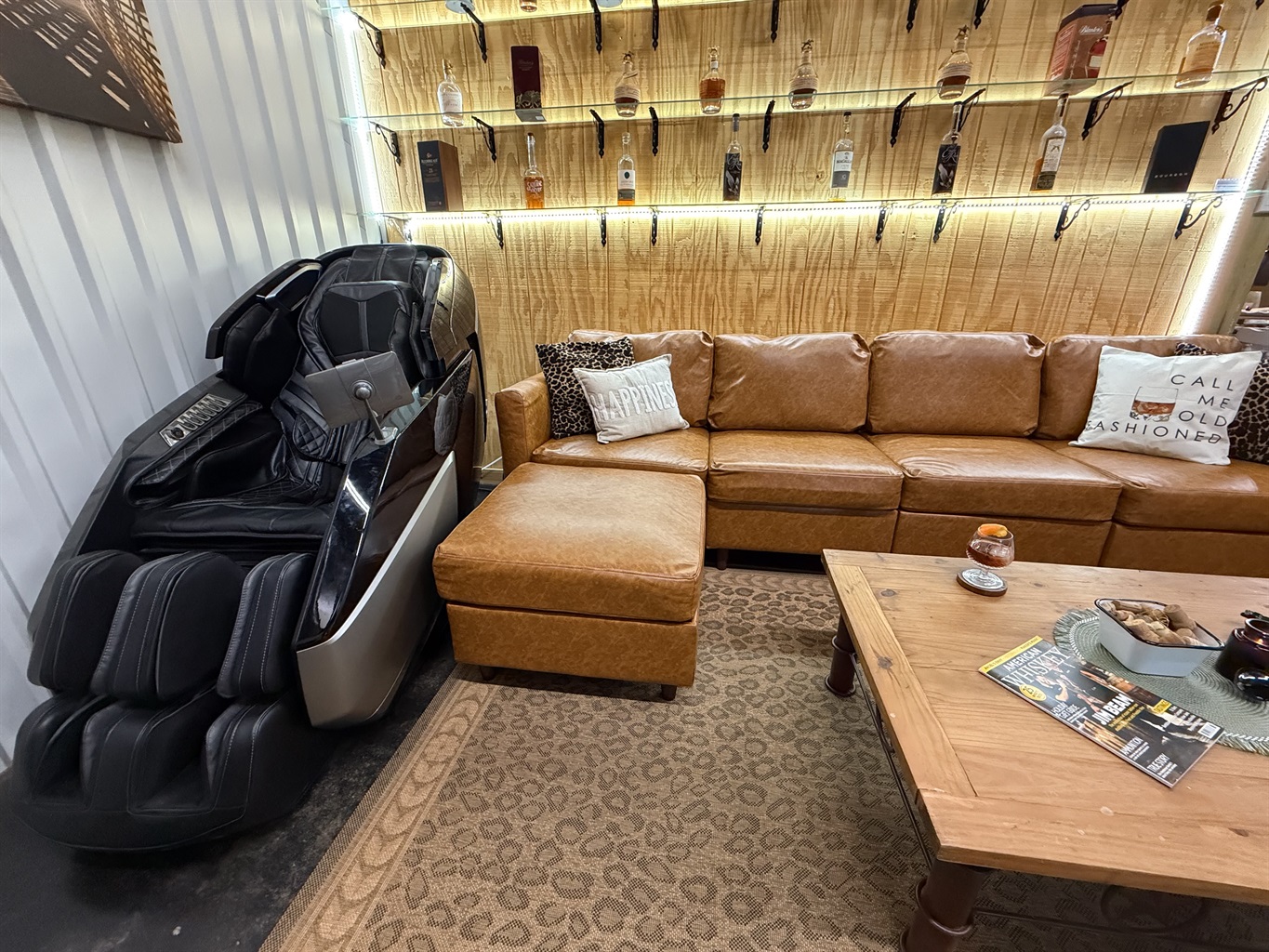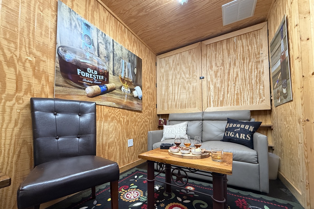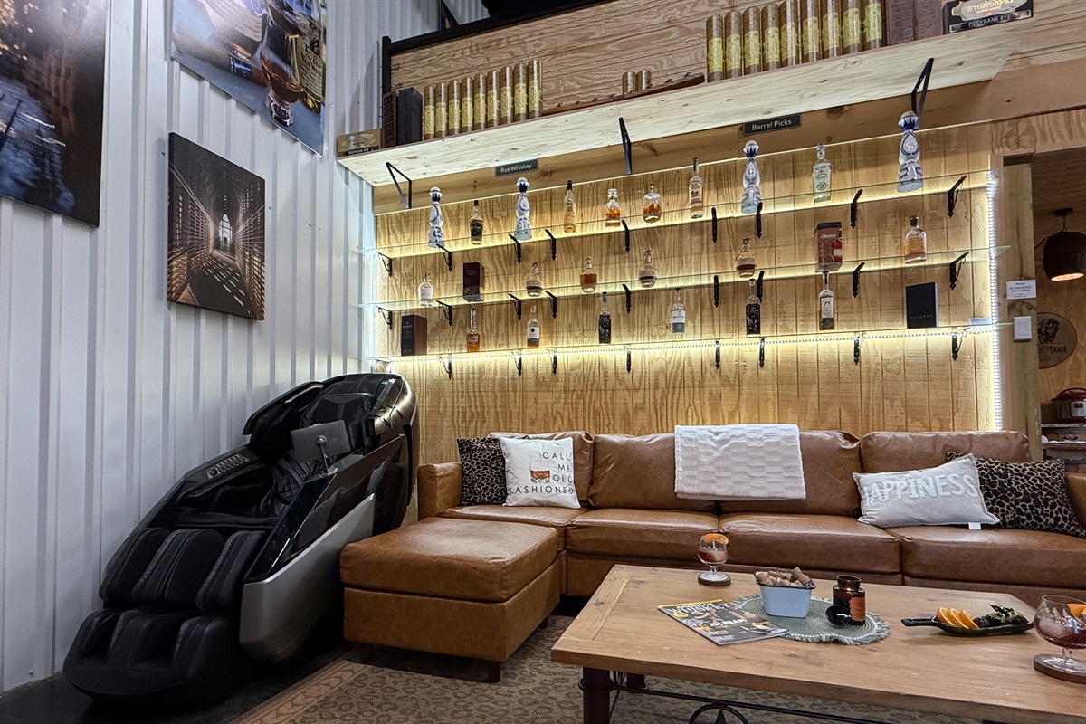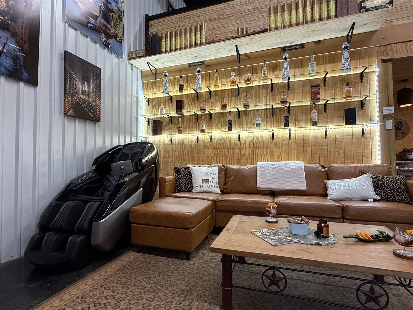 The industrial-chic design pairs black painted ceilings and exposed ductwork with warm wood accents and corrugated metal walls. Photography and artwork celebrating bourbon culture adorns the walls, creating an authentic speakeasy-meets-modern-lounge vibe. A large flat-screen TV, luxury massage chair, and rustic wood coffee table with industrial pipe legs complete this ultimate relaxation zone.