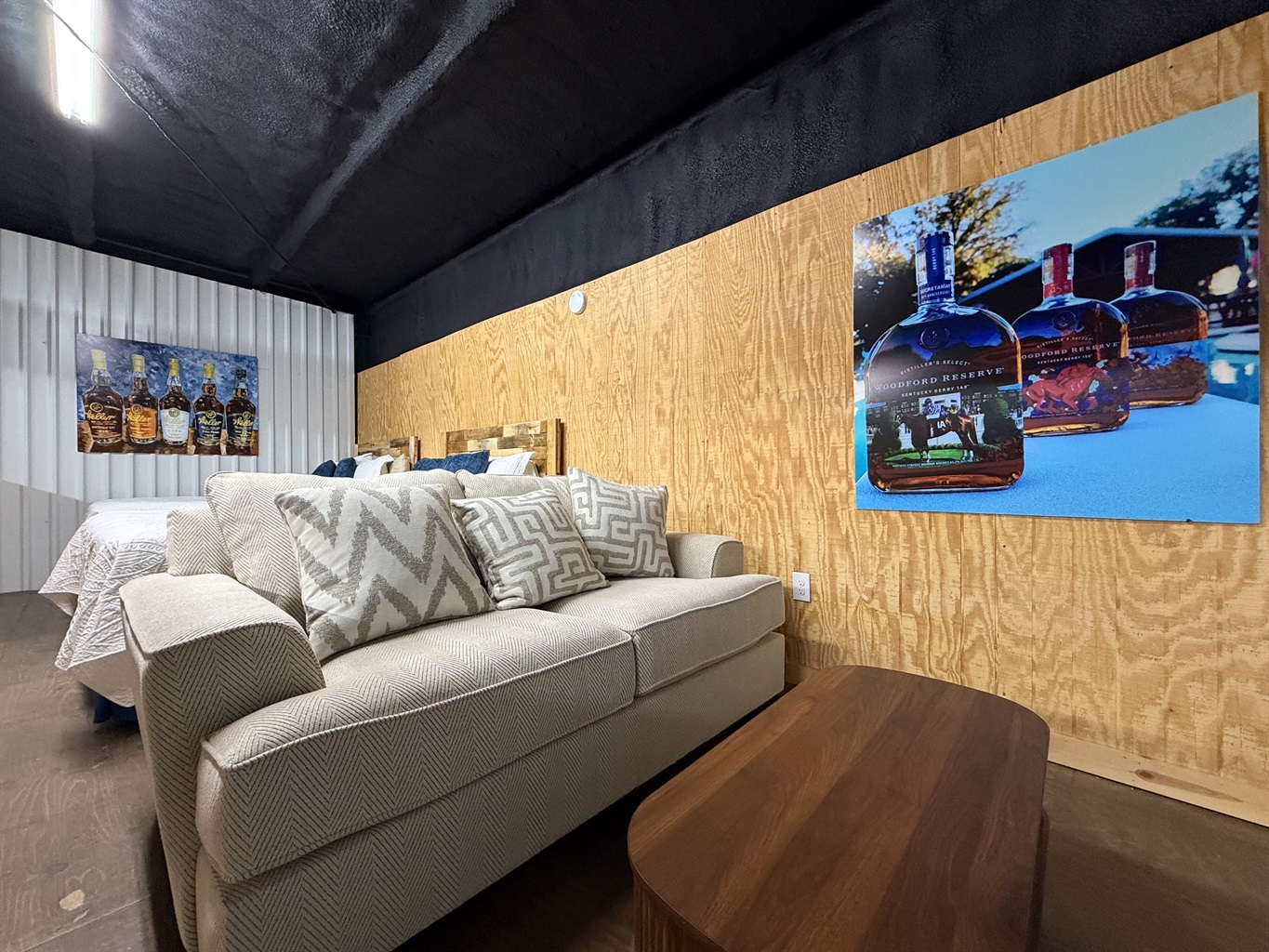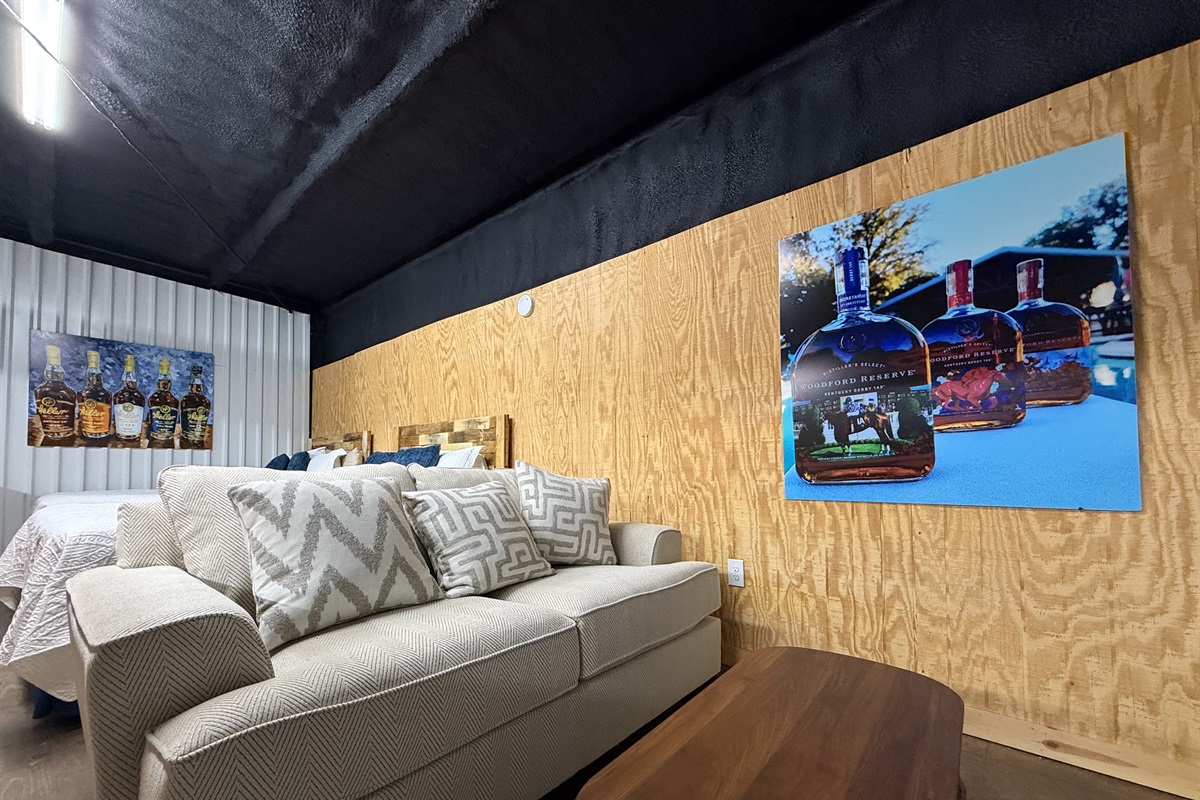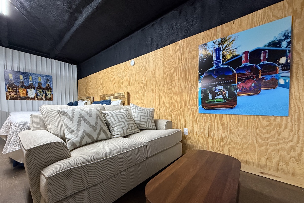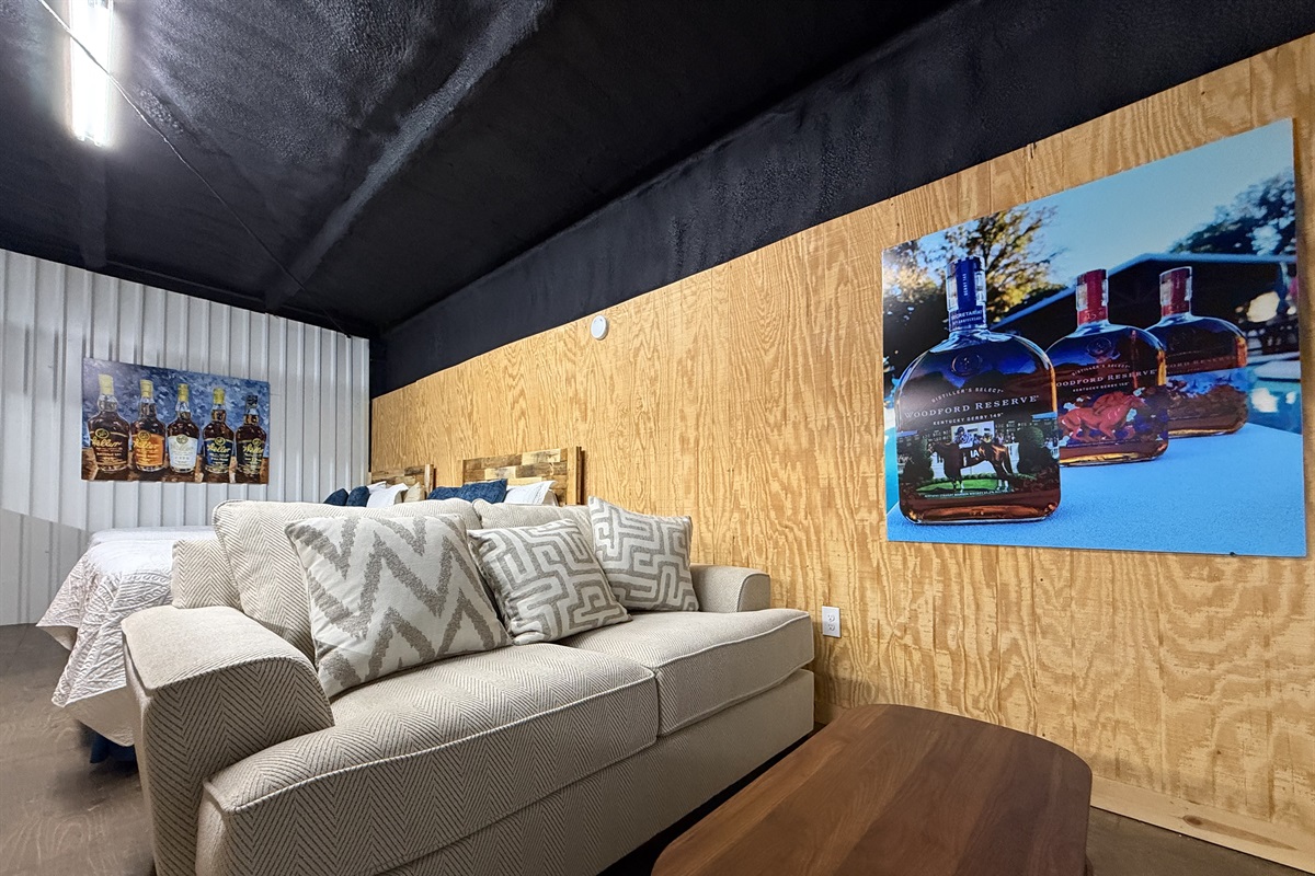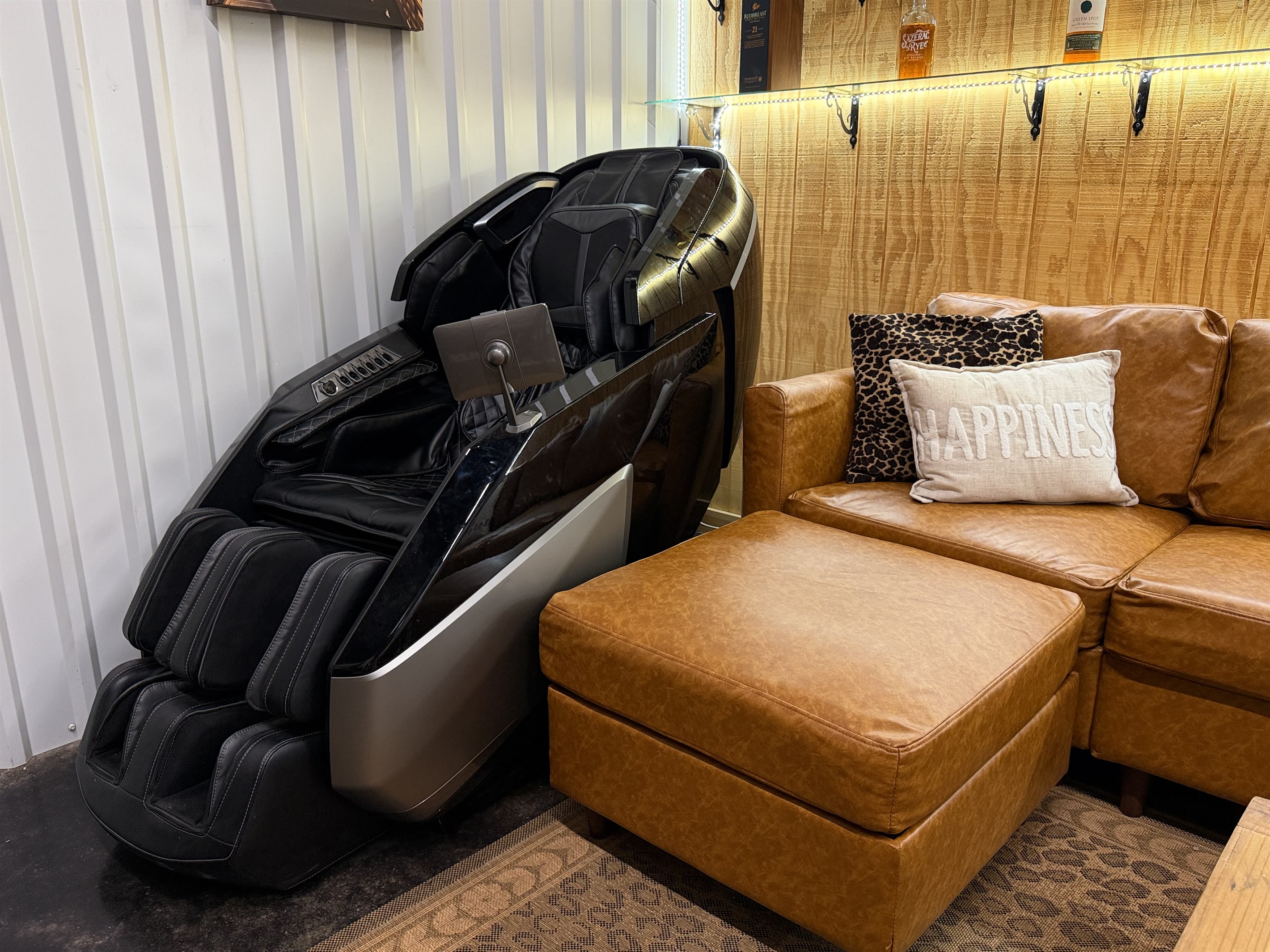 The industrial-chic design pairs black painted ceilings and exposed ductwork with warm wood accents and corrugated metal walls. Photography and artwork celebrating bourbon culture adorns the walls, creating an authentic speakeasy-meets-modern-lounge vibe. A large flat-screen TV, luxury massage chair, and rustic wood coffee table with industrial pipe legs complete this ultimate relaxation zone.