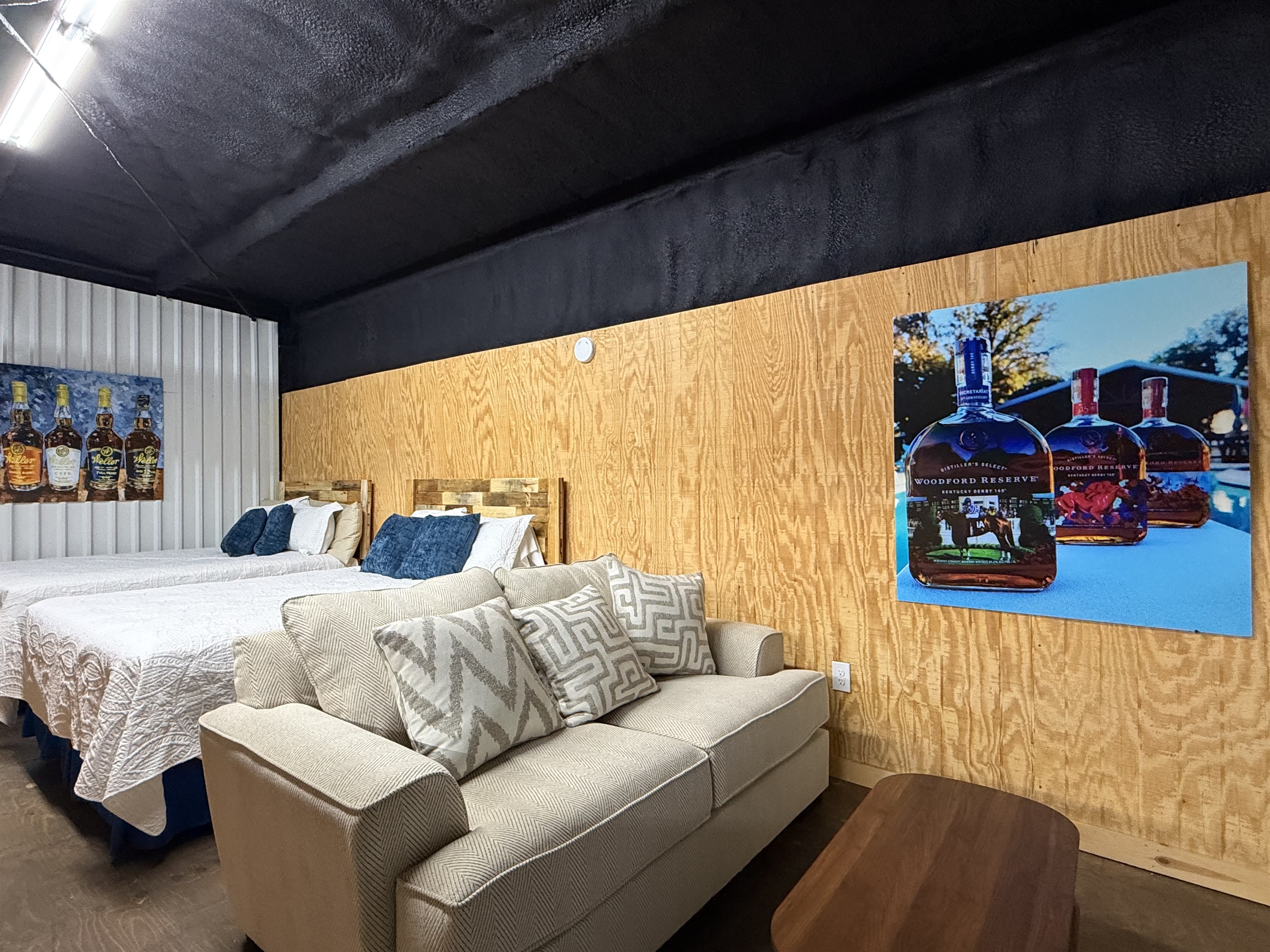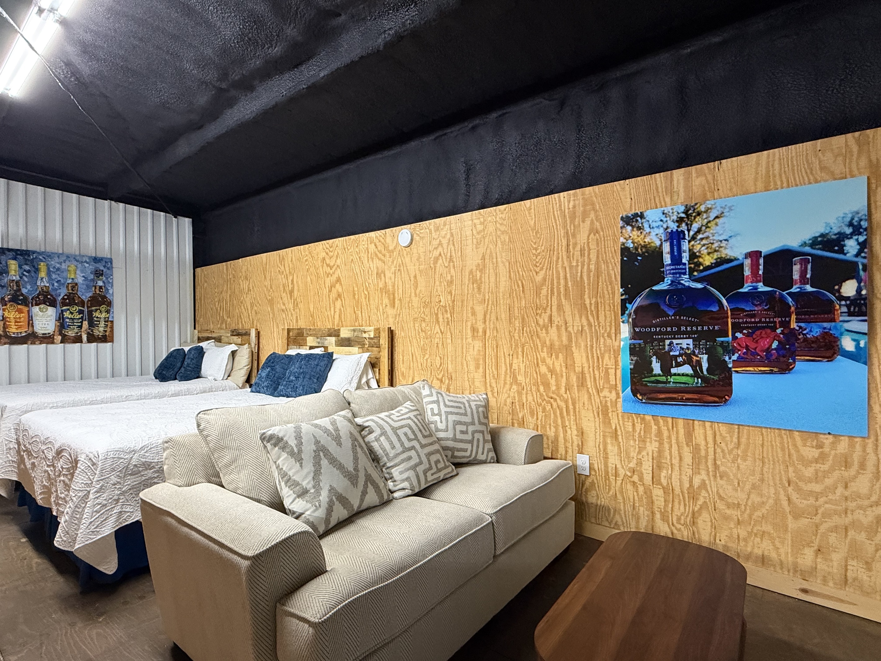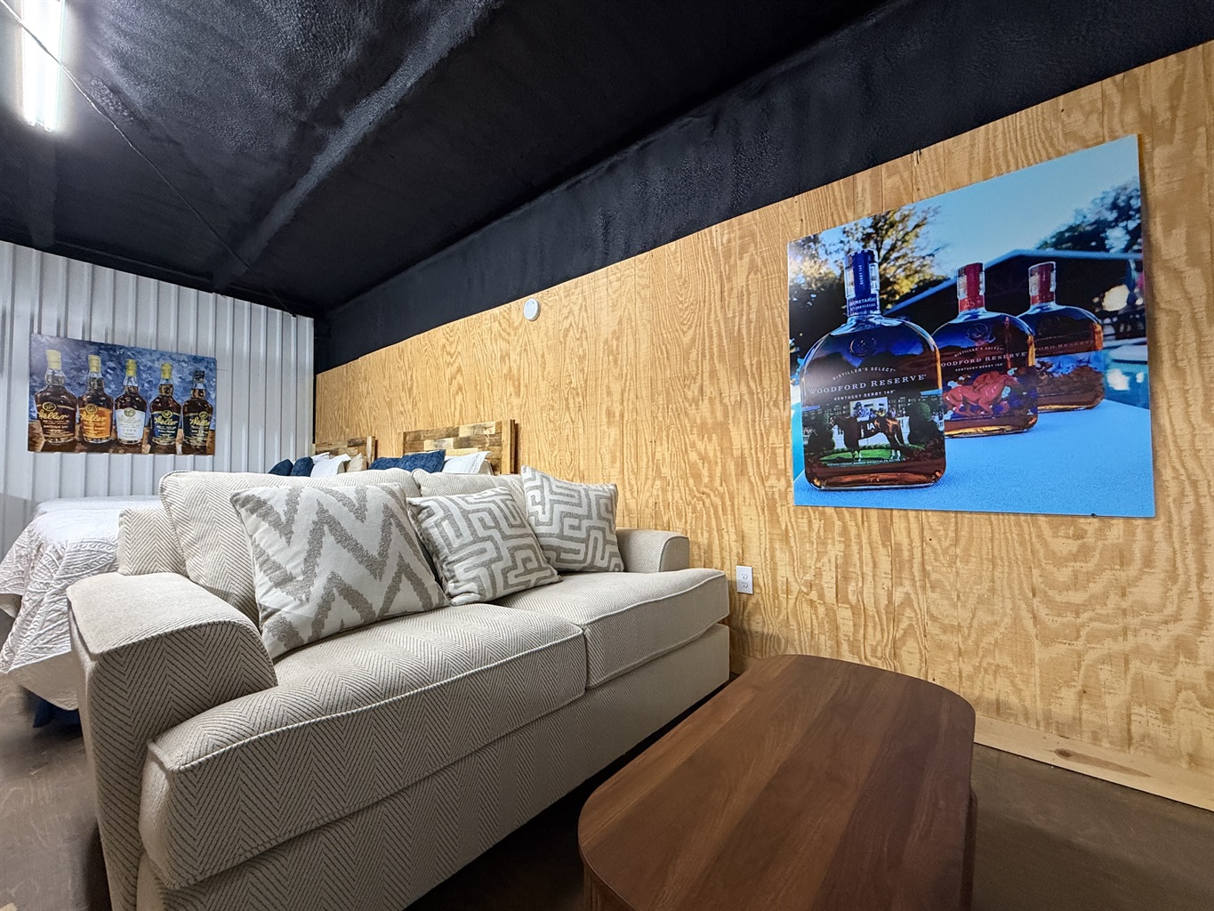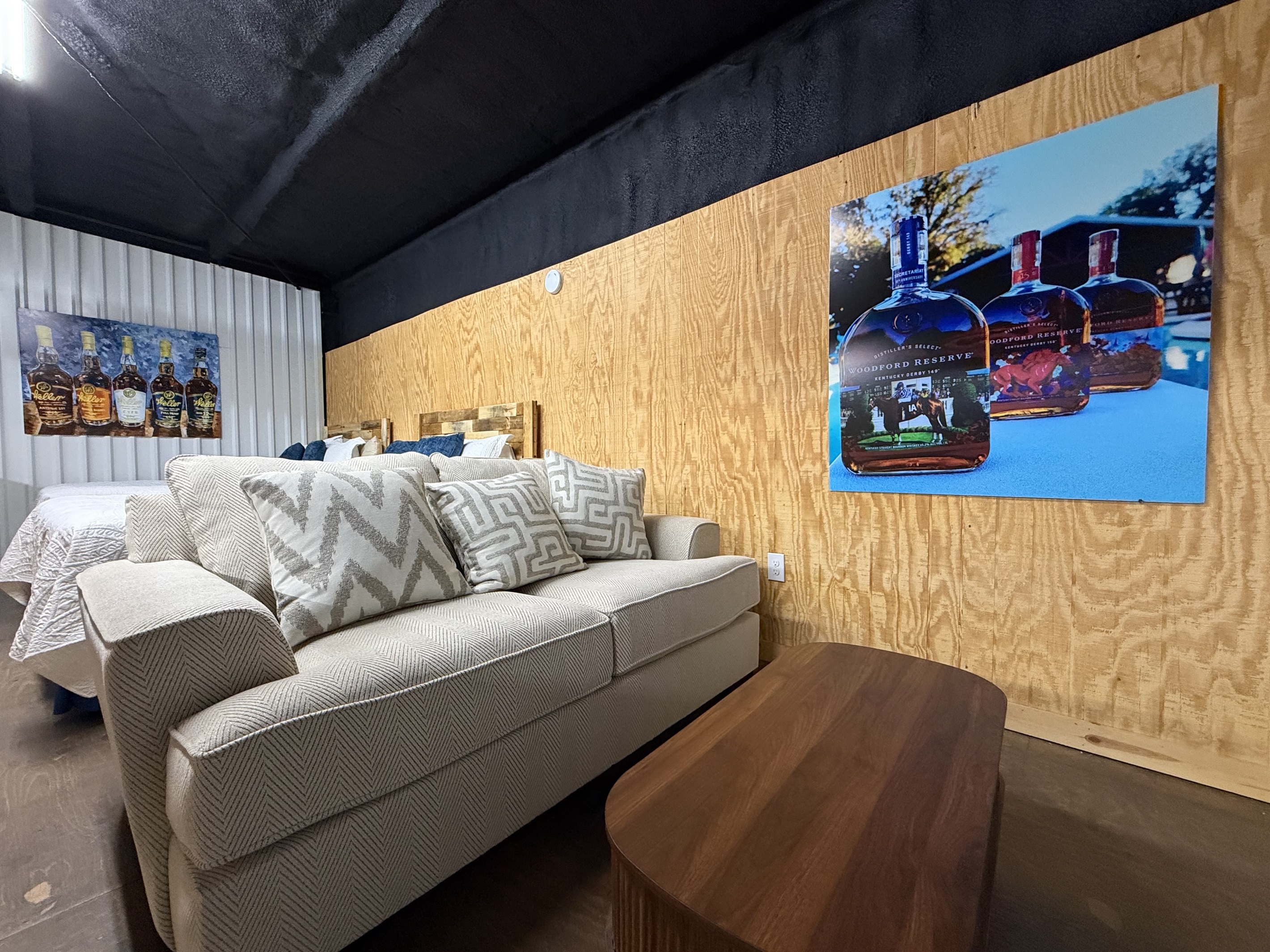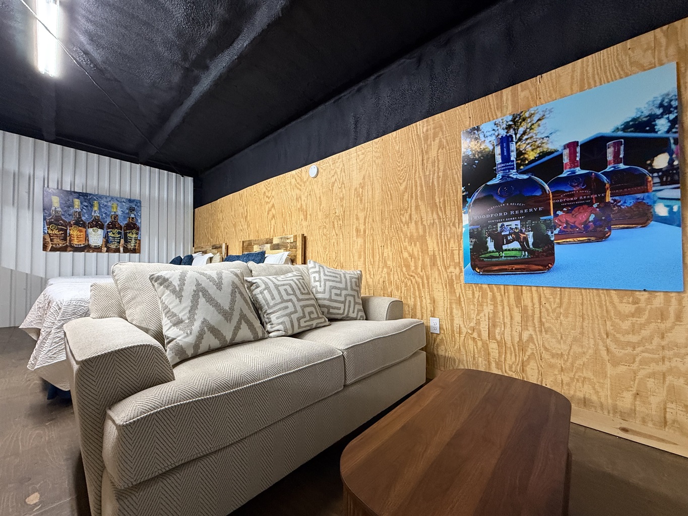 The industrial-chic design pairs black painted ceilings and exposed ductwork with warm wood accents and corrugated metal walls. Photography and artwork celebrating bourbon culture adorns the walls, creating an authentic speakeasy-meets-modern-lounge vibe. A large flat-screen TV, luxury massage chair, and rustic wood coffee table with industrial pipe legs complete this ultimate relaxation zone.