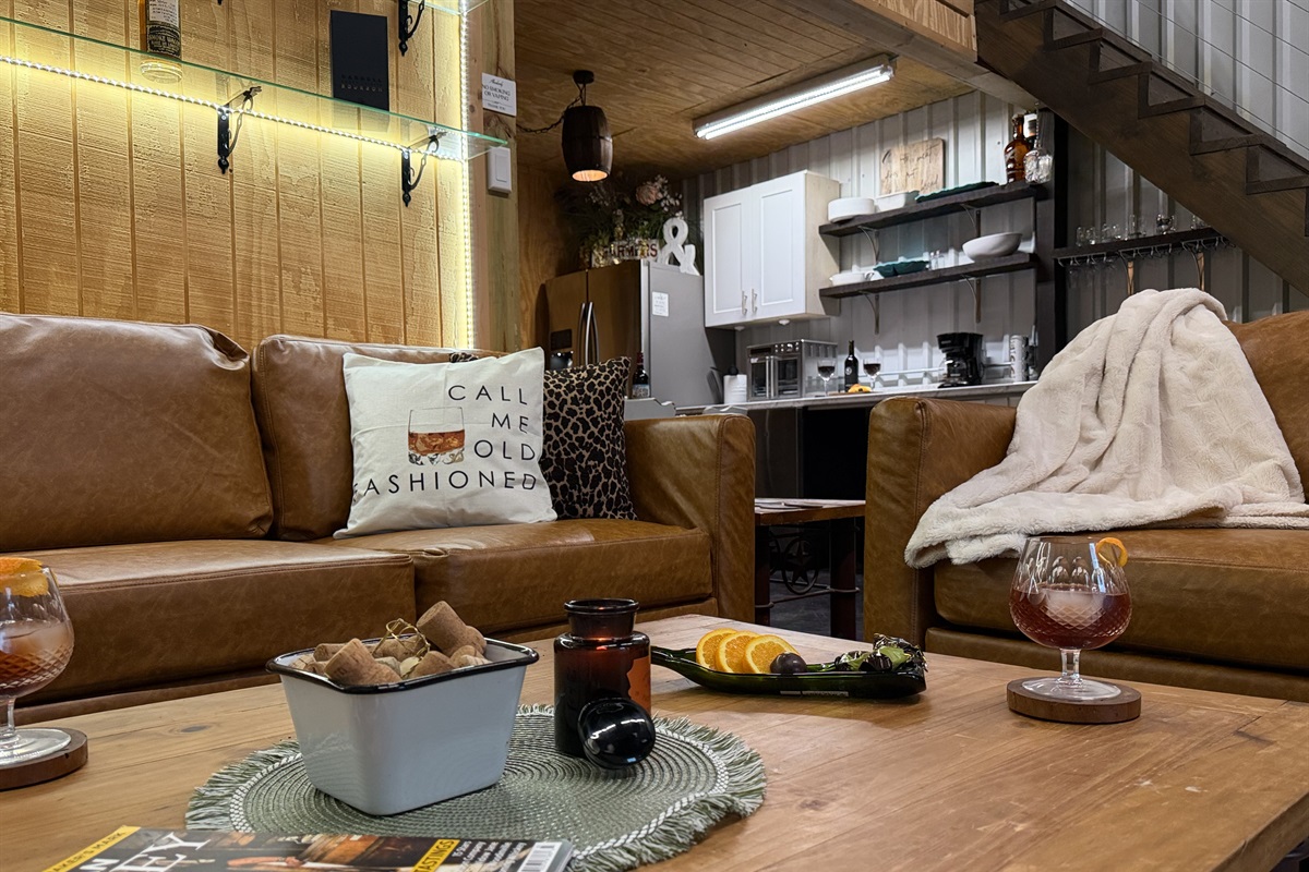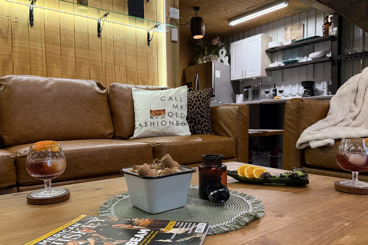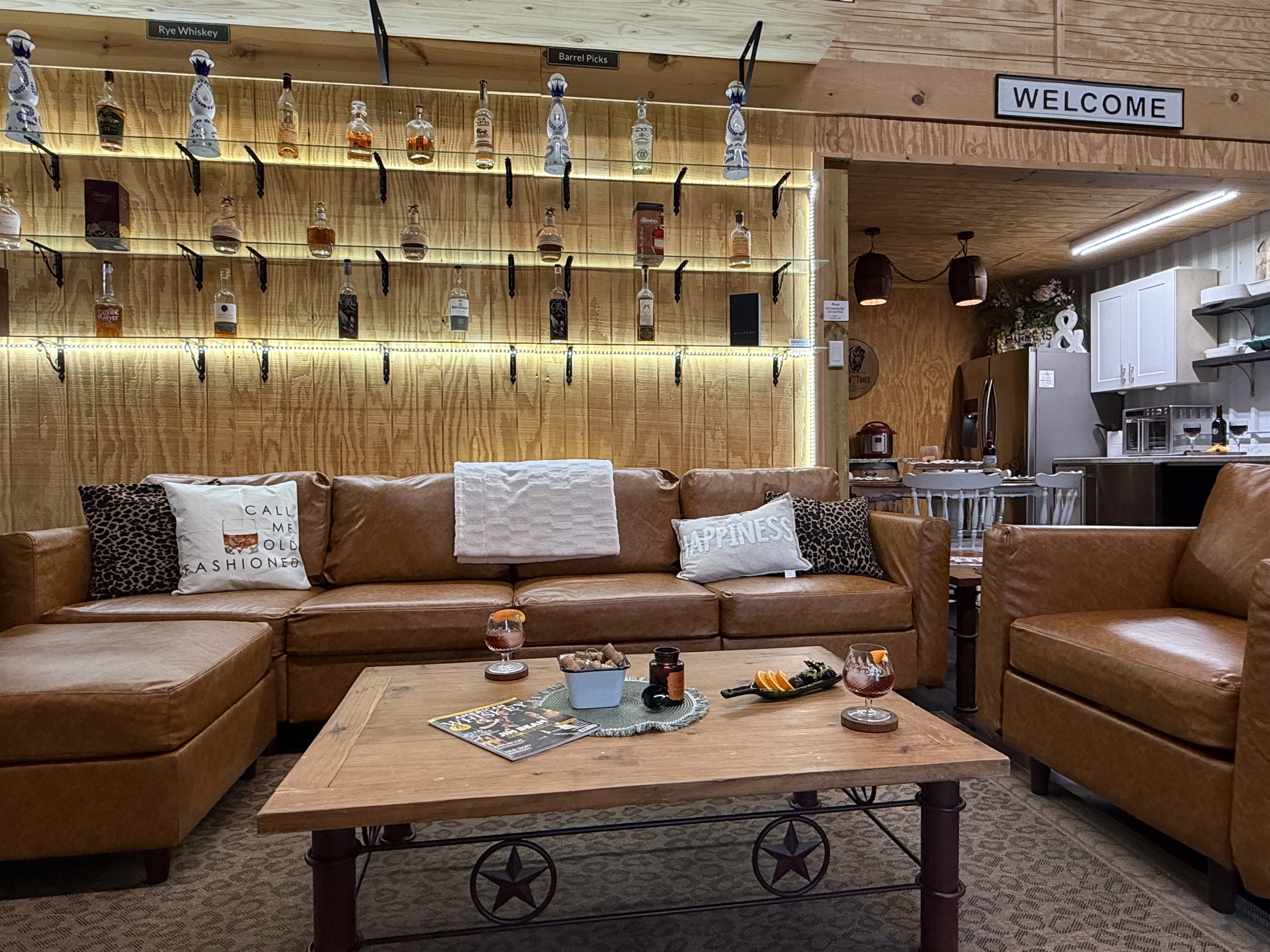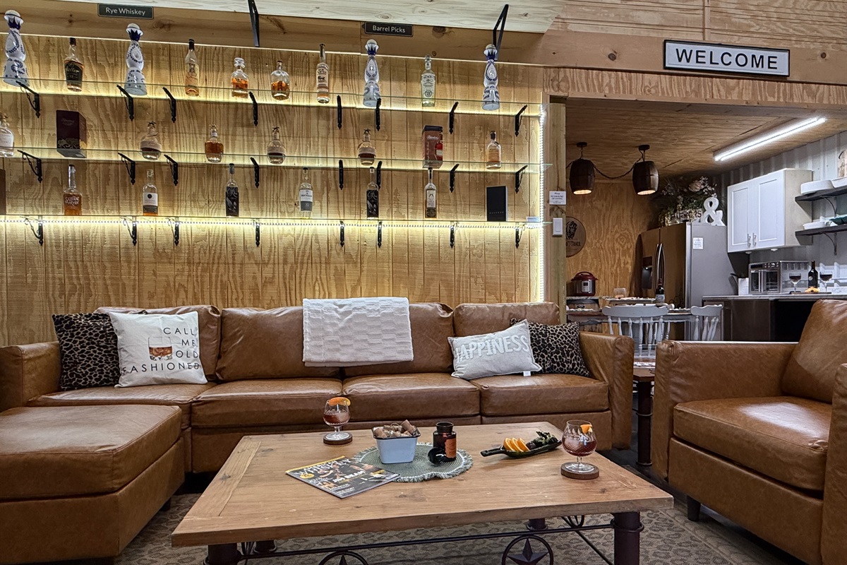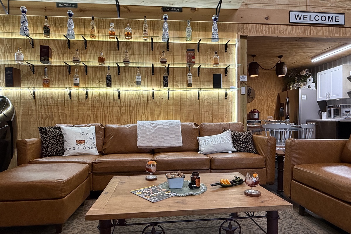 Step into the showstopping main living space featuring the property's crown jewel: a dramatic floor-to-ceiling backlit bourbon bottle display wall with organized shelving for rye whiskey, barrel picks, and premium selections. The cathedral ceiling creates an airy, open atmosphere, while plush tan leather sectional seating provides comfortable gathering space for your group.
