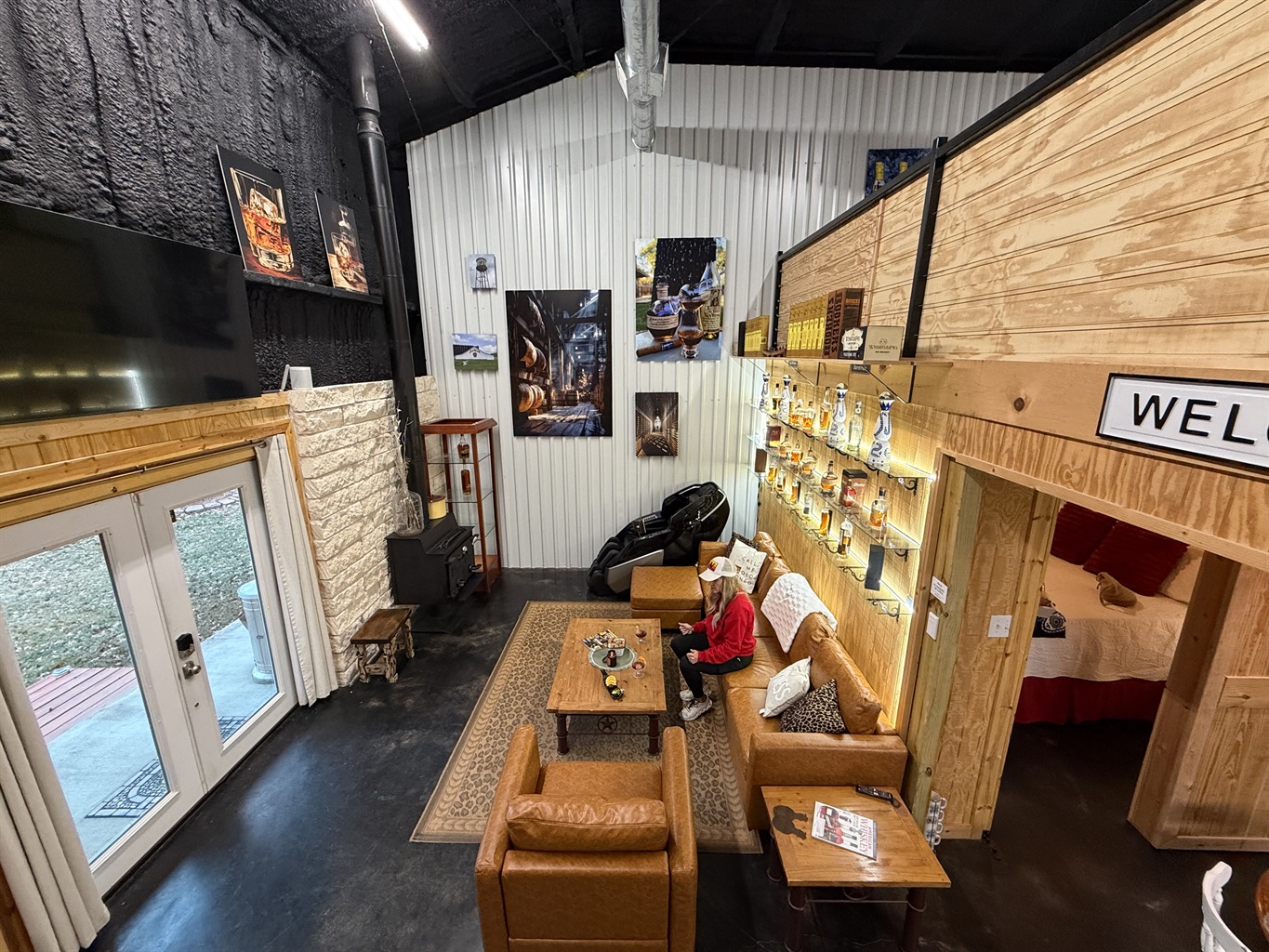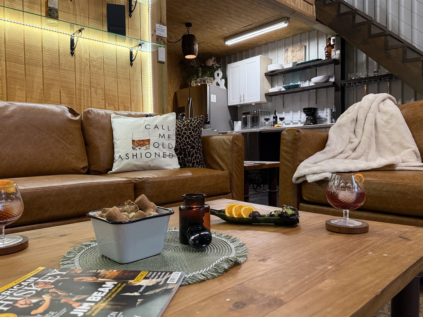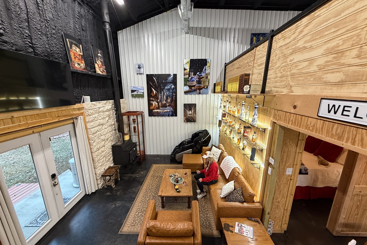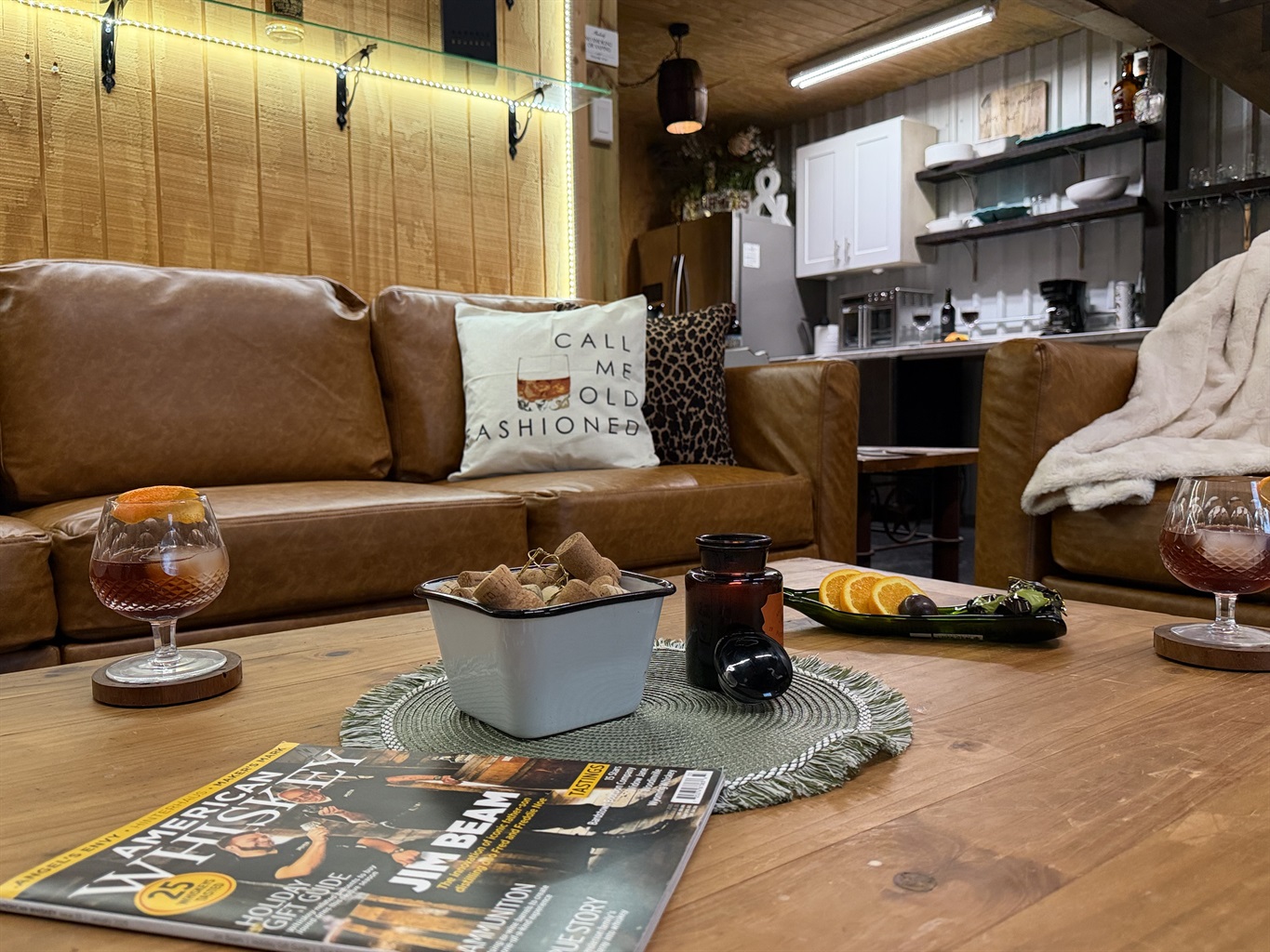 Step into the showstopping main living space featuring the property's crown jewel: a dramatic floor-to-ceiling backlit bourbon bottle display wall with organized shelving for rye whiskey, barrel picks, and premium selections. The cathedral ceiling creates an airy, open atmosphere, while plush tan leather sectional seating provides comfortable gathering space for your group.