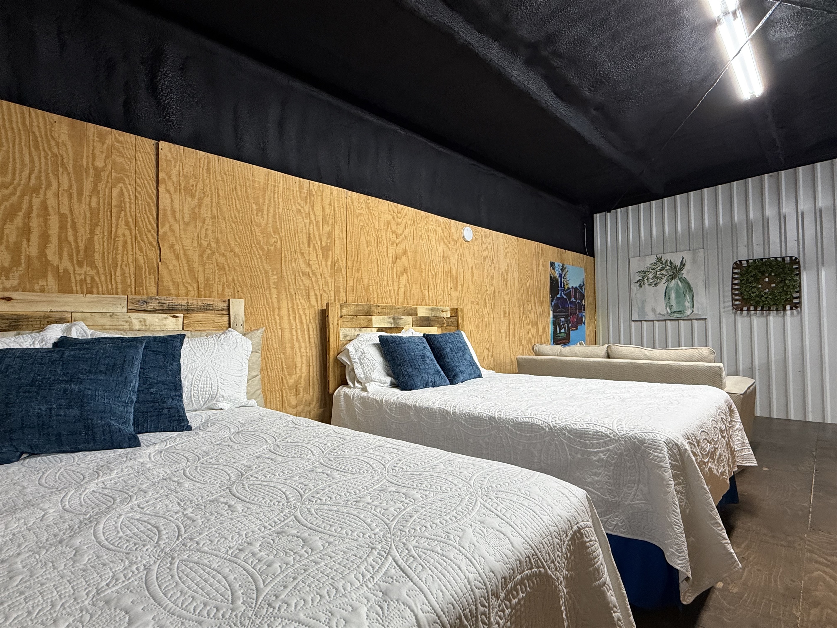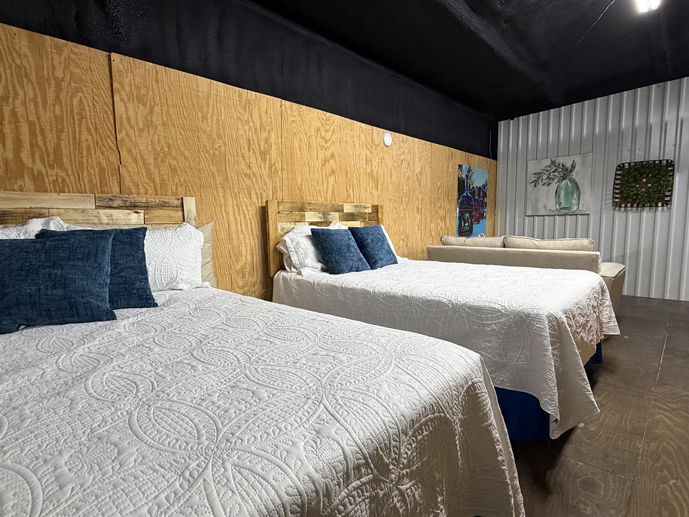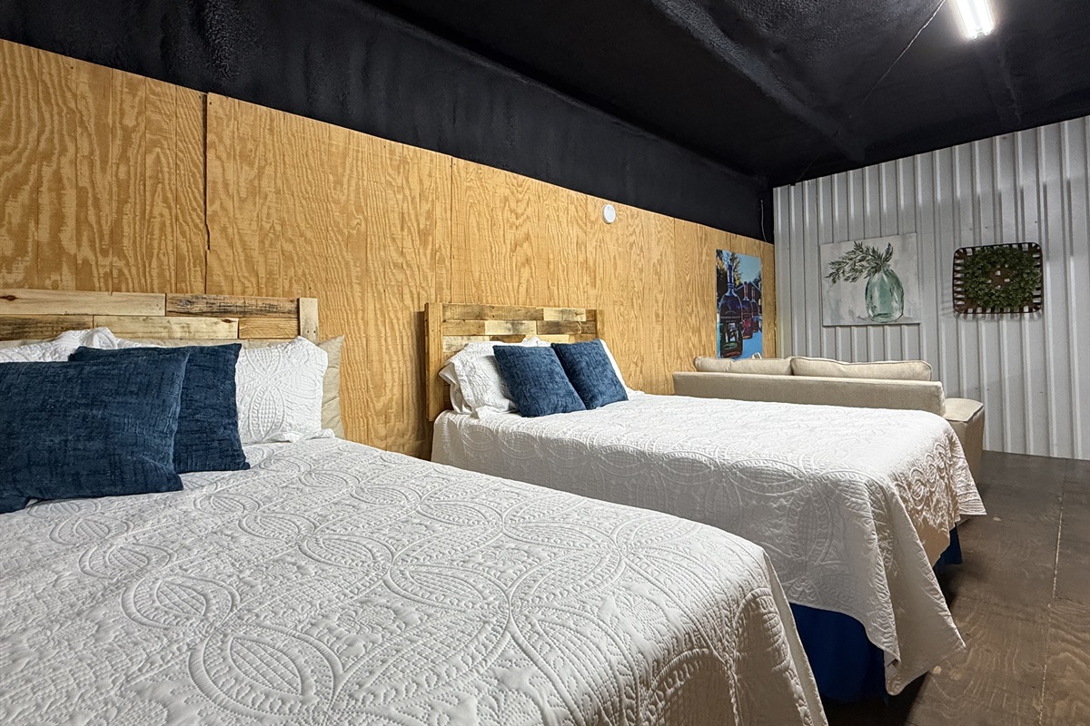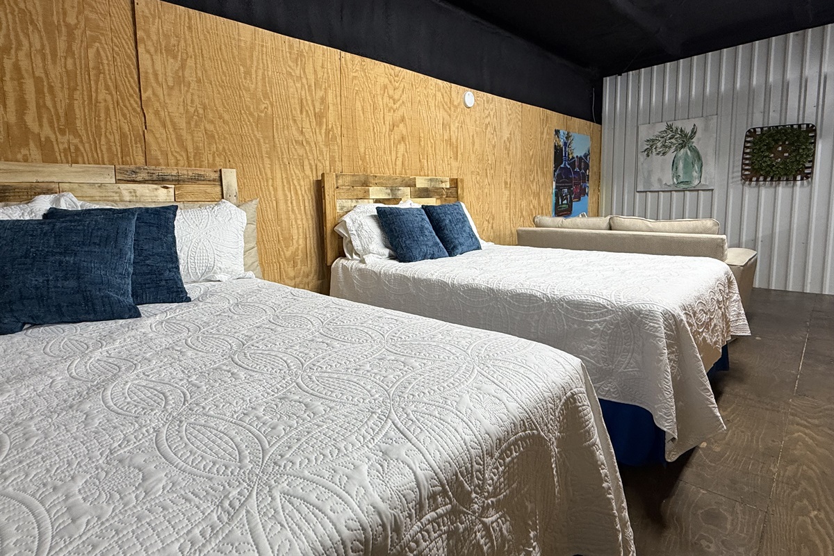 Bedroom 1: Two queen beds with loft-style platform design, plywood accent walls, white bedding with navy accents
