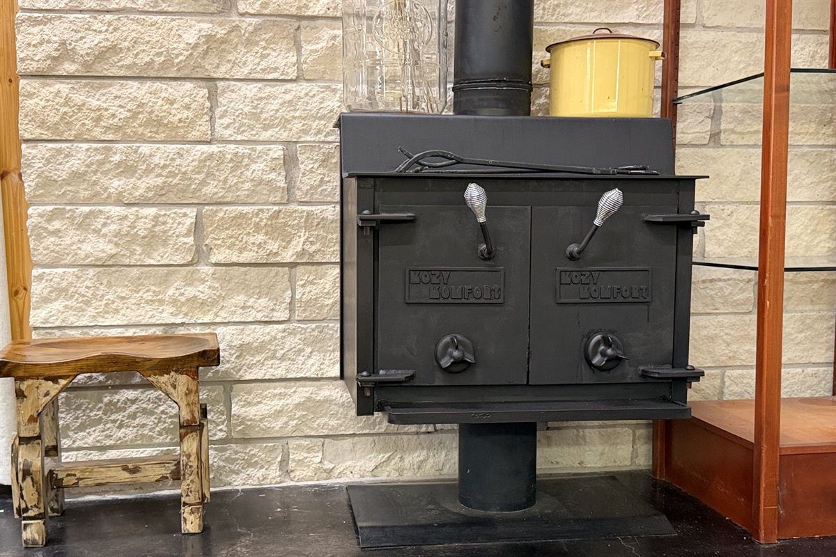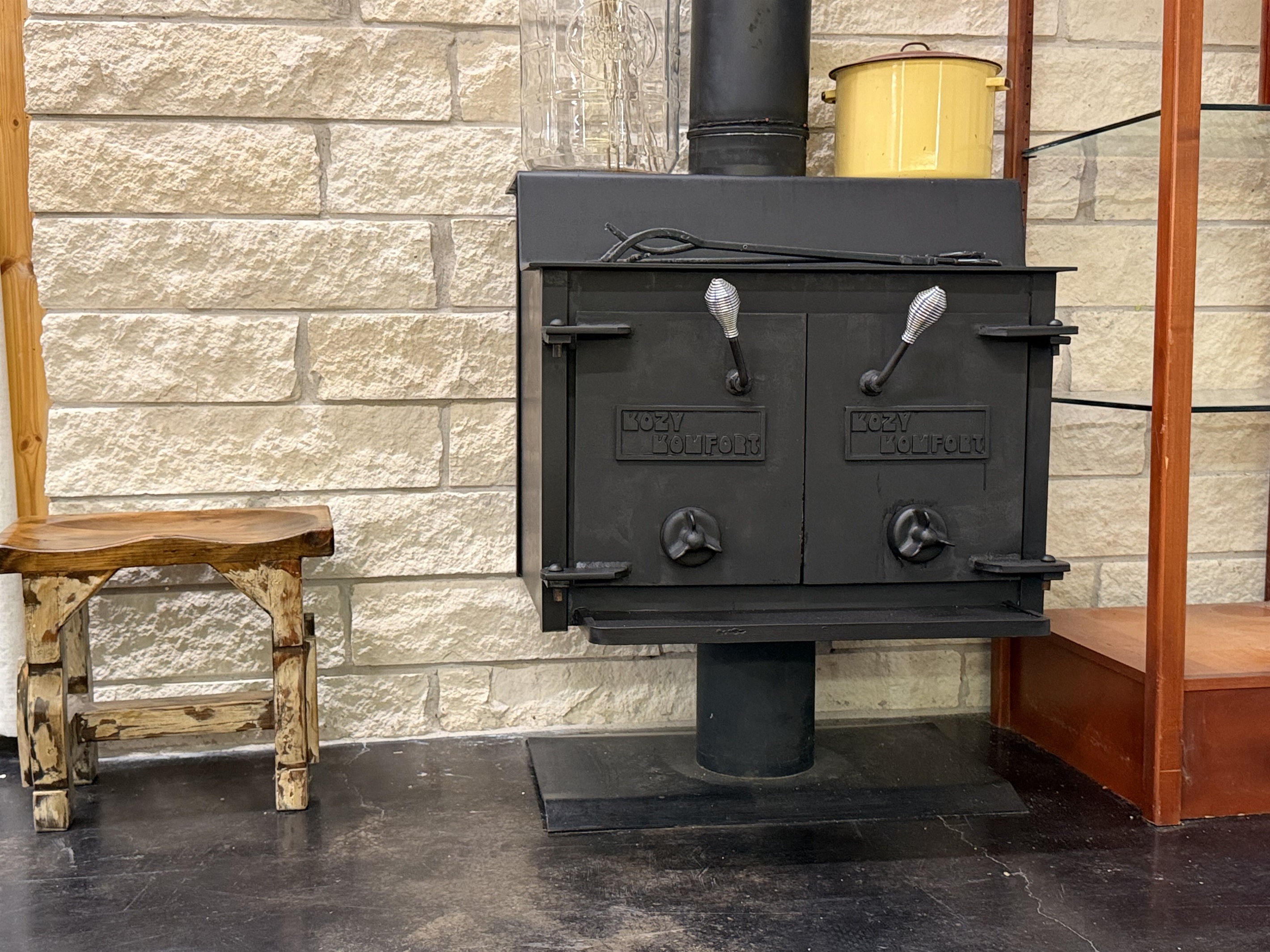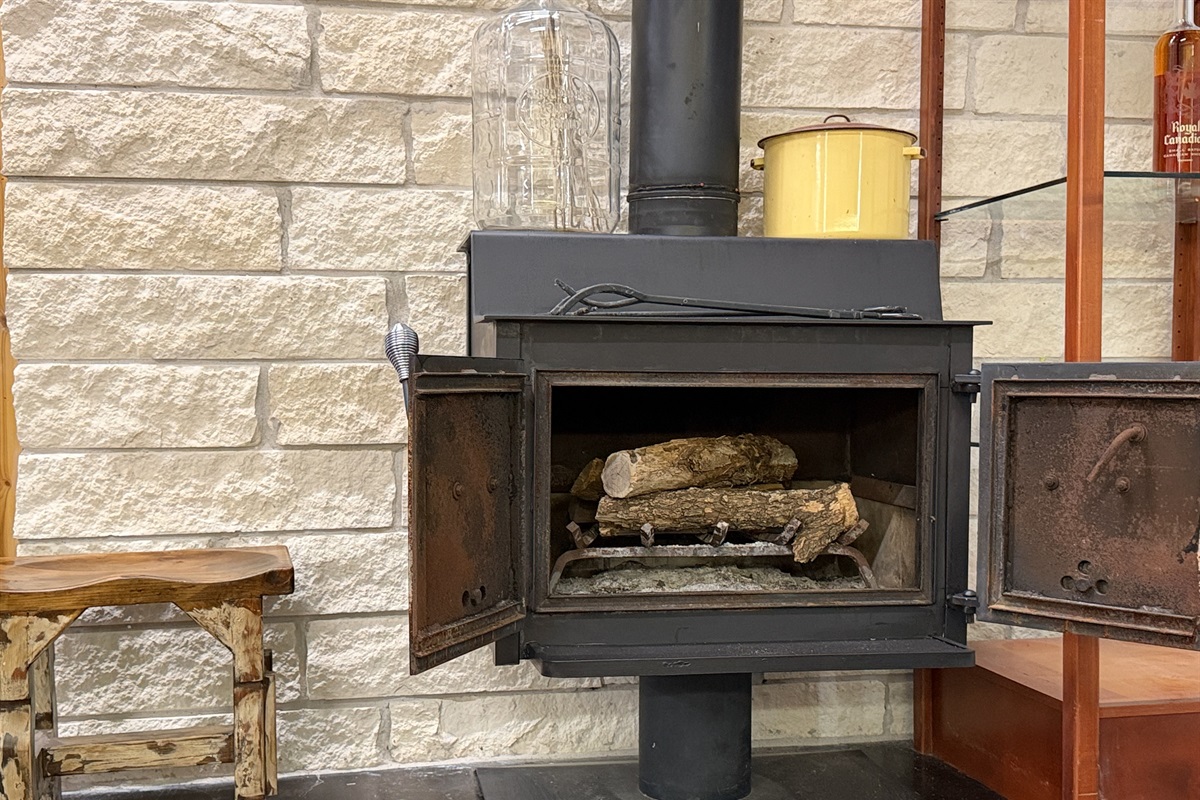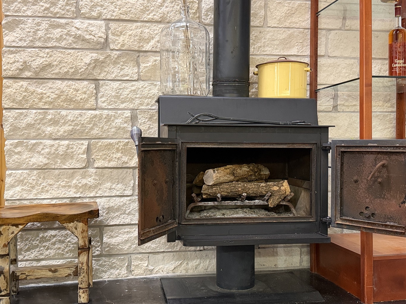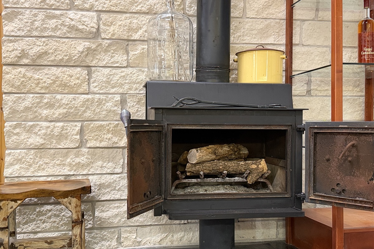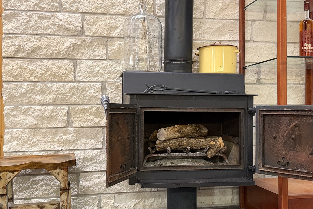 A stunning white stone fireplace with wood-burning stove provides authentic warmth and ambiance. The decorative display above features vintage-style glassware and curated decor that enhances the sophisticated atmosphere.