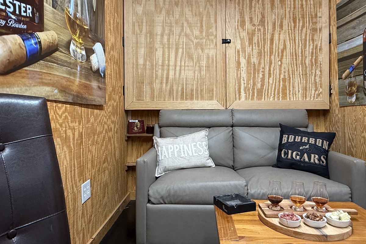 For the true connoisseur, Chateau Bourbon features a dedicated private cigar room - a rarity among vacation rentals. This intimate wood-paneled sanctuary includes comfortable leather seating, its own flat-screen TV, custom storage, and bourbon-themed artwork. The space is designed for enjoying fine cigars in climate-controlled comfort while savoring premium spirits.