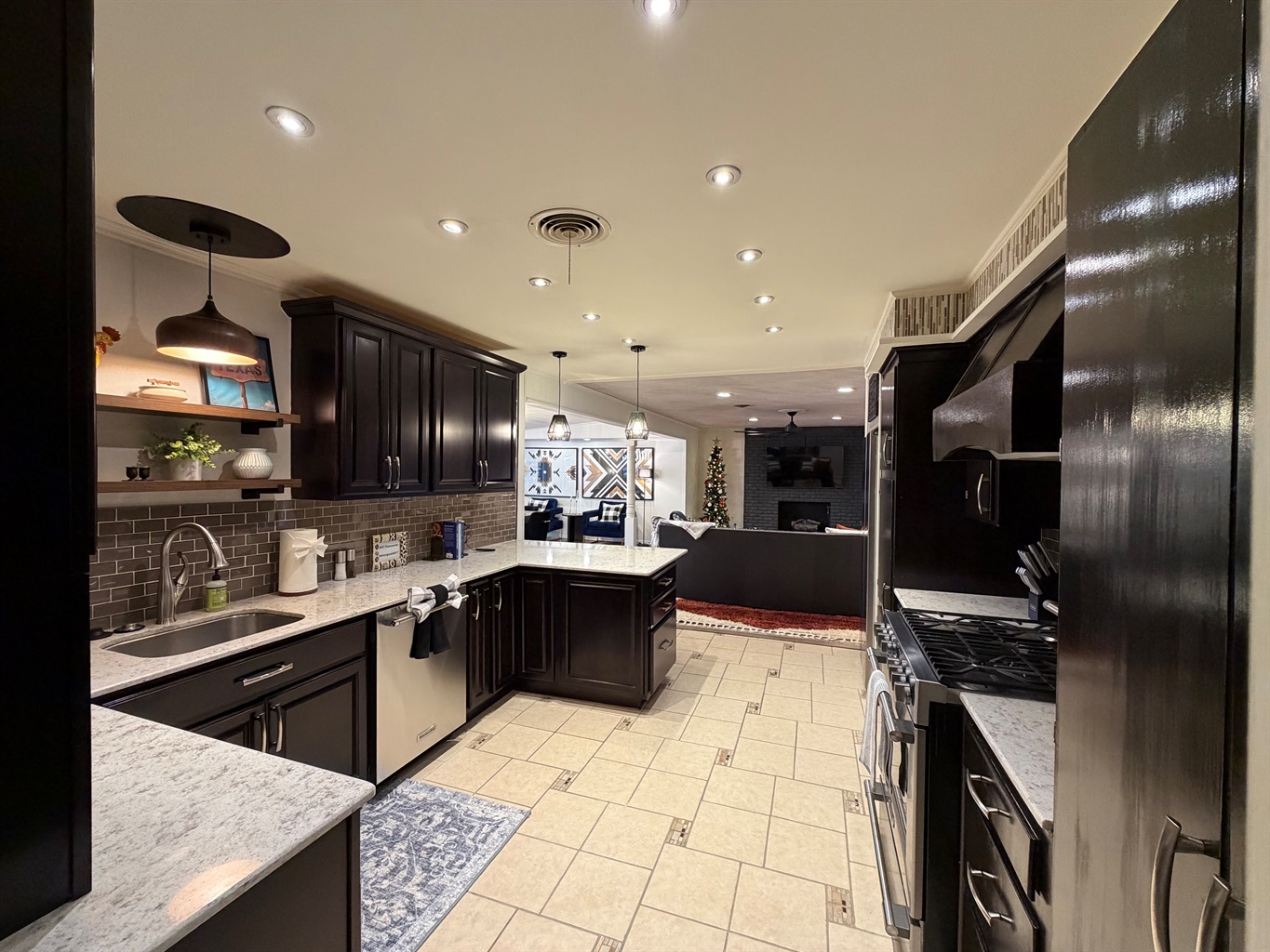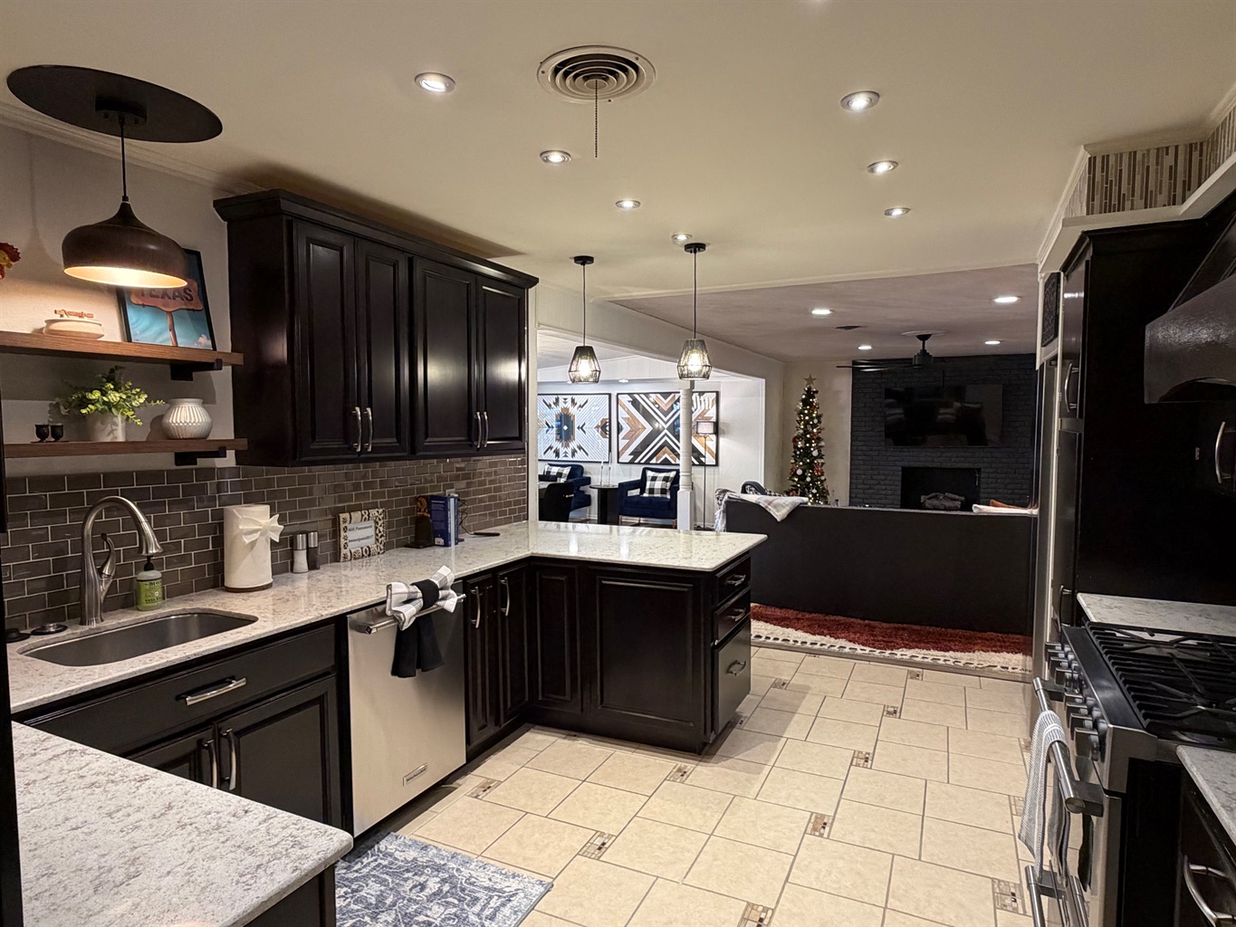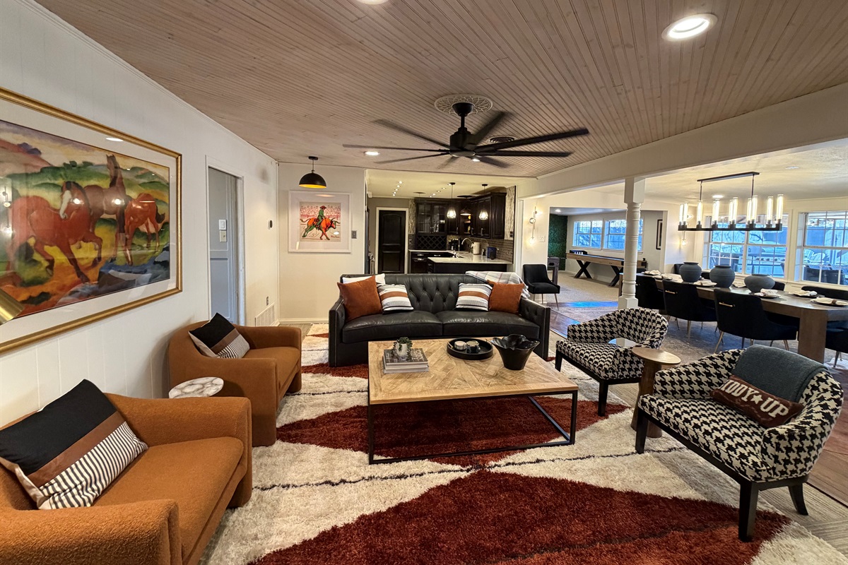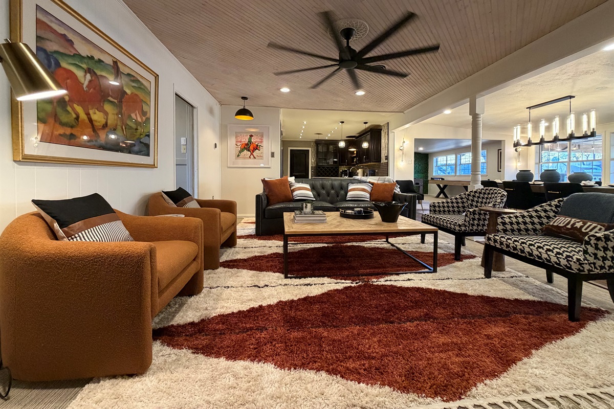 *Great room anchored by a dramatic black brick fireplace