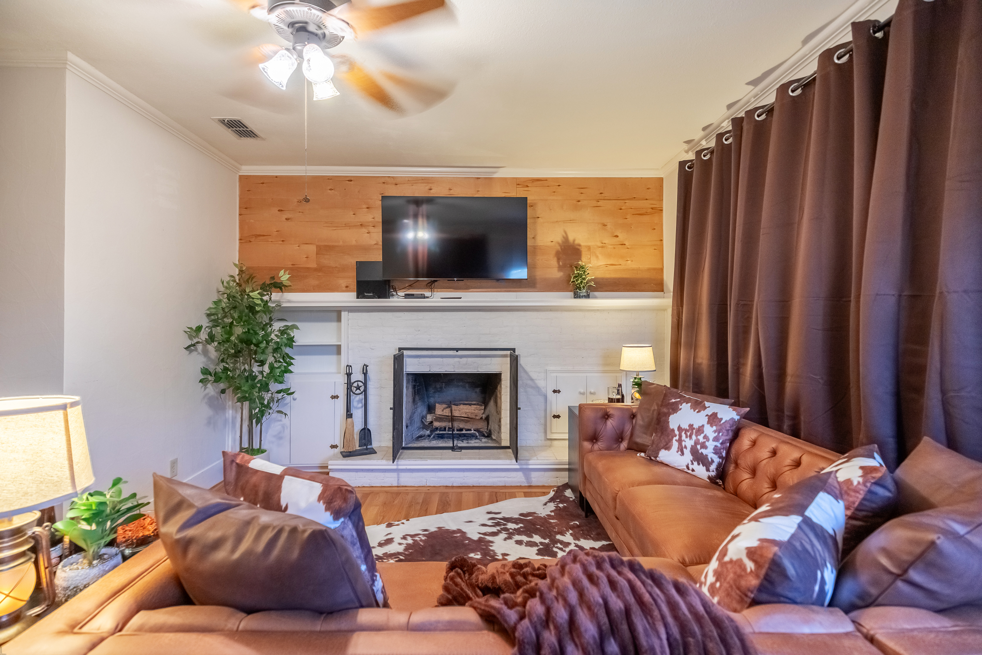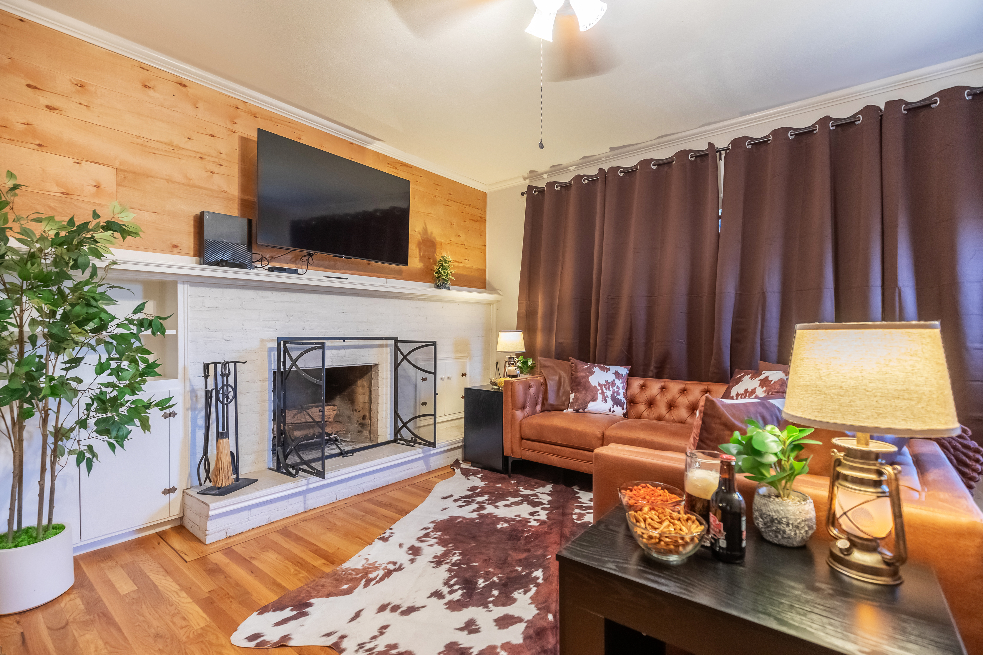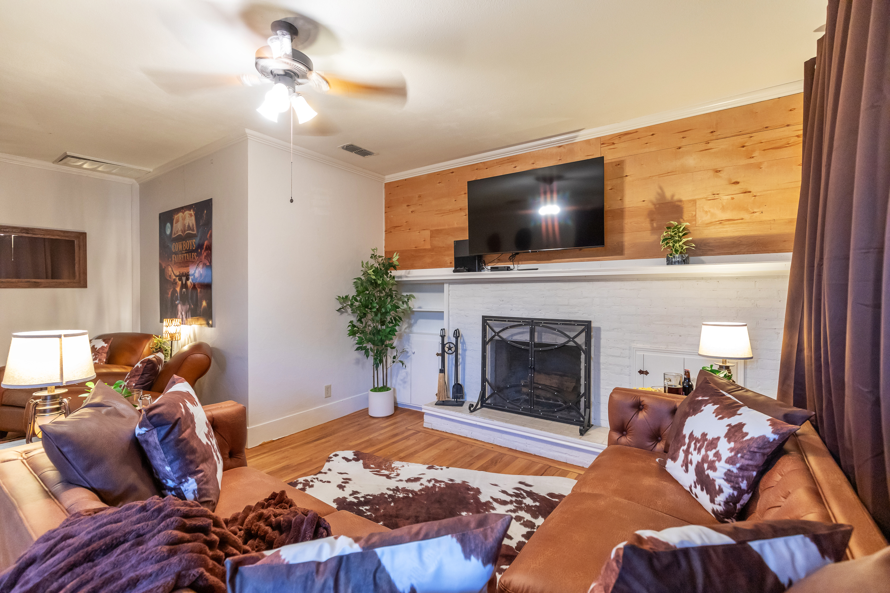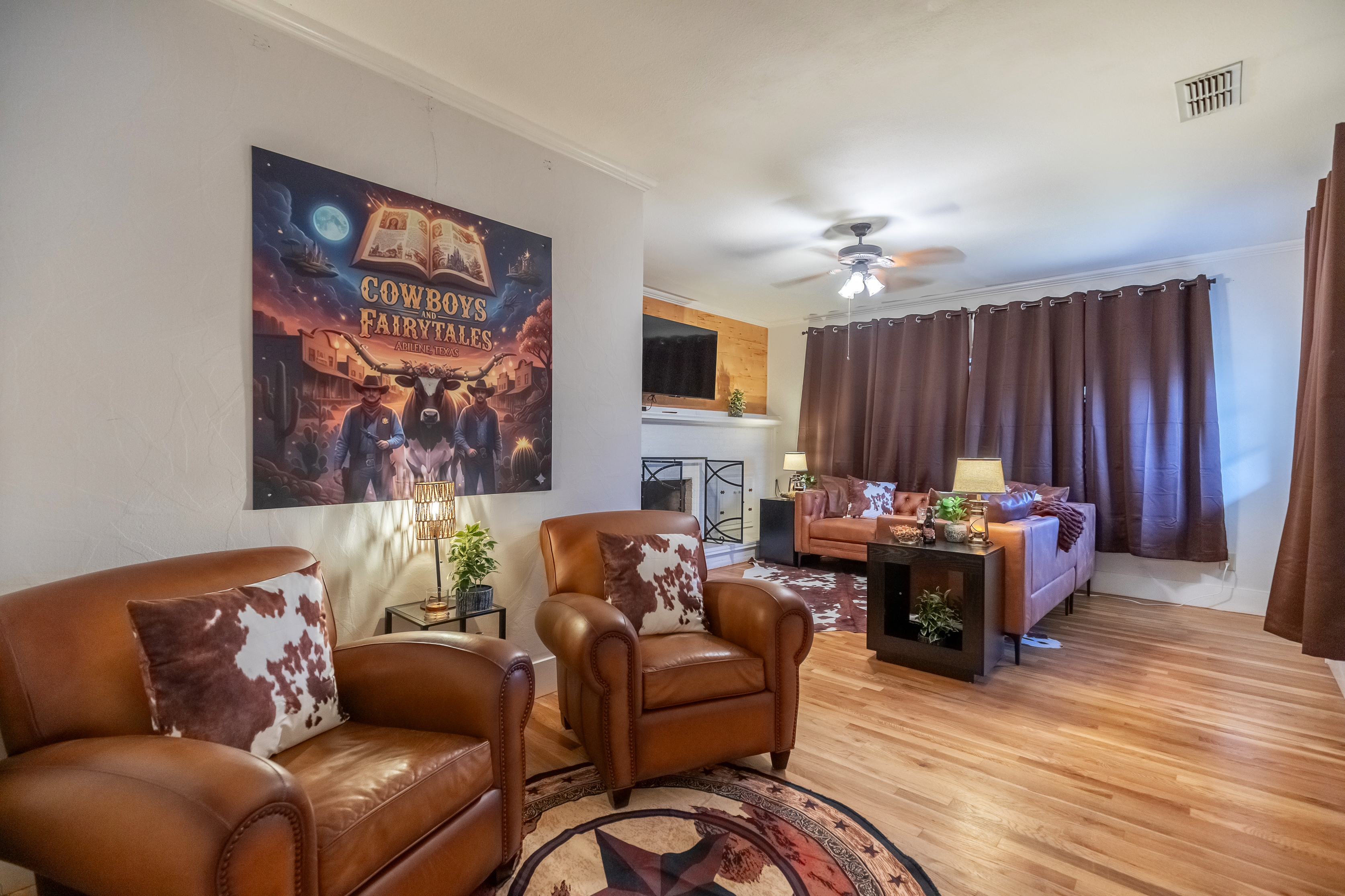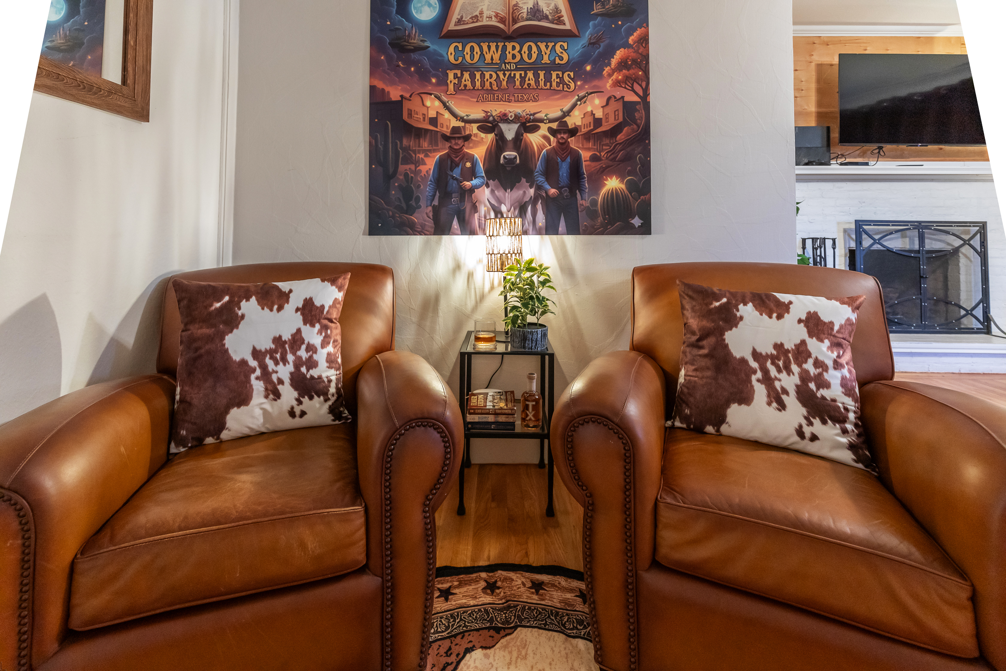 Step into the main living room and sink into saddle-brown leather chairs beneath a custom Cowboys and Fairytales mural — part frontier, part fantasy, all Abilene. A shiplap feature wall frames the fireplace and flat-screen TV while cowhide pillows and a Texas star rug keep things rooted in the land that built this town. This is the kind of room where boots come off and stories start.