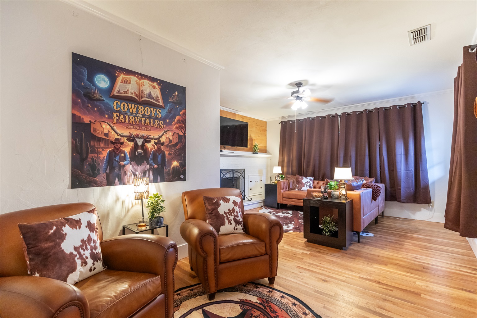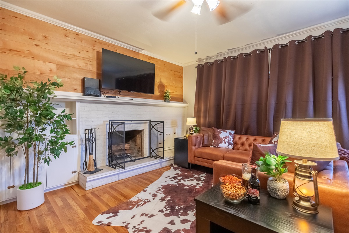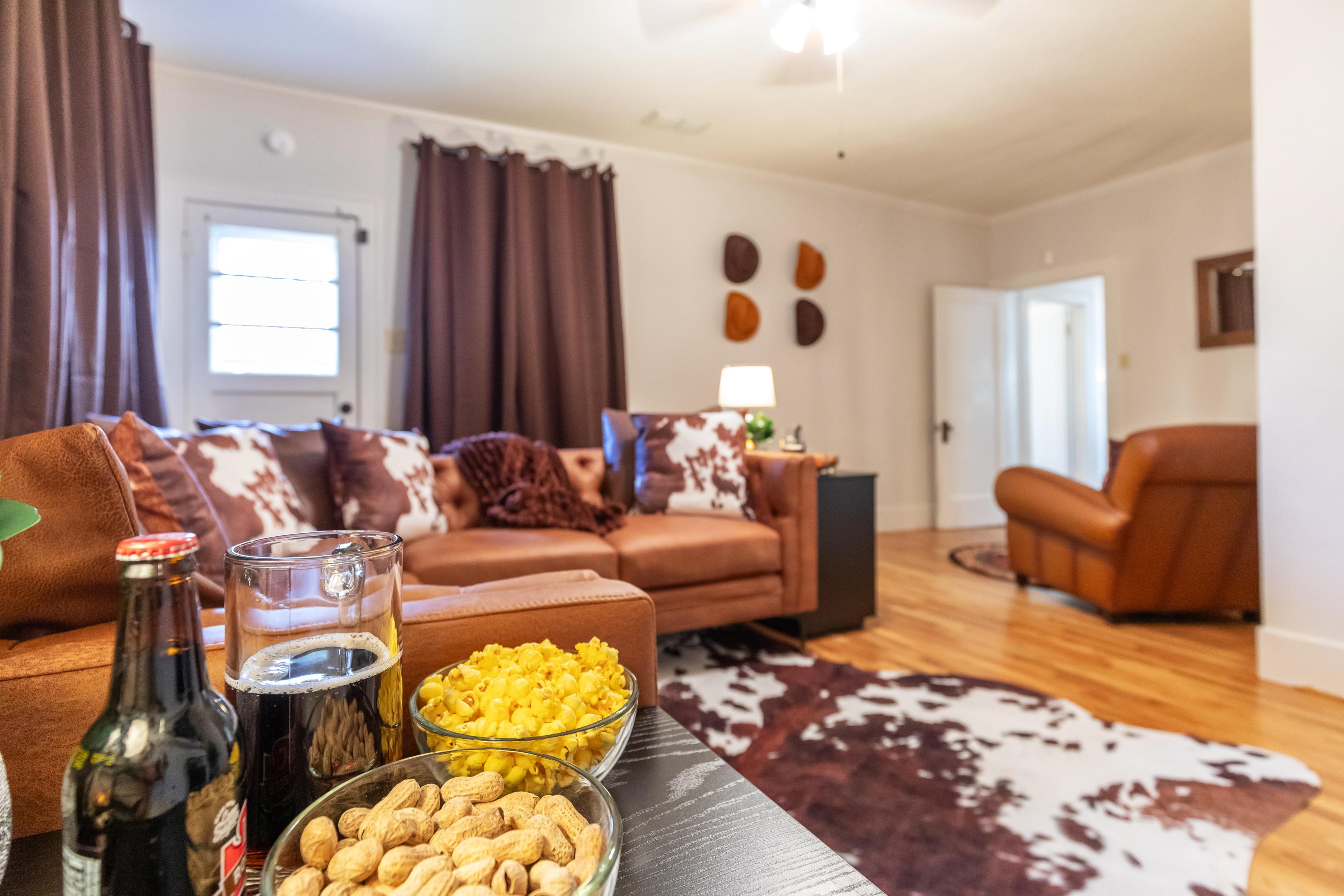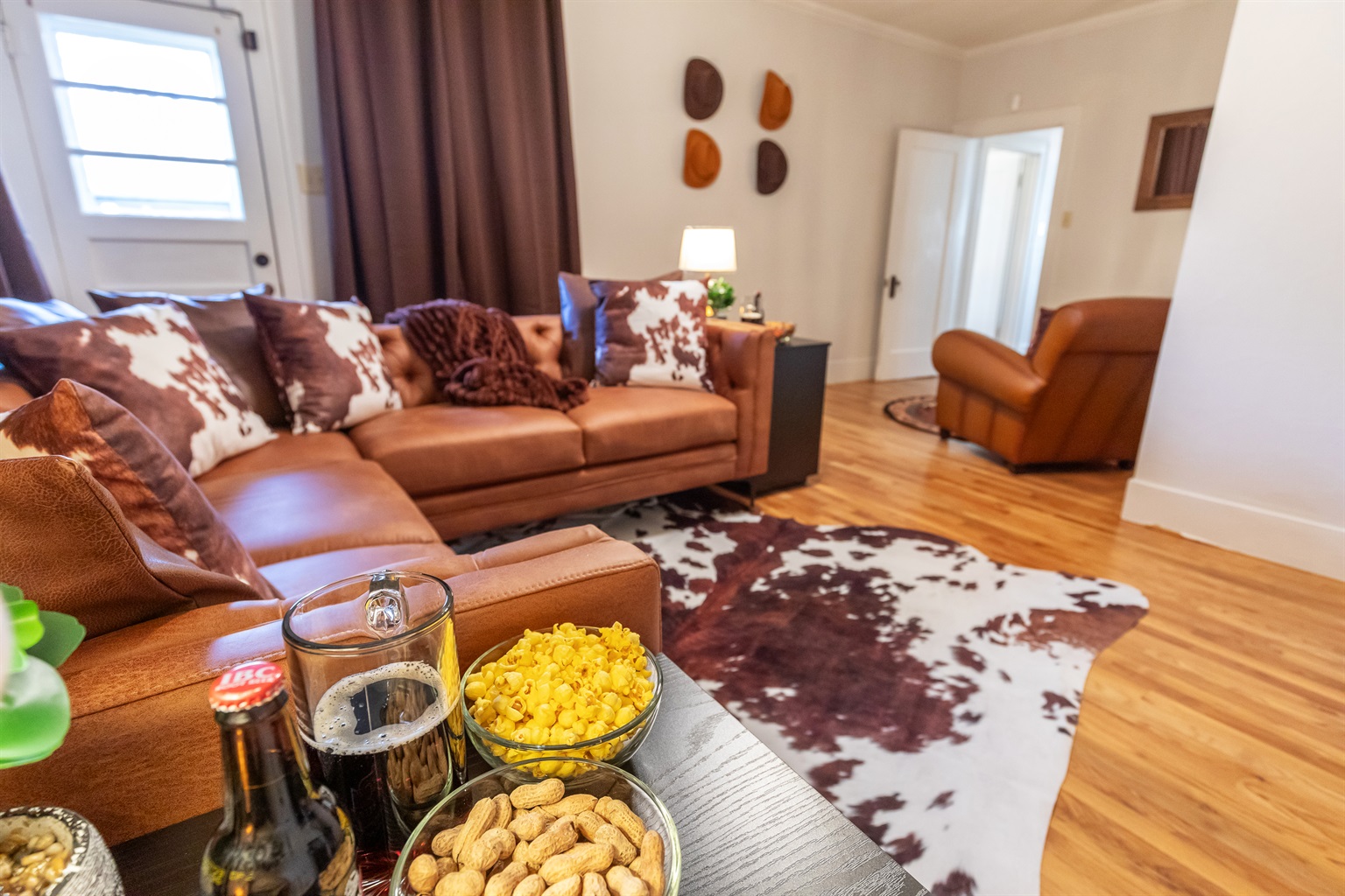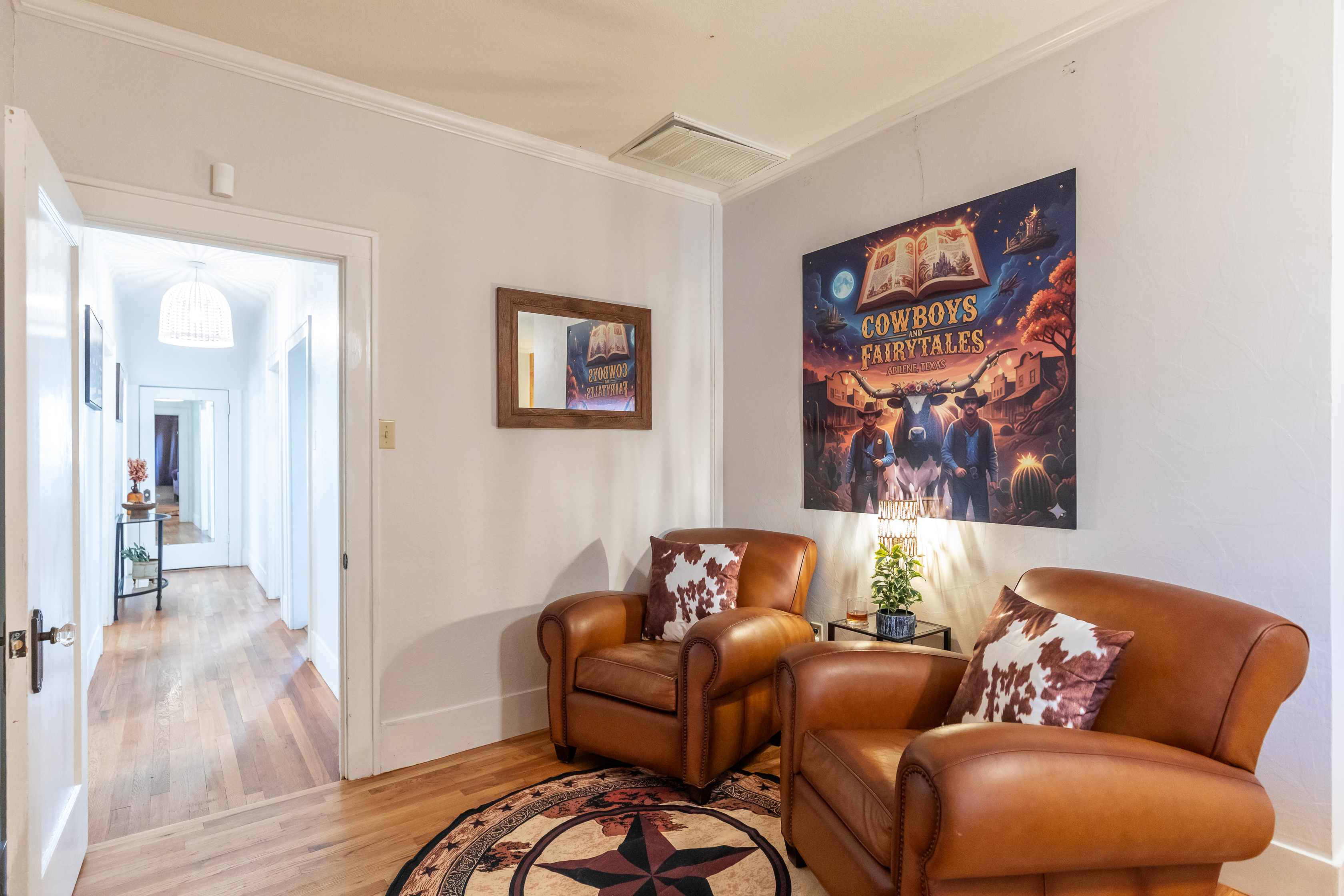 Step into the main living room and sink into saddle-brown leather chairs beneath a custom Cowboys and Fairytales mural — part frontier, part fantasy, all Abilene. A shiplap feature wall frames the fireplace and flat-screen TV while cowhide pillows and a Texas star rug keep things rooted in the land that built this town. This is the kind of room where boots come off and stories start.