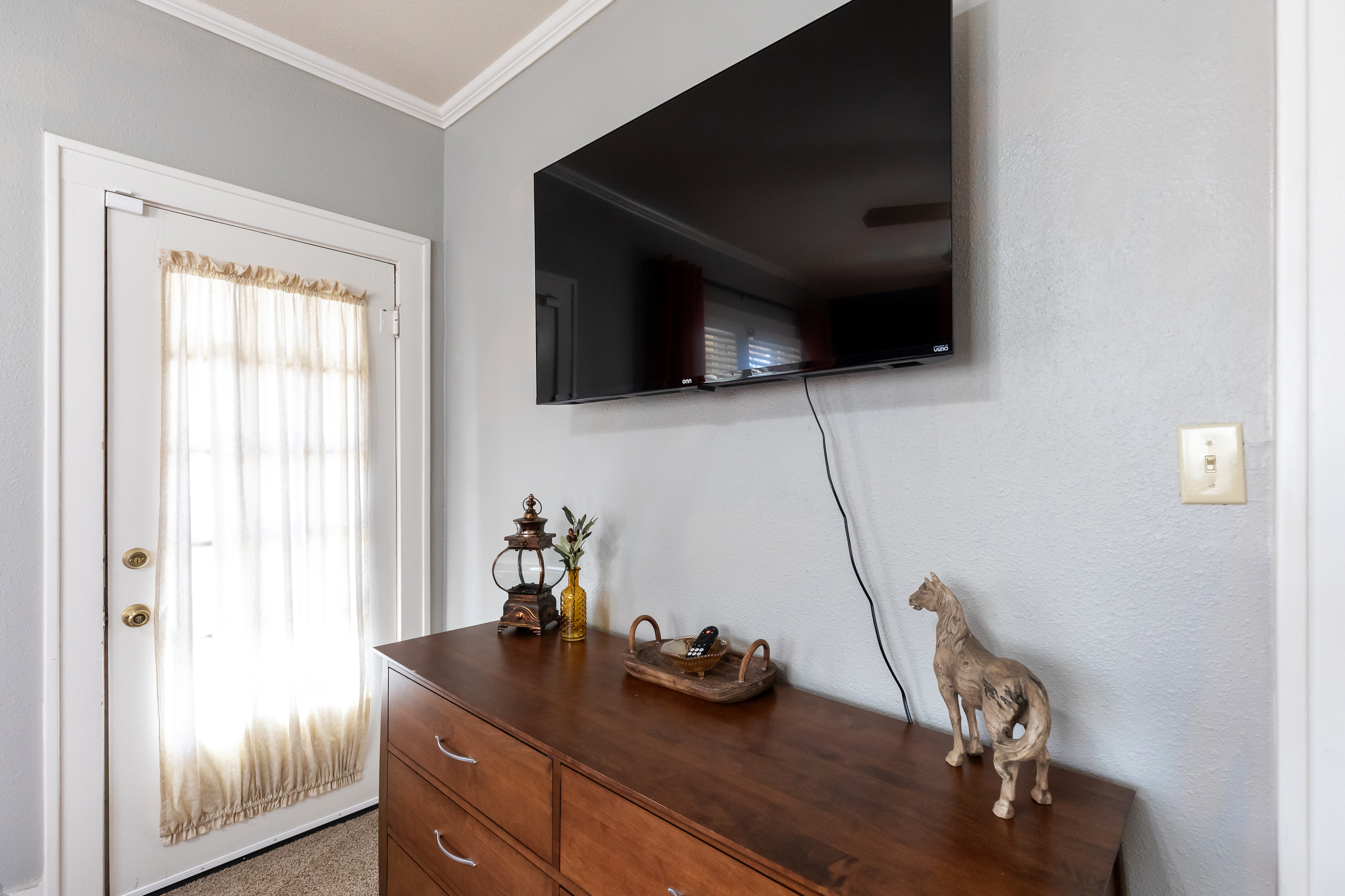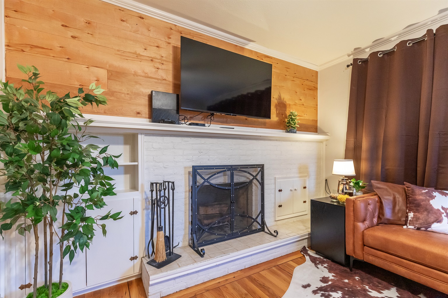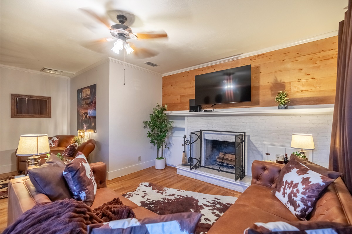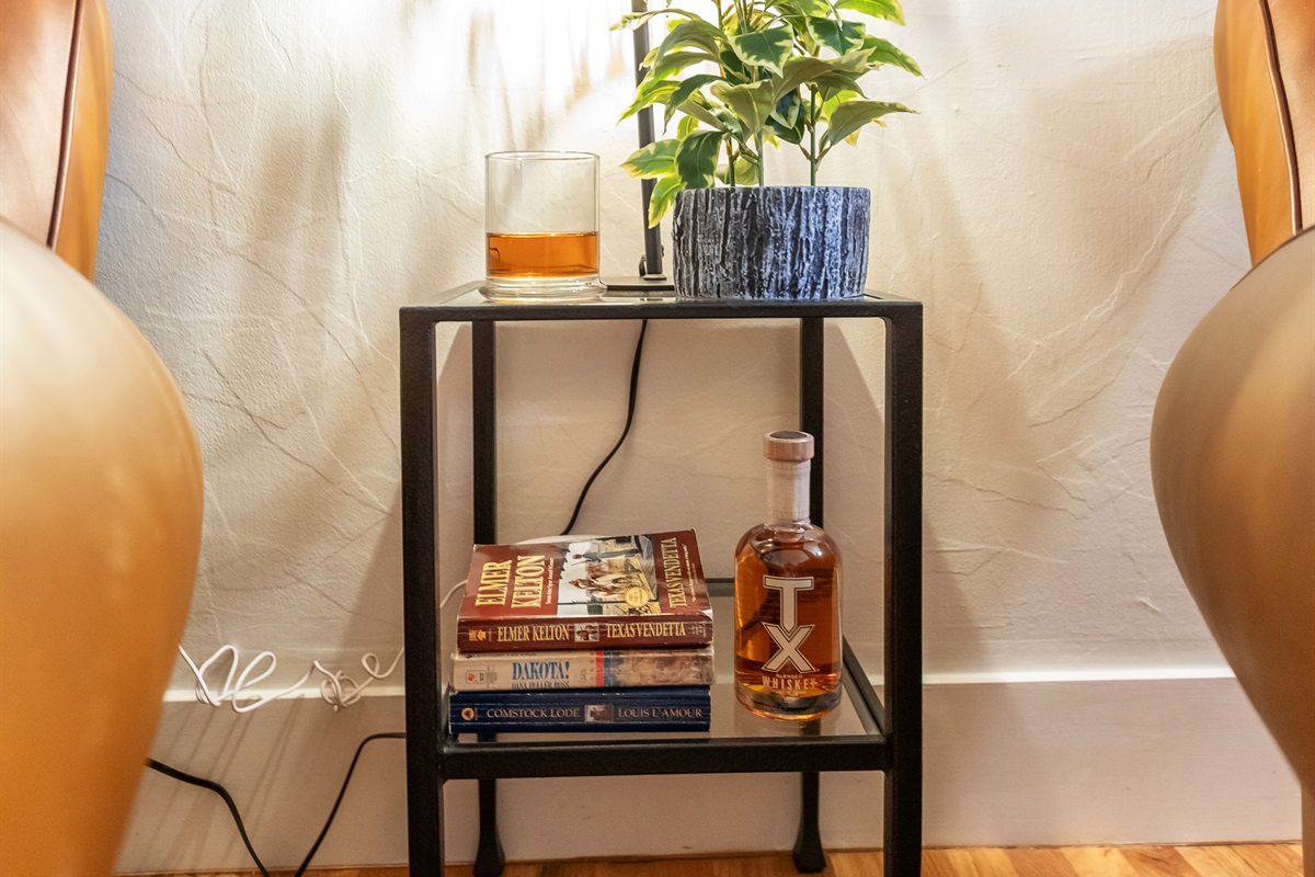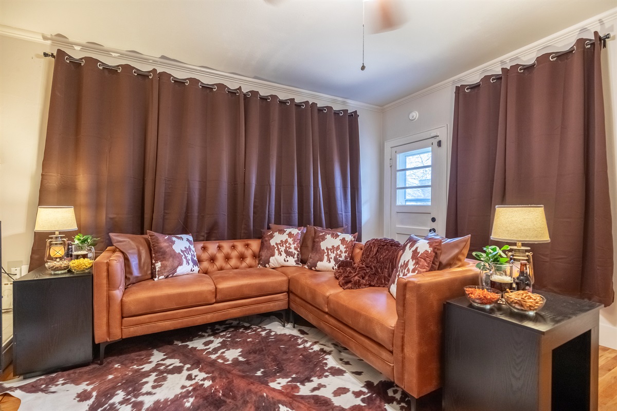 Step into the main living room and sink into saddle-brown leather chairs beneath a custom Cowboys and Fairytales mural — part frontier, part fantasy, all Abilene. A shiplap feature wall frames the fireplace and flat-screen TV while cowhide pillows and a Texas star rug keep things rooted in the land that built this town. This is the kind of room where boots come off and stories start.