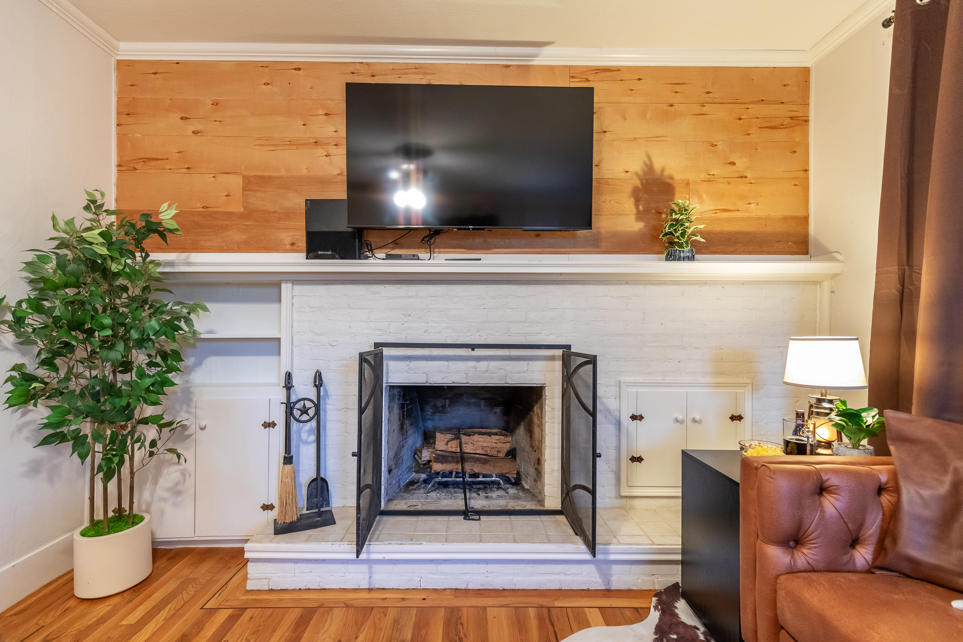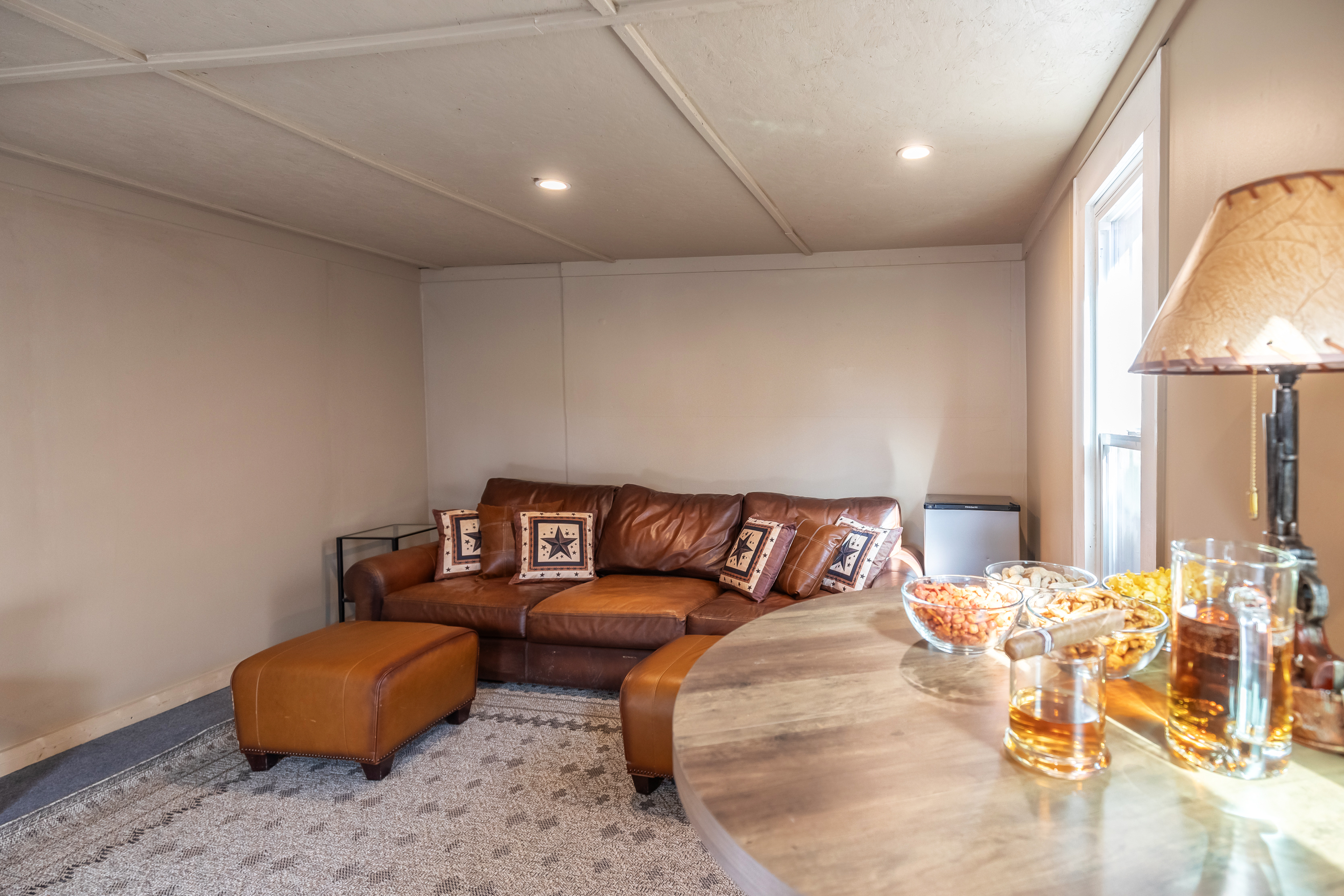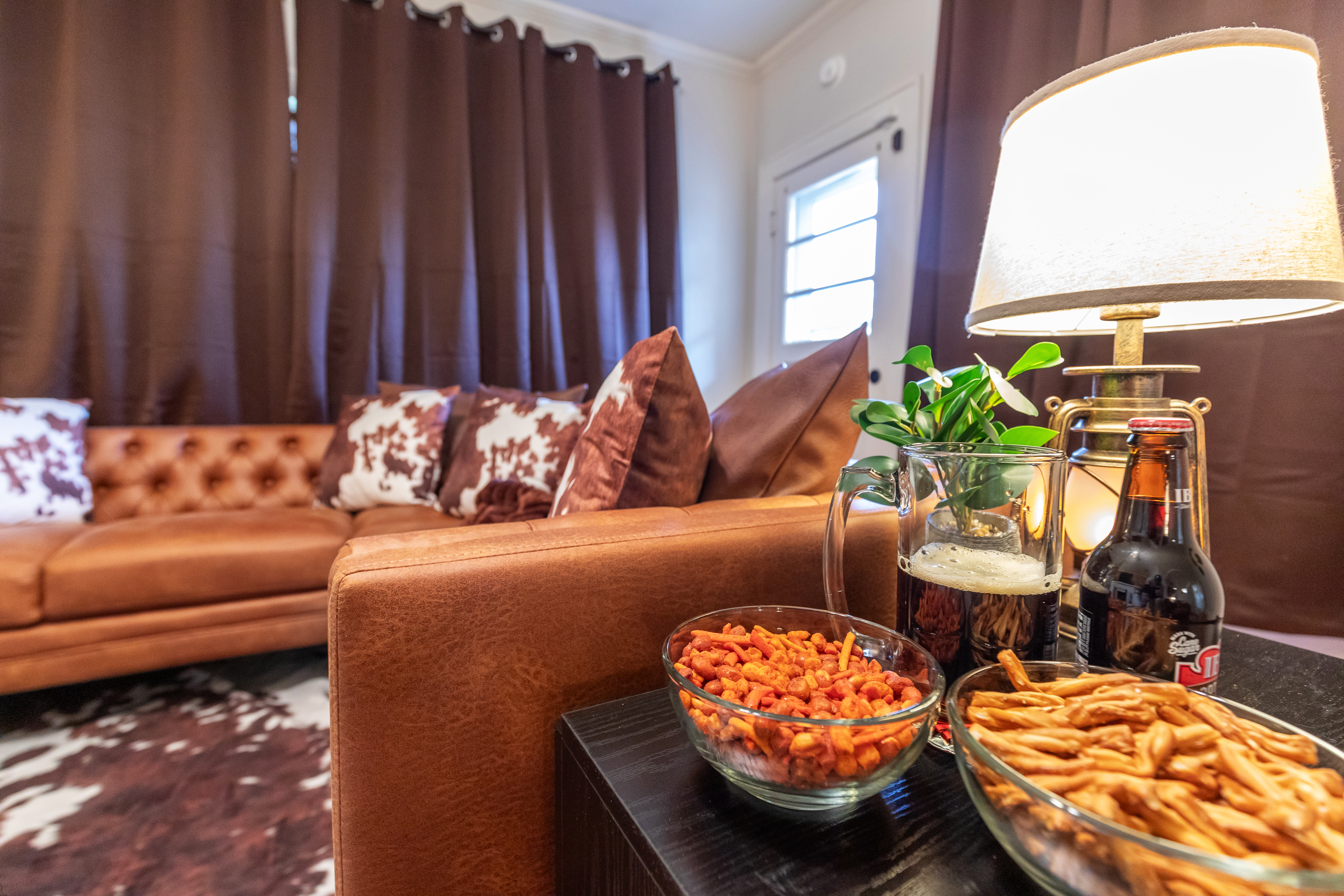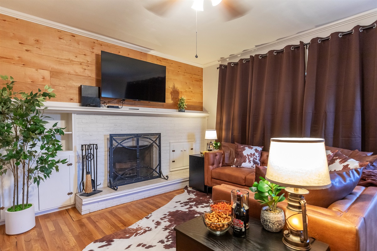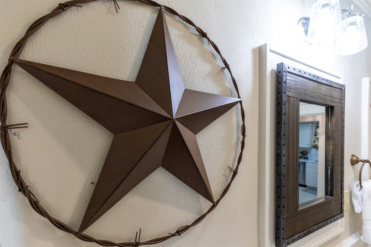 Step into the main living room and sink into saddle-brown leather chairs beneath a custom Cowboys and Fairytales mural — part frontier, part fantasy, all Abilene. A shiplap feature wall frames the fireplace and flat-screen TV while cowhide pillows and a Texas star rug keep things rooted in the land that built this town. This is the kind of room where boots come off and stories start.