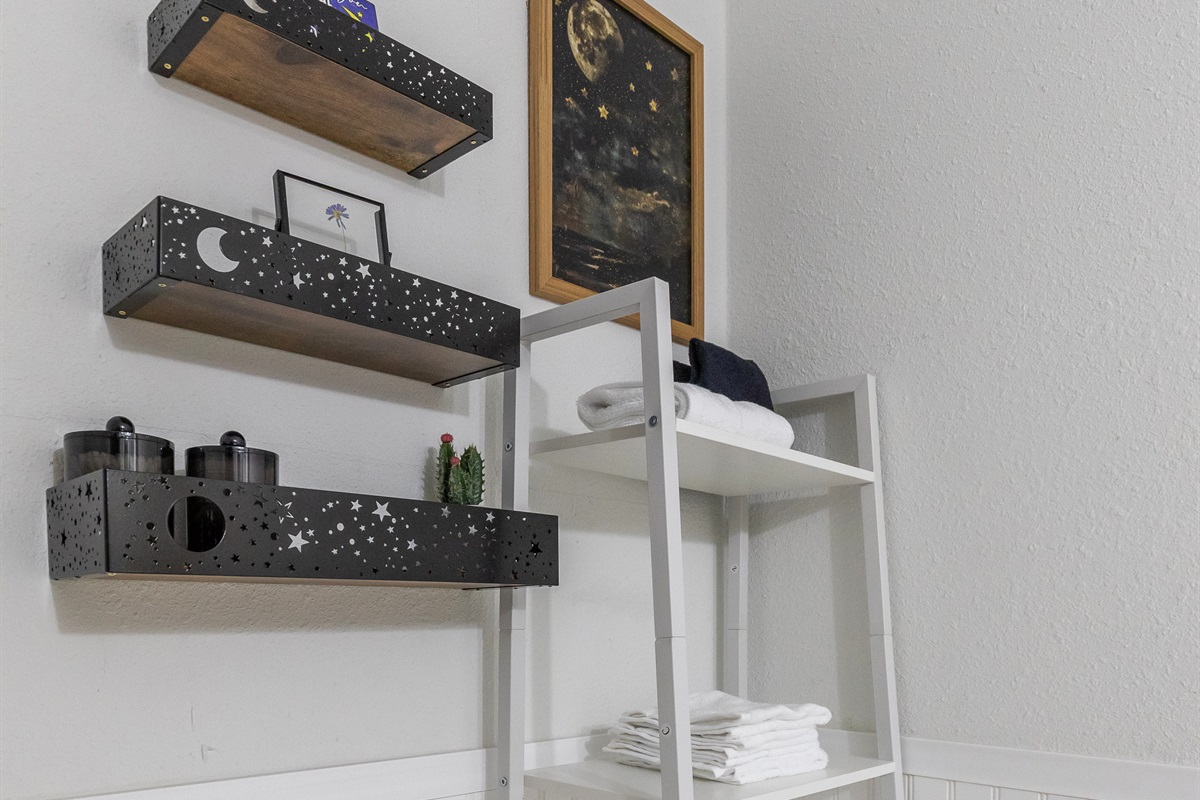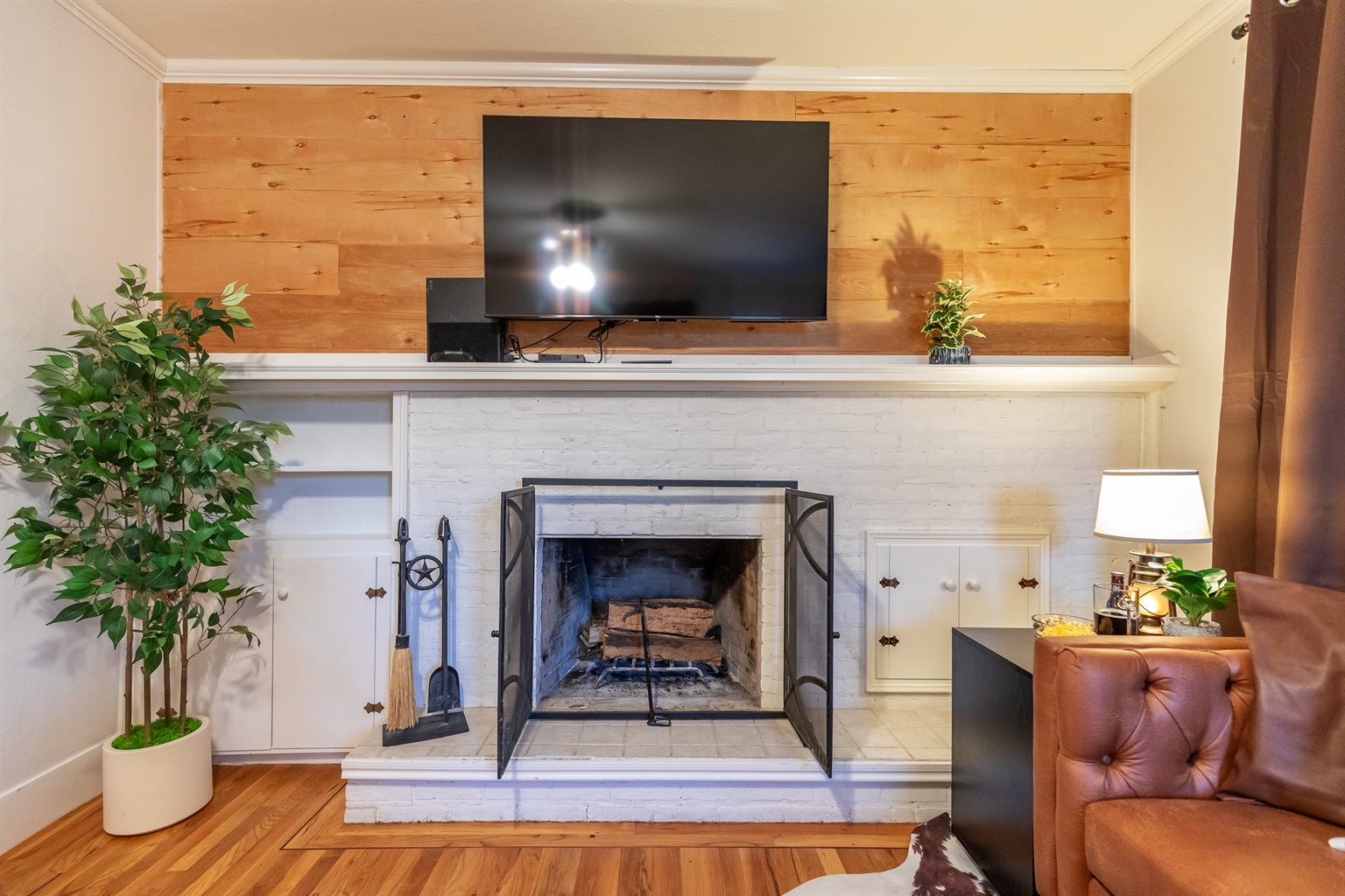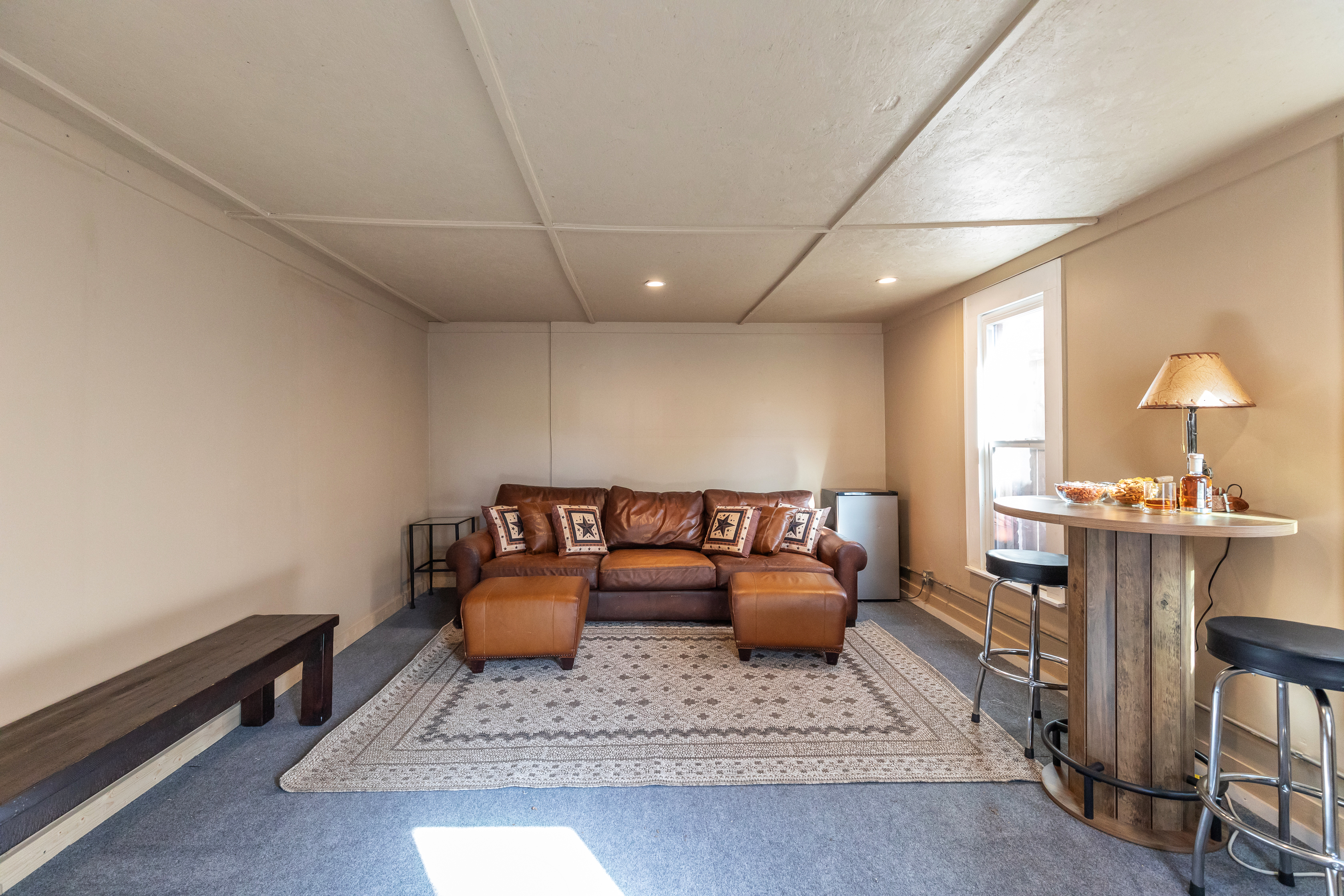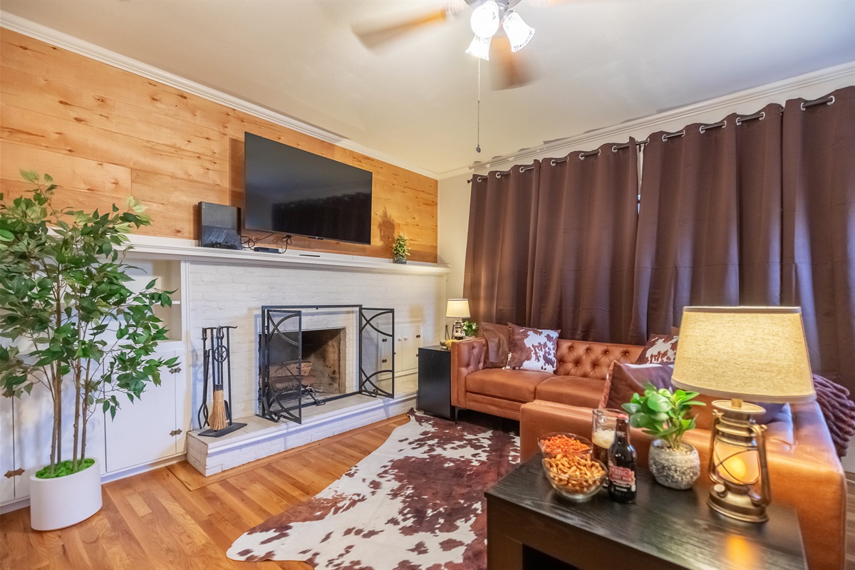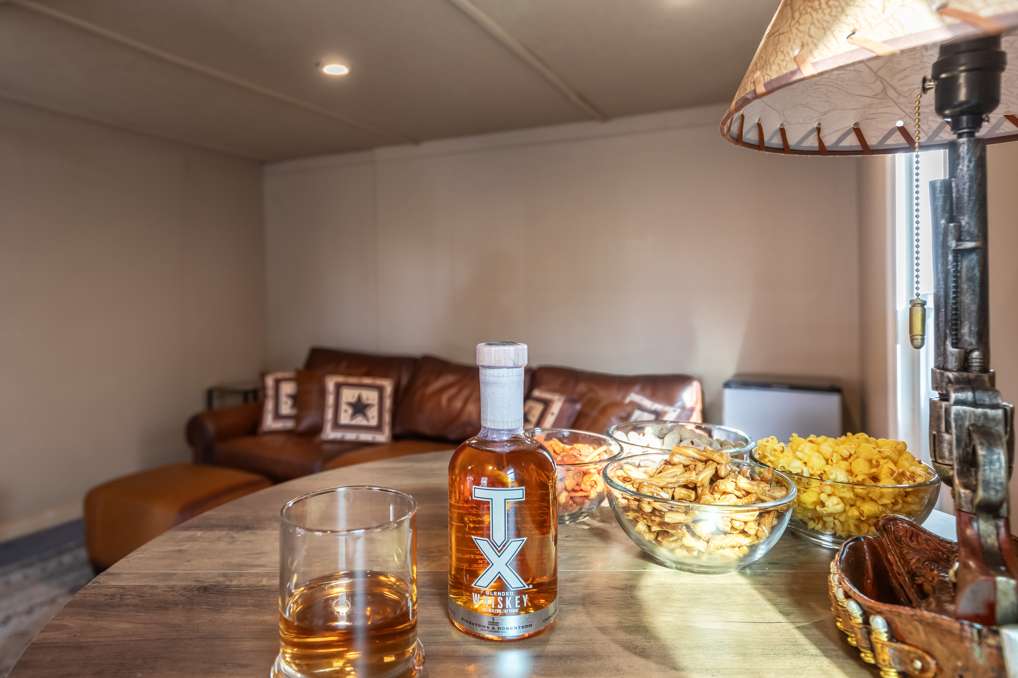 Step into the main living room and sink into saddle-brown leather chairs beneath a custom Cowboys and Fairytales mural — part frontier, part fantasy, all Abilene. A shiplap feature wall frames the fireplace and flat-screen TV while cowhide pillows and a Texas star rug keep things rooted in the land that built this town. This is the kind of room where boots come off and stories start.