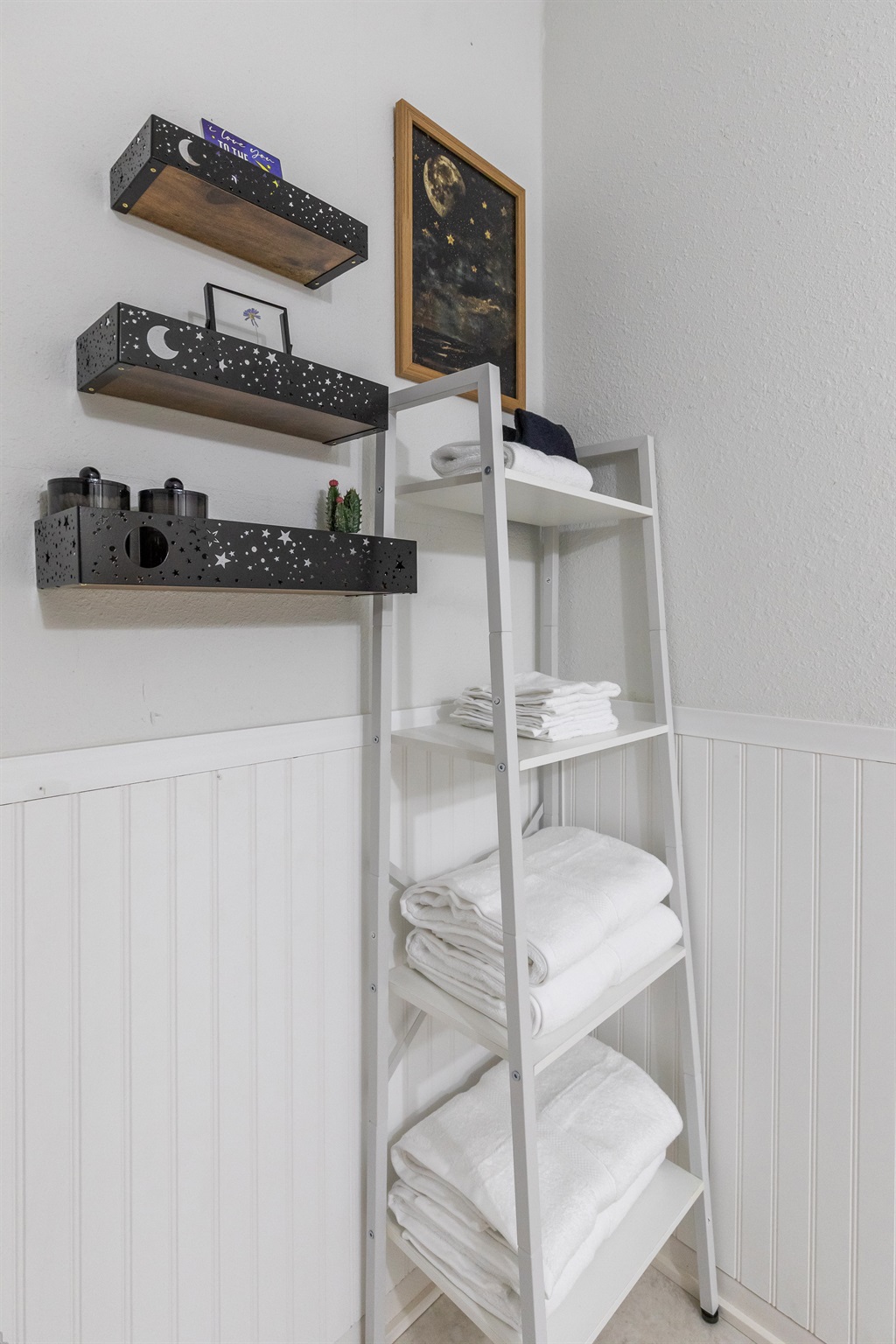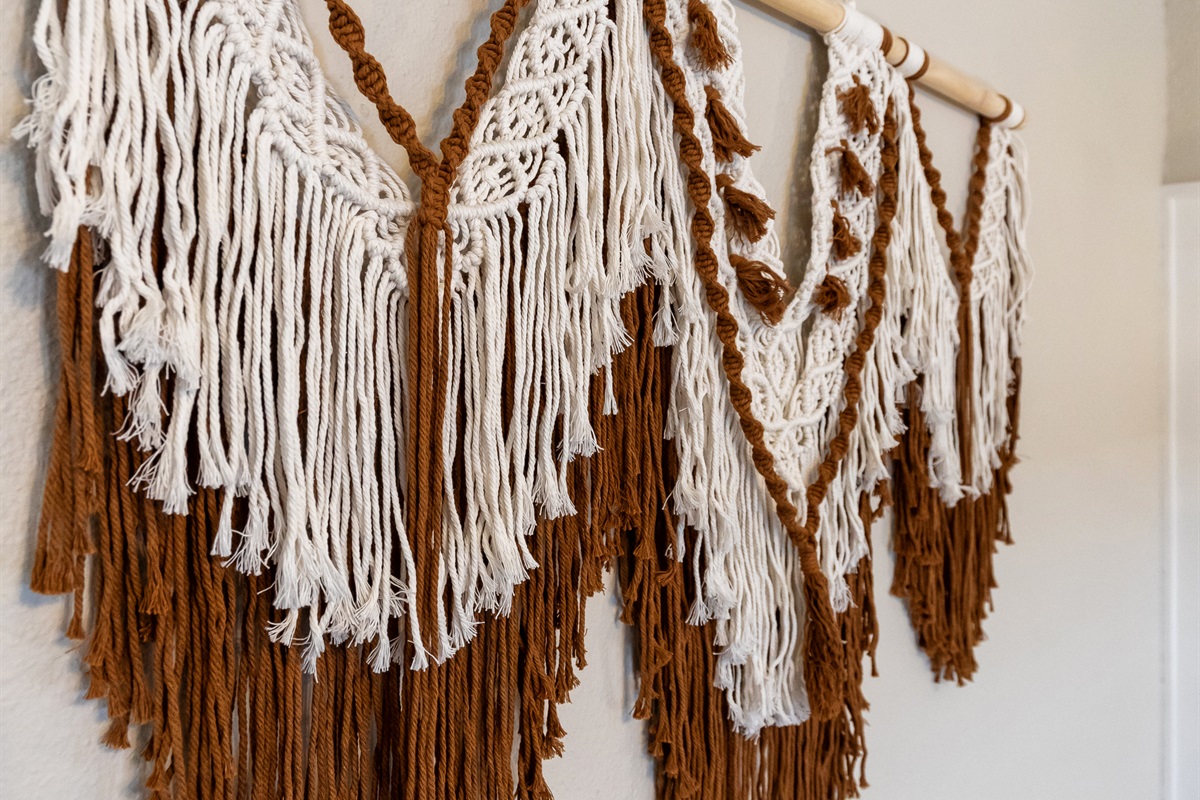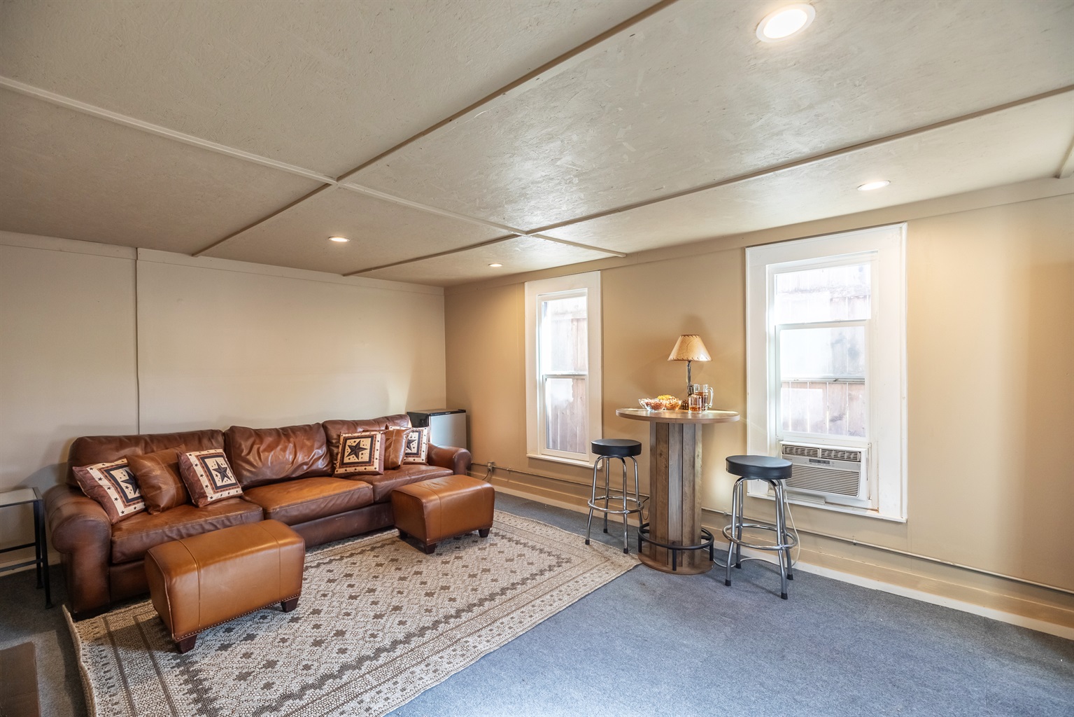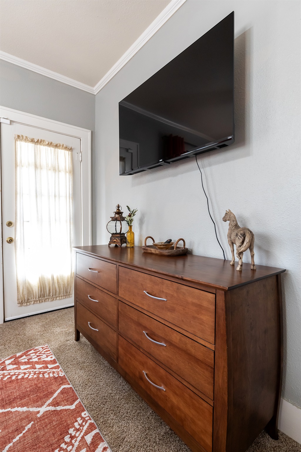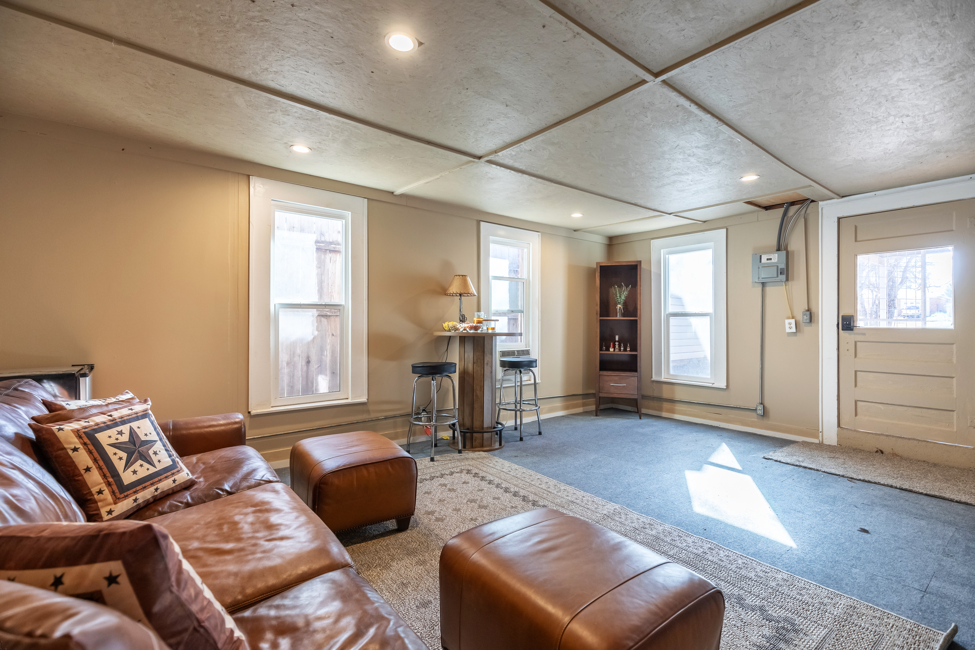 Step into the main living room and sink into saddle-brown leather chairs beneath a custom Cowboys and Fairytales mural — part frontier, part fantasy, all Abilene. A shiplap feature wall frames the fireplace and flat-screen TV while cowhide pillows and a Texas star rug keep things rooted in the land that built this town. This is the kind of room where boots come off and stories start.