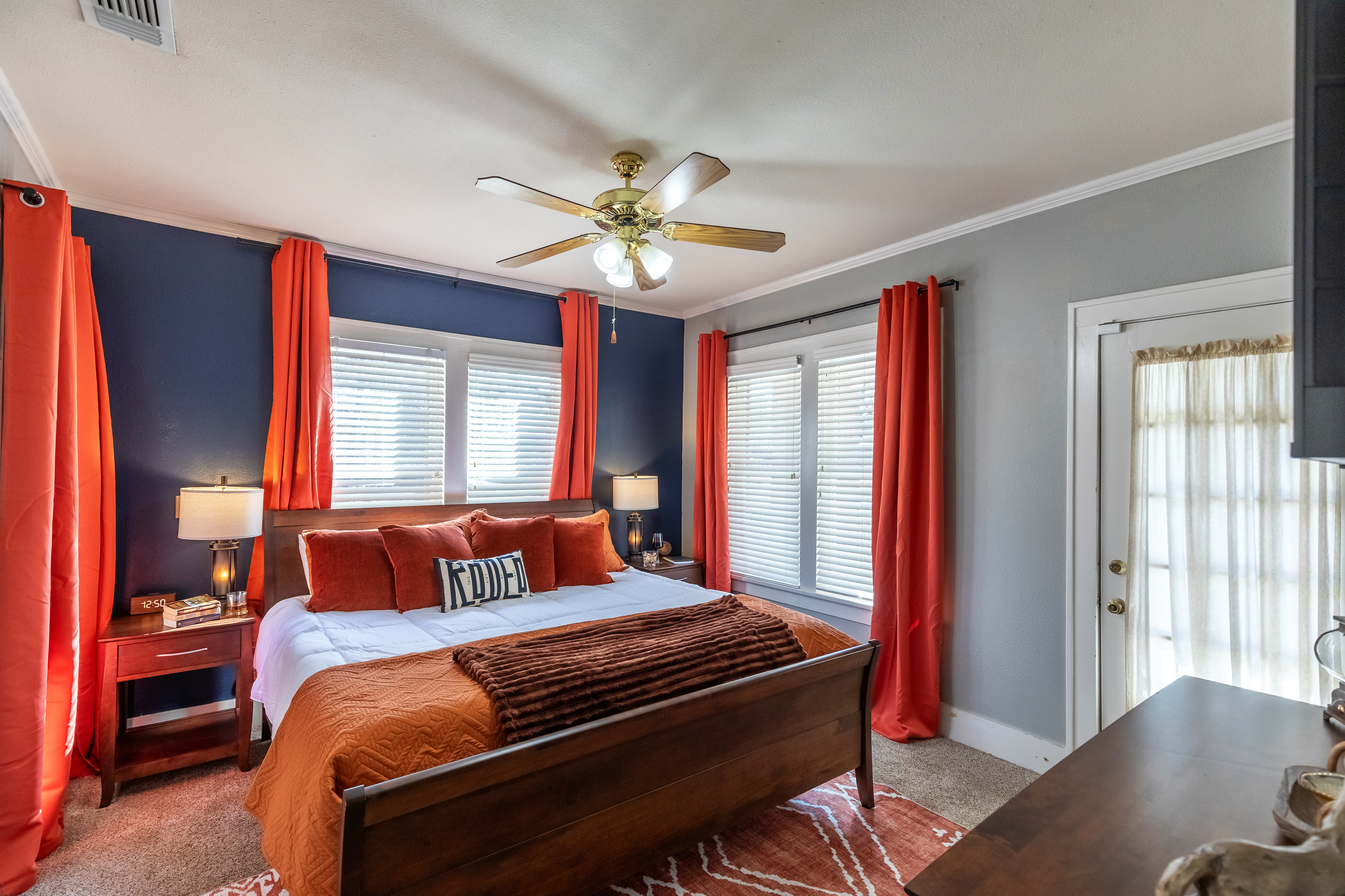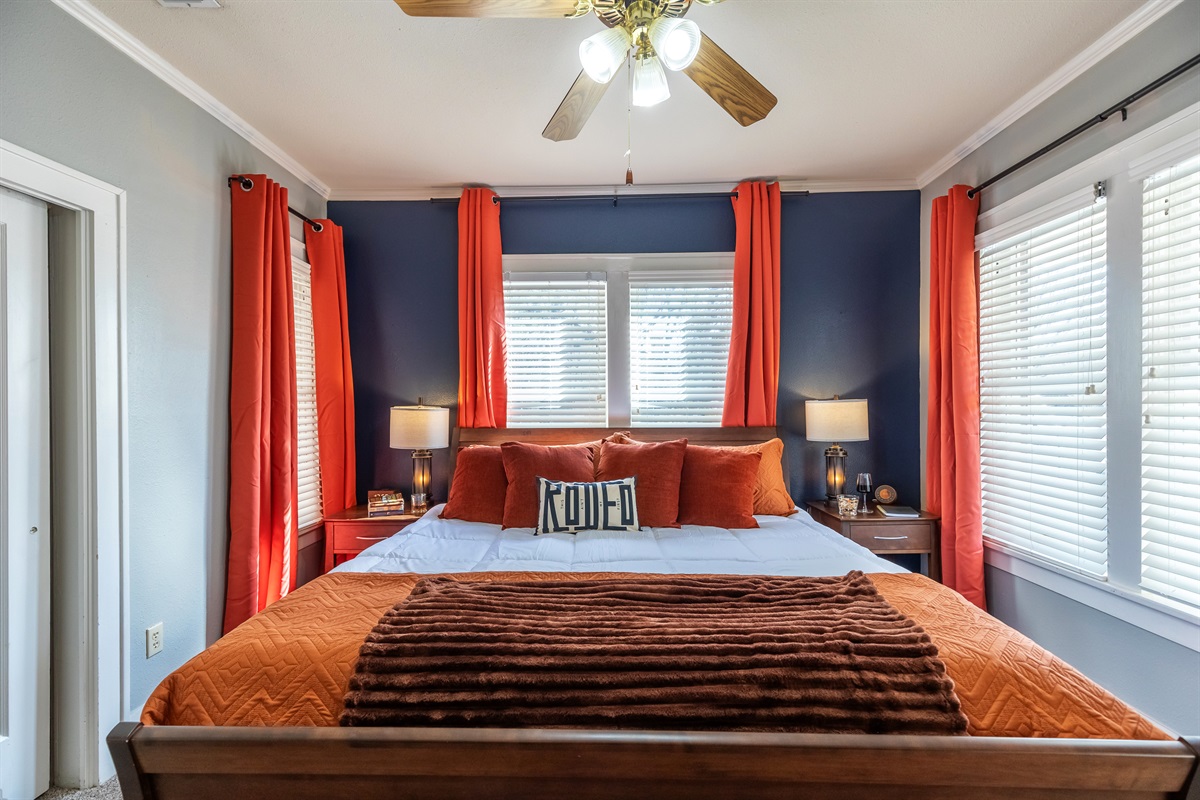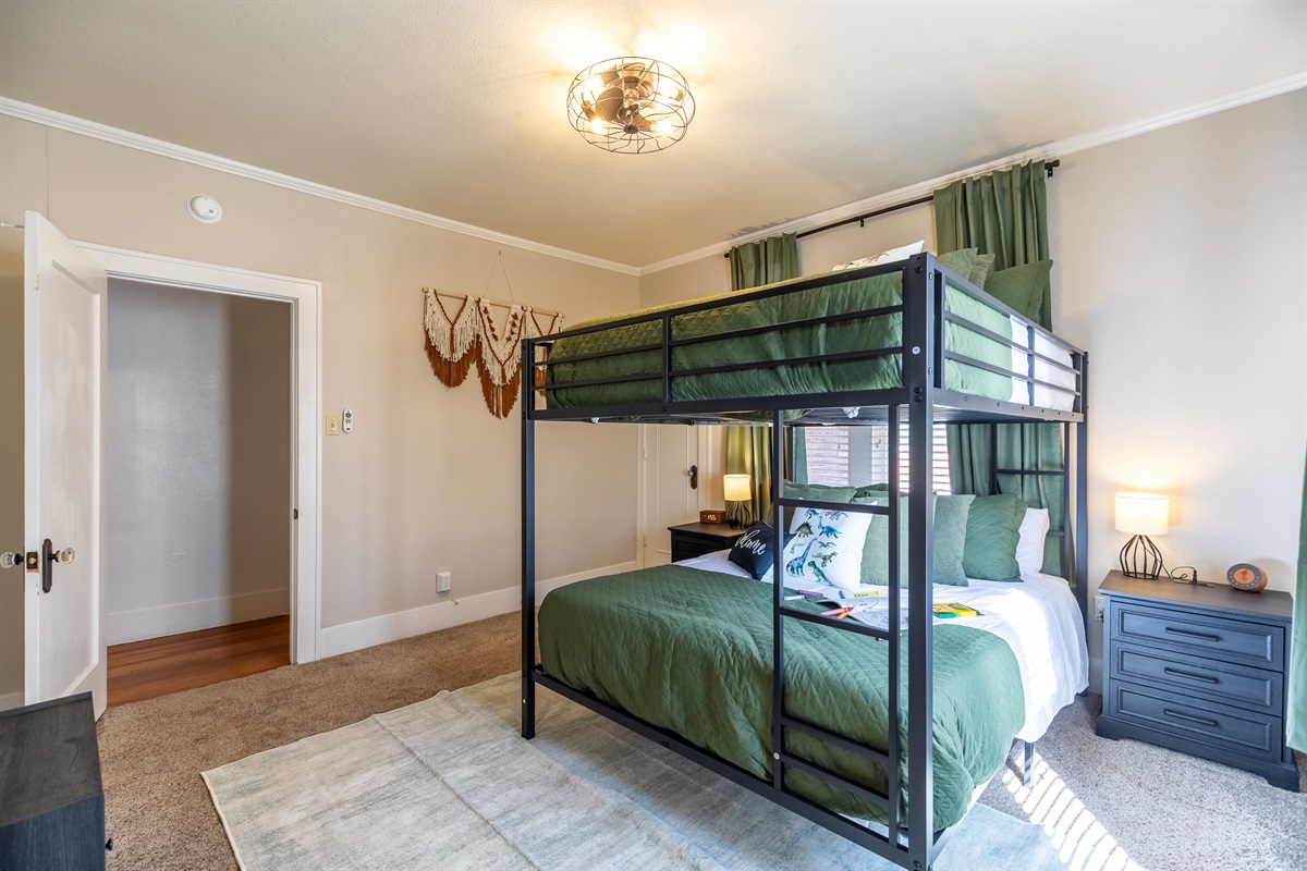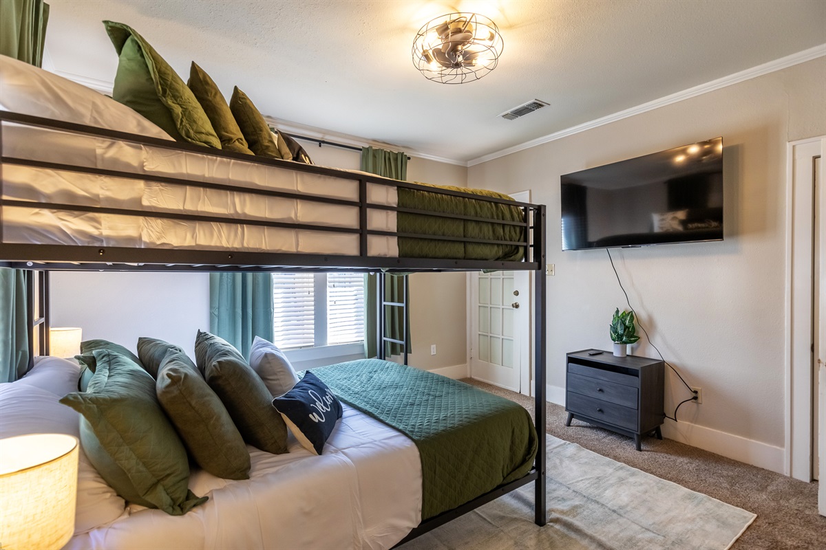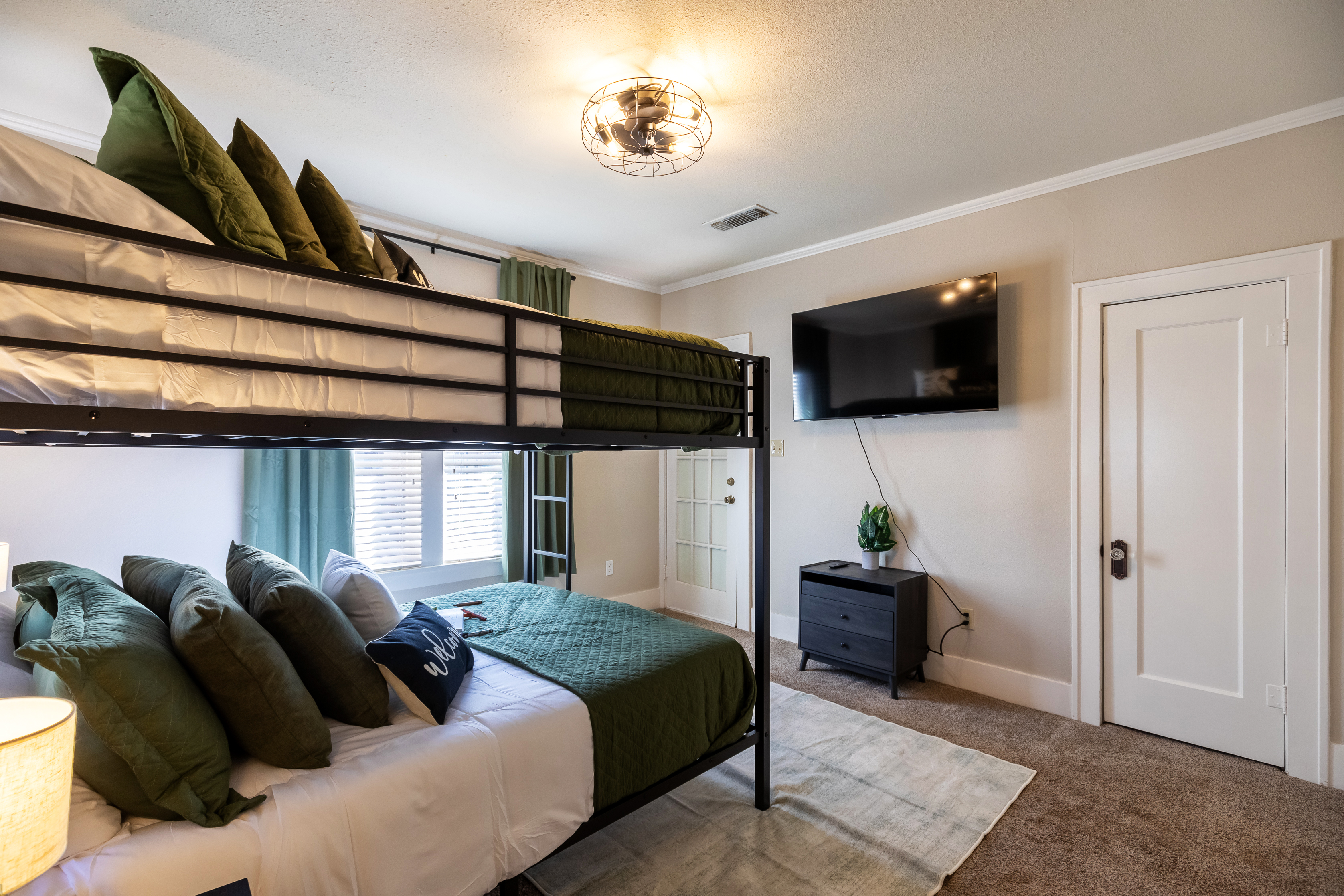 Down a warm hardwood hallway lined with longhorn portraits, three bedrooms each write their own chapter. The primary suite goes bold — deep navy accent wall, a classic wood sleigh bed dressed in rust and orange, and a "RODEO" pillow that makes no apologies. The second bedroom stacks up with a queen-over-queen bunk dressed in deep forest green, built for families and groups who need the room. The third holds its own with personality to spare.