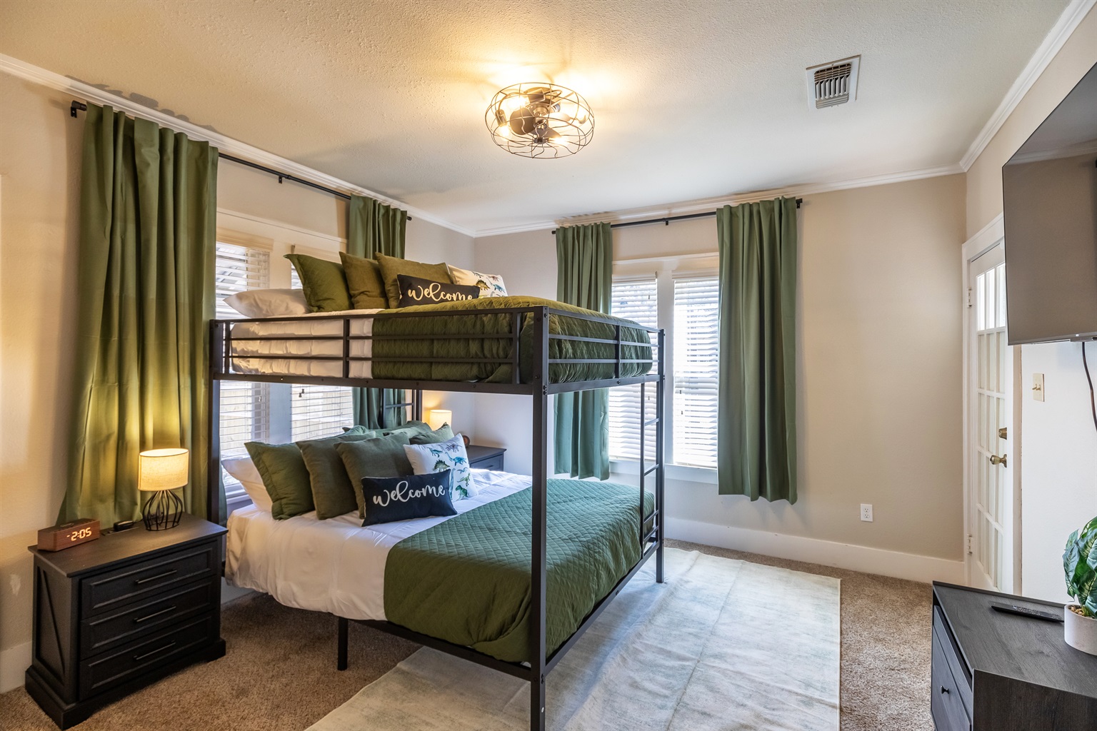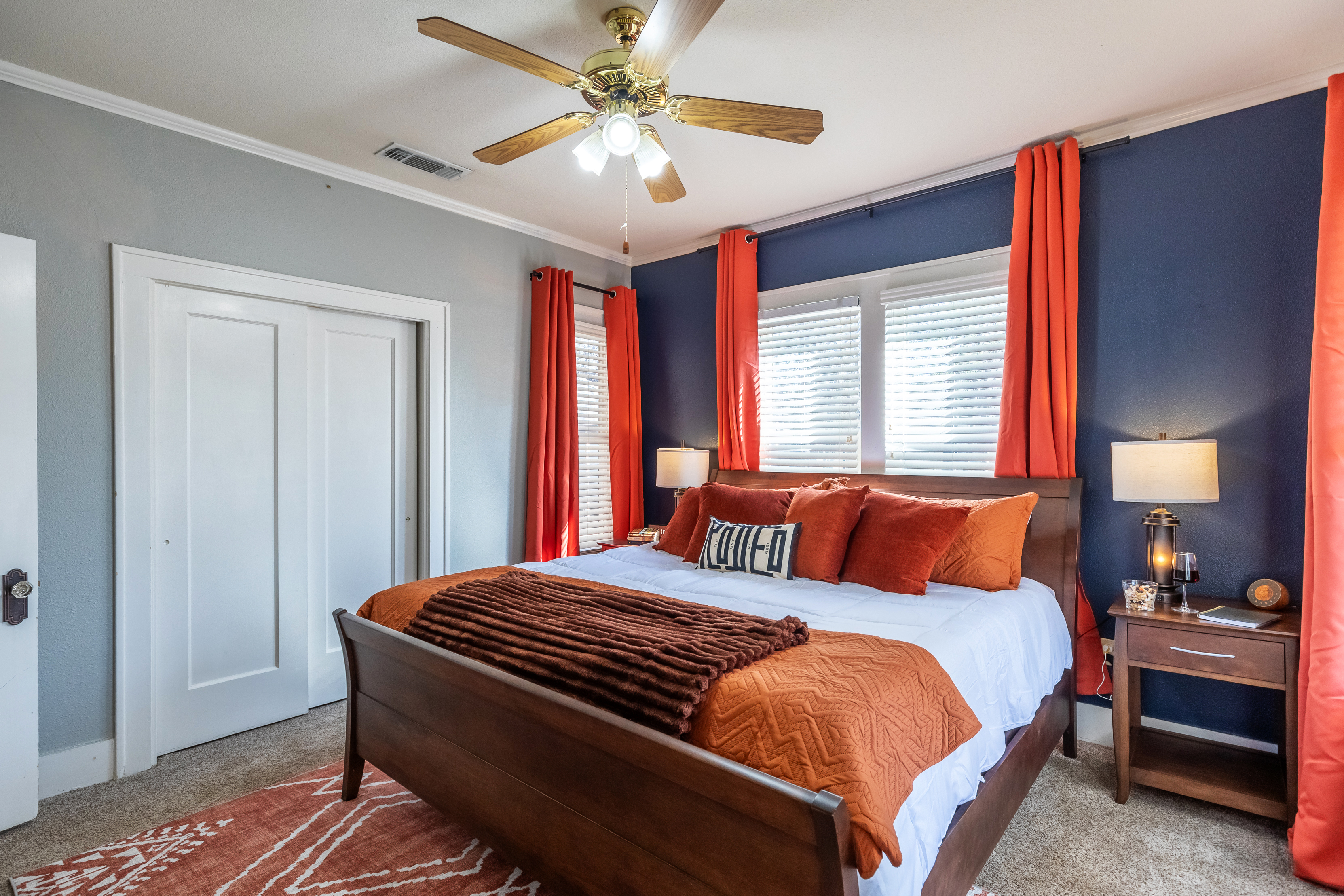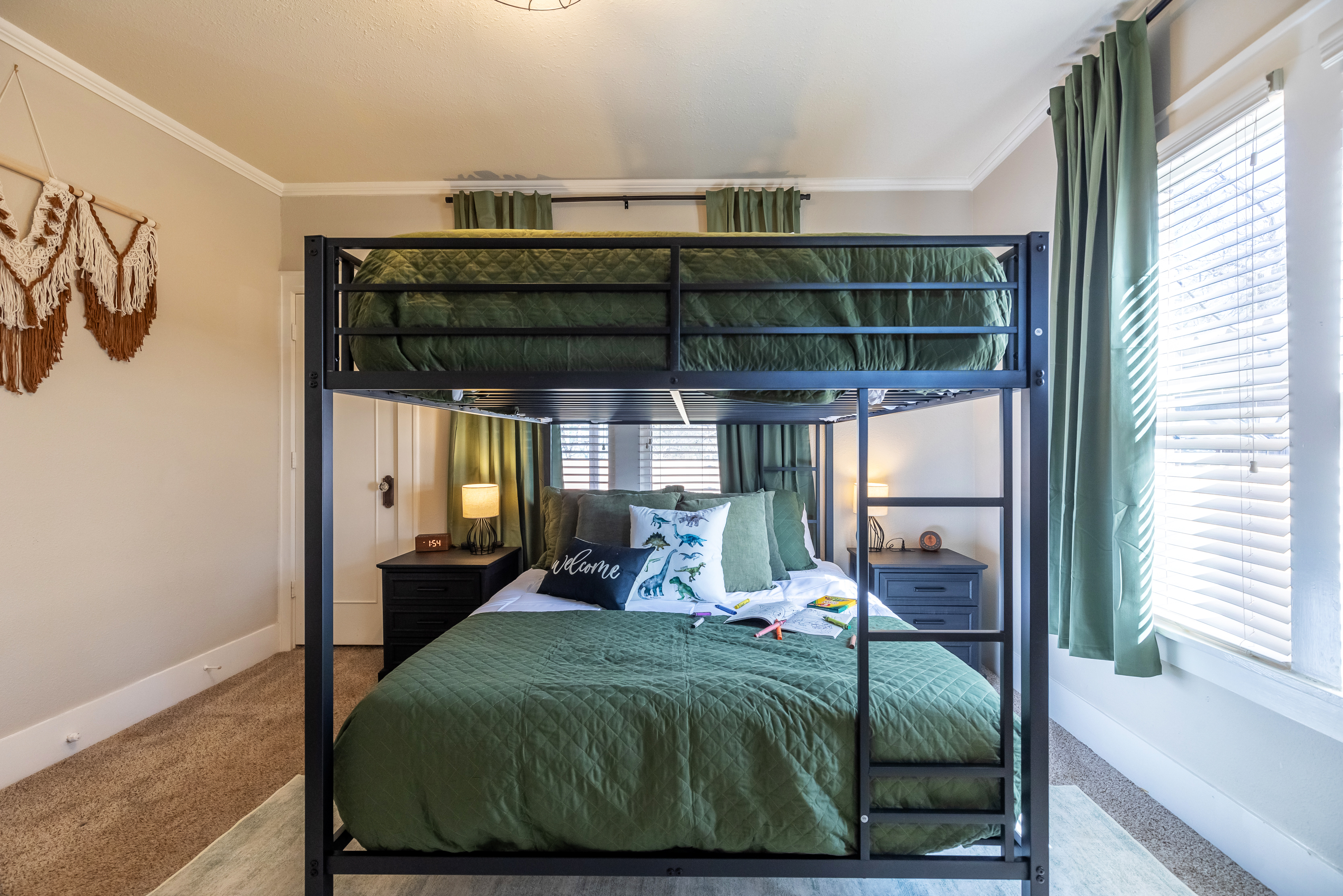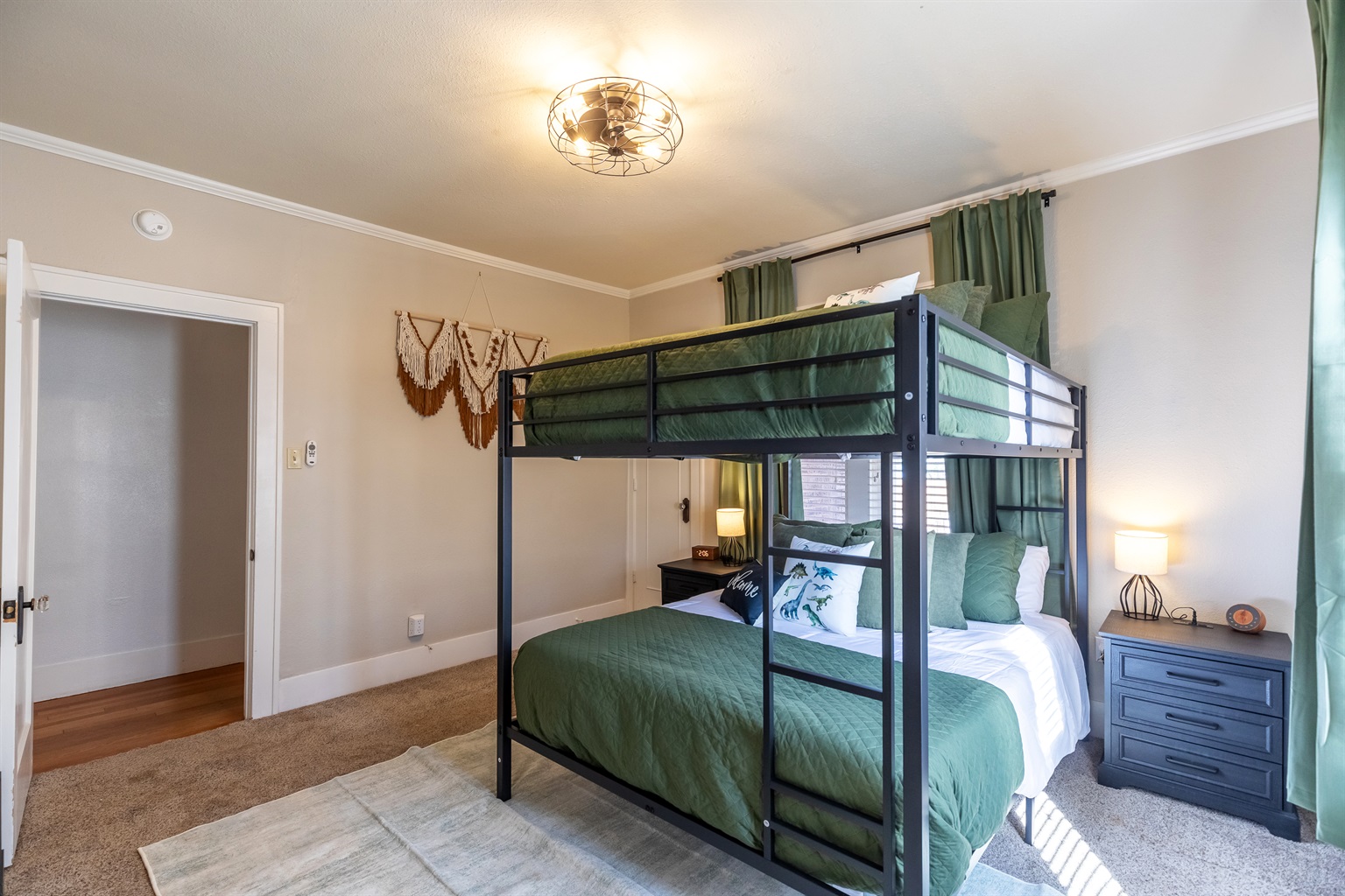 Down a warm hardwood hallway lined with longhorn portraits, three bedrooms each write their own chapter. The primary suite goes bold — deep navy accent wall, a classic wood sleigh bed dressed in rust and orange, and a "RODEO" pillow that makes no apologies. The second bedroom stacks up with a queen-over-queen bunk dressed in deep forest green, built for families and groups who need the room. The third holds its own with personality to spare.
