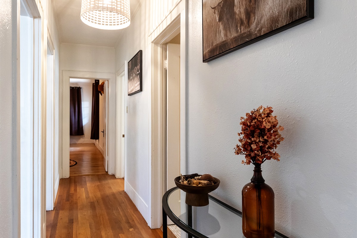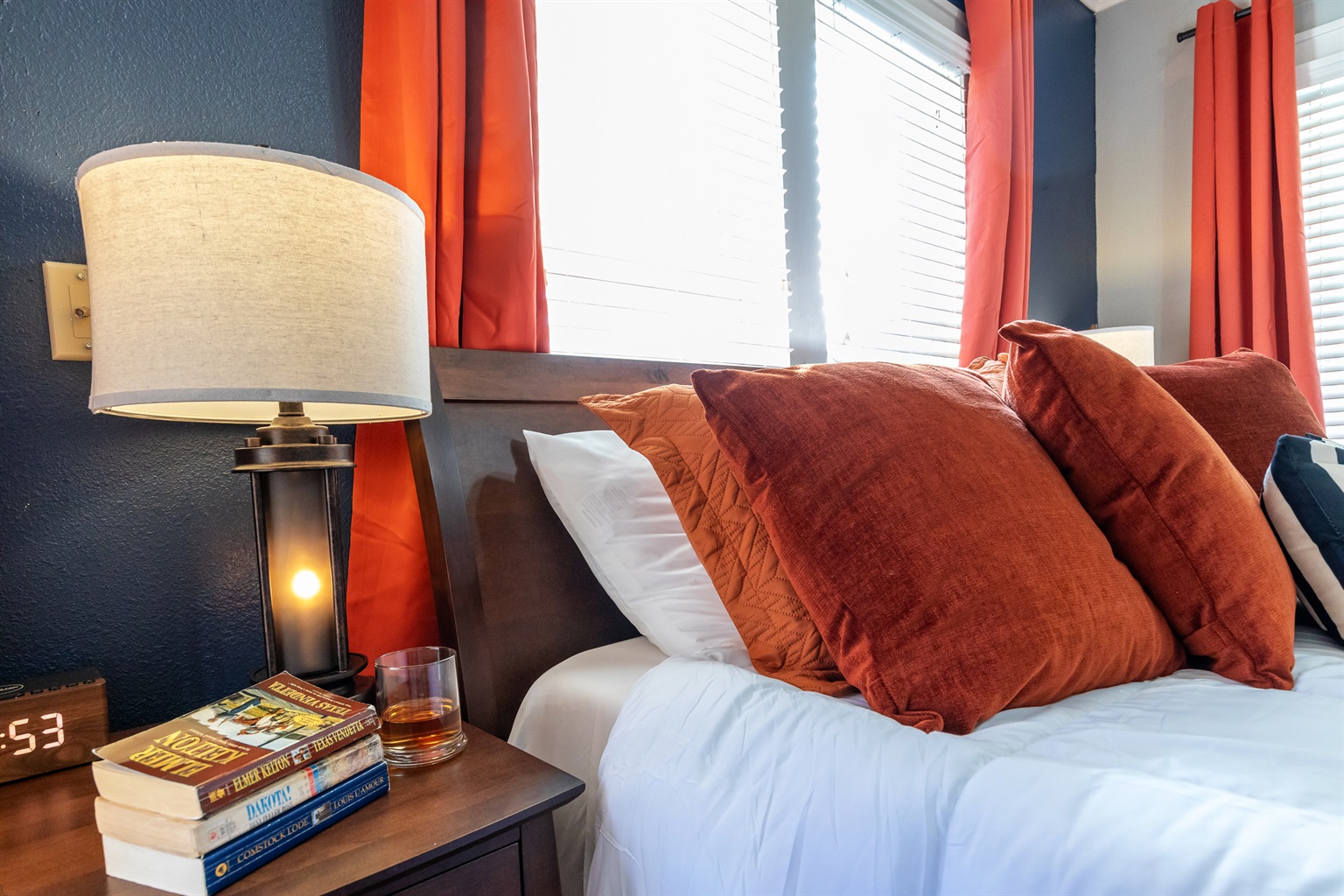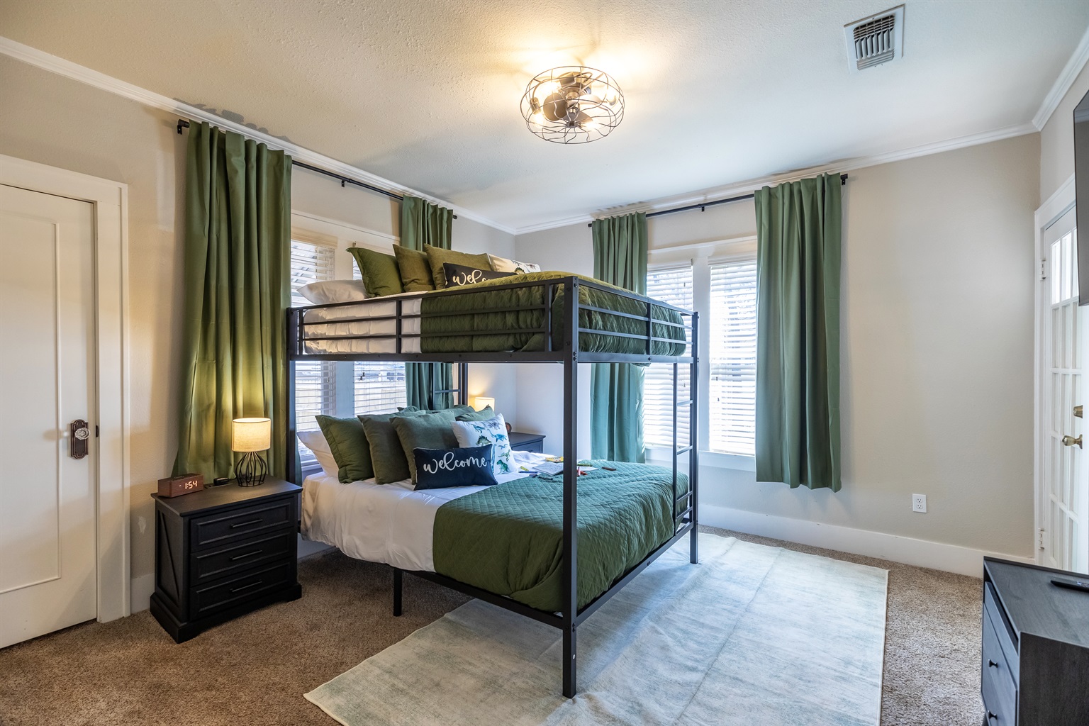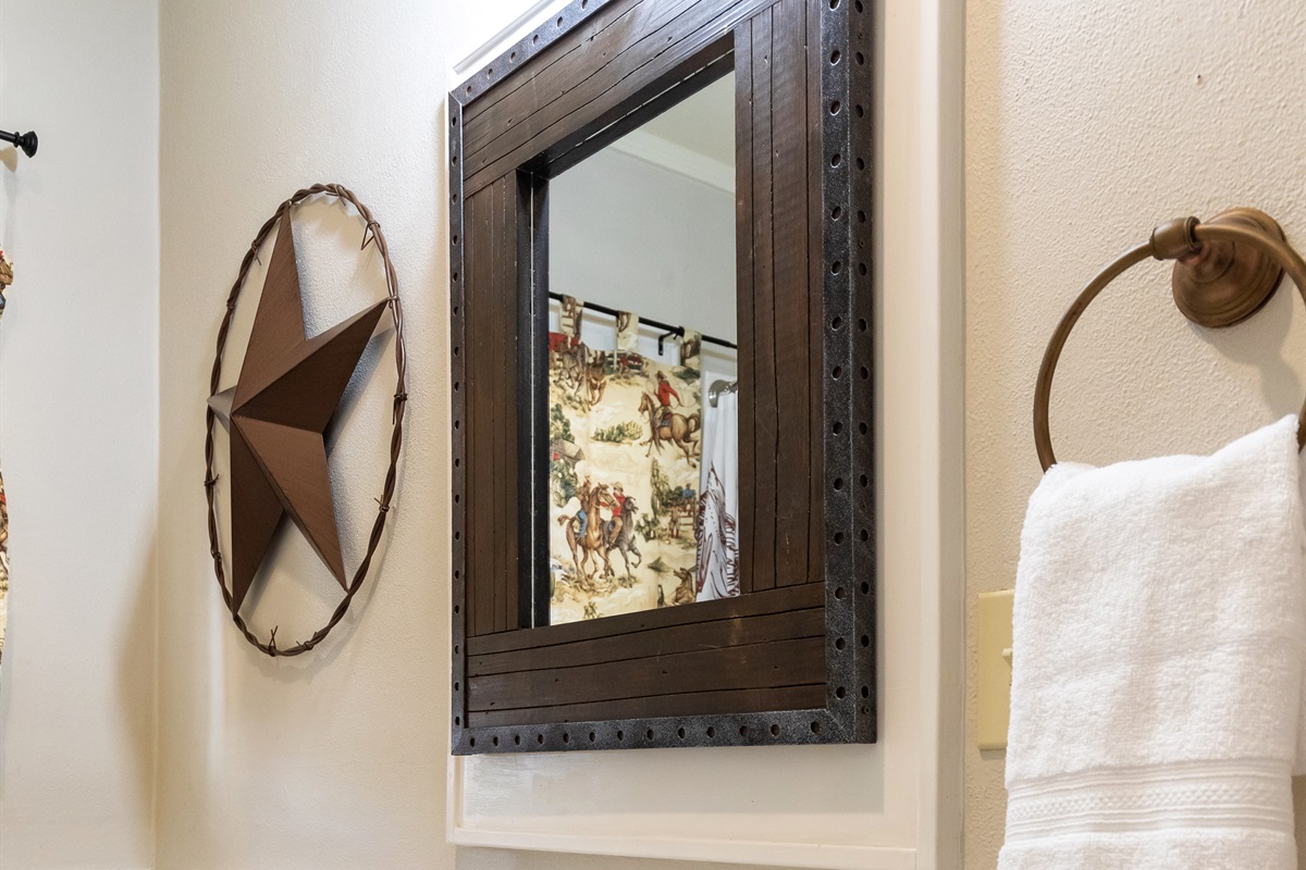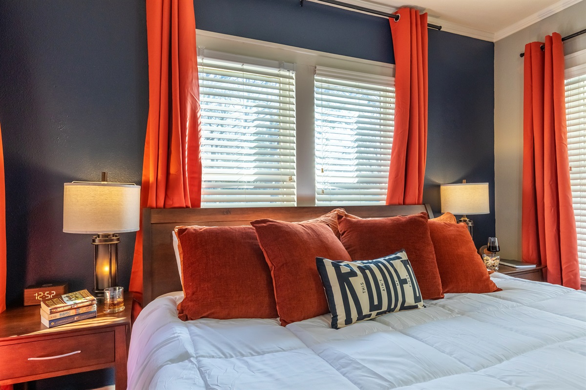 Down a warm hardwood hallway lined with longhorn portraits, three bedrooms each write their own chapter. The primary suite goes bold — deep navy accent wall, a classic wood sleigh bed dressed in rust and orange, and a "RODEO" pillow that makes no apologies. The second bedroom stacks up with a queen-over-queen bunk dressed in deep forest green, built for families and groups who need the room. The third holds its own with personality to spare.