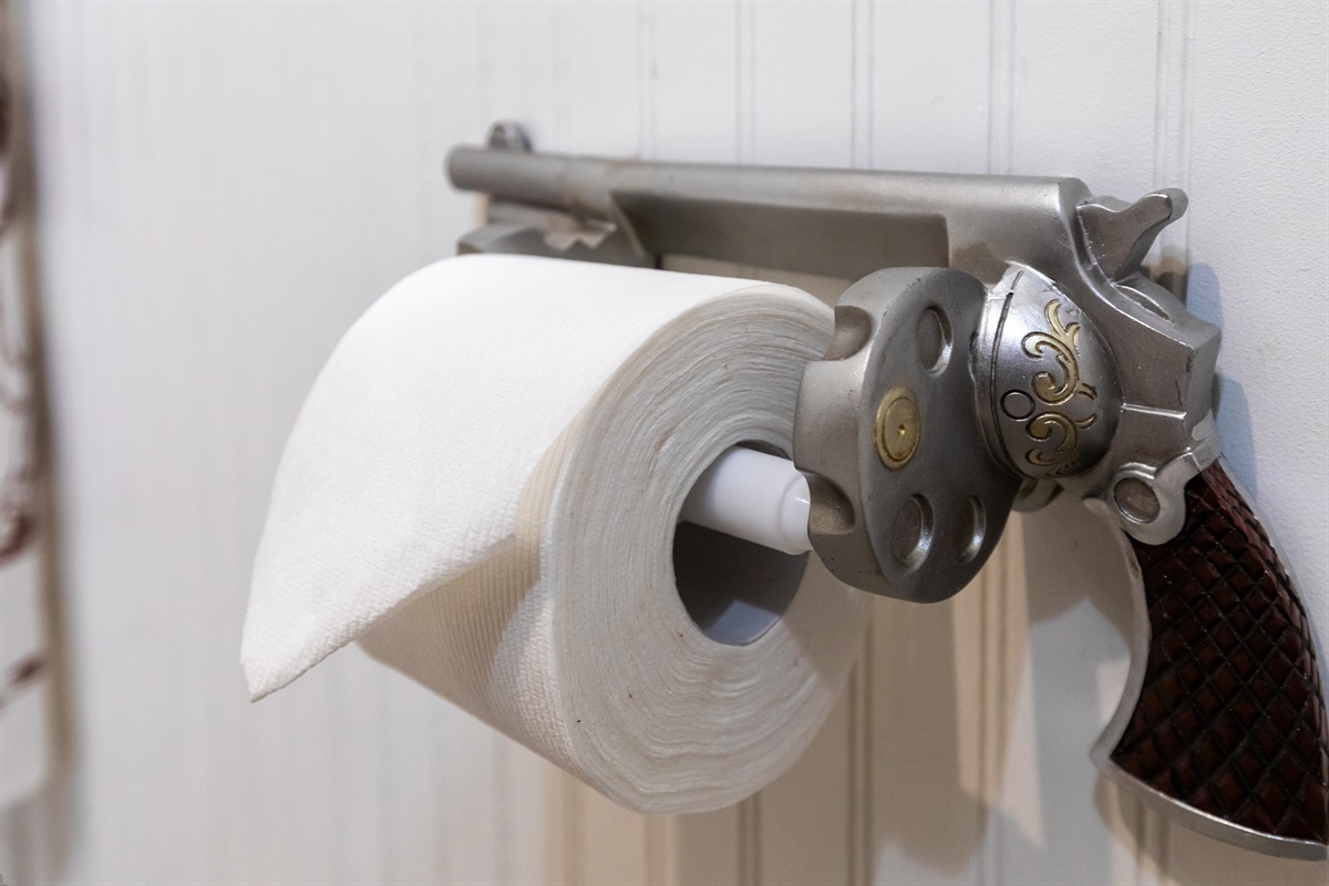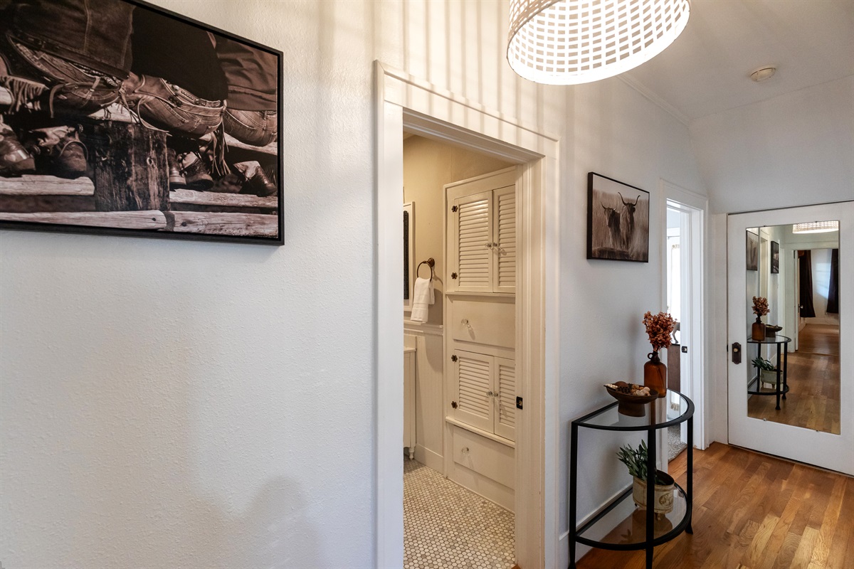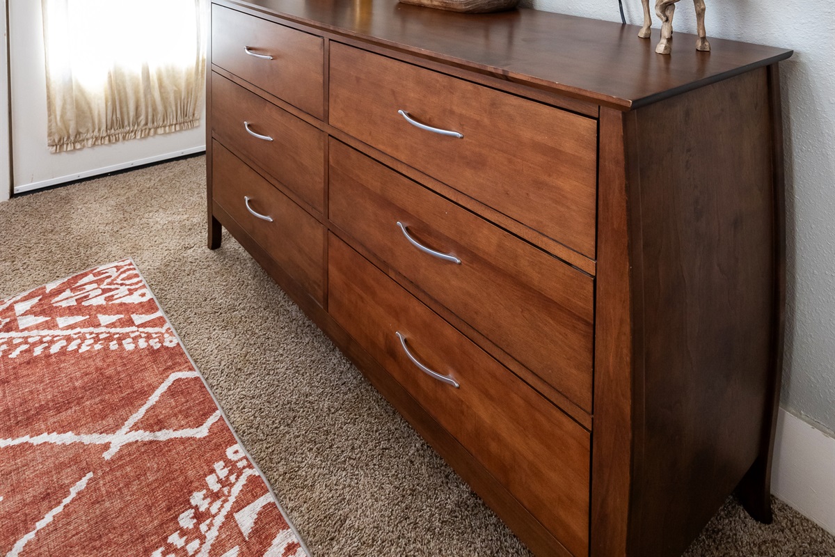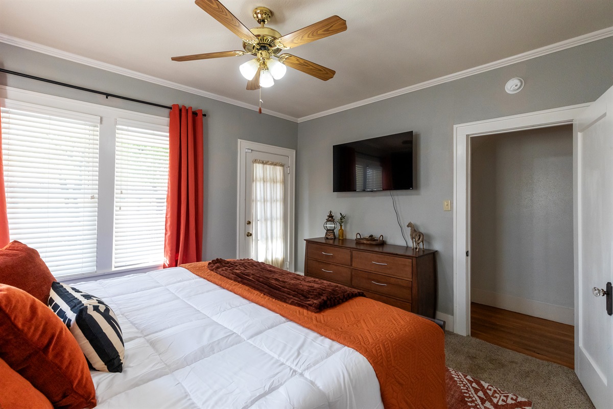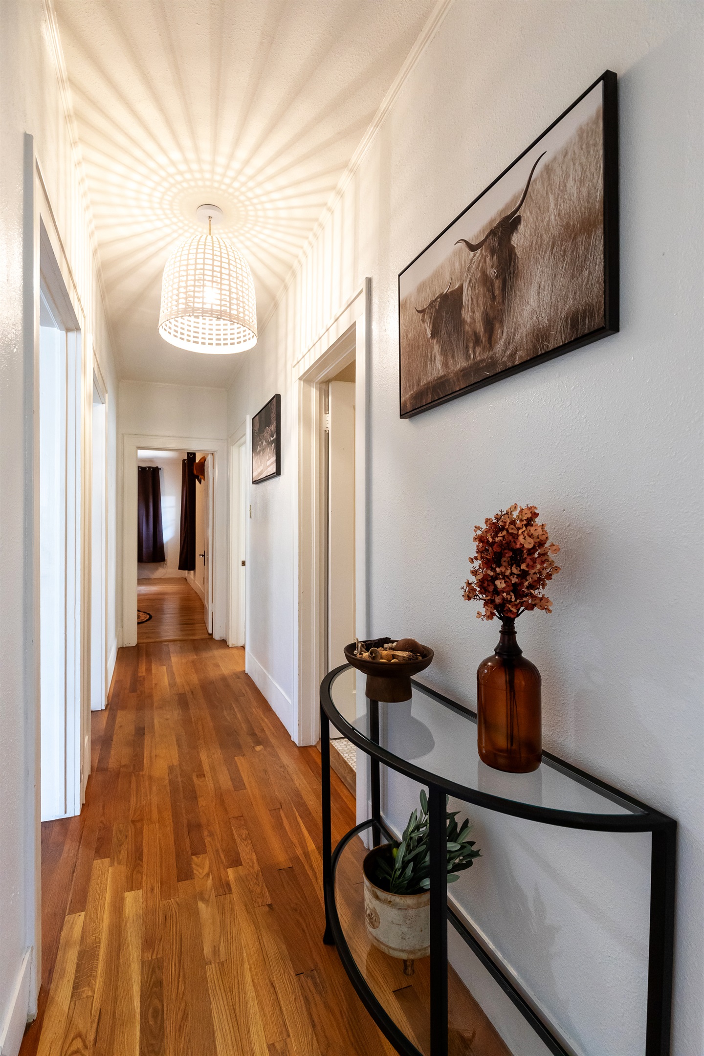 Down a warm hardwood hallway lined with longhorn portraits, three bedrooms each write their own chapter. The primary suite goes bold — deep navy accent wall, a classic wood sleigh bed dressed in rust and orange, and a "RODEO" pillow that makes no apologies. The second bedroom stacks up with a queen-over-queen bunk dressed in deep forest green, built for families and groups who need the room. The third holds its own with personality to spare.