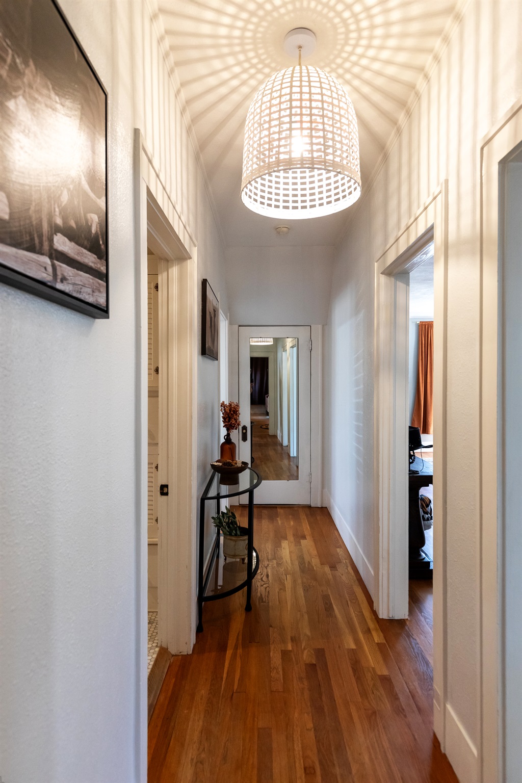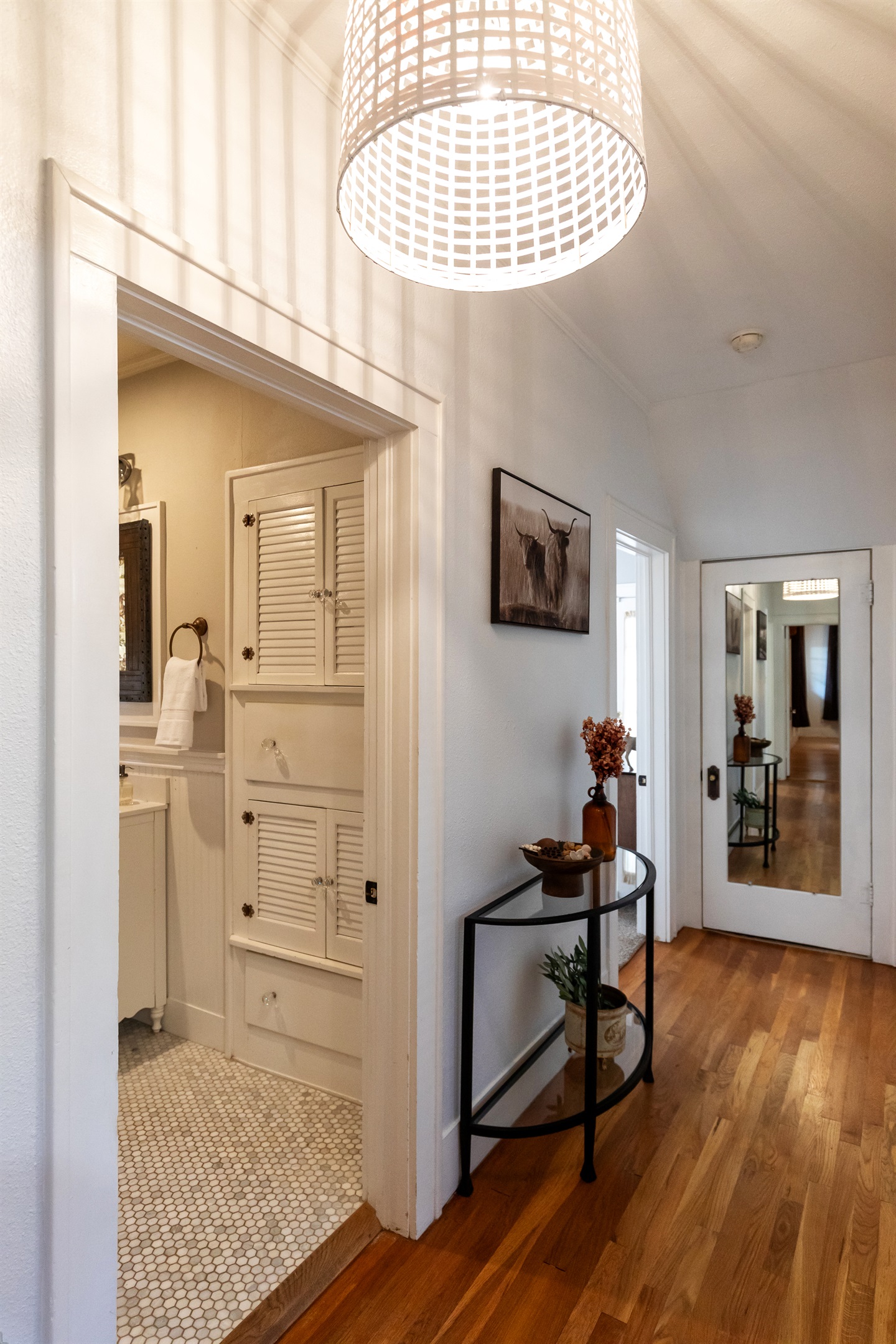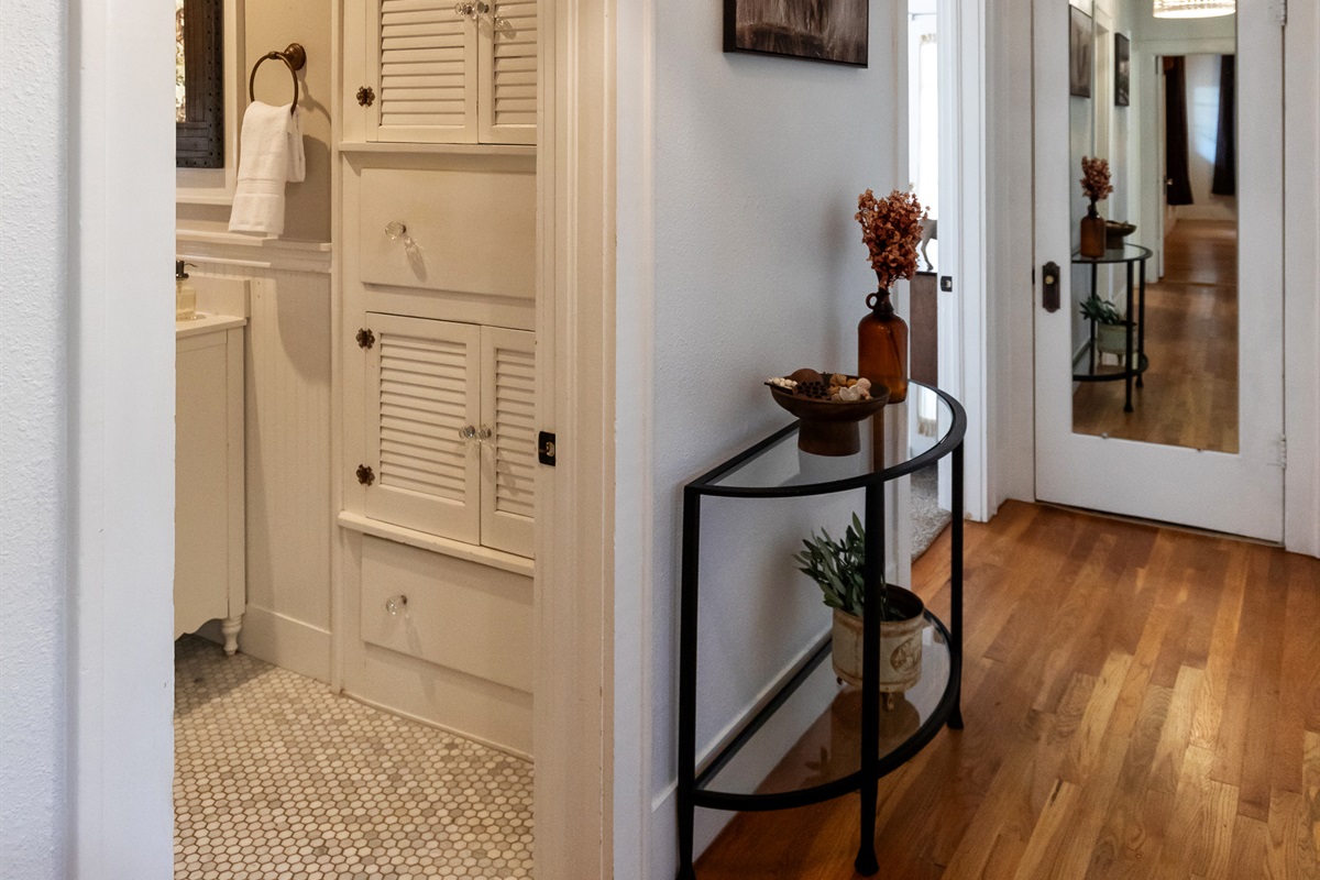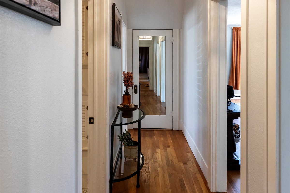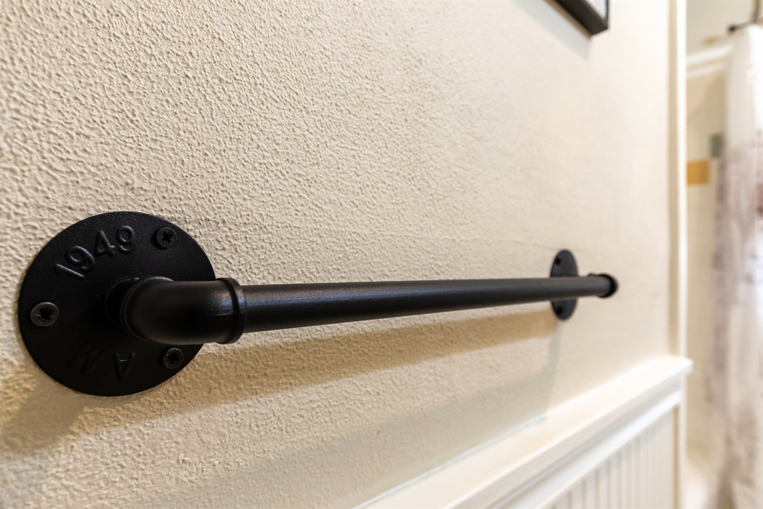 Down a warm hardwood hallway lined with longhorn portraits, three bedrooms each write their own chapter. The primary suite goes bold — deep navy accent wall, a classic wood sleigh bed dressed in rust and orange, and a "RODEO" pillow that makes no apologies. The second bedroom stacks up with a queen-over-queen bunk dressed in deep forest green, built for families and groups who need the room. The third holds its own with personality to spare.
