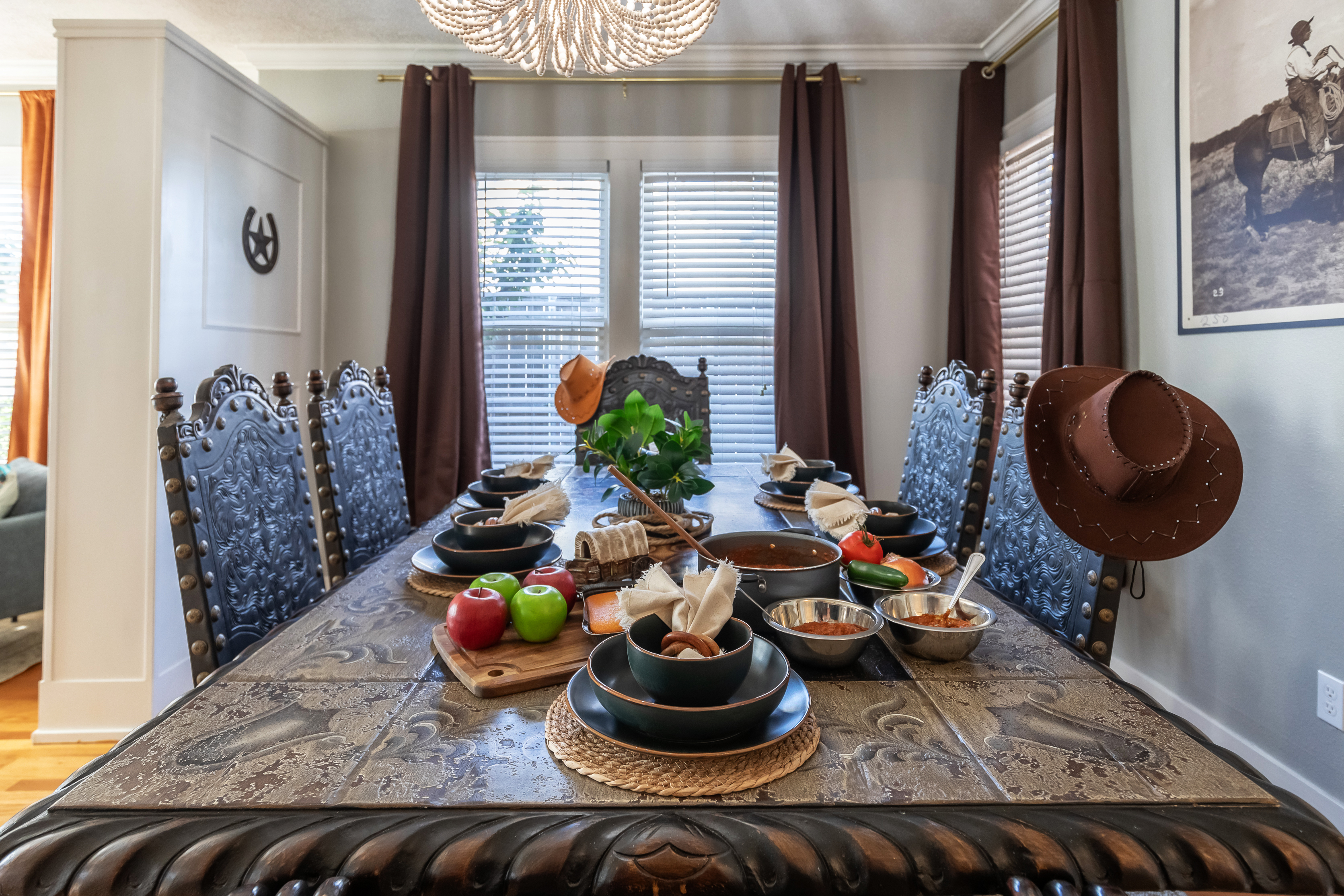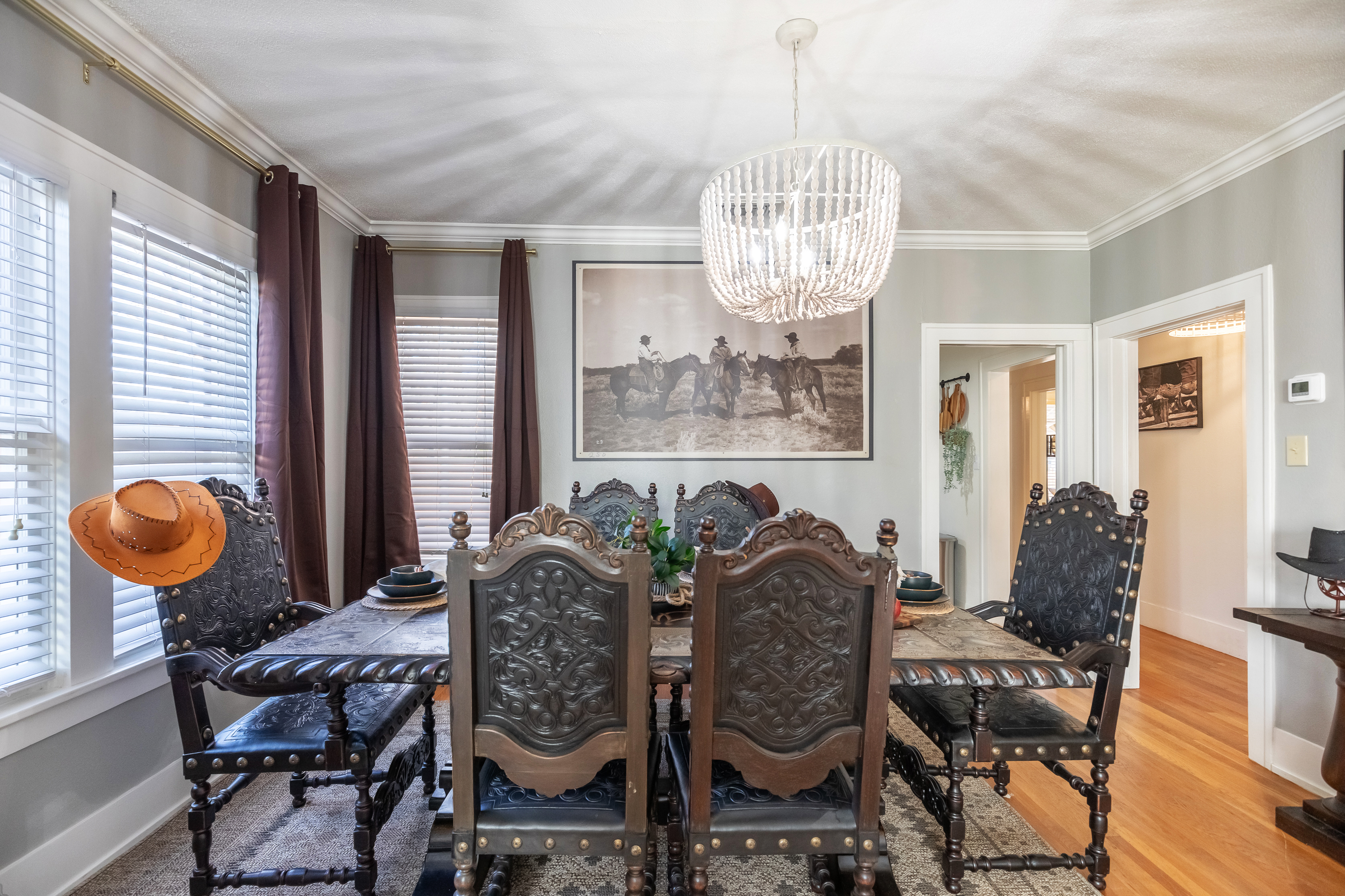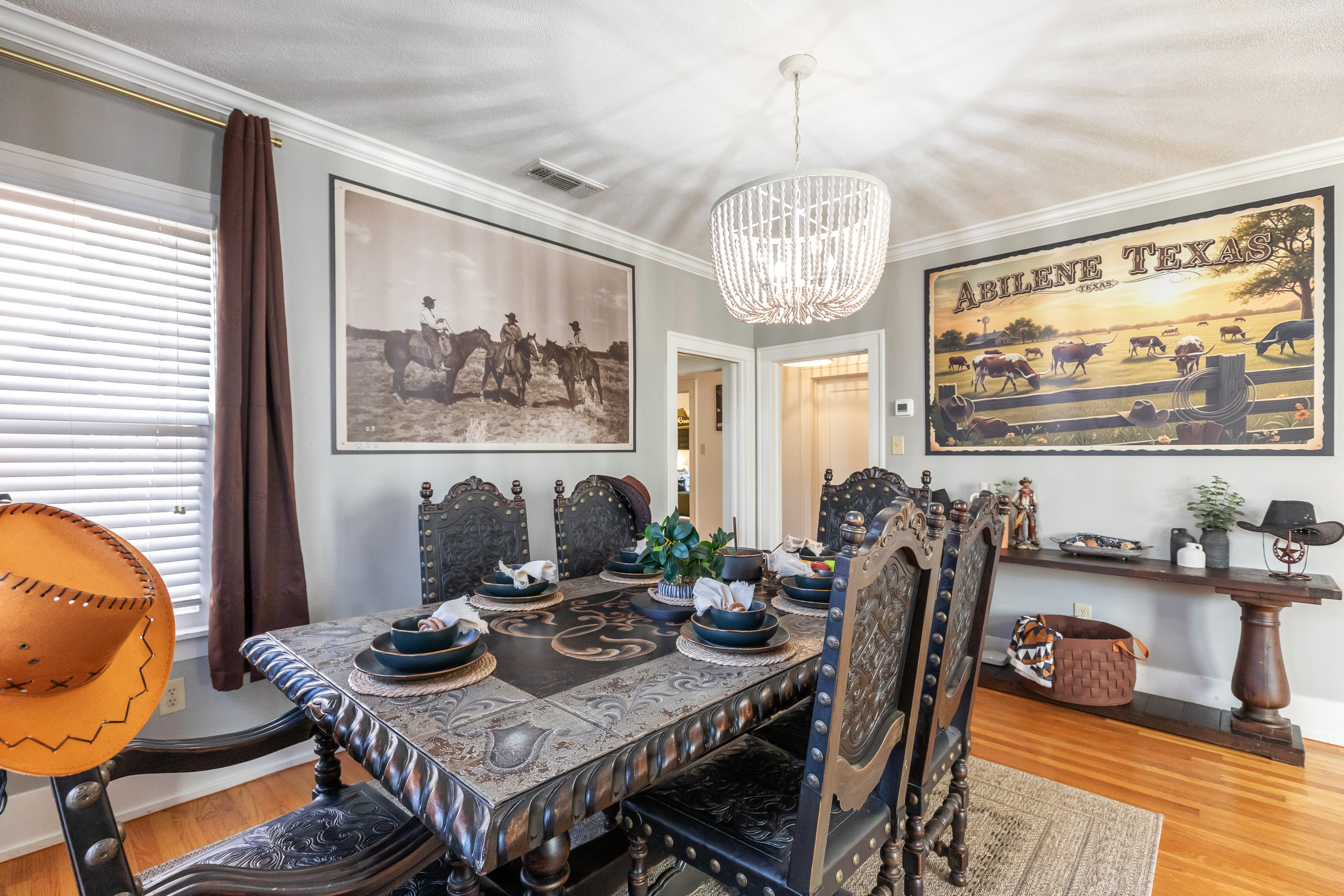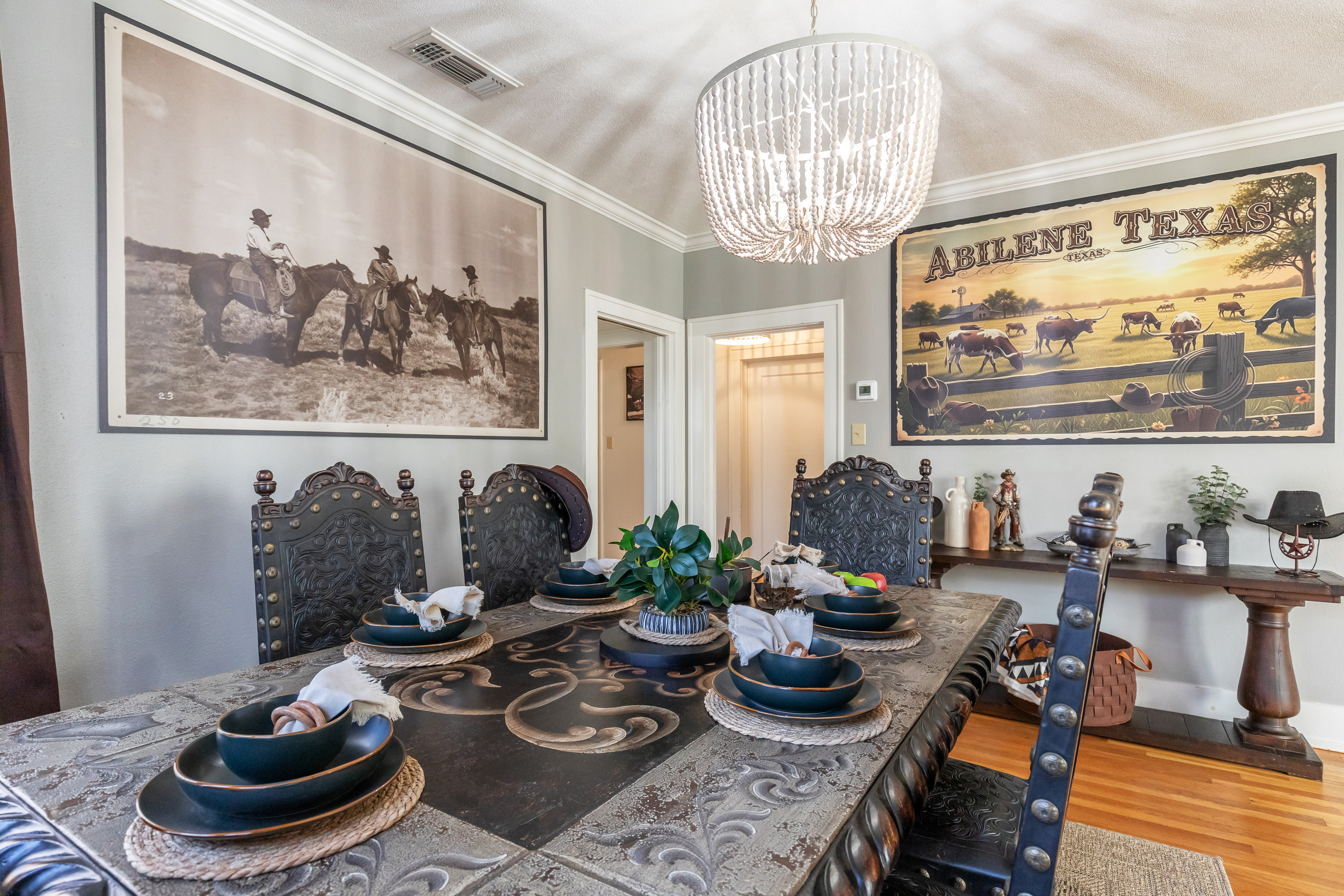 The dining room earns its place at the head of the table. An ornate dark wood table surrounded by hand-carved leather chairs sits beneath a beaded chandelier, flanked by large-scale black-and-white cowboy photography and a sweeping Abilene Texas mural. Pull up a chair. This is where the good meals happen and the long nights begin.