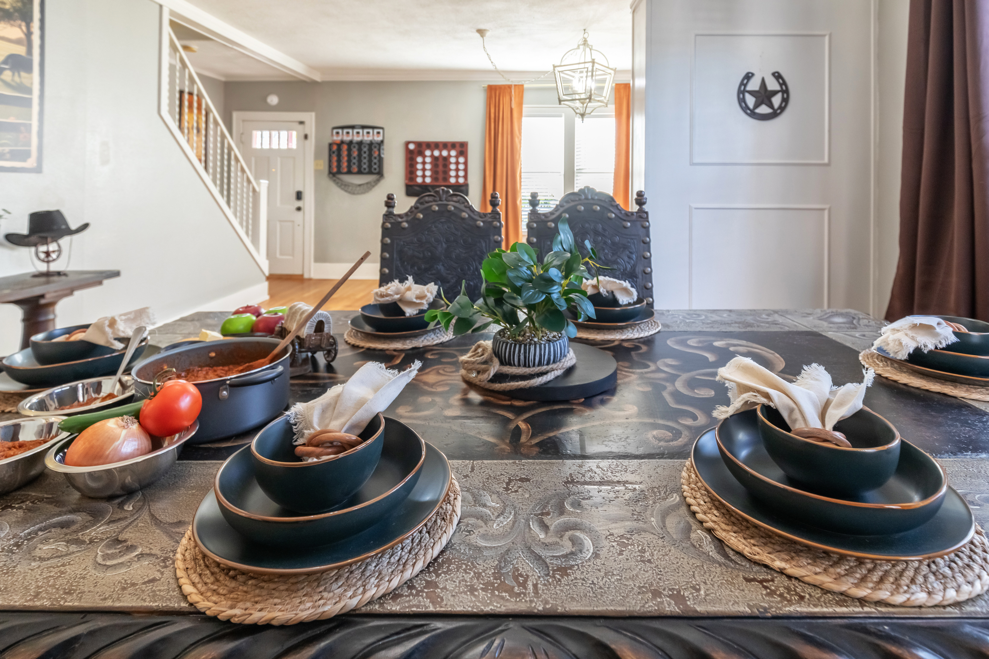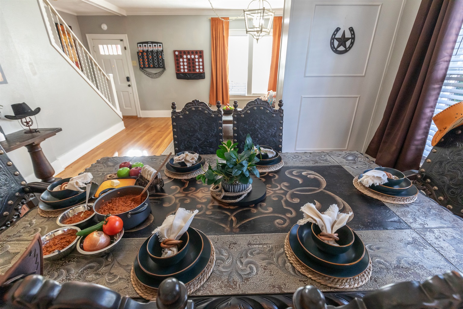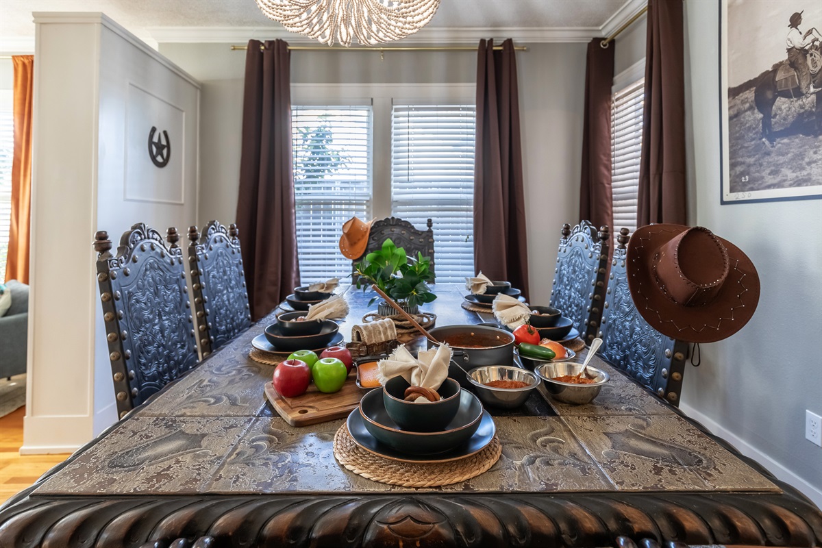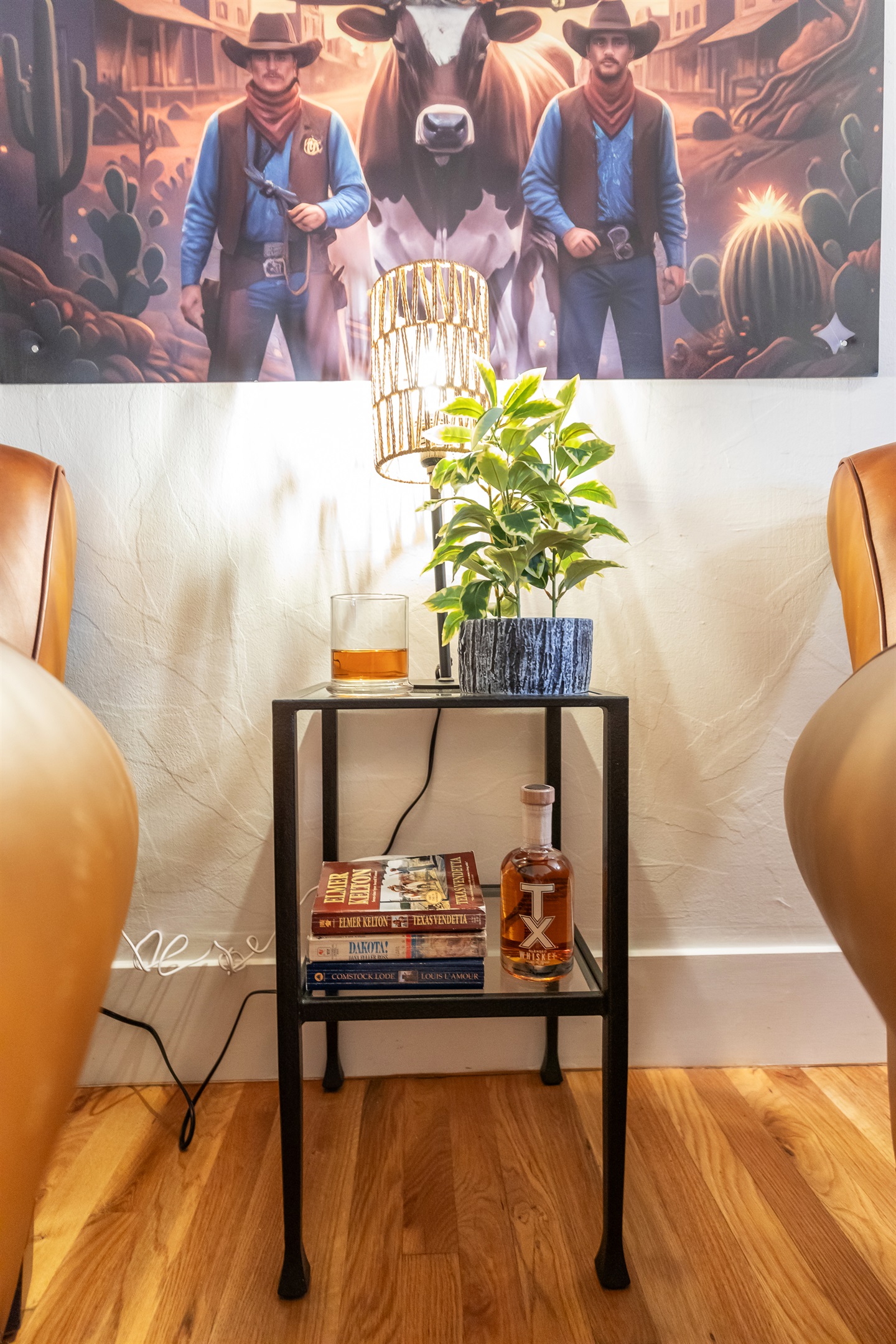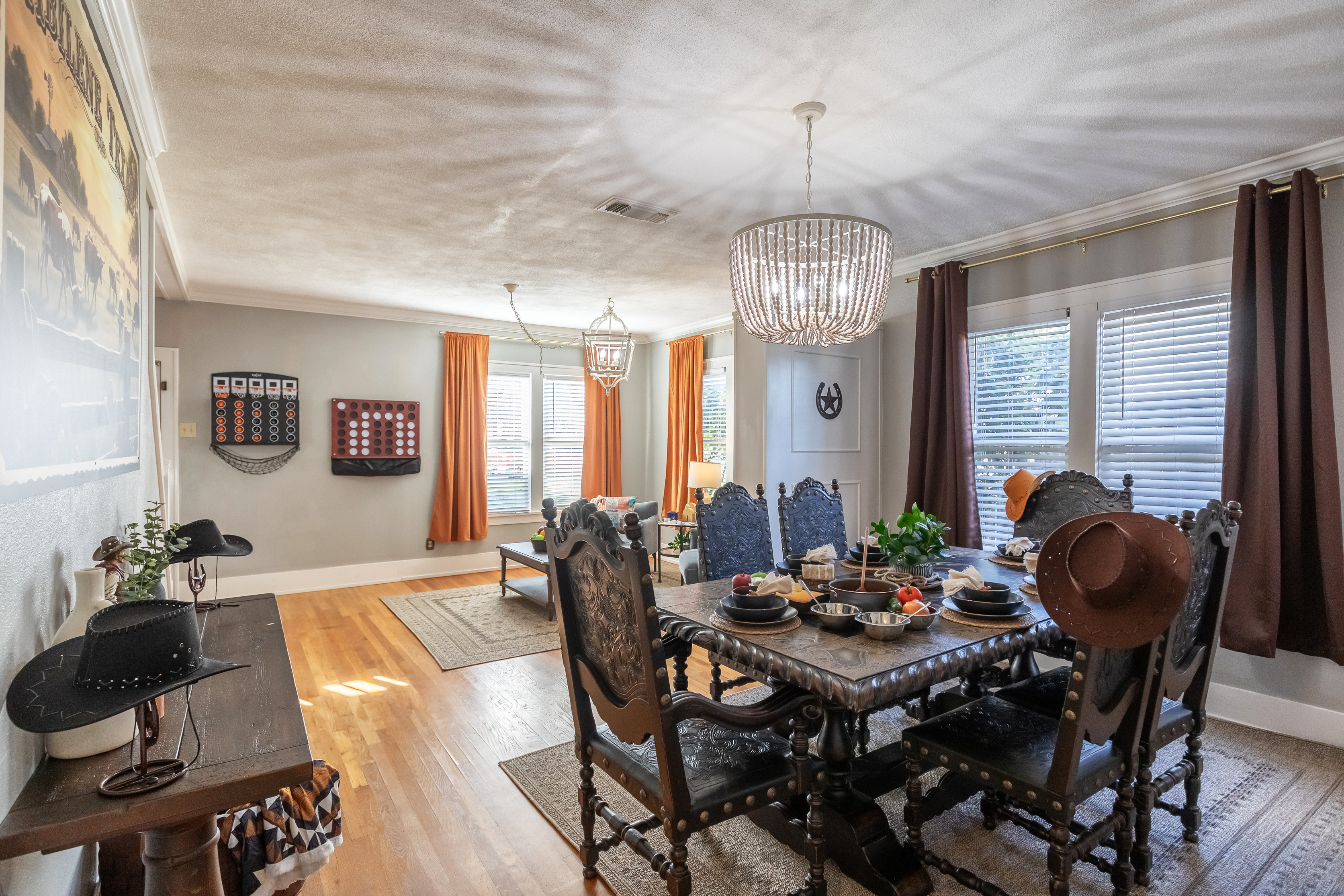 The dining room earns its place at the head of the table. An ornate dark wood table surrounded by hand-carved leather chairs sits beneath a beaded chandelier, flanked by large-scale black-and-white cowboy photography and a sweeping Abilene Texas mural. Pull up a chair. This is where the good meals happen and the long nights begin.