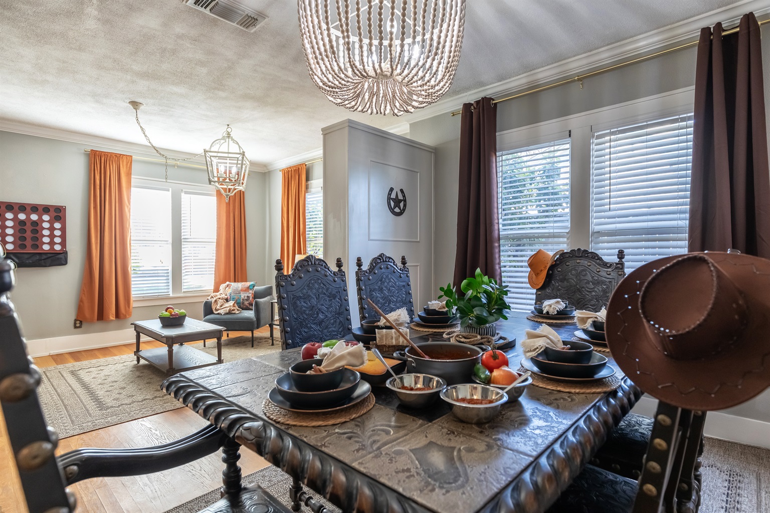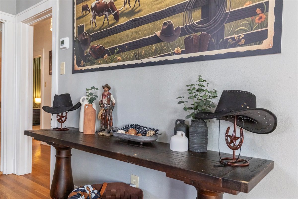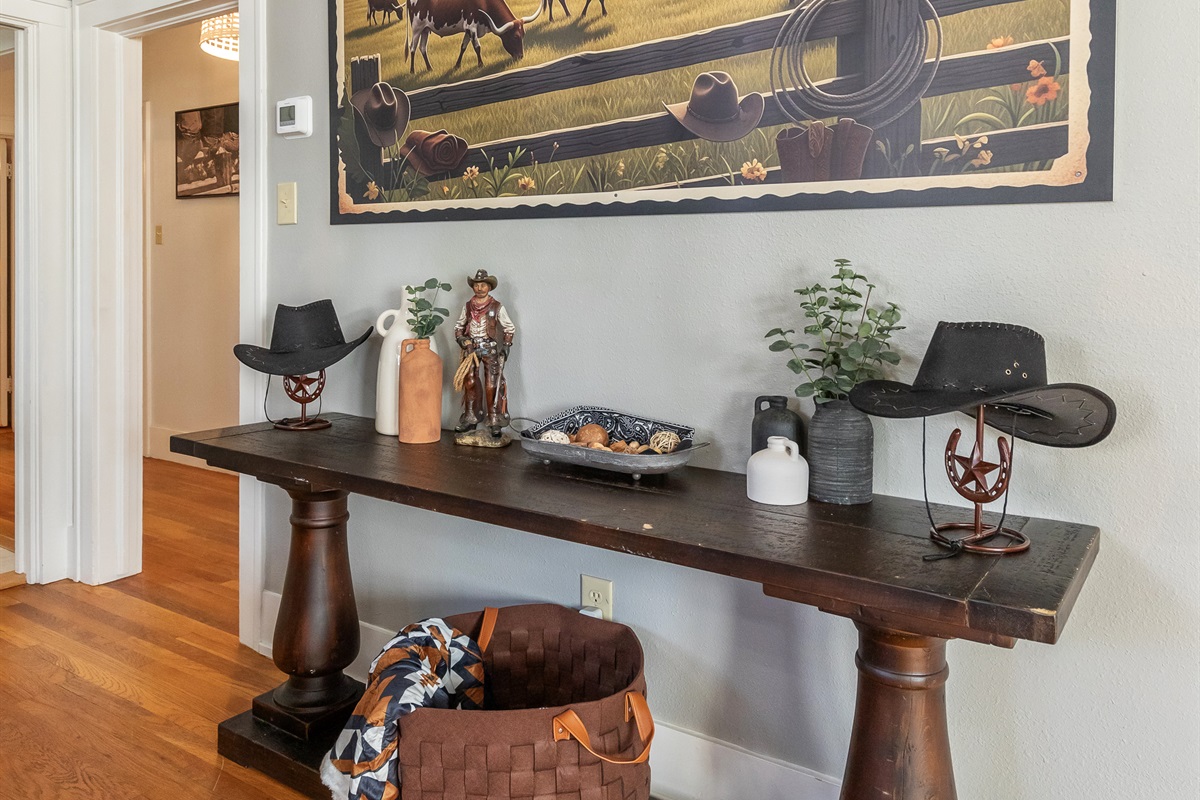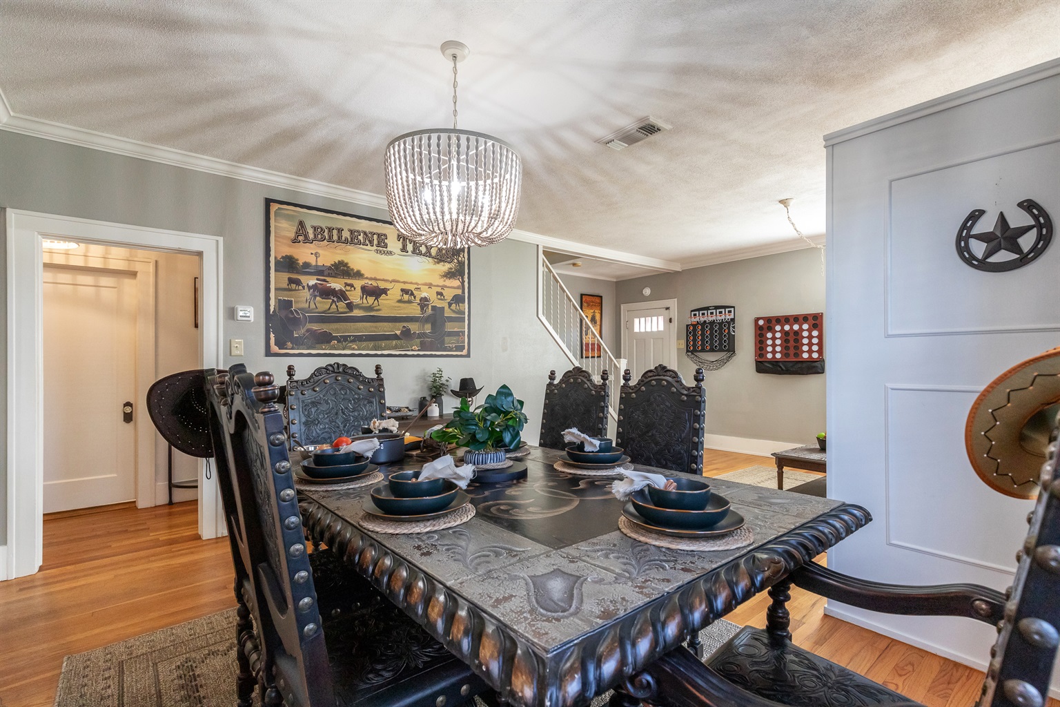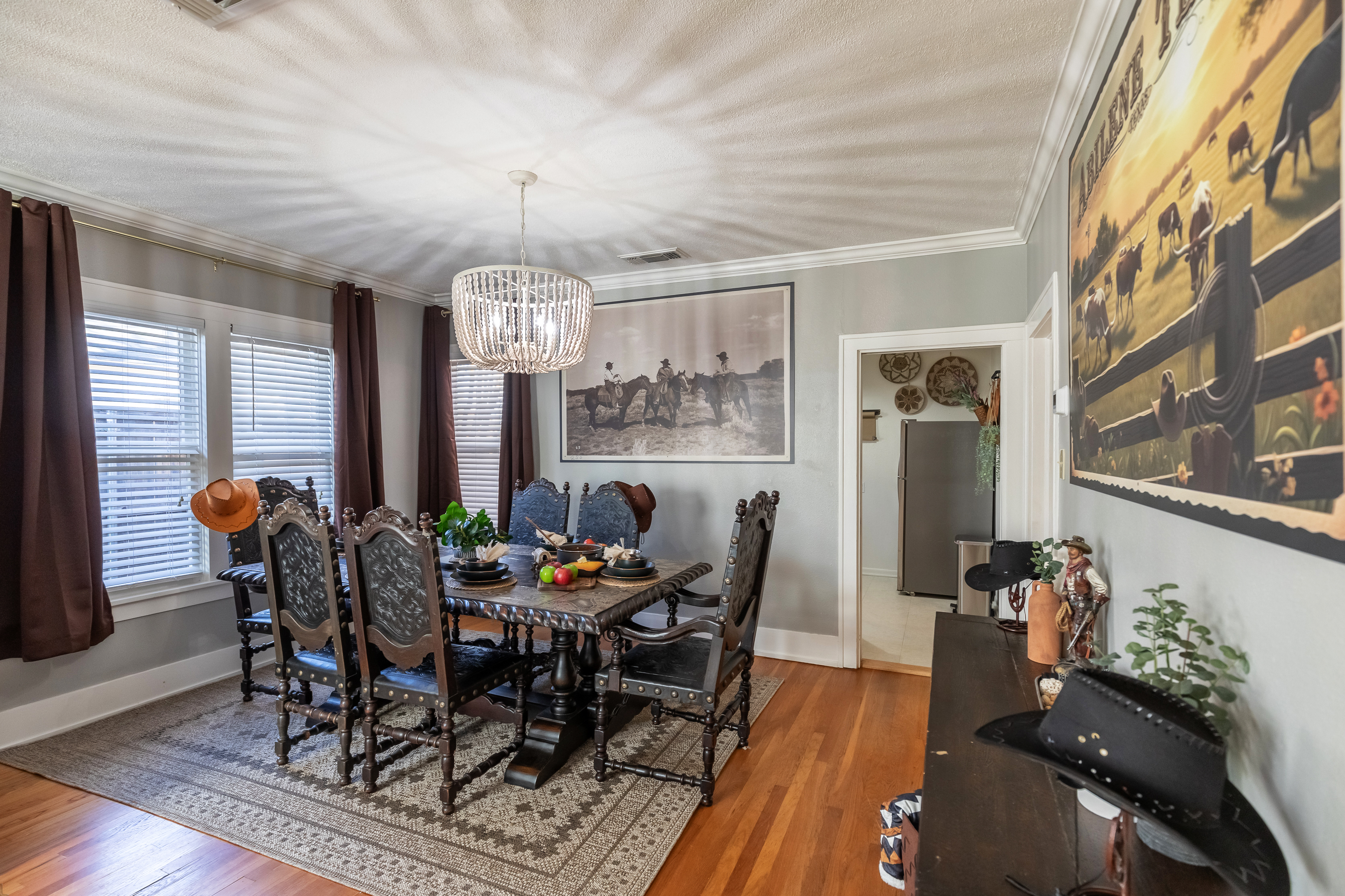 The dining room earns its place at the head of the table. An ornate dark wood table surrounded by hand-carved leather chairs sits beneath a beaded chandelier, flanked by large-scale black-and-white cowboy photography and a sweeping Abilene Texas mural. Pull up a chair. This is where the good meals happen and the long nights begin.