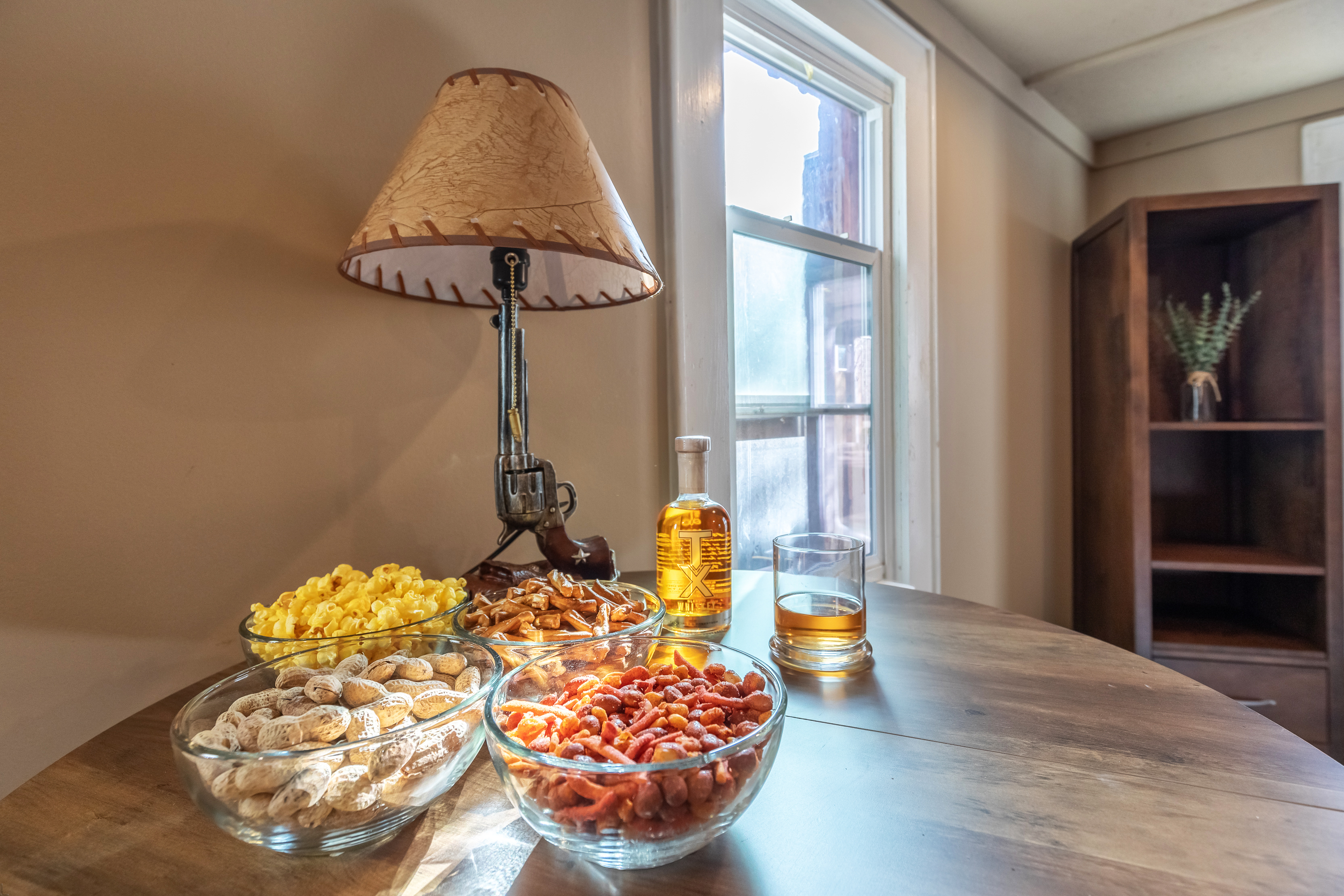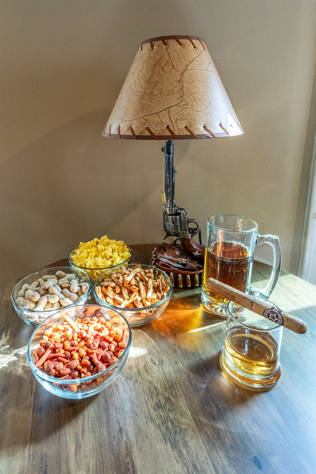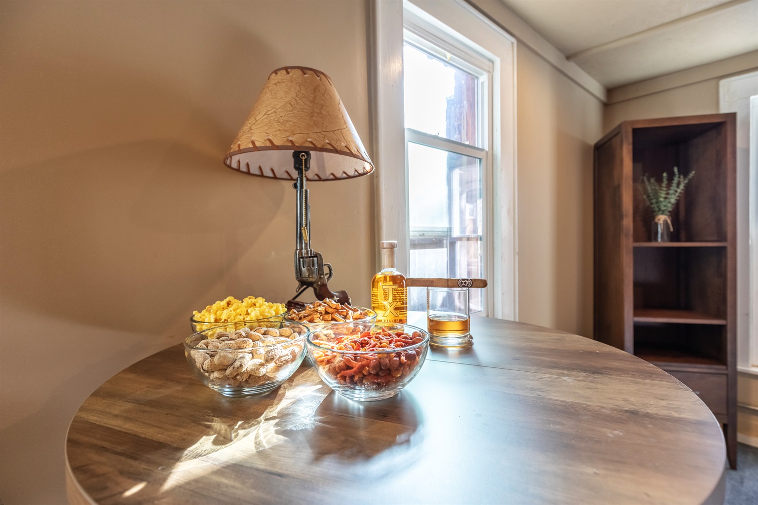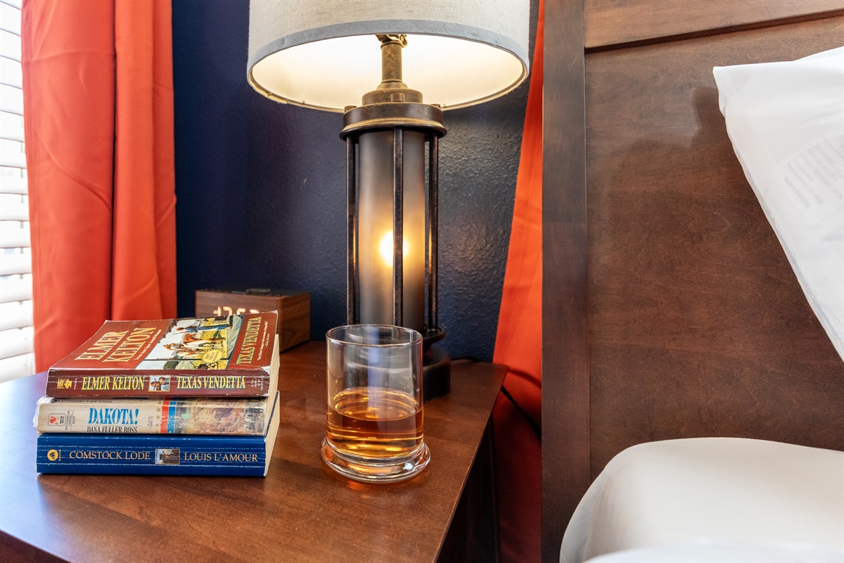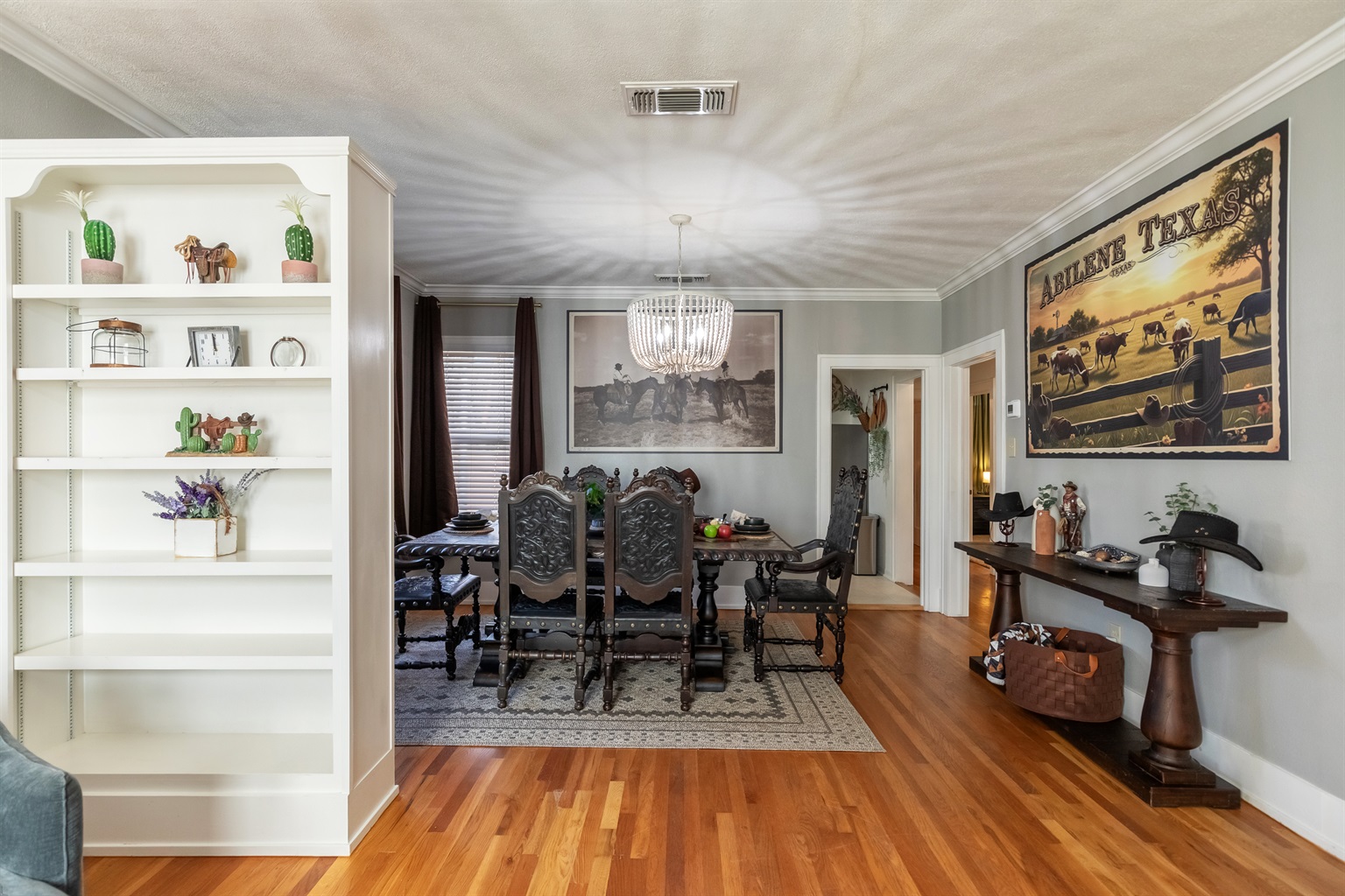 The dining room earns its place at the head of the table. An ornate dark wood table surrounded by hand-carved leather chairs sits beneath a beaded chandelier, flanked by large-scale black-and-white cowboy photography and a sweeping Abilene Texas mural. Pull up a chair. This is where the good meals happen and the long nights begin.