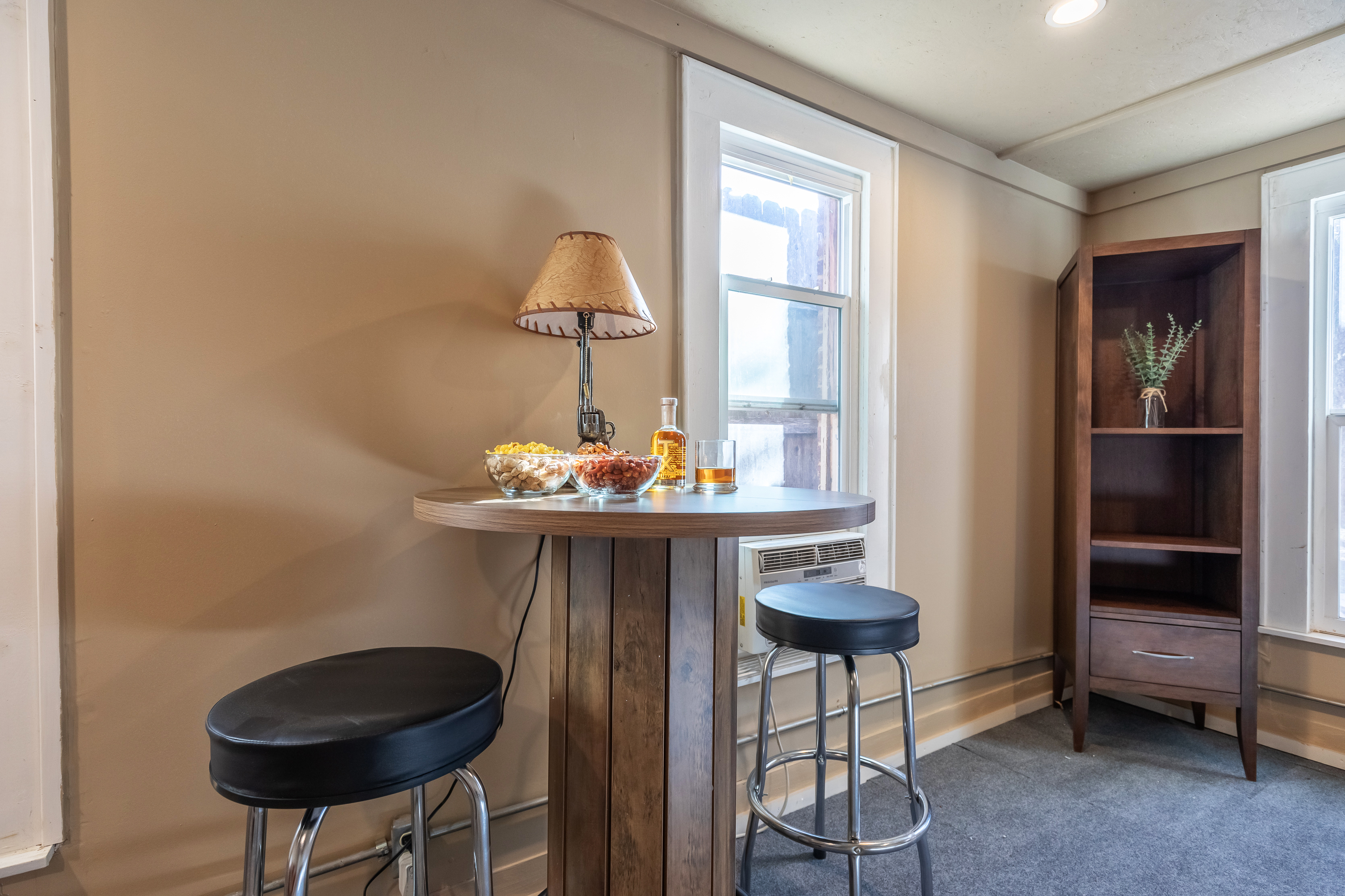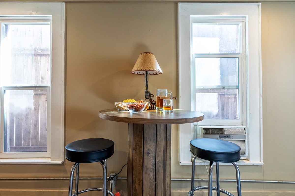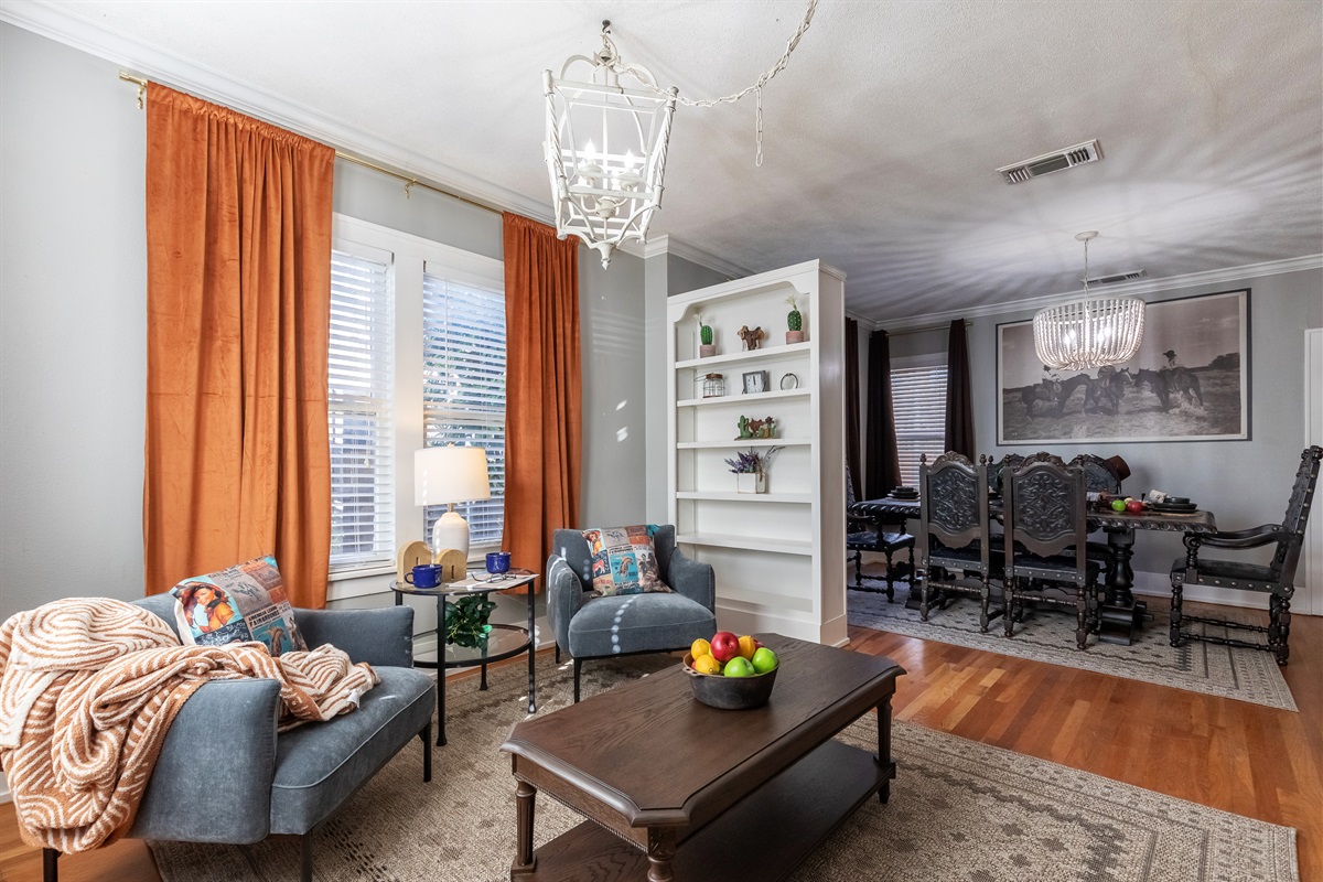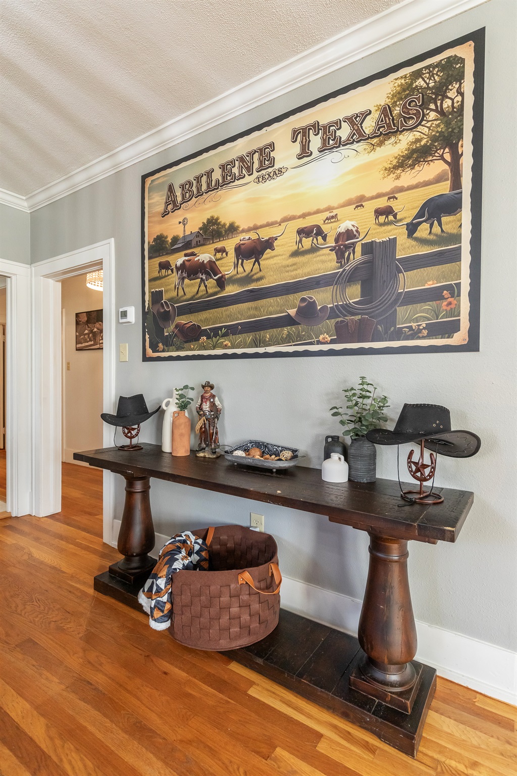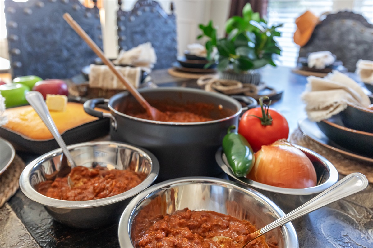 The dining room earns its place at the head of the table. An ornate dark wood table surrounded by hand-carved leather chairs sits beneath a beaded chandelier, flanked by large-scale black-and-white cowboy photography and a sweeping Abilene Texas mural. Pull up a chair. This is where the good meals happen and the long nights begin.