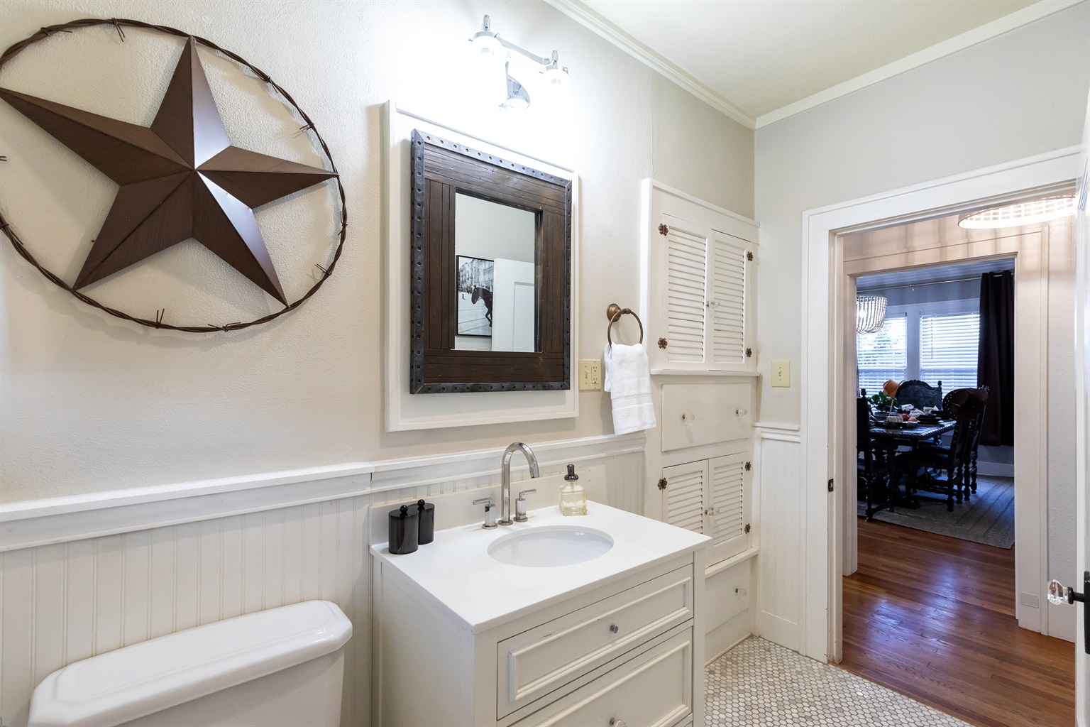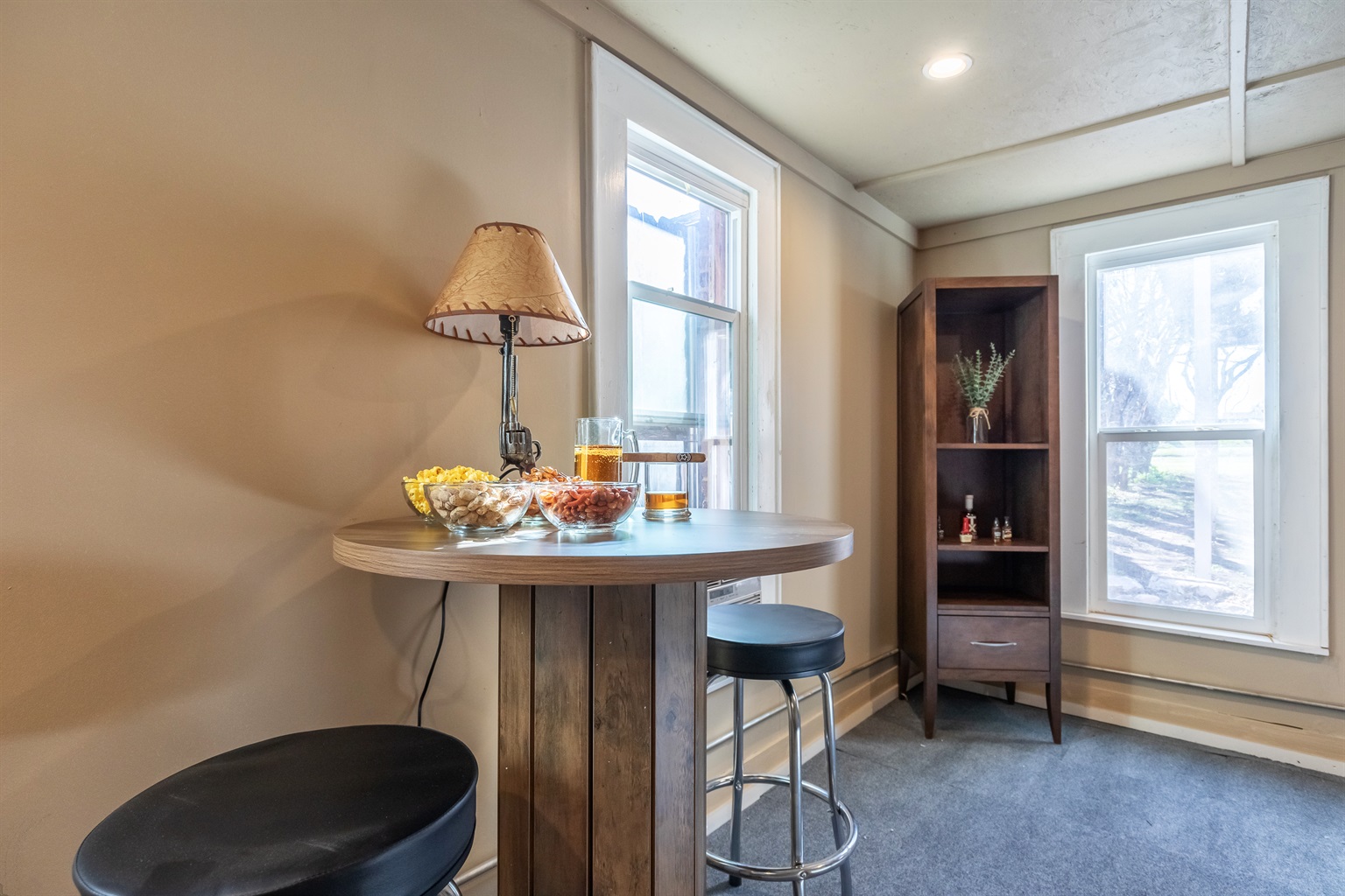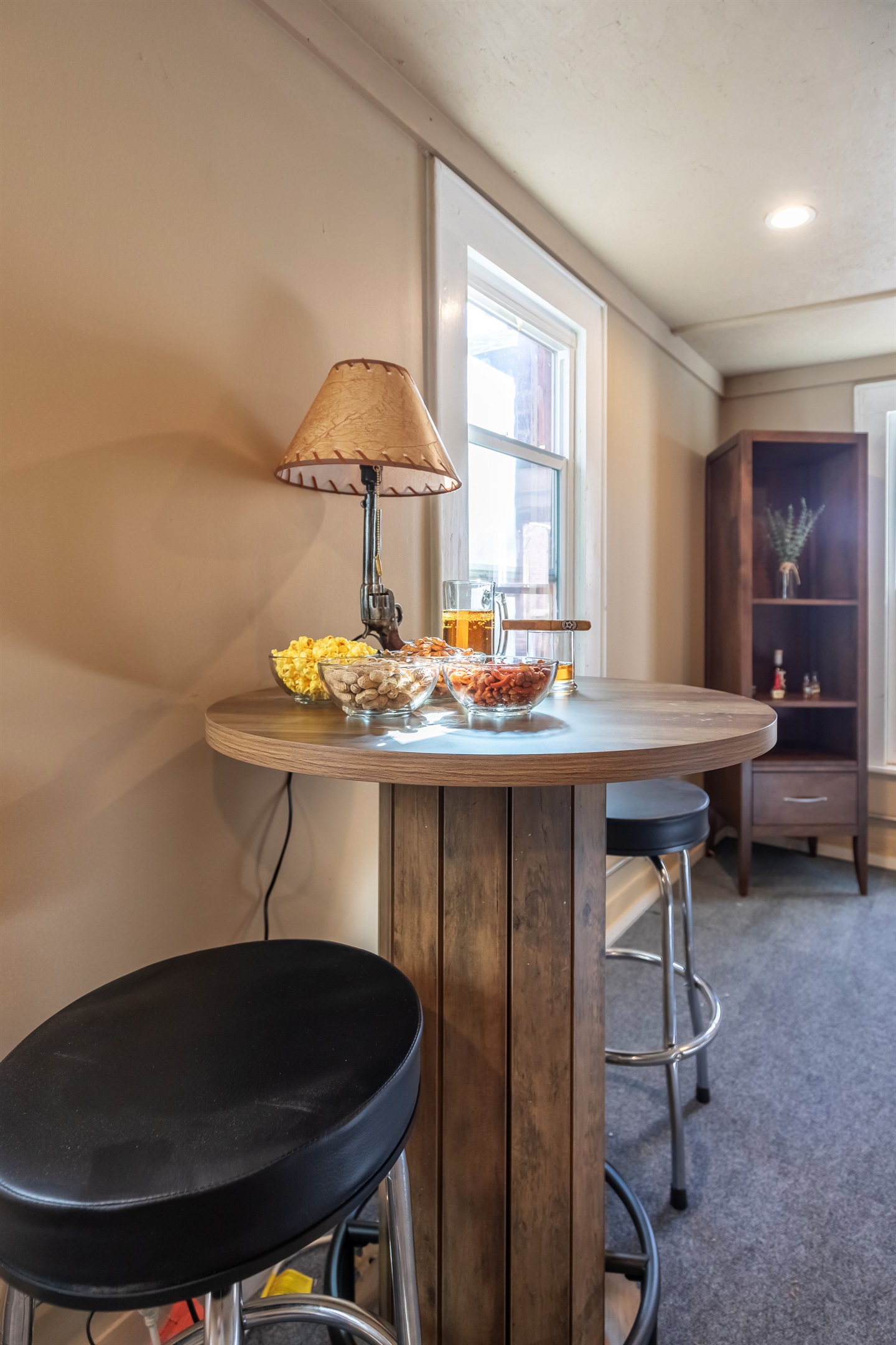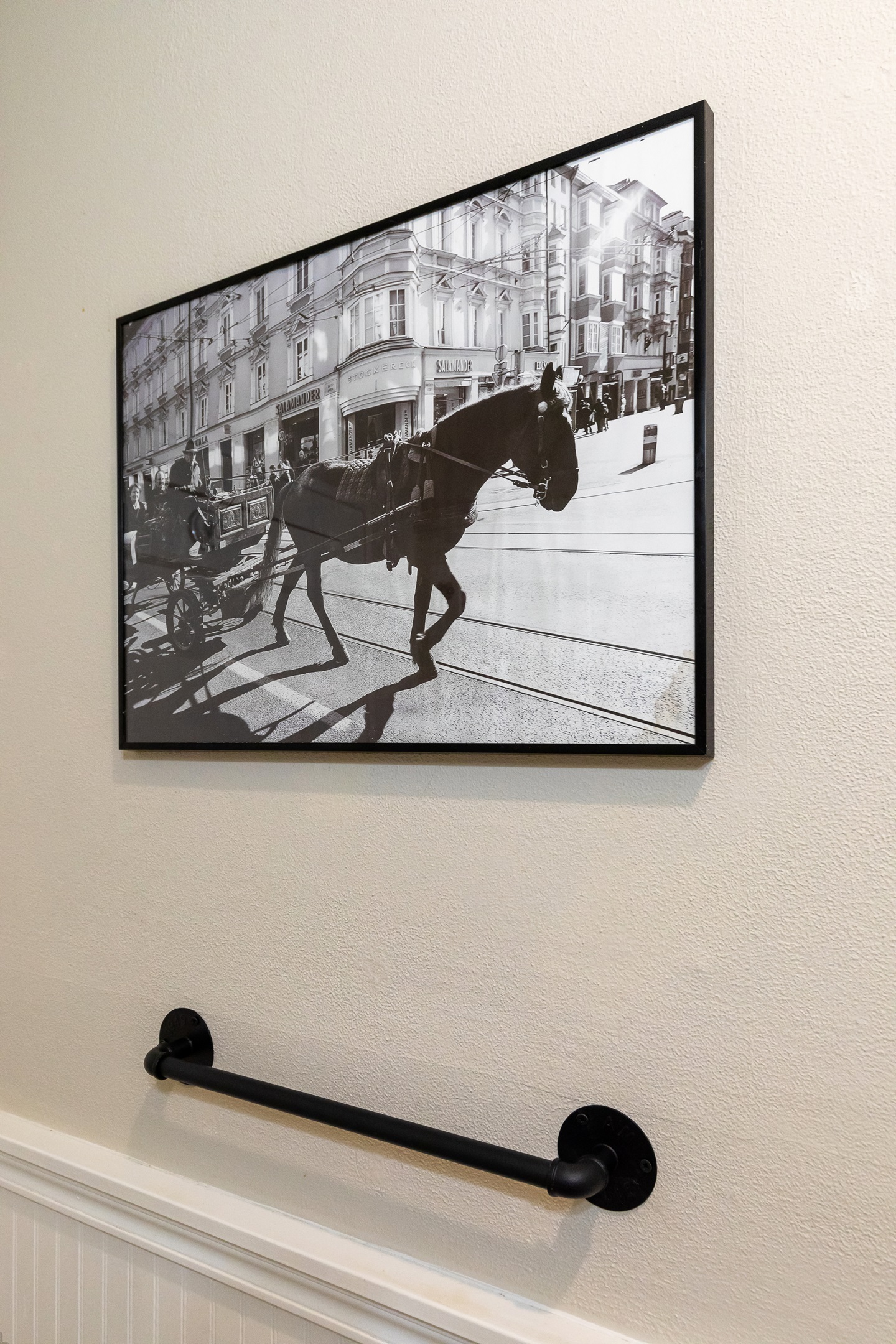 The dining room earns its place at the head of the table. An ornate dark wood table surrounded by hand-carved leather chairs sits beneath a beaded chandelier, flanked by large-scale black-and-white cowboy photography and a sweeping Abilene Texas mural. Pull up a chair. This is where the good meals happen and the long nights begin.