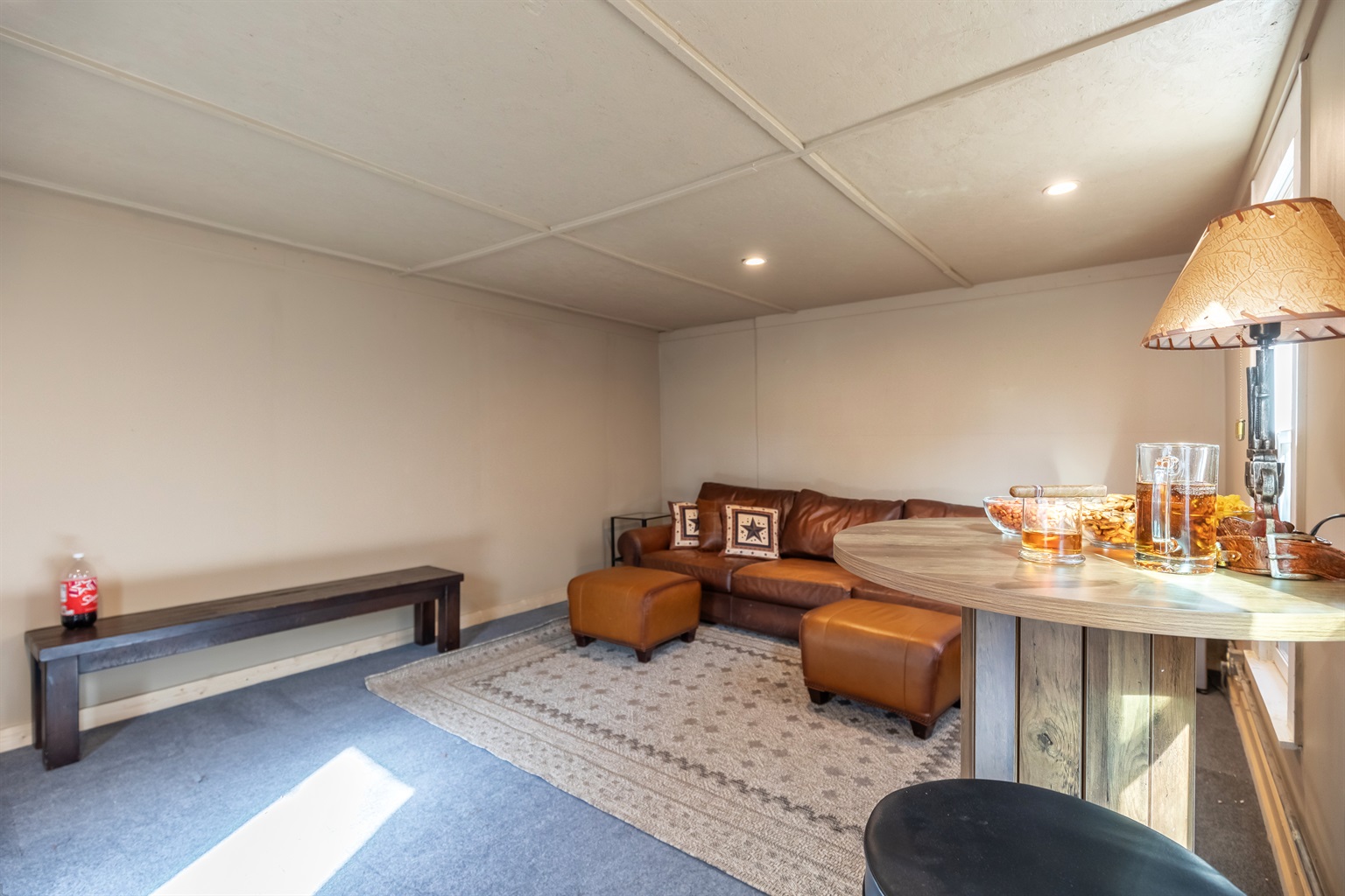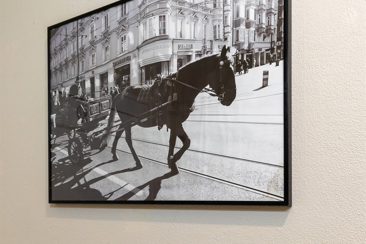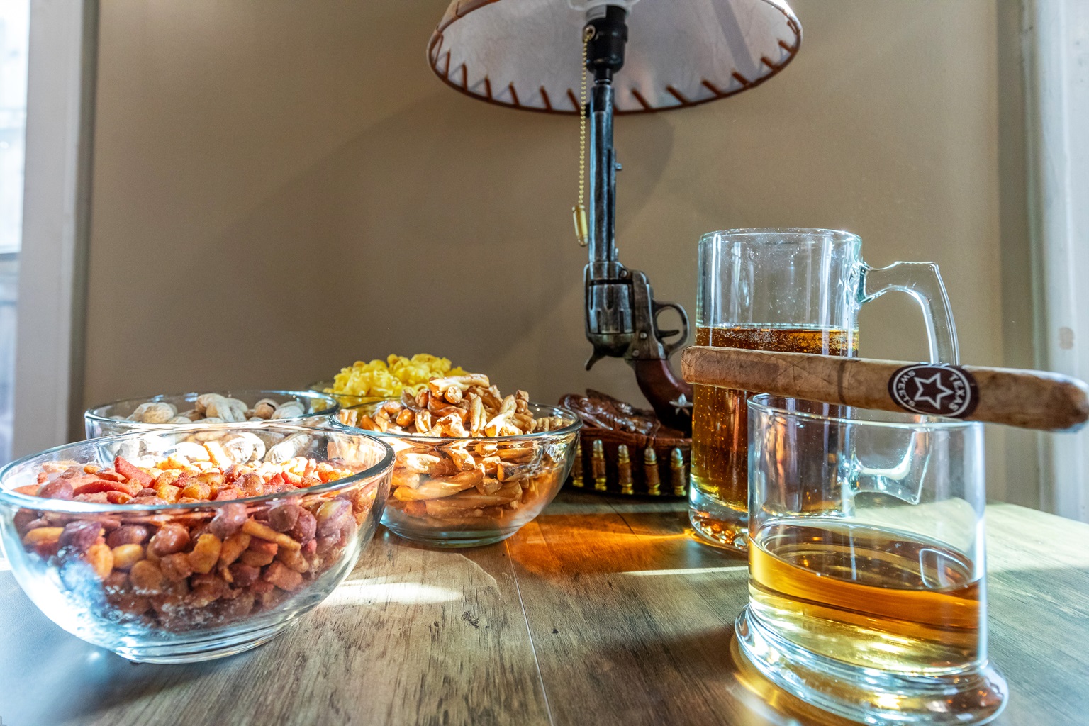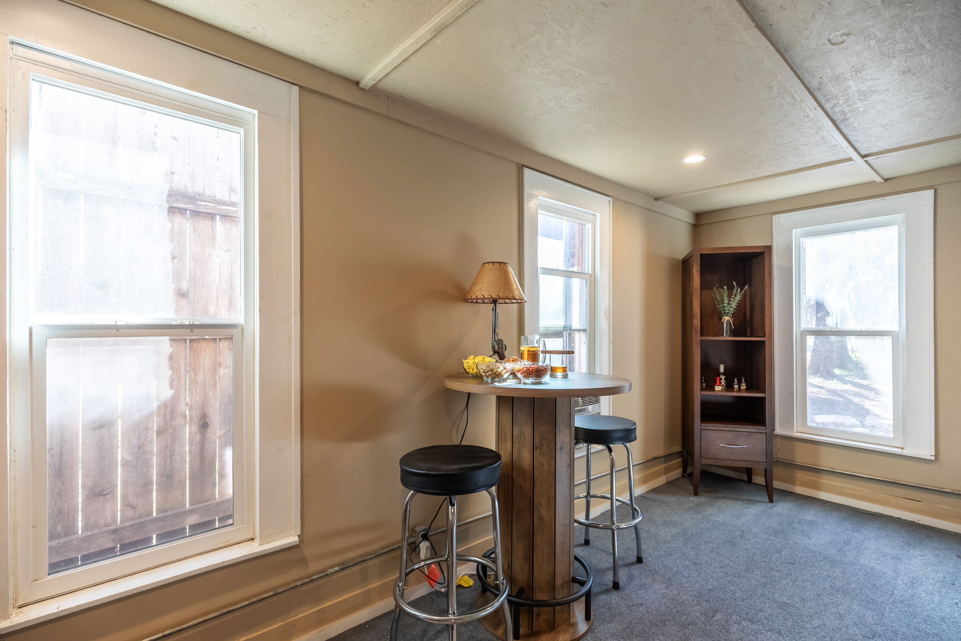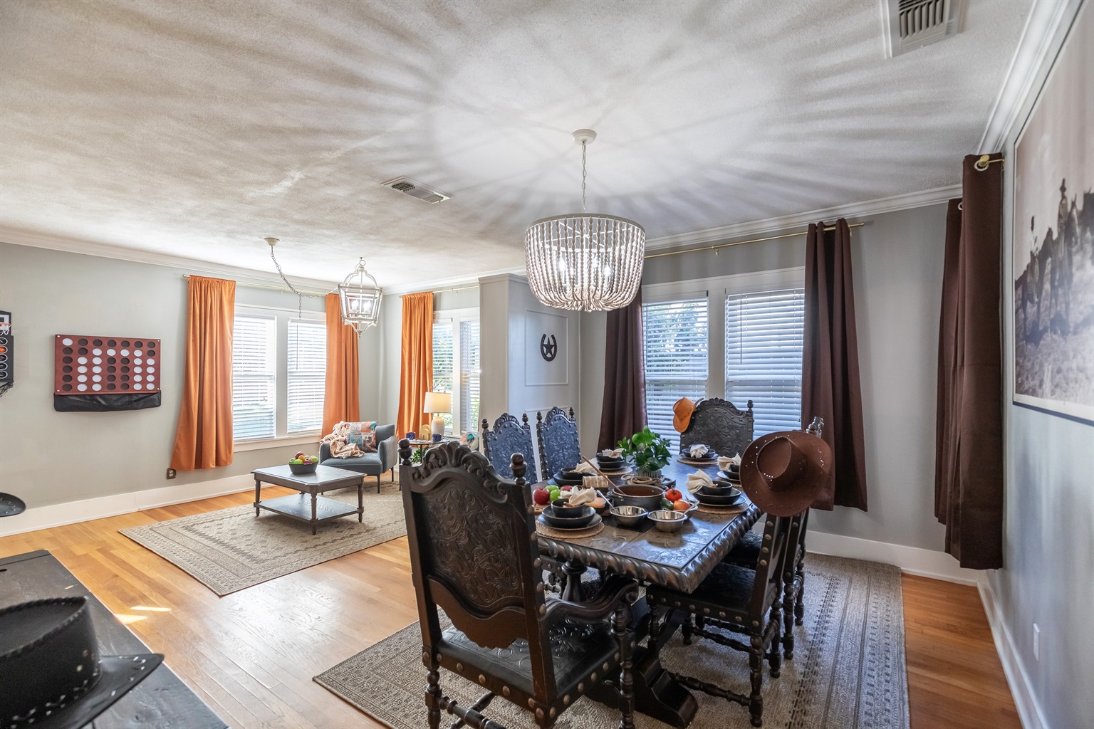 The dining room earns its place at the head of the table. An ornate dark wood table surrounded by hand-carved leather chairs sits beneath a beaded chandelier, flanked by large-scale black-and-white cowboy photography and a sweeping Abilene Texas mural. Pull up a chair. This is where the good meals happen and the long nights begin.