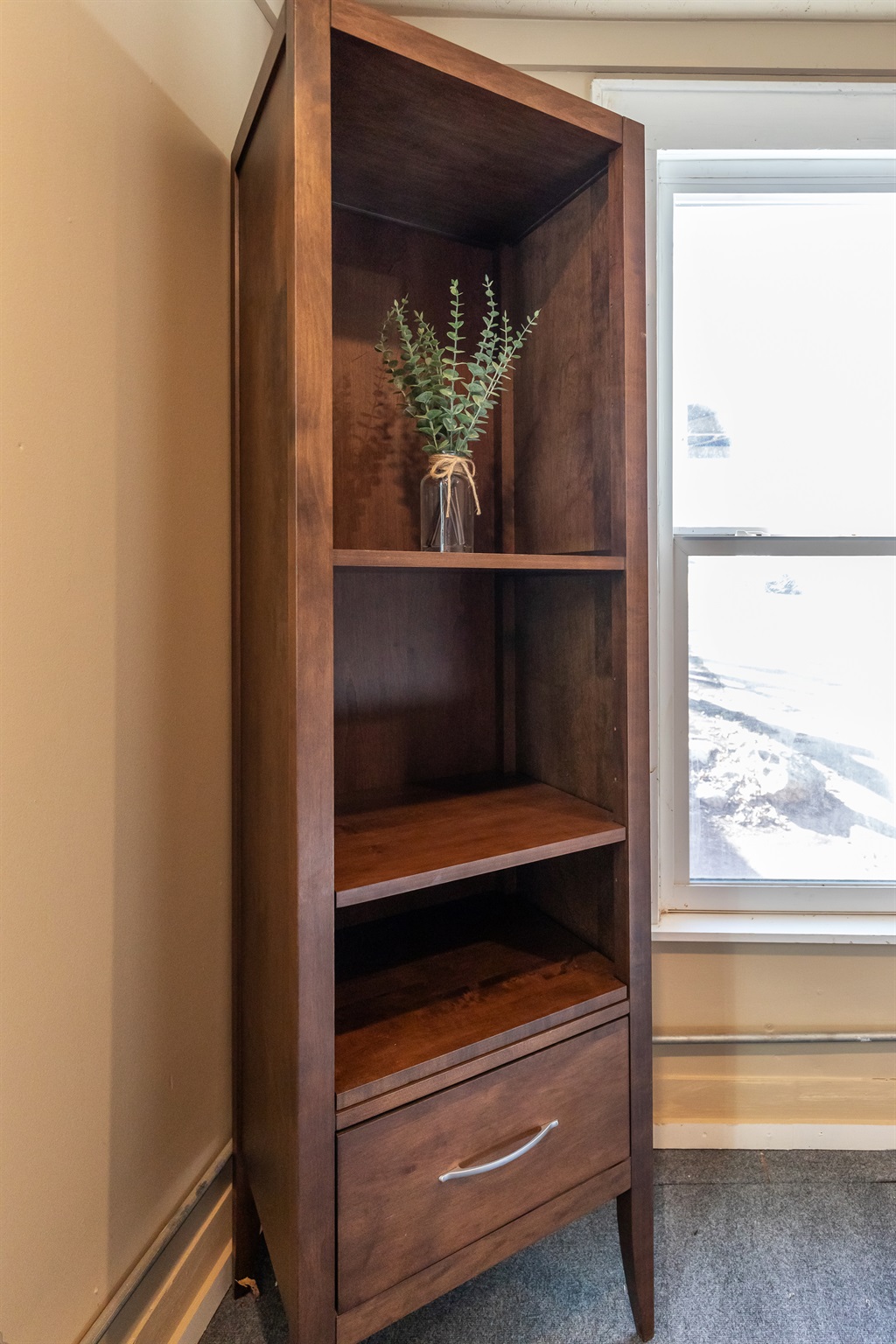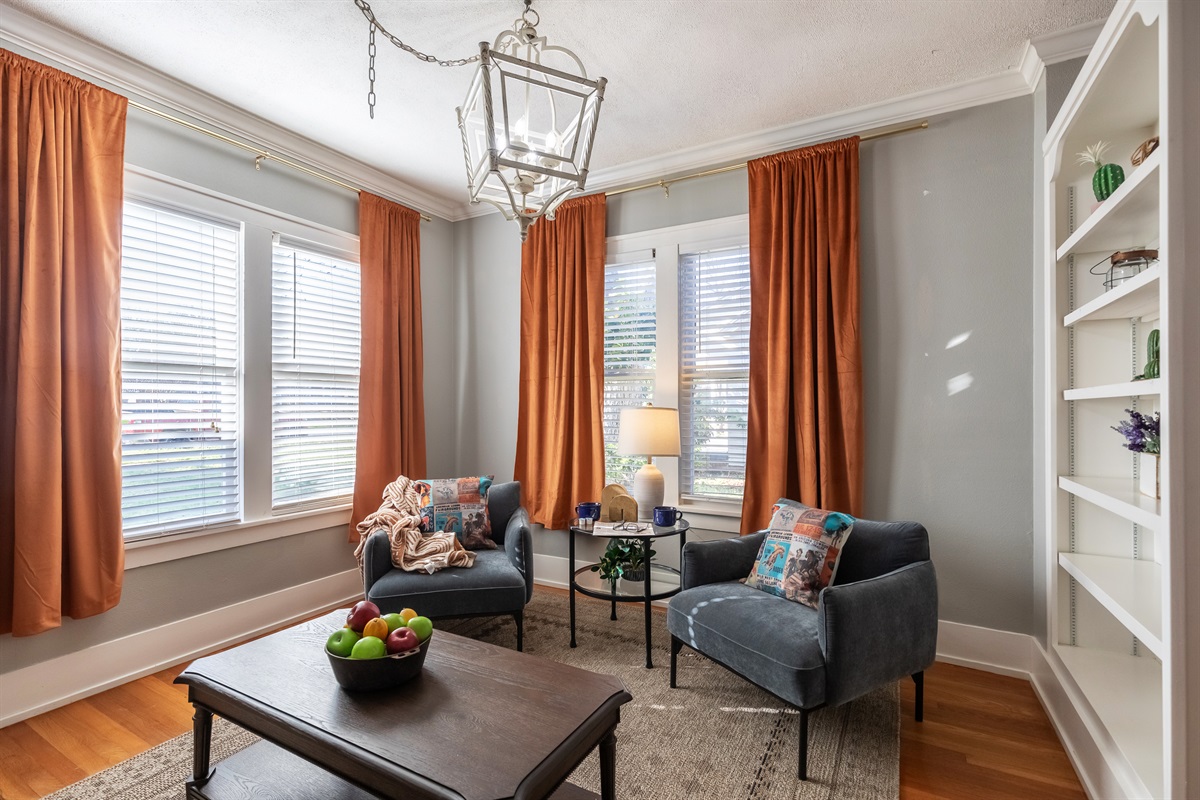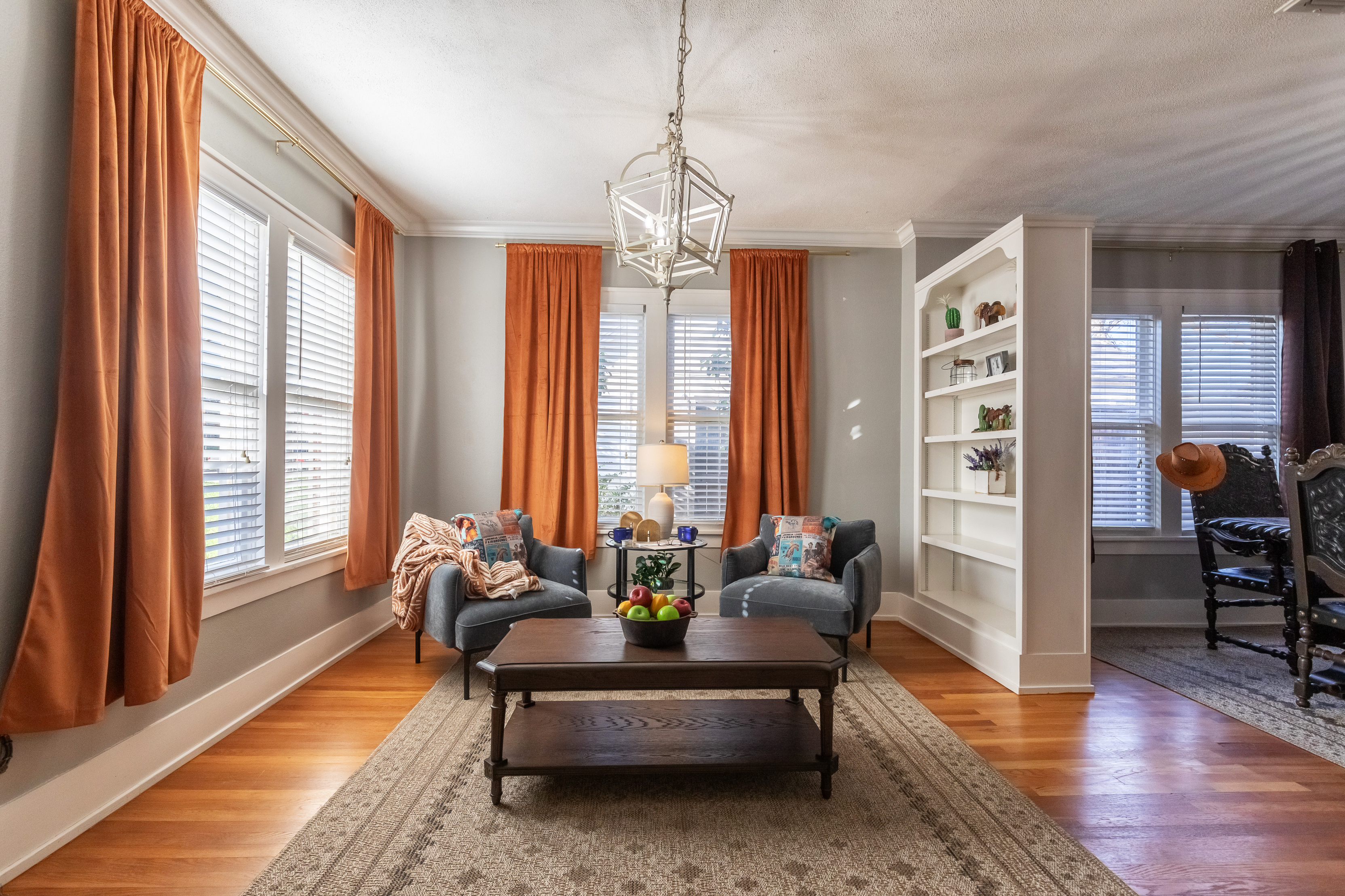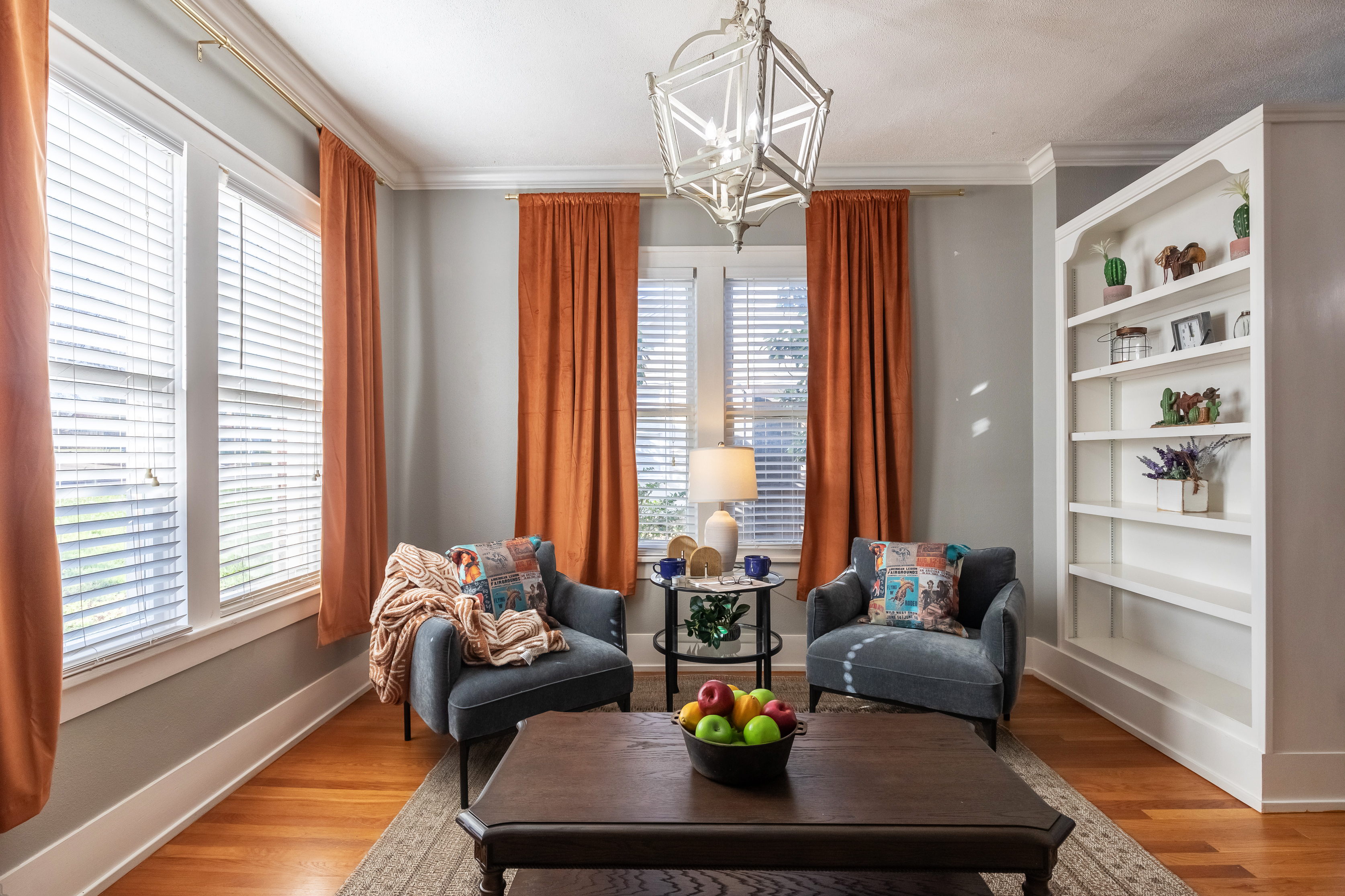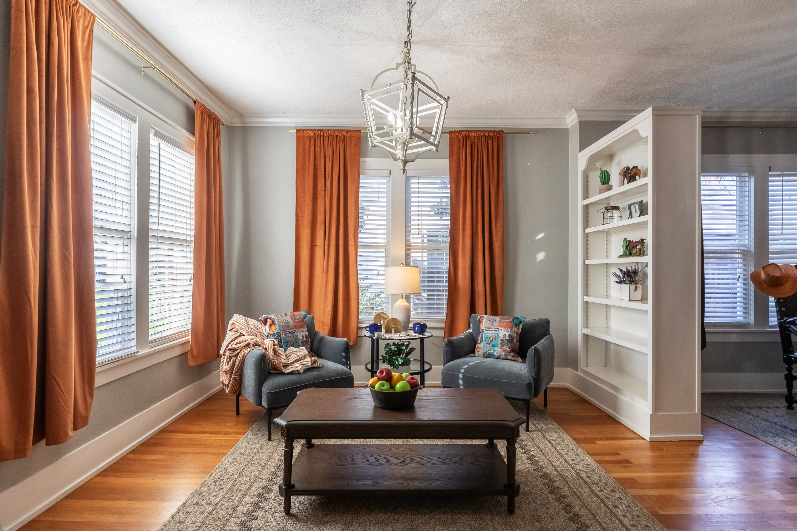 The sitting room is where the tale softens. Flooded with natural light through plantation-shuttered windows, burnt orange drapes pool to the floor while two velvet chairs face each other across a solid wood coffee table. Built-in shelves hold cacti and Western curiosities. Morning coffee was made for this room.