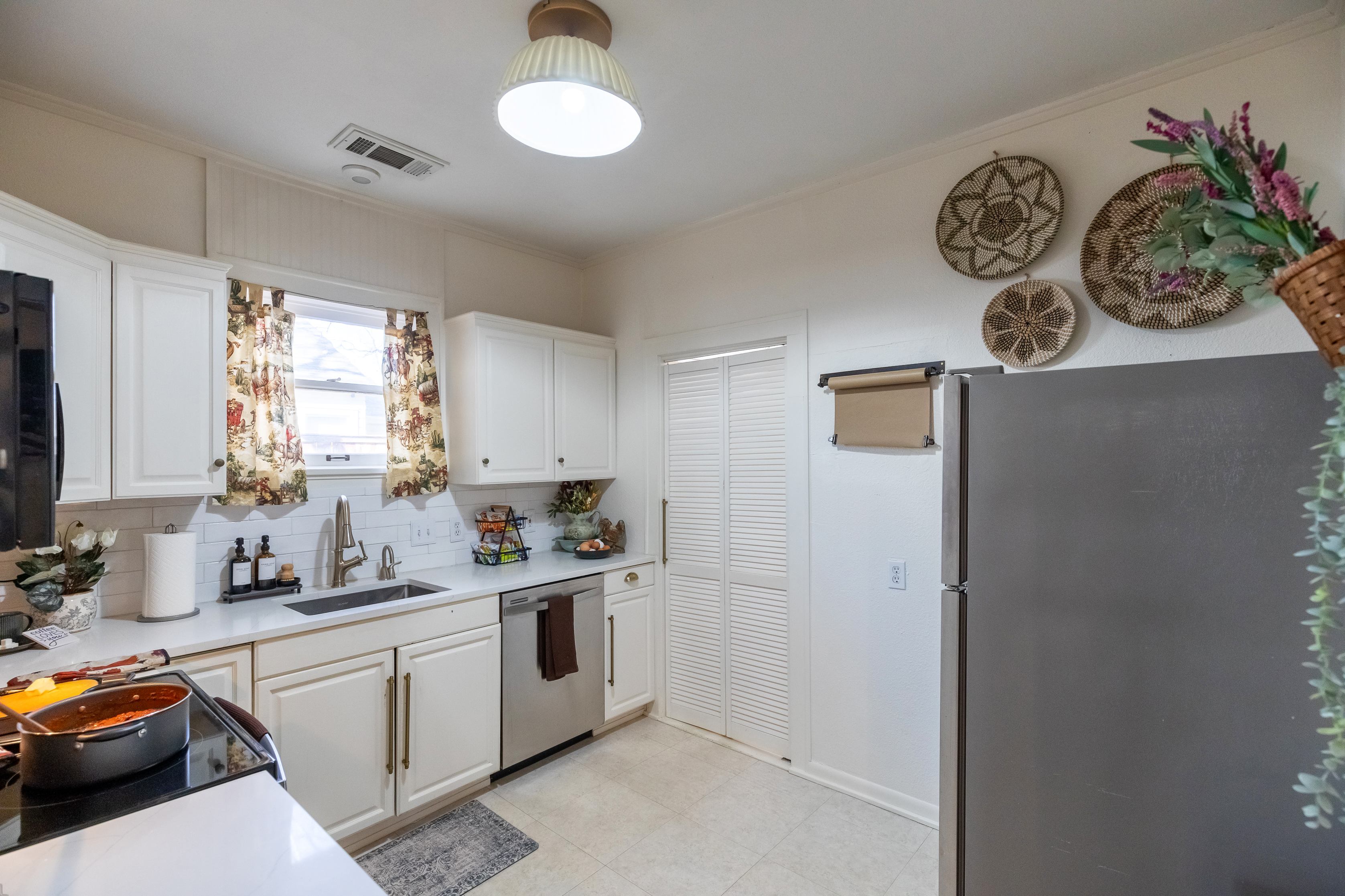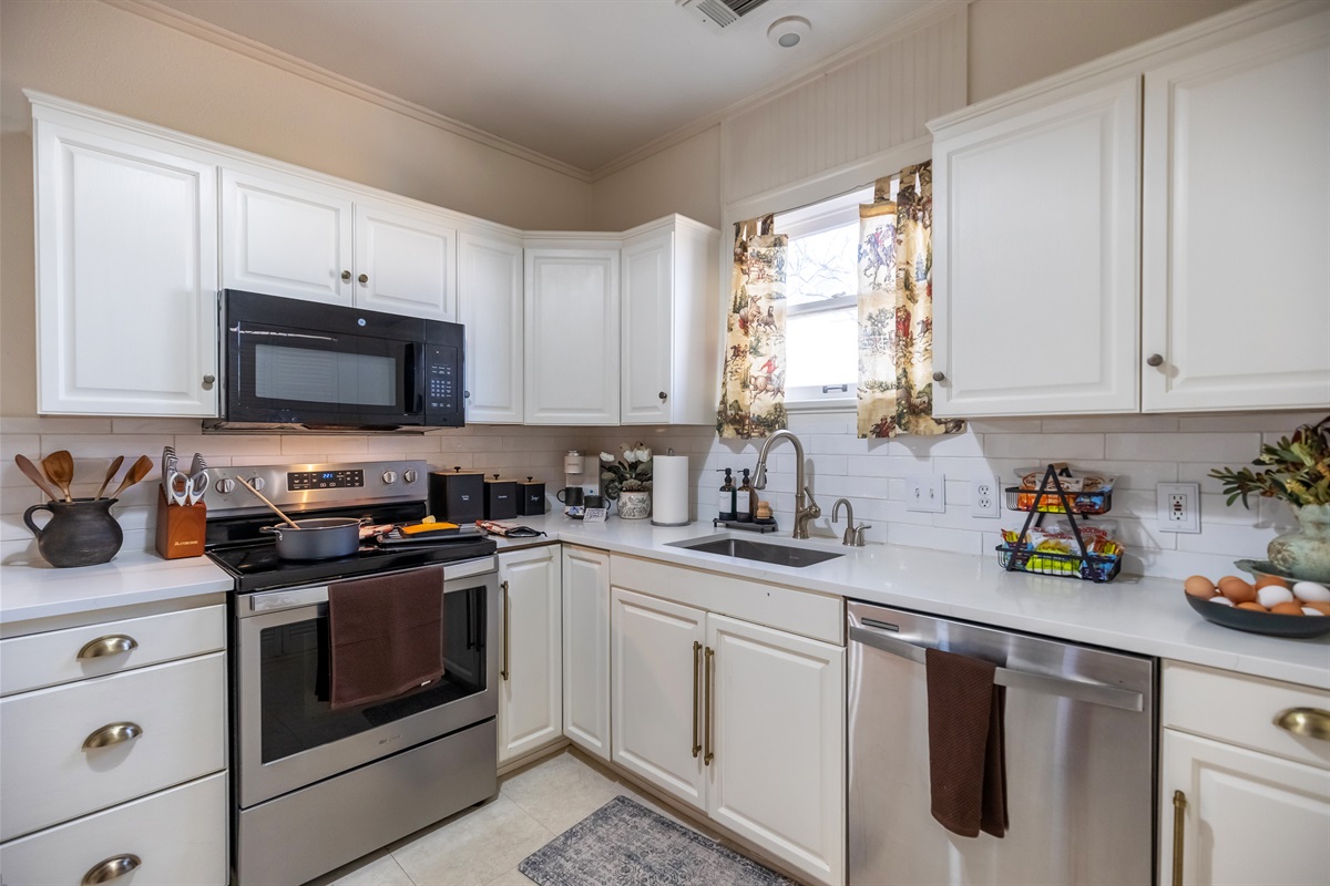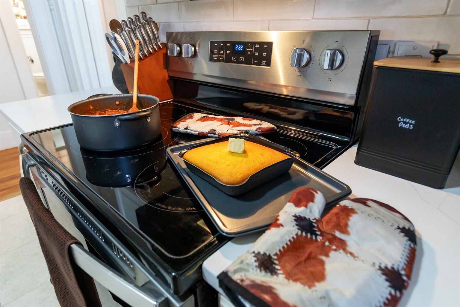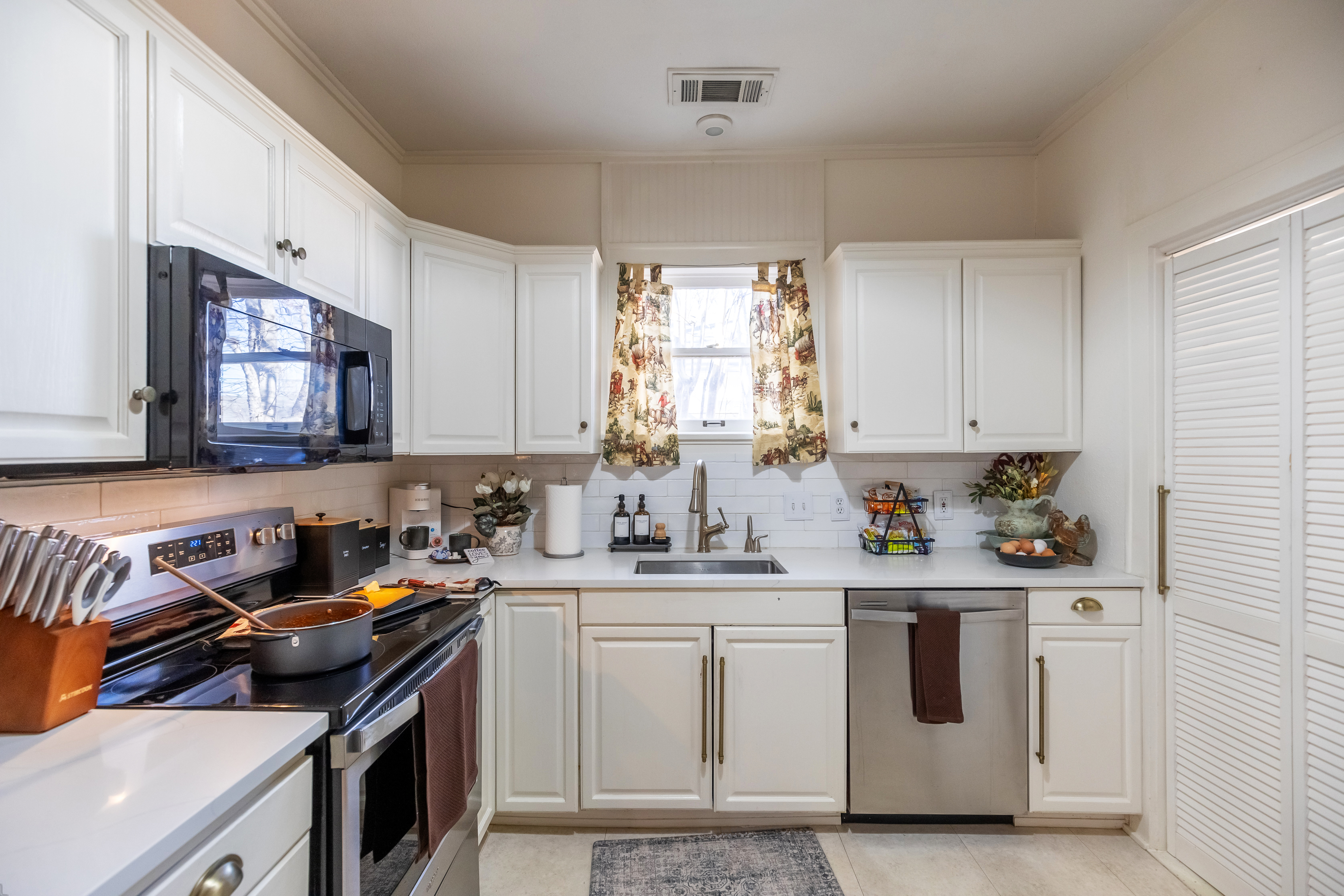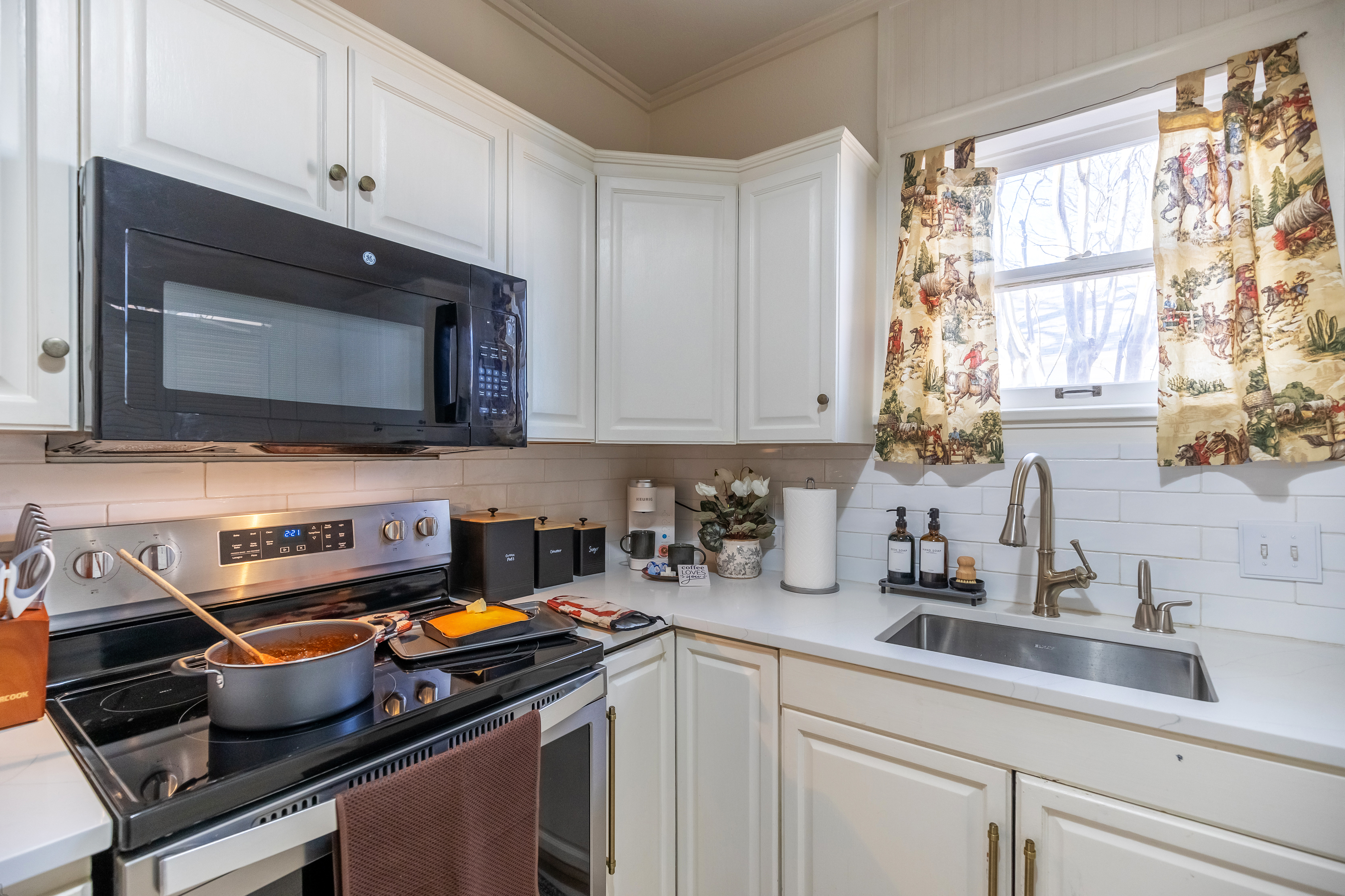The kitchen is fully loaded — white cabinetry, subway tile backsplash, stainless appliances, and counter space to cook for the whole crew. Western-print café curtains keep it honest.