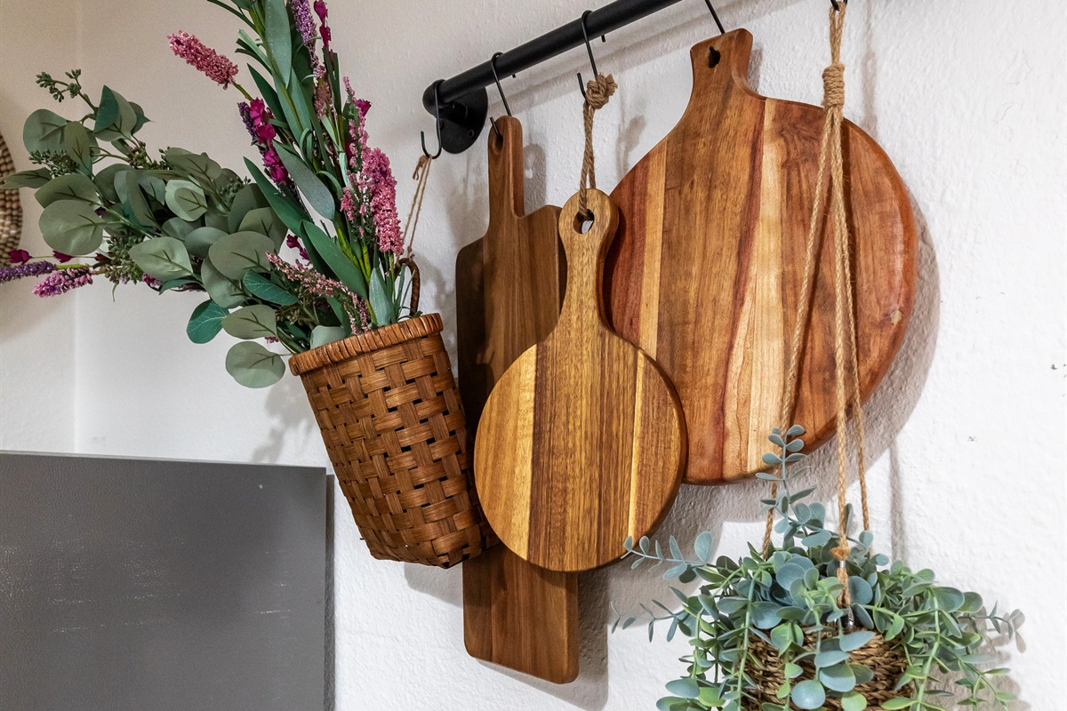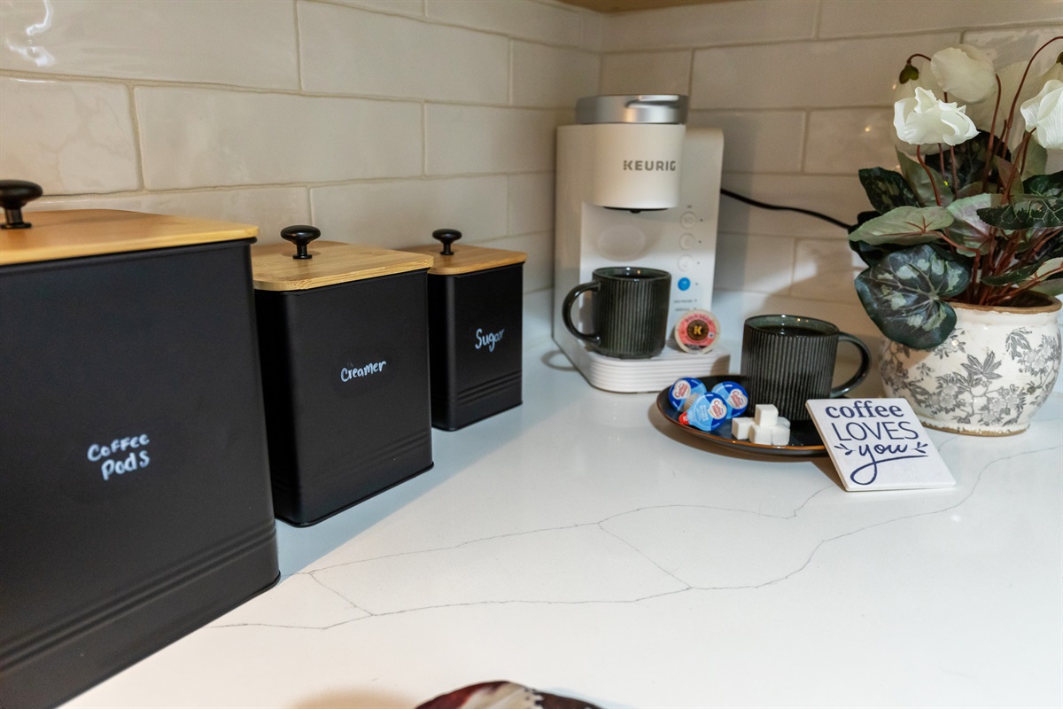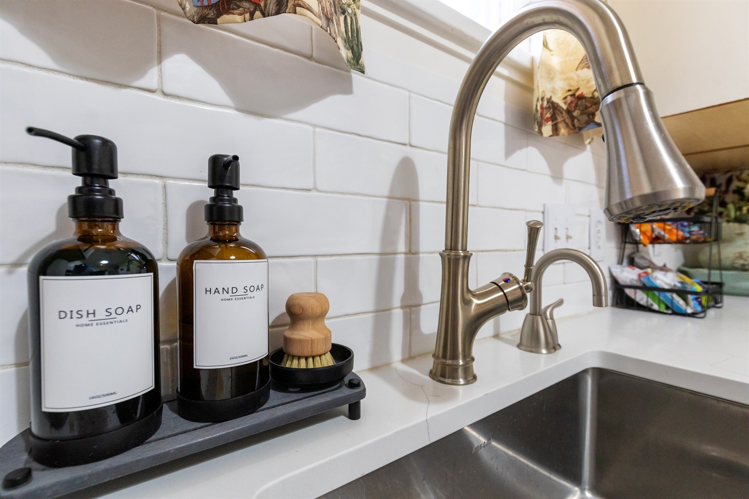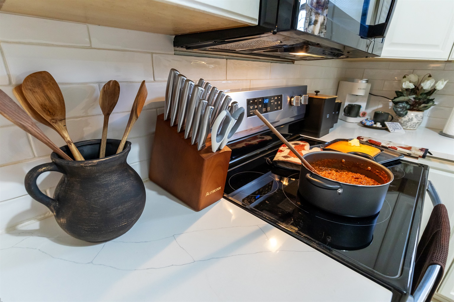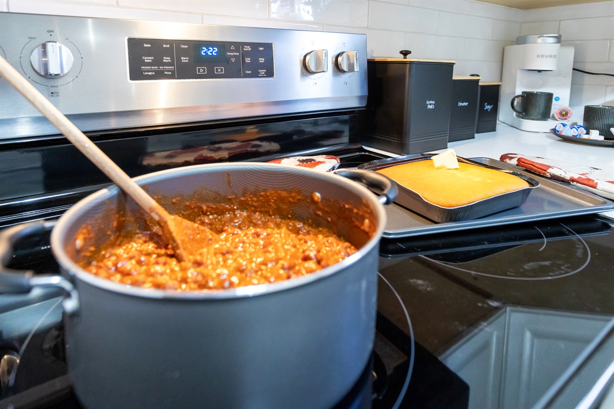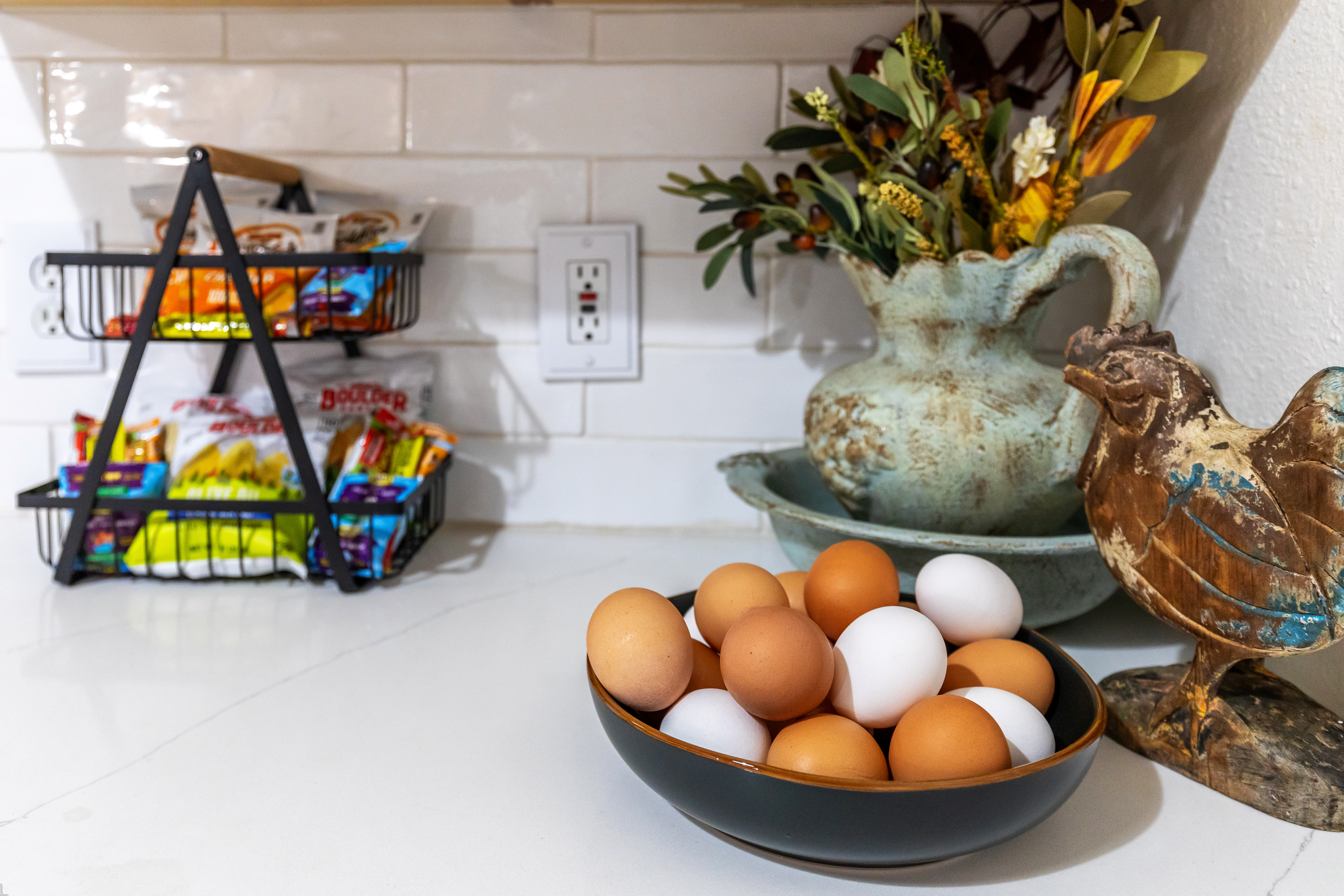 The kitchen is fully loaded — white cabinetry, subway tile backsplash, stainless appliances, and counter space to cook for the whole crew. Western-print café curtains keep it honest.