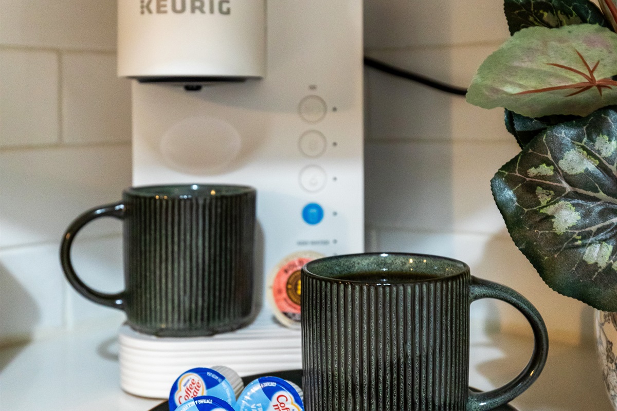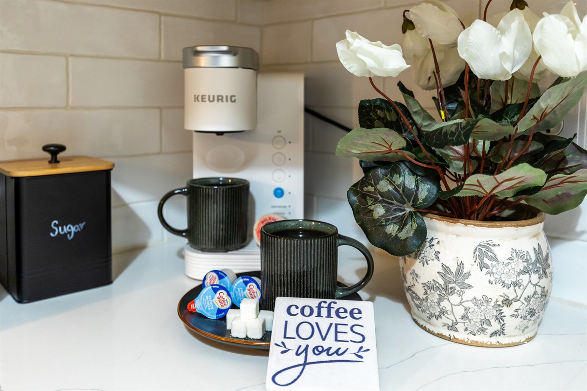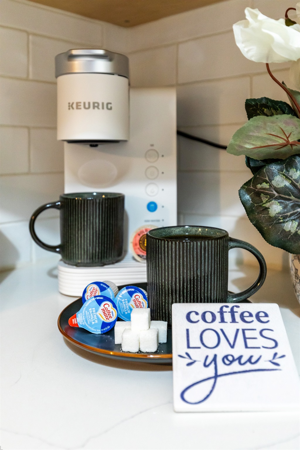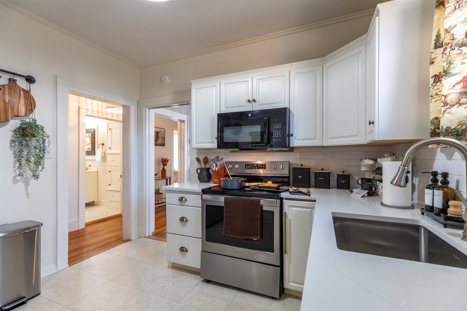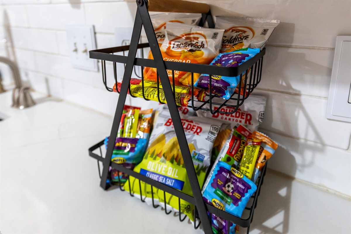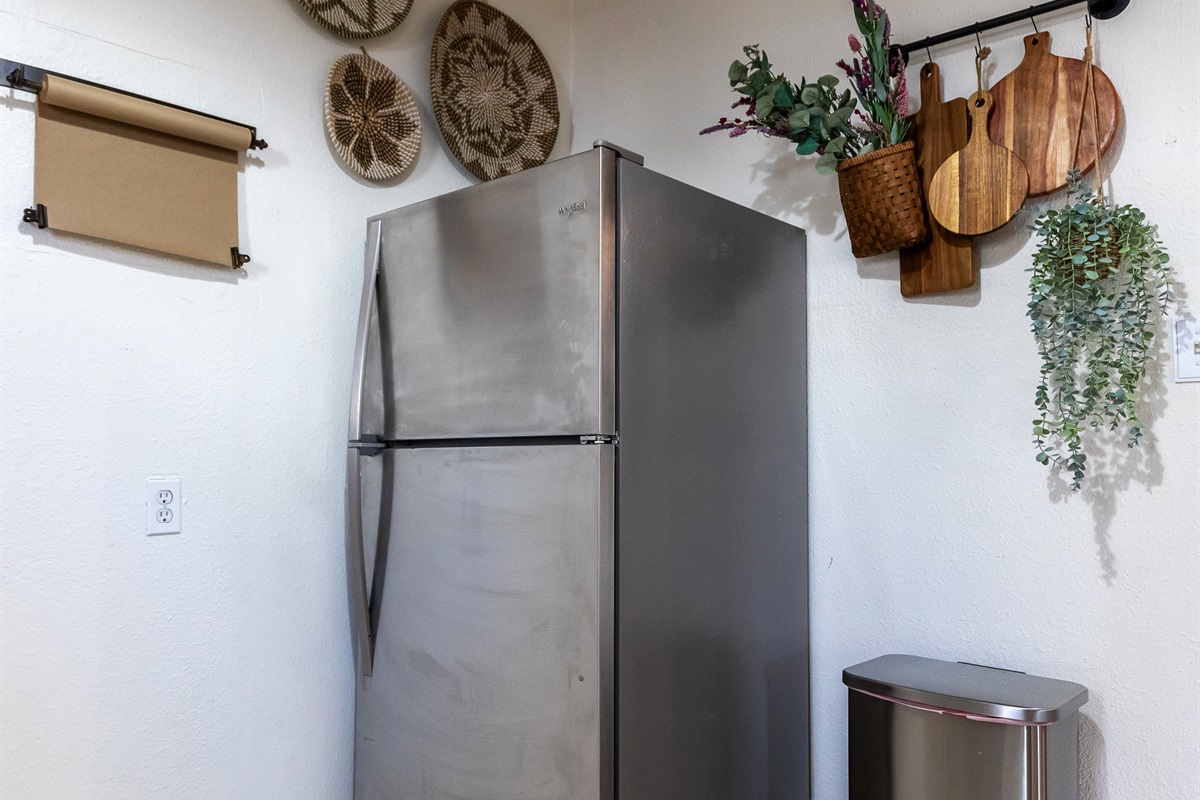 The kitchen is fully loaded — white cabinetry, subway tile backsplash, stainless appliances, and counter space to cook for the whole crew. Western-print café curtains keep it honest.