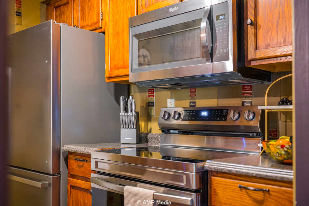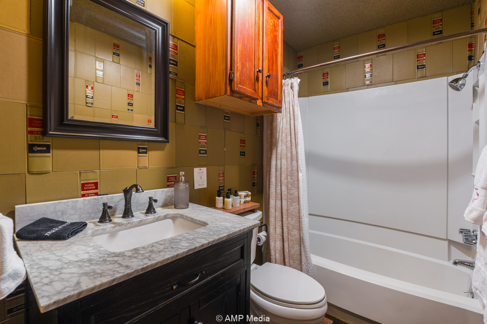 On the lower level, another bedroom awaits with a stunning iron Queen size bed, complemented by a hall bathroom that serves both the bedroom and the gracefully appointed living areas. A fully equipped kitchen stands ready for culinary endeavors, while the living/dining spaces beckon for gatherings and moments of leisure.