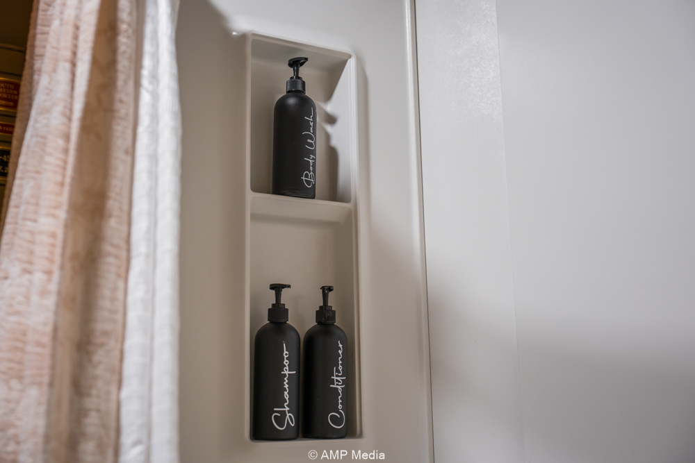 The master bedroom upstairs is a sanctuary of luxury, featuring an upholstered leather King size bed and a private en suite bathroom.
