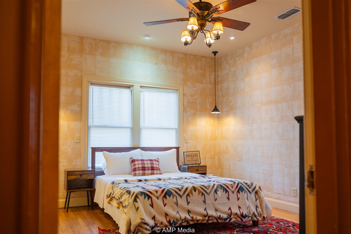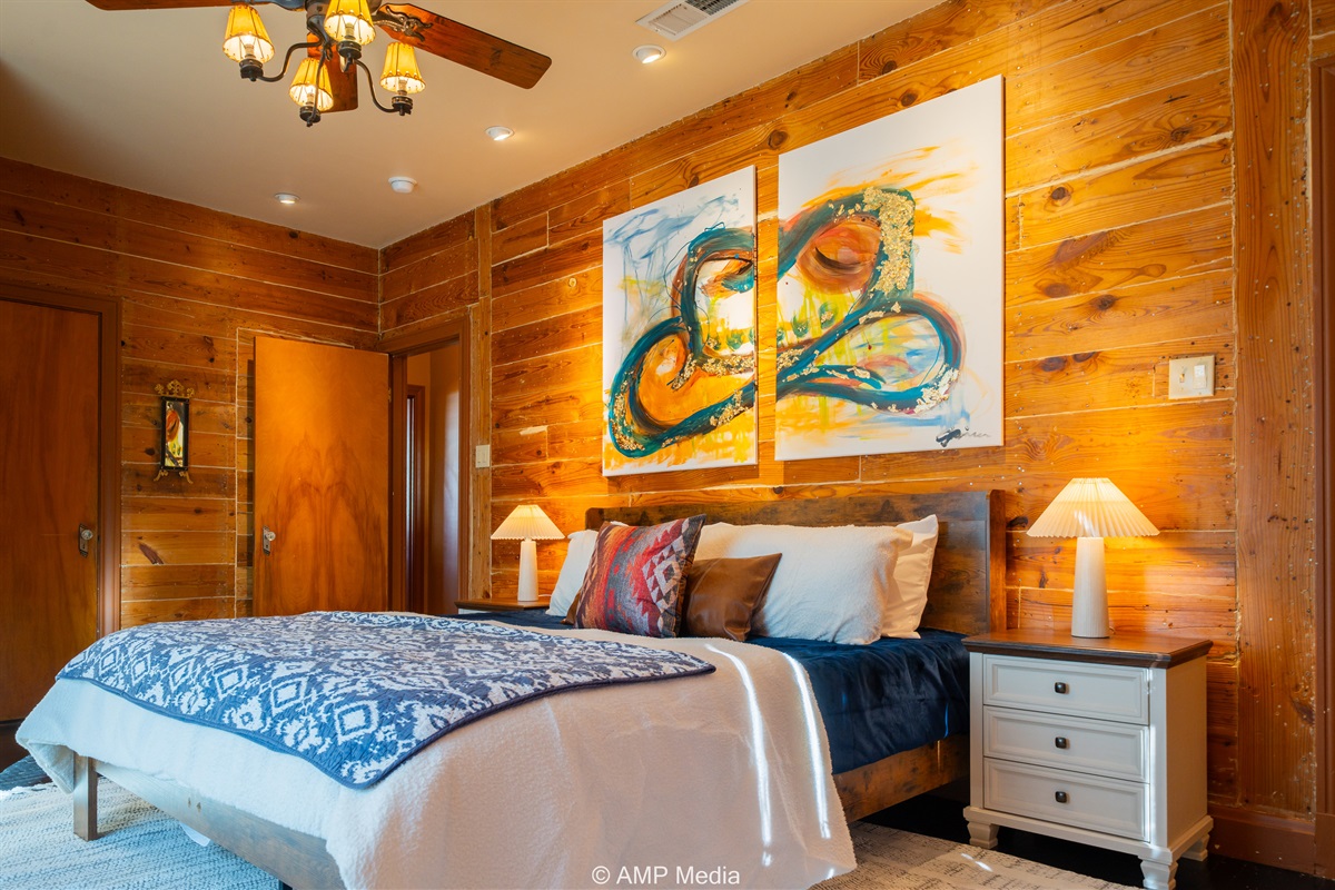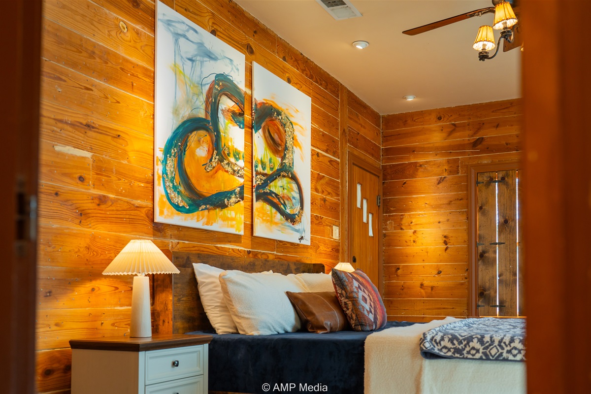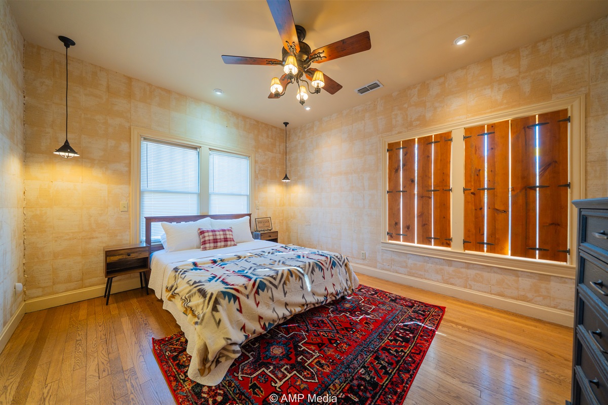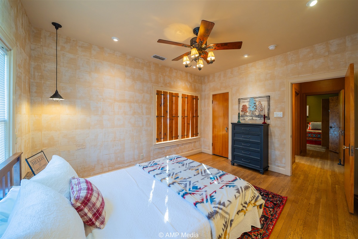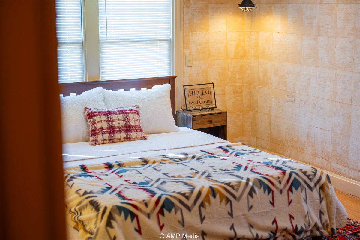 Step into a space where history meets comfort, with a king, queen and 2 single beds adorned the 3 bedrooms. The décor in the first bedroom is a tribute to our Native American heritage, with antique Navajo rugs, artwork, and captivating imagery. Hardwood floors, original wooden shiplap walls, and rustic, antique accessories create a warm log cabin ambiance, inviting you to unwind and make lasting memories.
