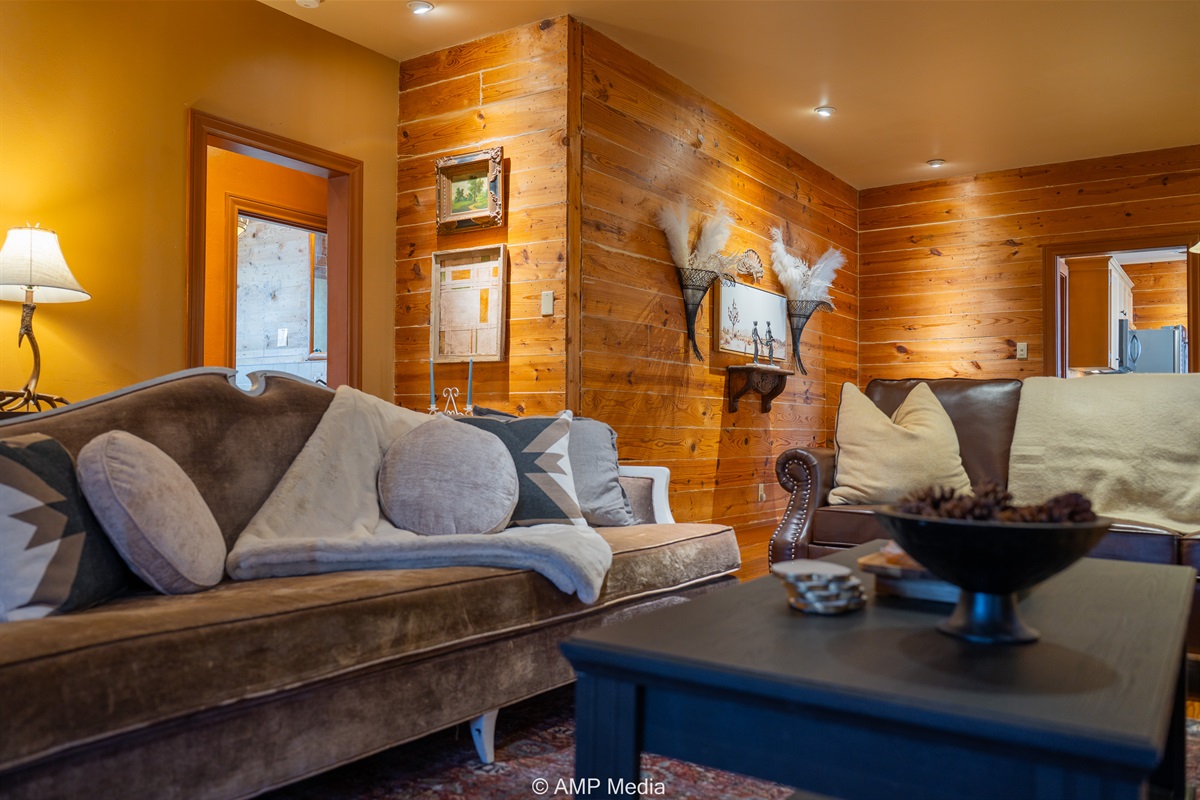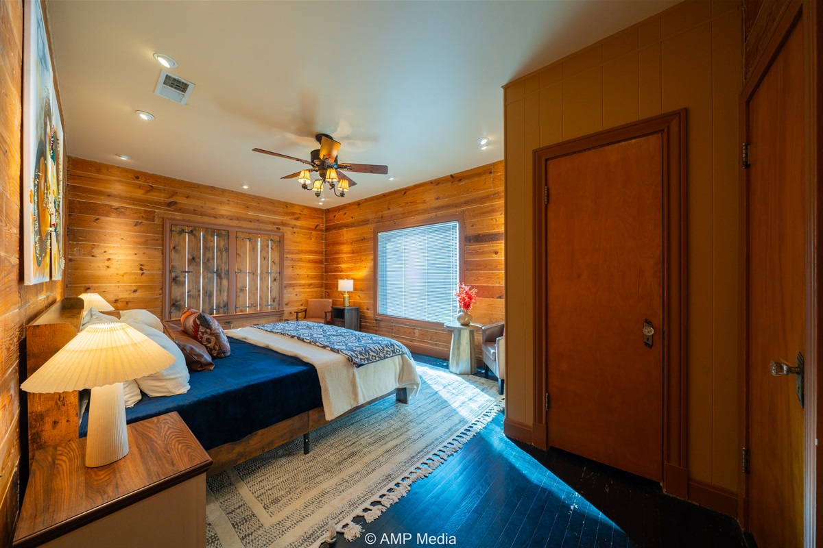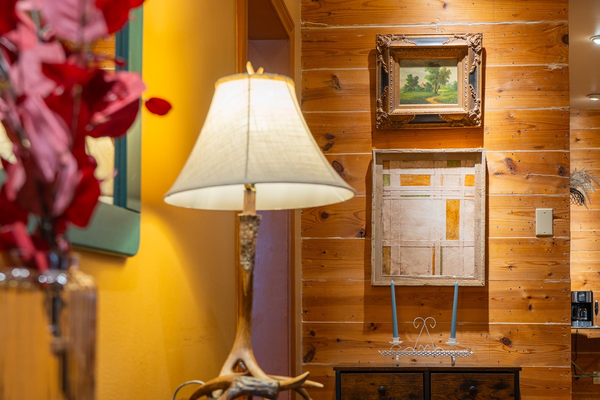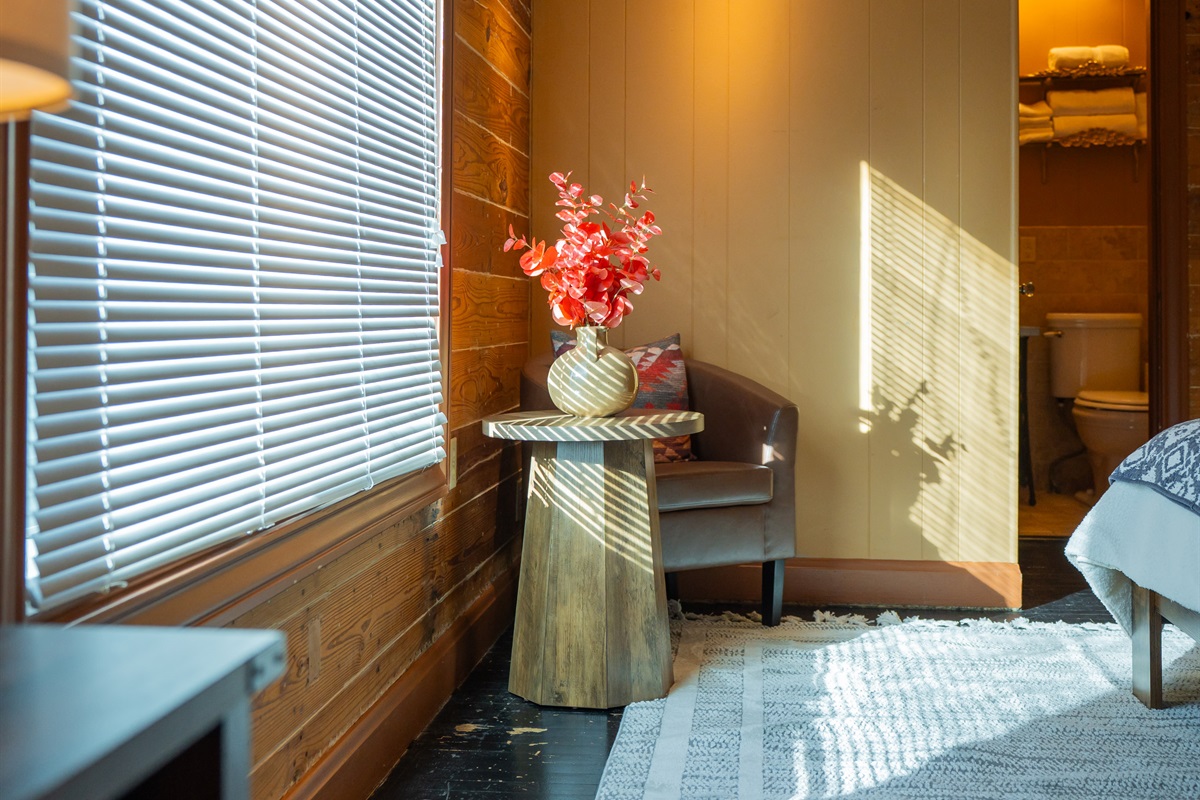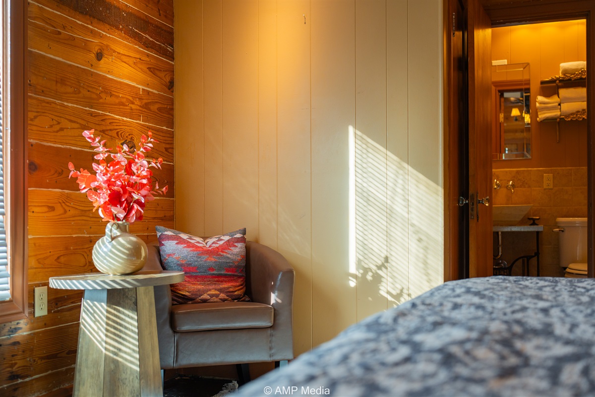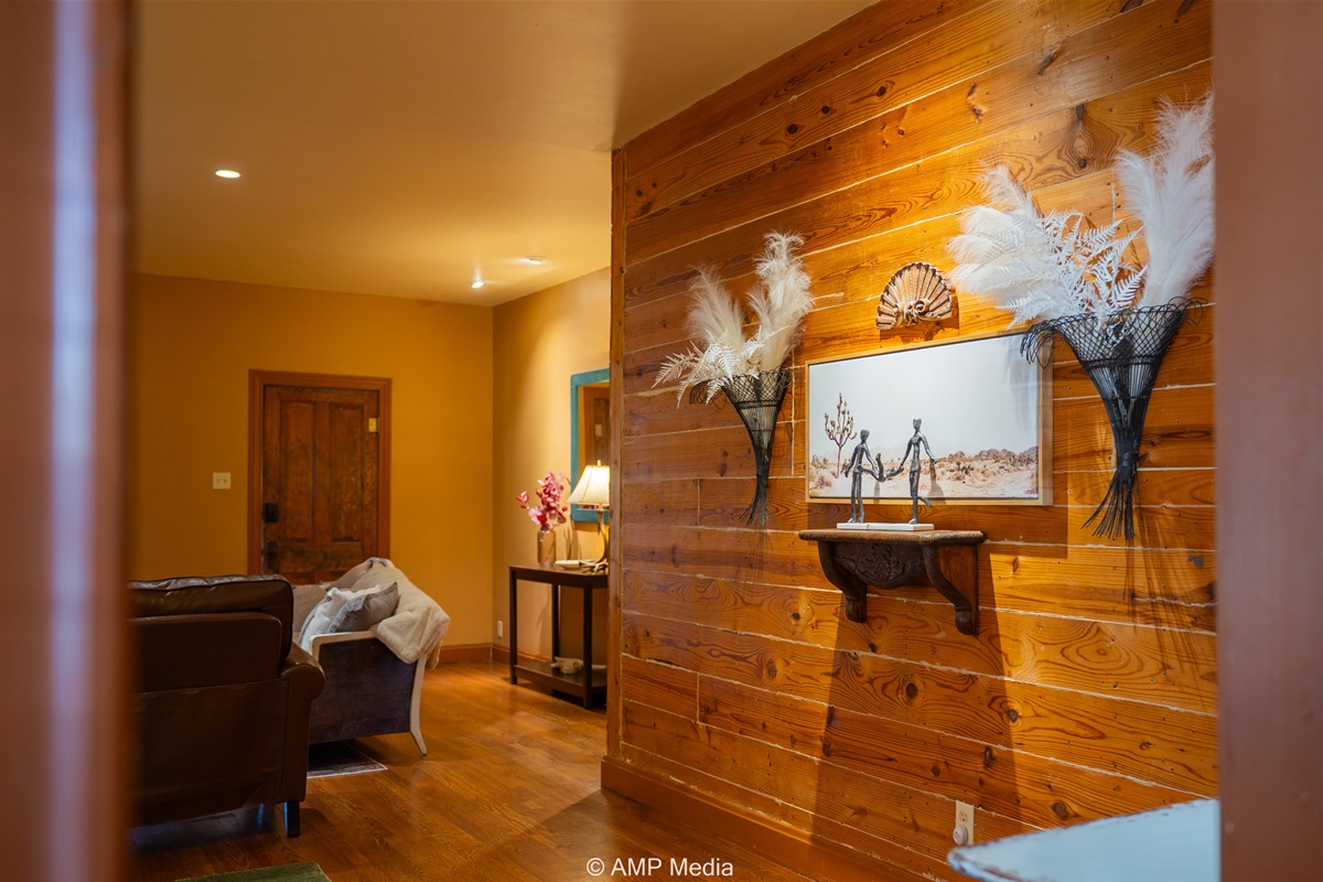 Step into a space where history meets comfort, with a king, queen and 2 single beds adorned the 3 bedrooms. The décor in the first bedroom is a tribute to our Native American heritage, with antique Navajo rugs, artwork, and captivating imagery. Hardwood floors, original wooden shiplap walls, and rustic, antique accessories create a warm log cabin ambiance, inviting you to unwind and make lasting memories.