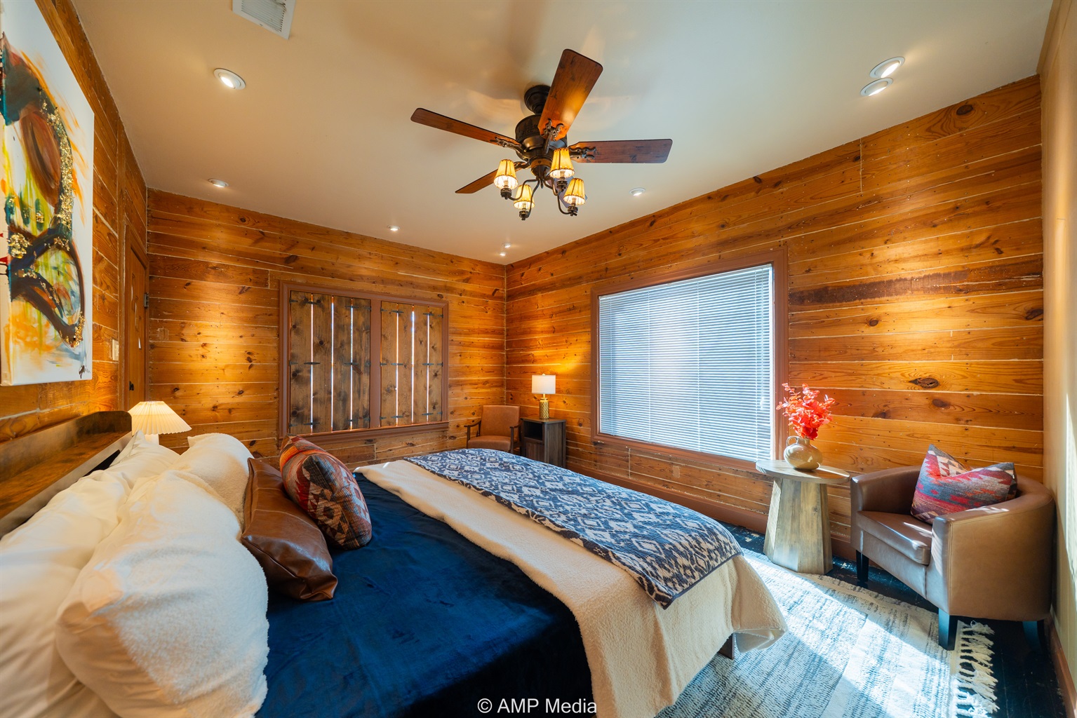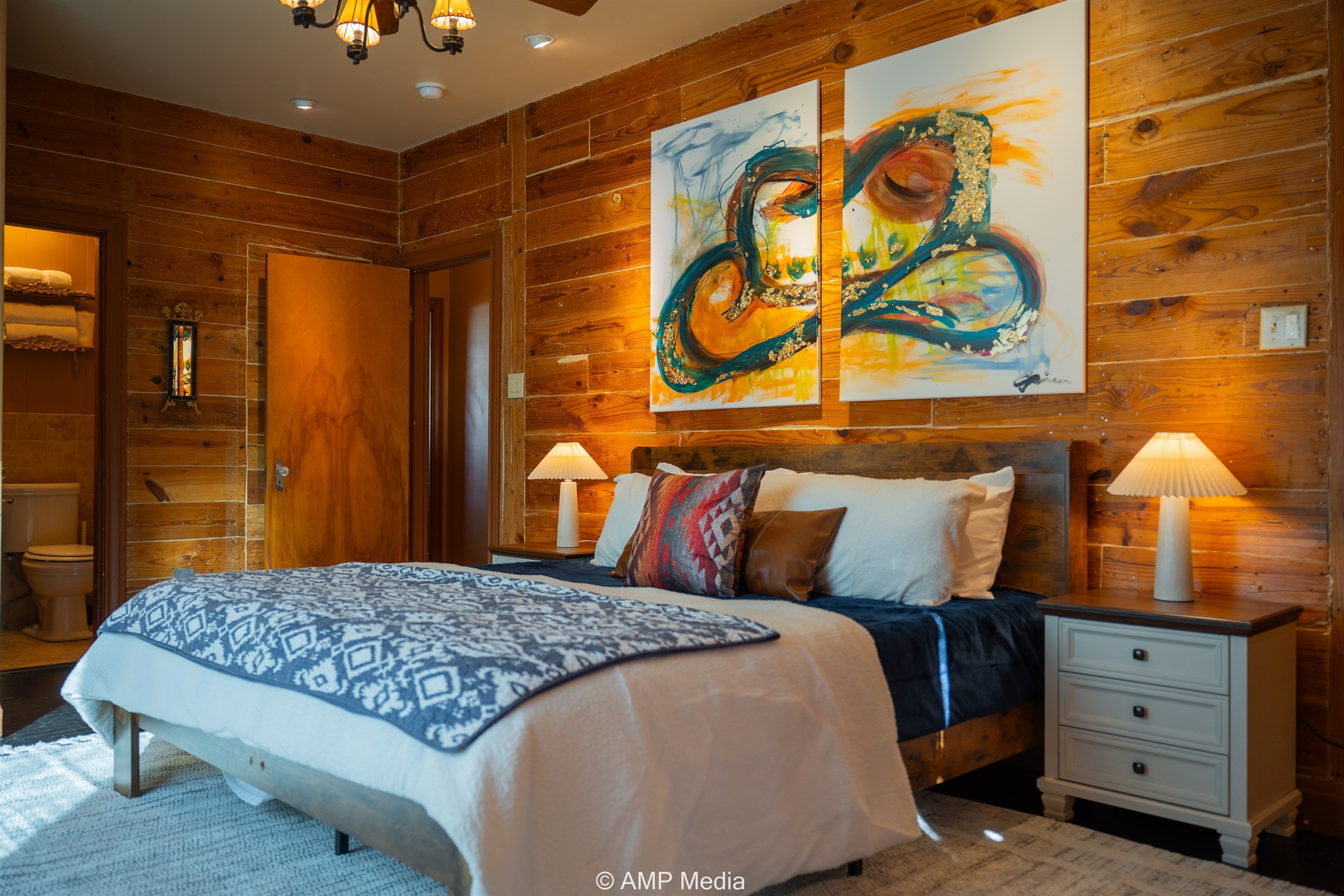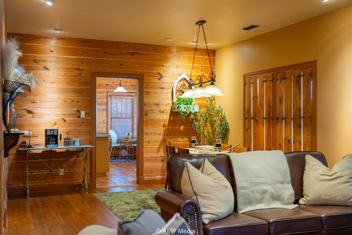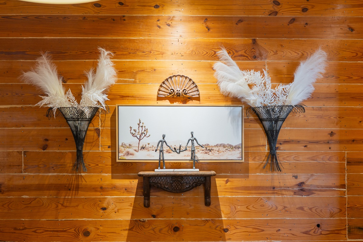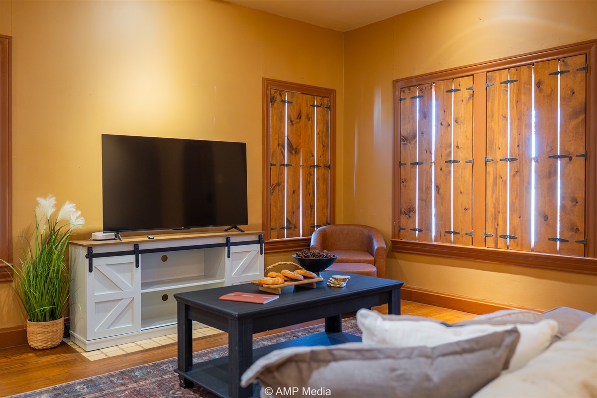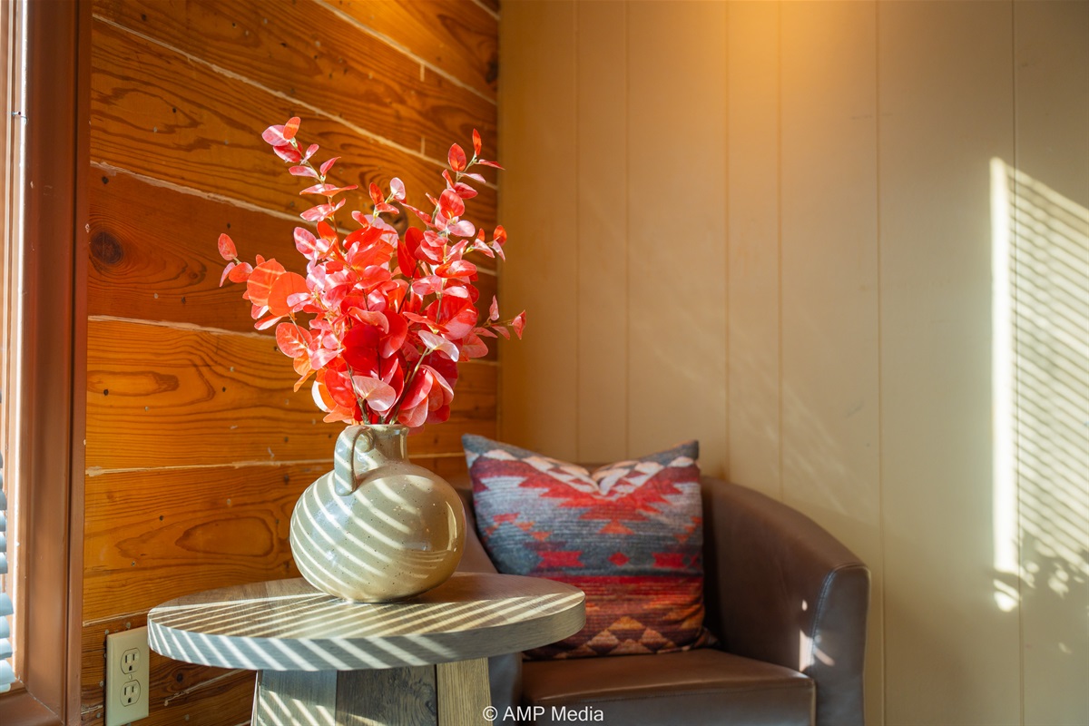Step into a space where history meets comfort, with a king, queen and 2 single beds adorned the 3 bedrooms. The décor in the first bedroom is a tribute to our Native American heritage, with antique Navajo rugs, artwork, and captivating imagery. Hardwood floors, original wooden shiplap walls, and rustic, antique accessories create a warm log cabin ambiance, inviting you to unwind and make lasting memories.
