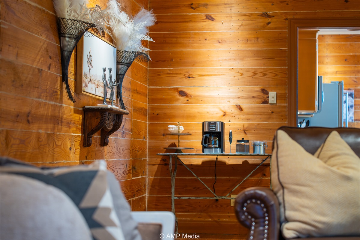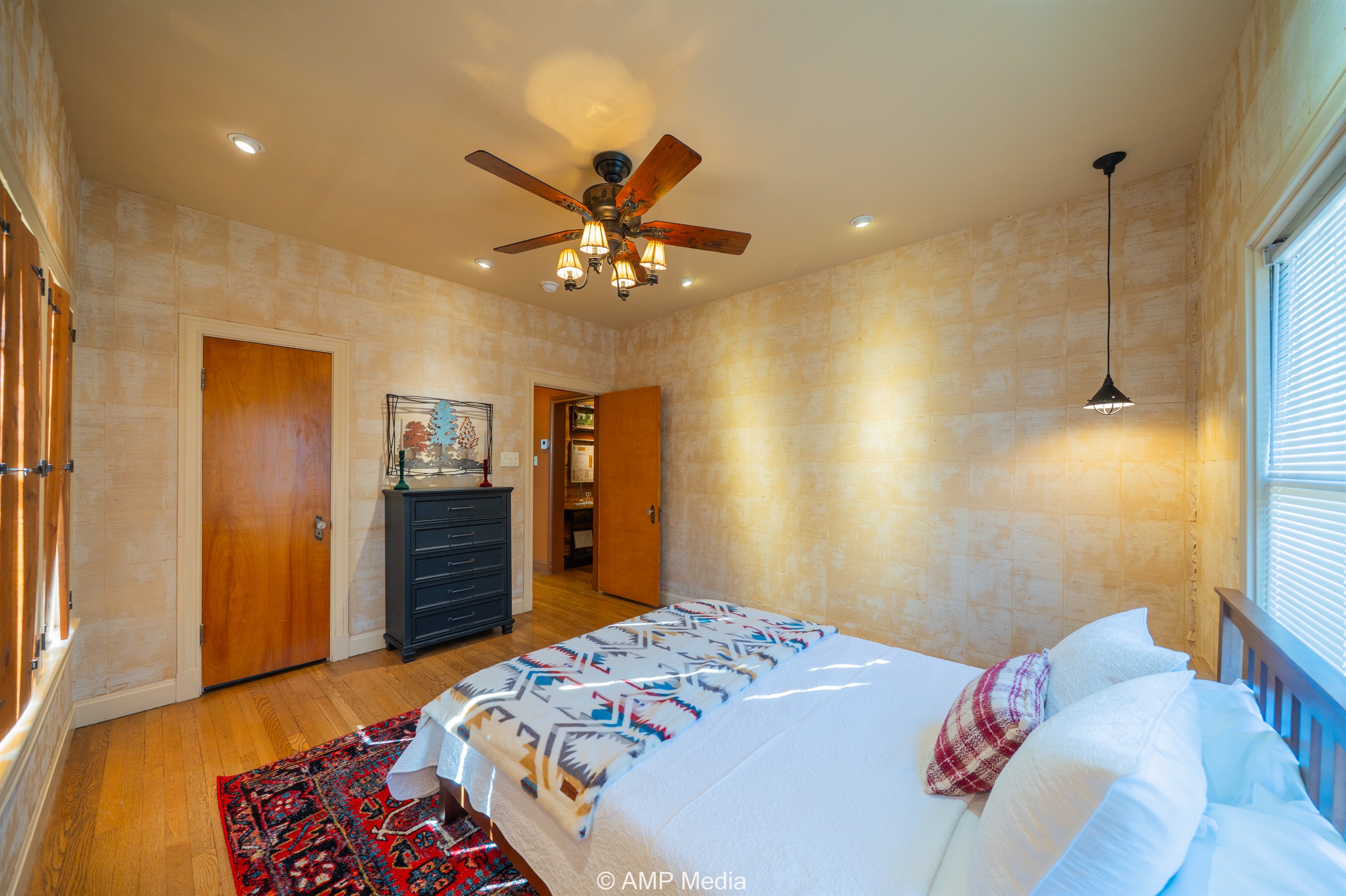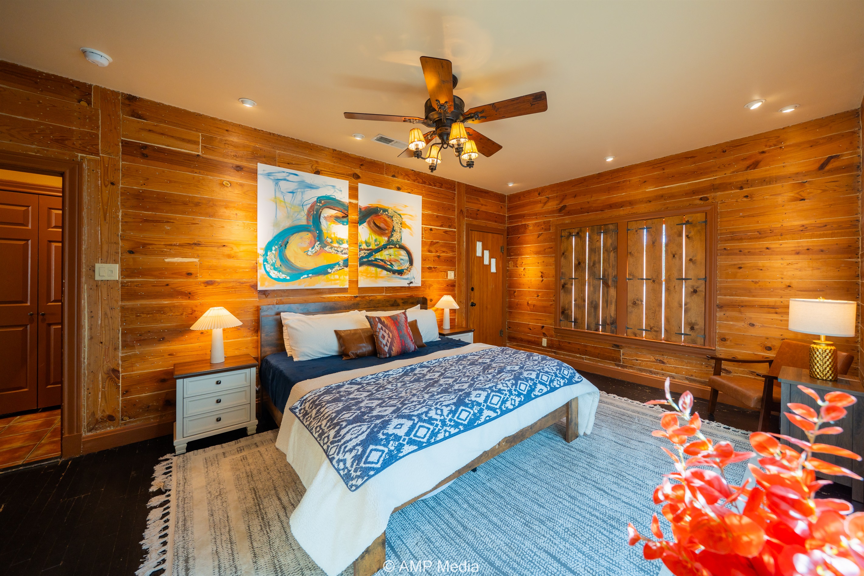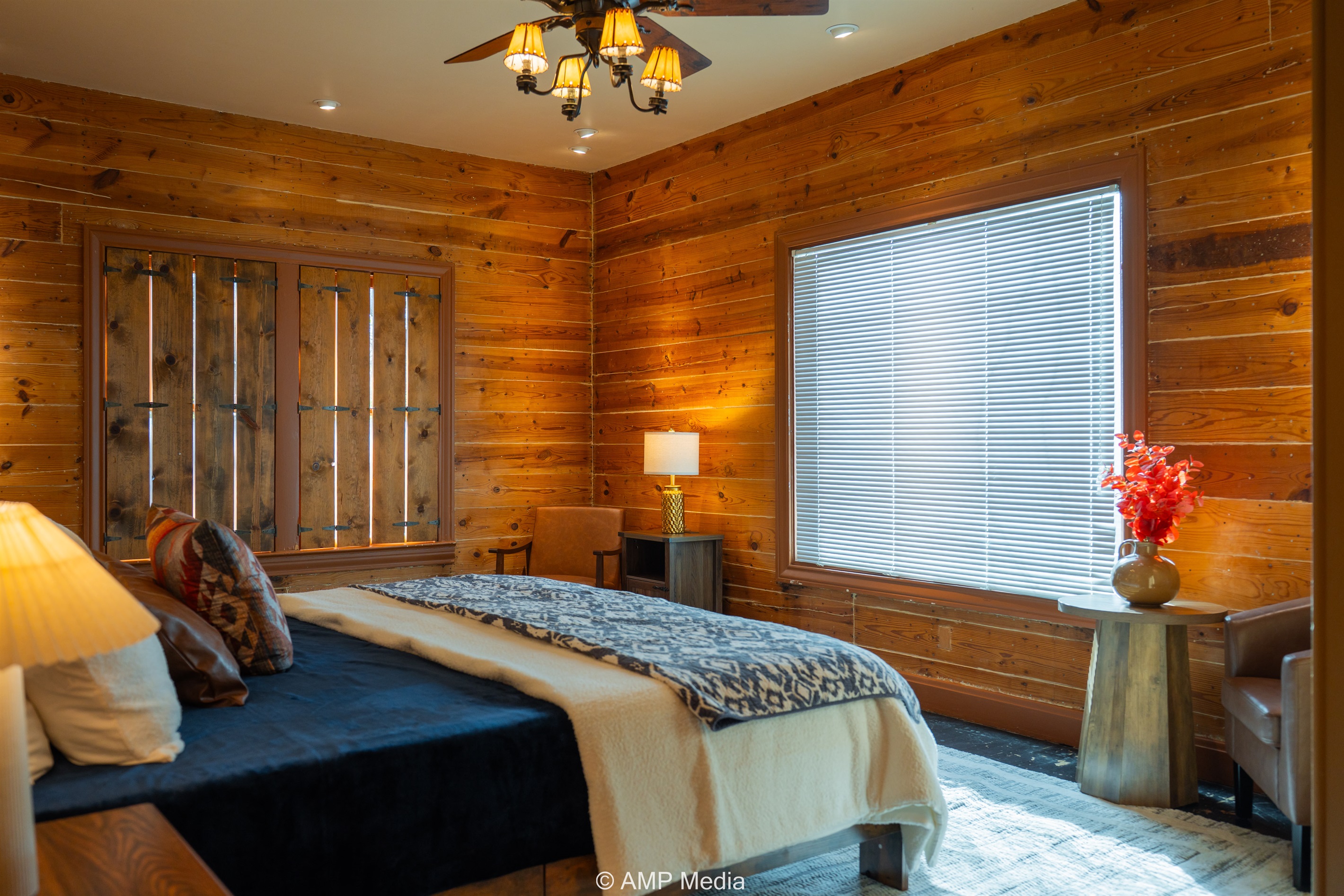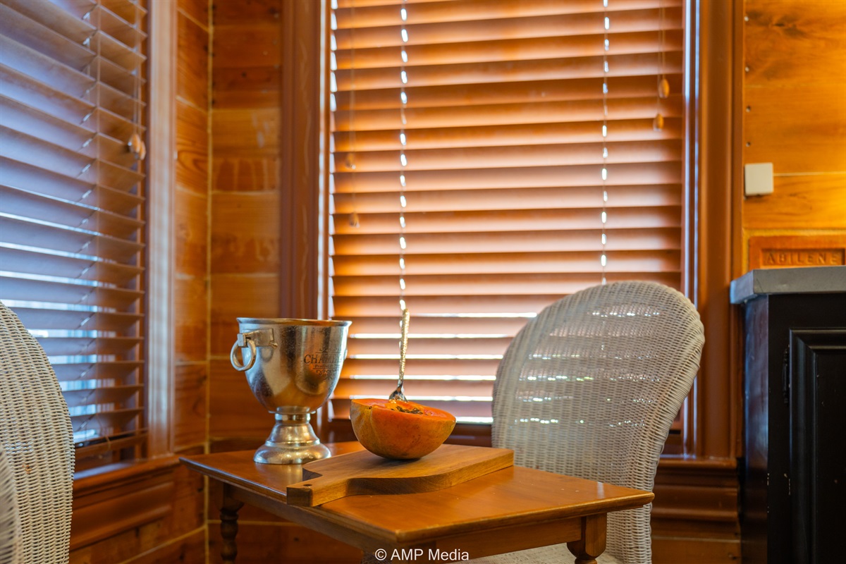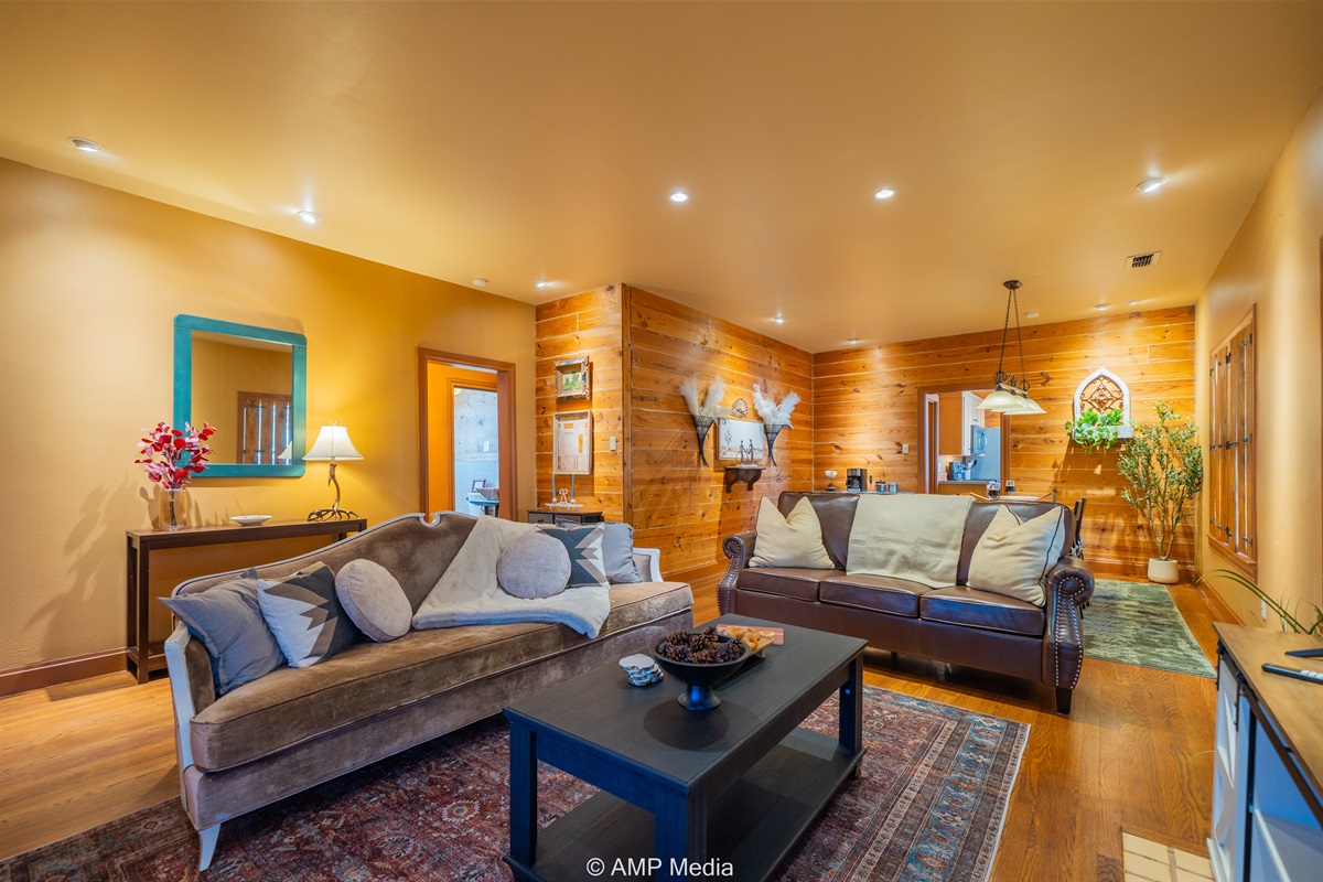 Step into a space where history meets comfort, with a king, queen and 2 single beds adorned the 3 bedrooms. The décor in the first bedroom is a tribute to our Native American heritage, with antique Navajo rugs, artwork, and captivating imagery. Hardwood floors, original wooden shiplap walls, and rustic, antique accessories create a warm log cabin ambiance, inviting you to unwind and make lasting memories.