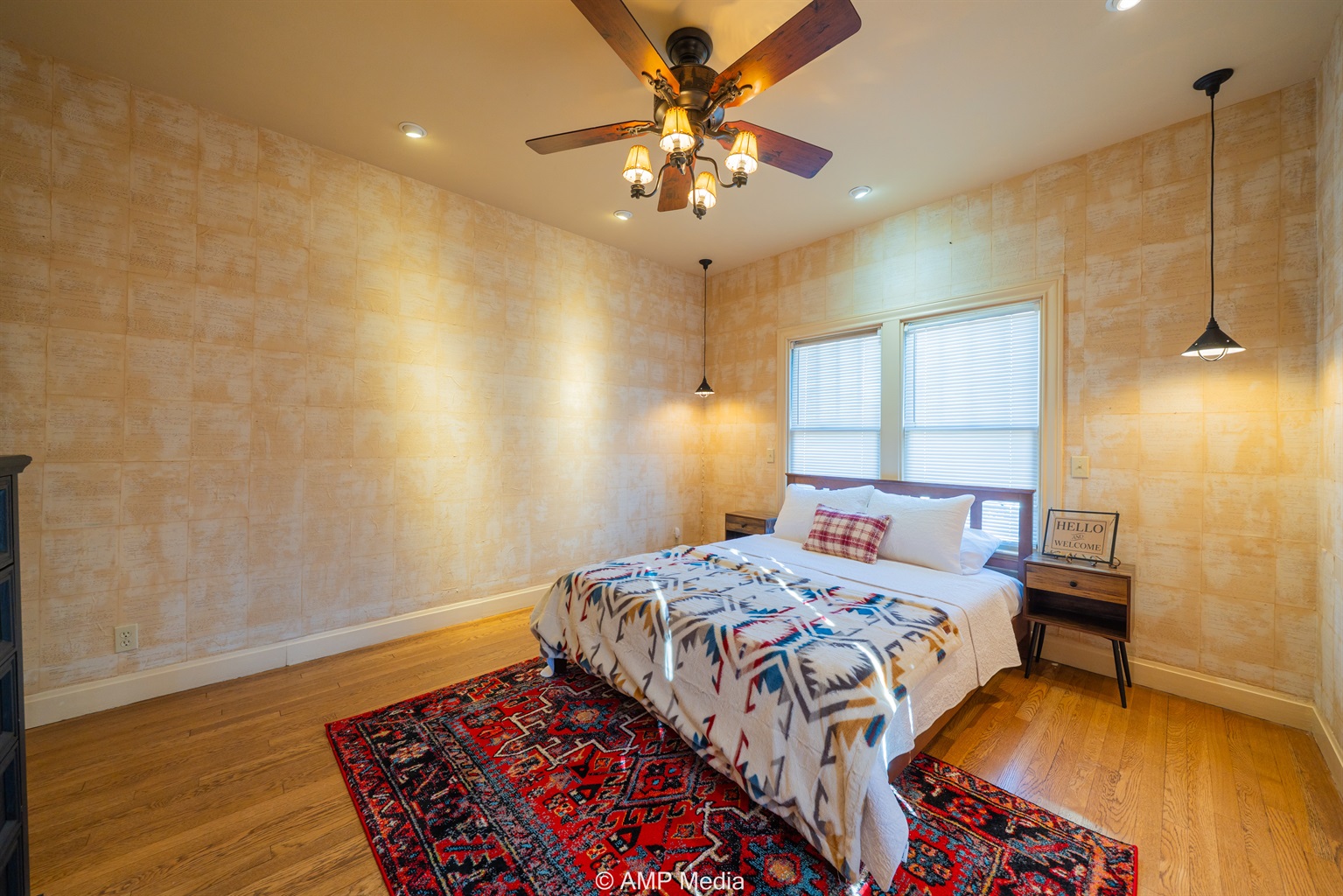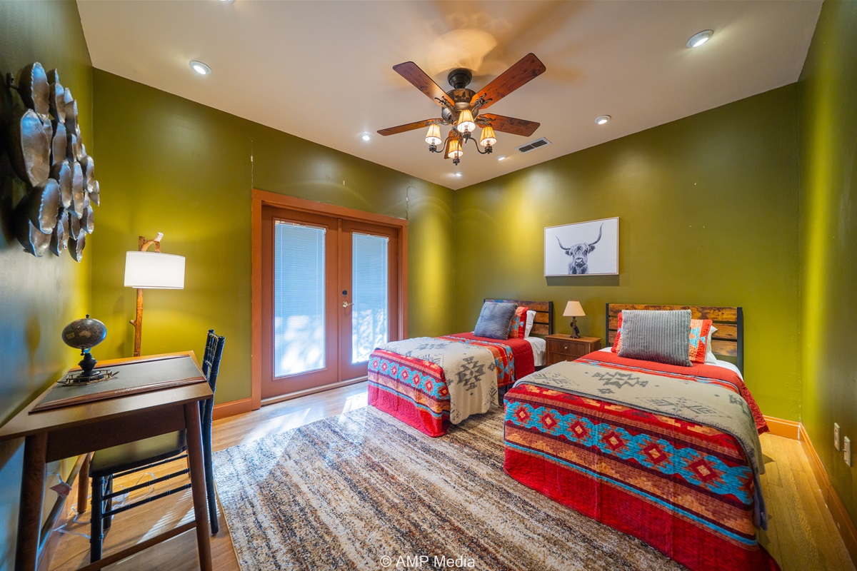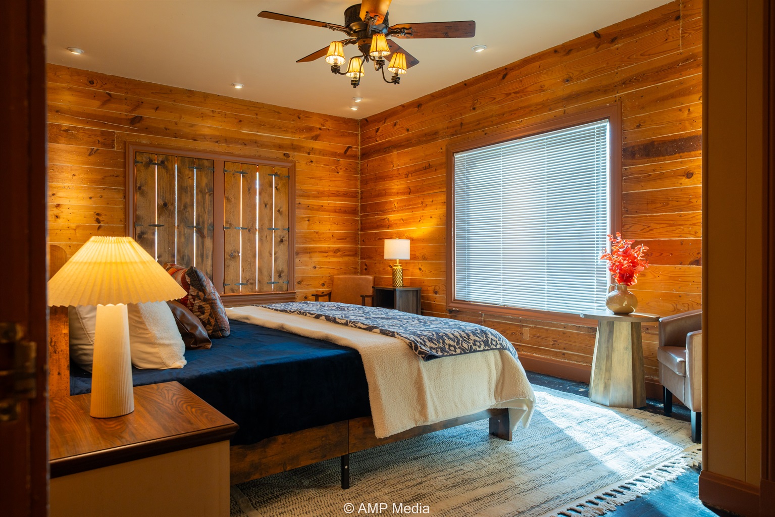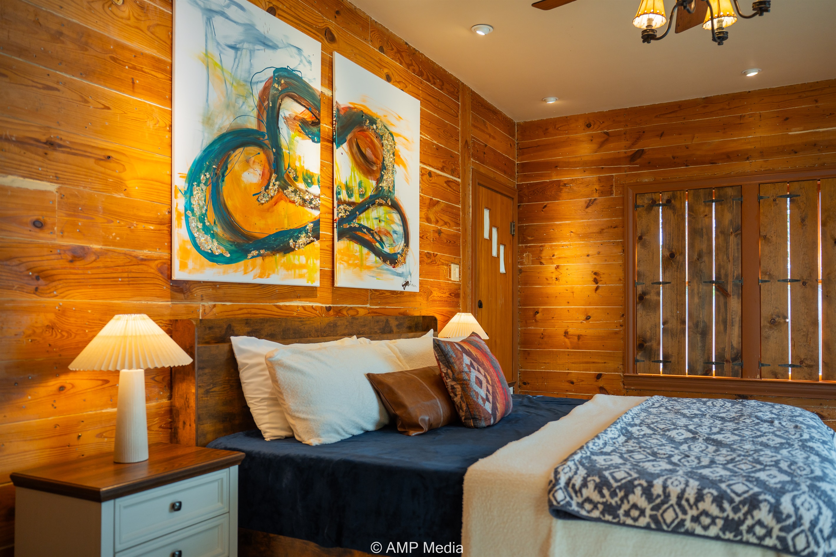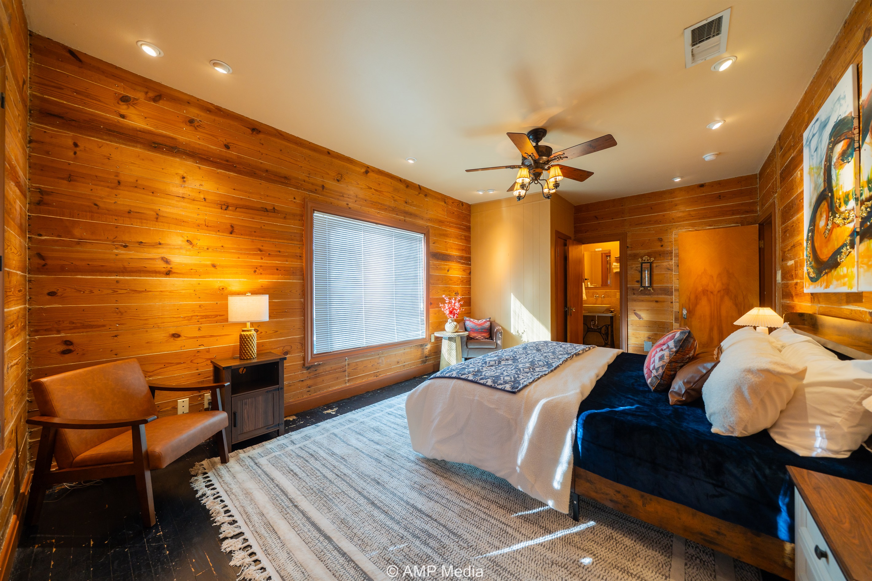 Step into a space where history meets comfort, with a king, queen and 2 single beds adorned the 3 bedrooms. The décor in the first bedroom is a tribute to our Native American heritage, with antique Navajo rugs, artwork, and captivating imagery. Hardwood floors, original wooden shiplap walls, and rustic, antique accessories create a warm log cabin ambiance, inviting you to unwind and make lasting memories.