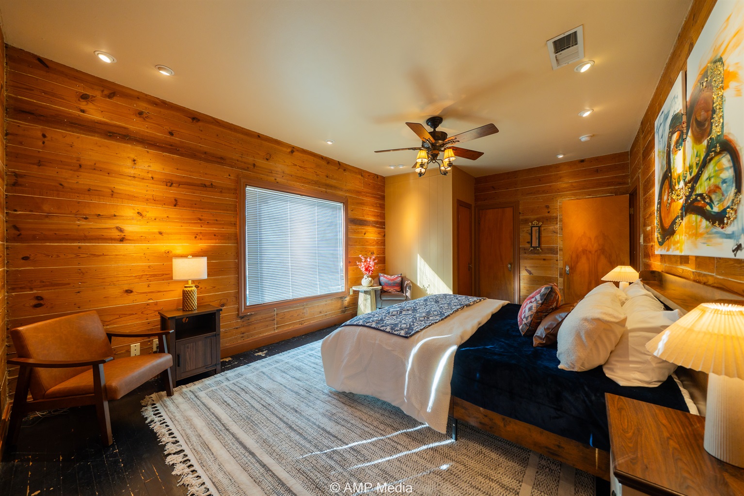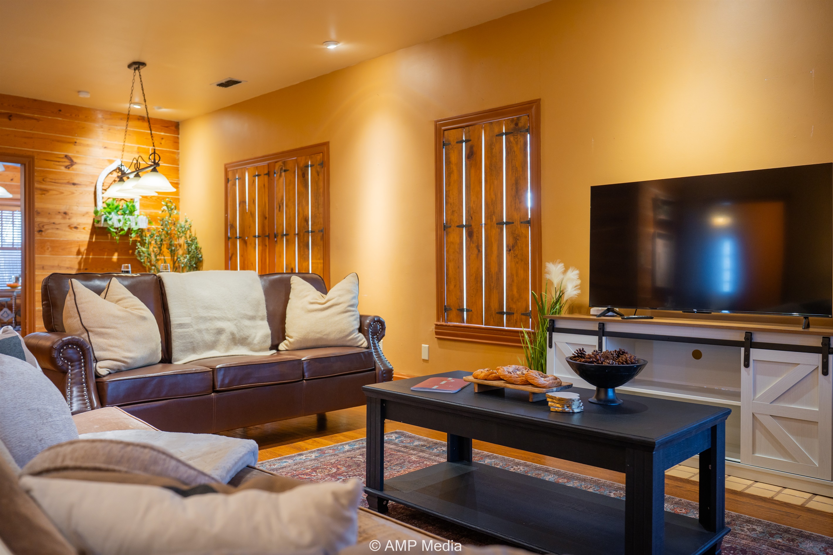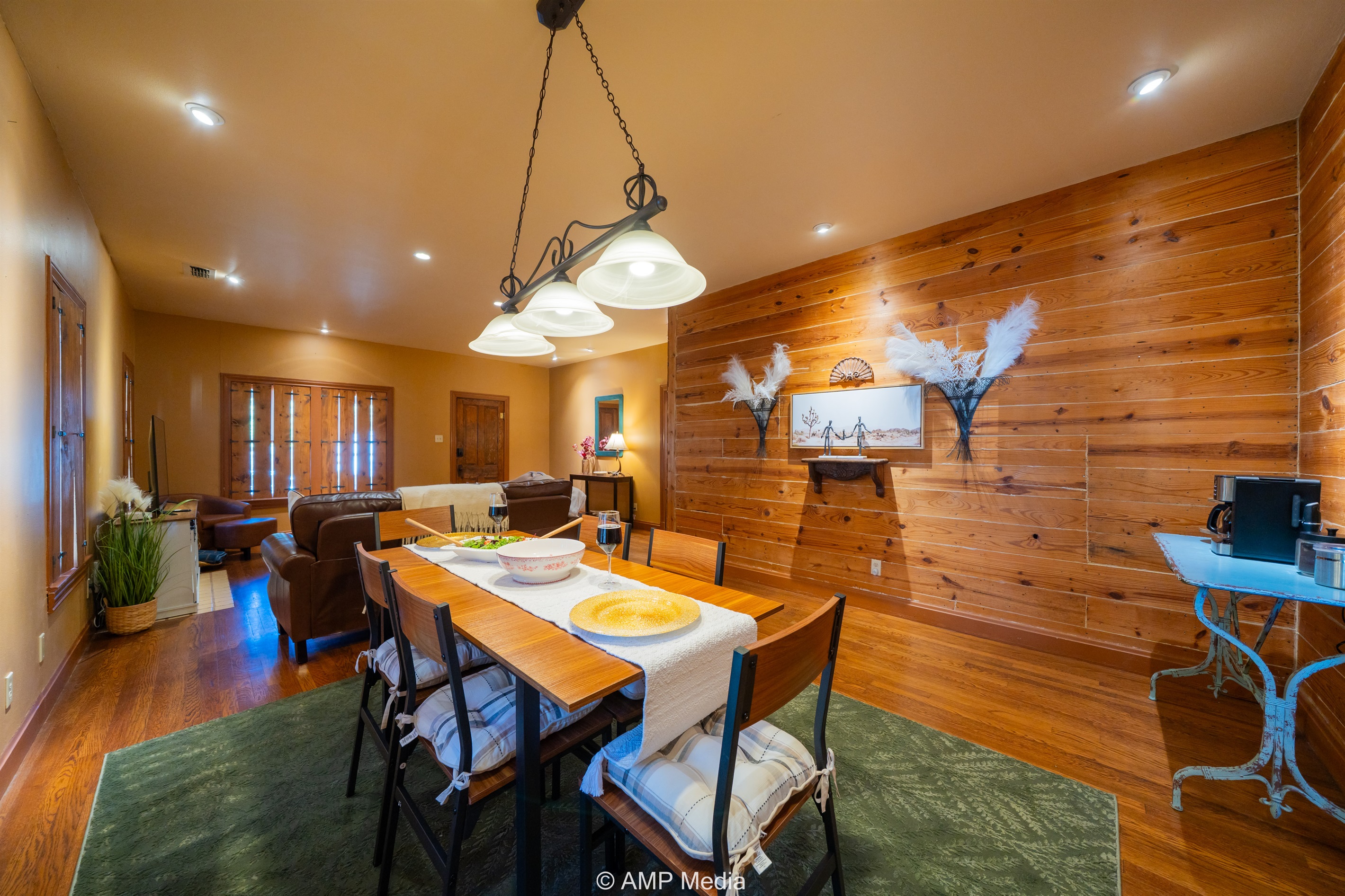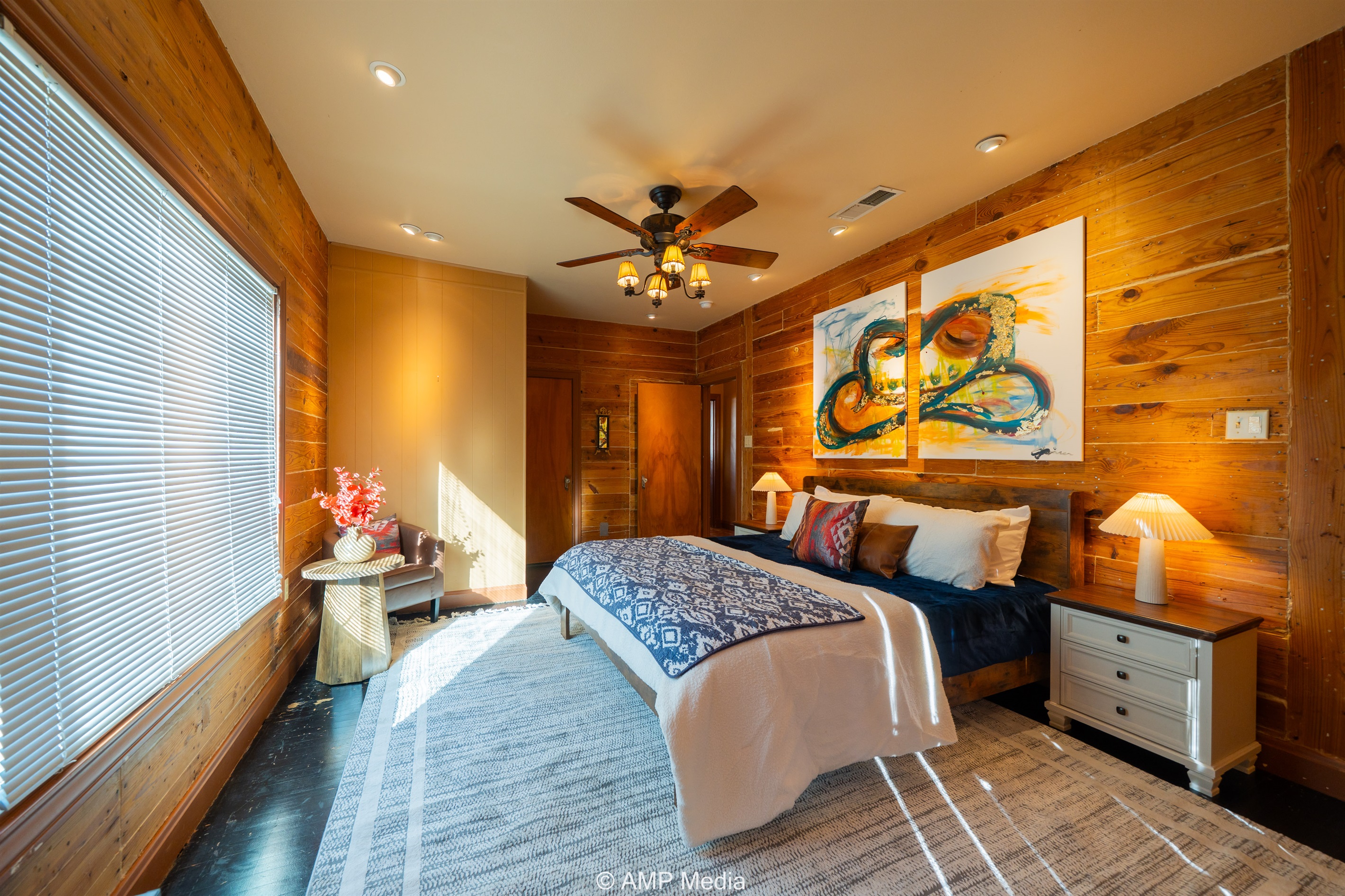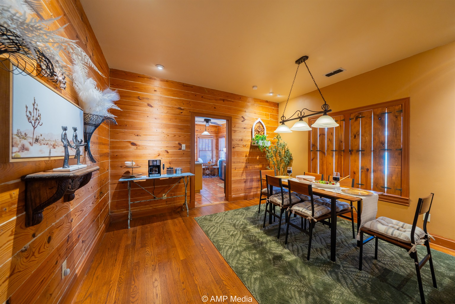 Step into a space where history meets comfort, with a king, queen and 2 single beds adorned the 3 bedrooms. The décor in the first bedroom is a tribute to our Native American heritage, with antique Navajo rugs, artwork, and captivating imagery. Hardwood floors, original wooden shiplap walls, and rustic, antique accessories create a warm log cabin ambiance, inviting you to unwind and make lasting memories.