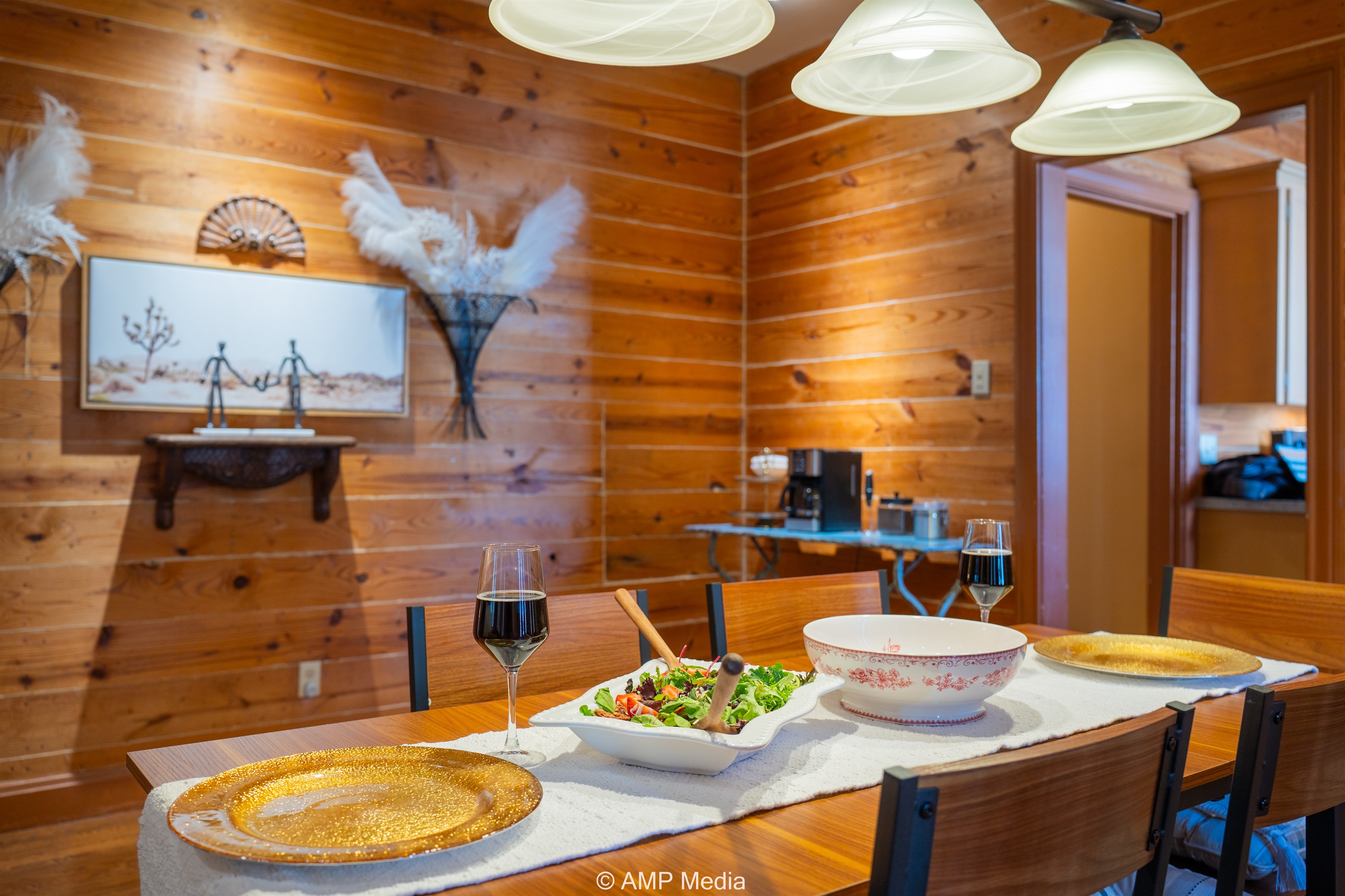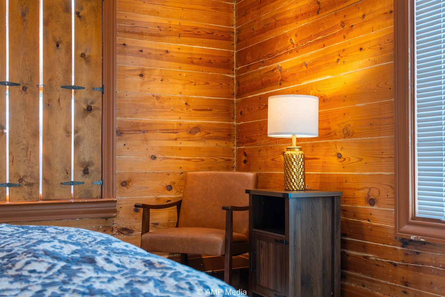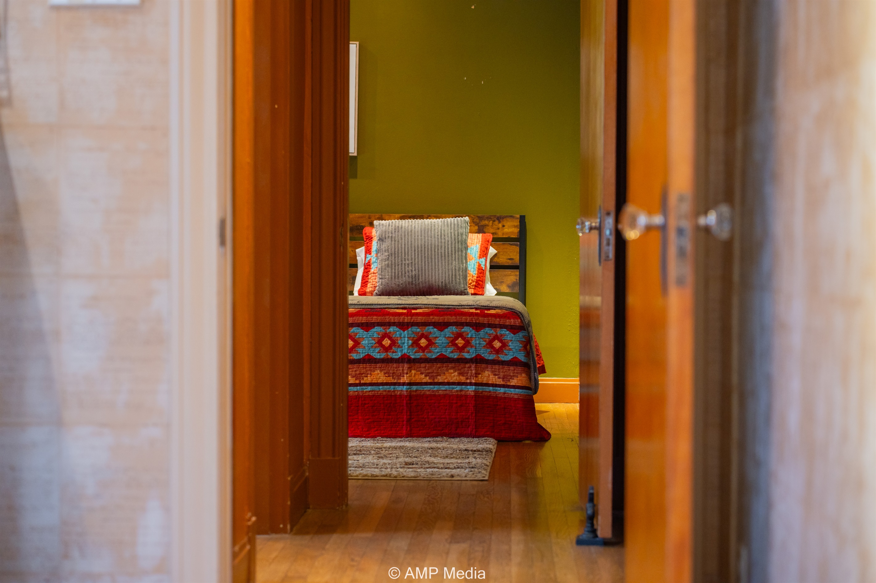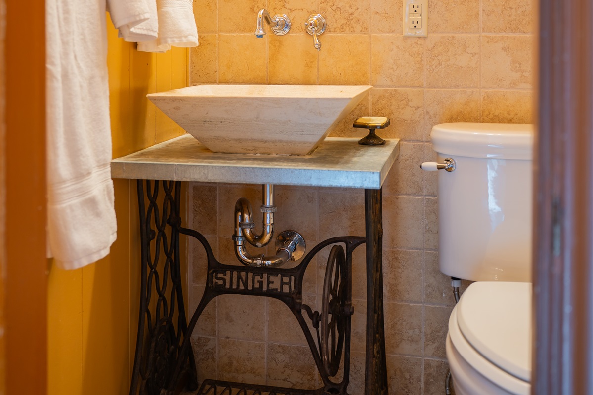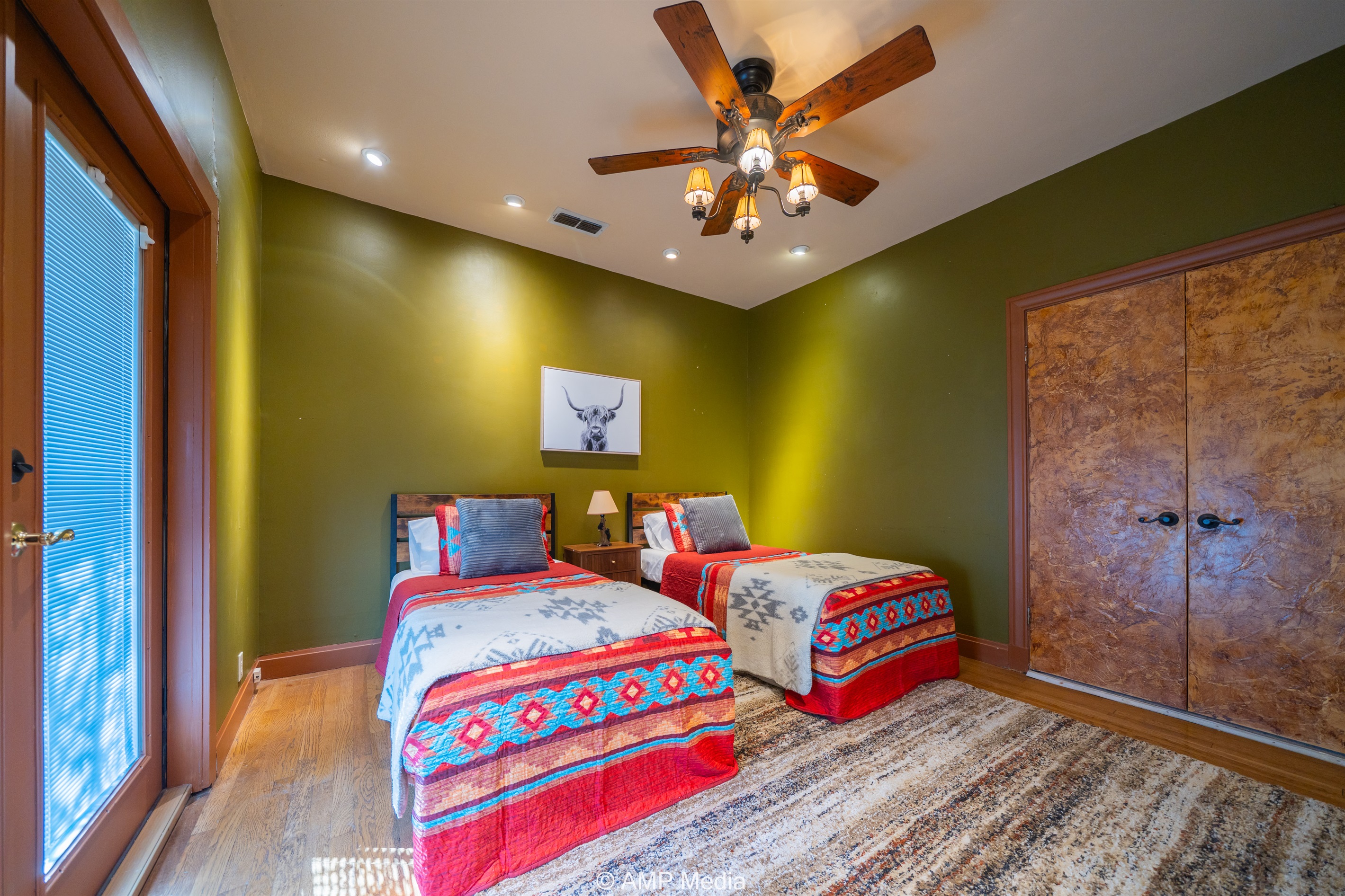 Step into a space where history meets comfort, with a king, queen and 2 single beds adorned the 3 bedrooms. The décor in the first bedroom is a tribute to our Native American heritage, with antique Navajo rugs, artwork, and captivating imagery. Hardwood floors, original wooden shiplap walls, and rustic, antique accessories create a warm log cabin ambiance, inviting you to unwind and make lasting memories.