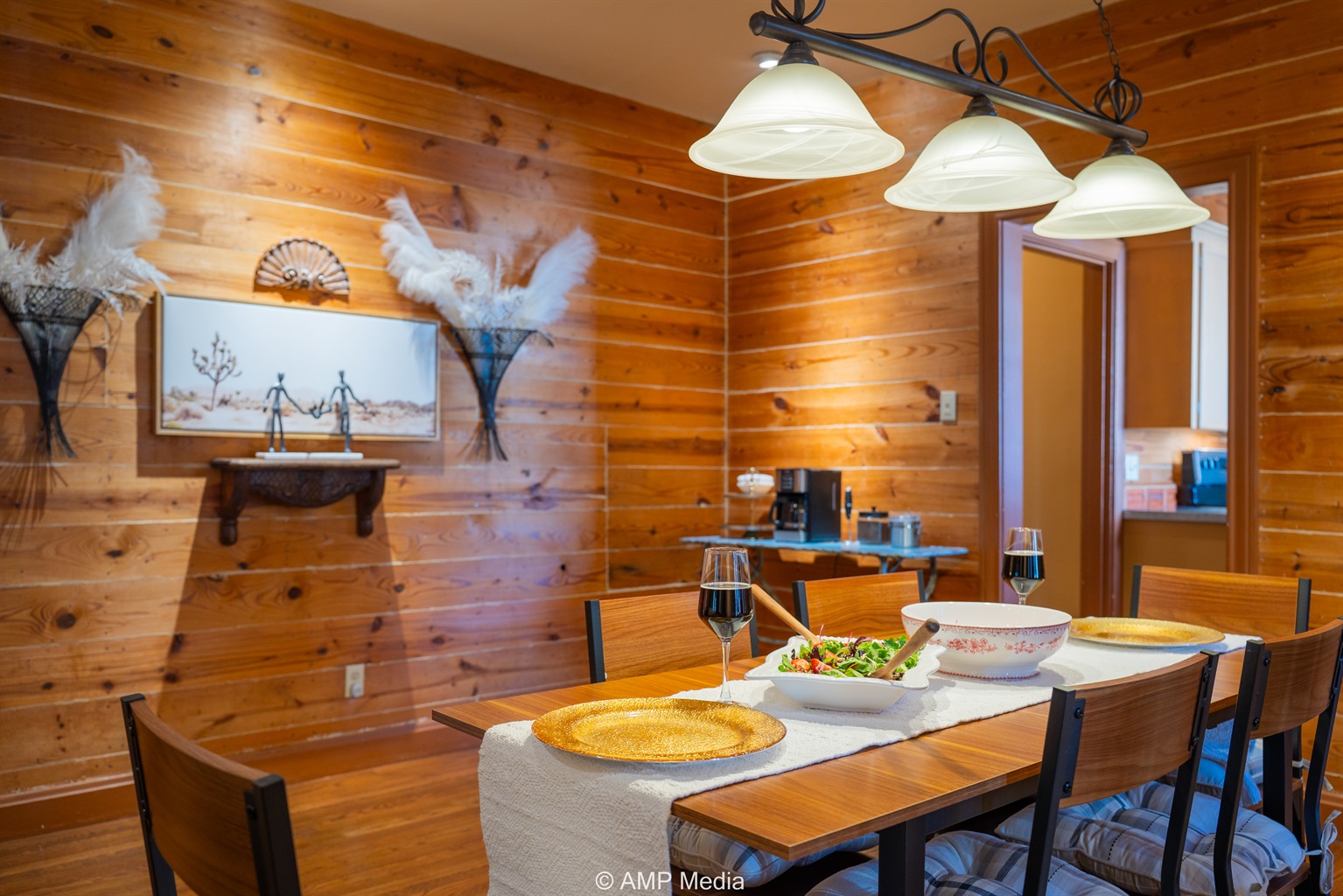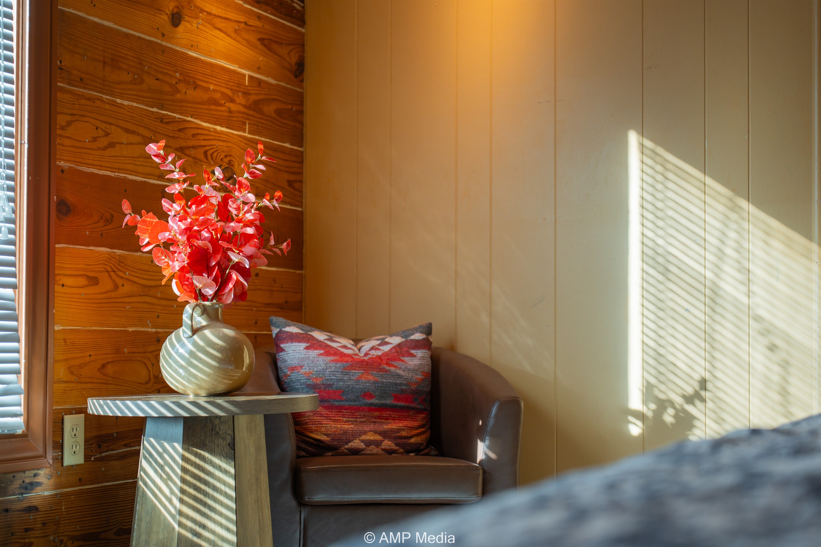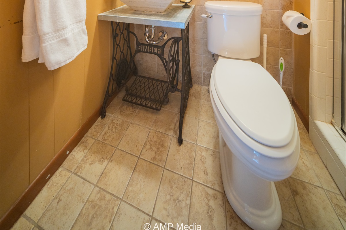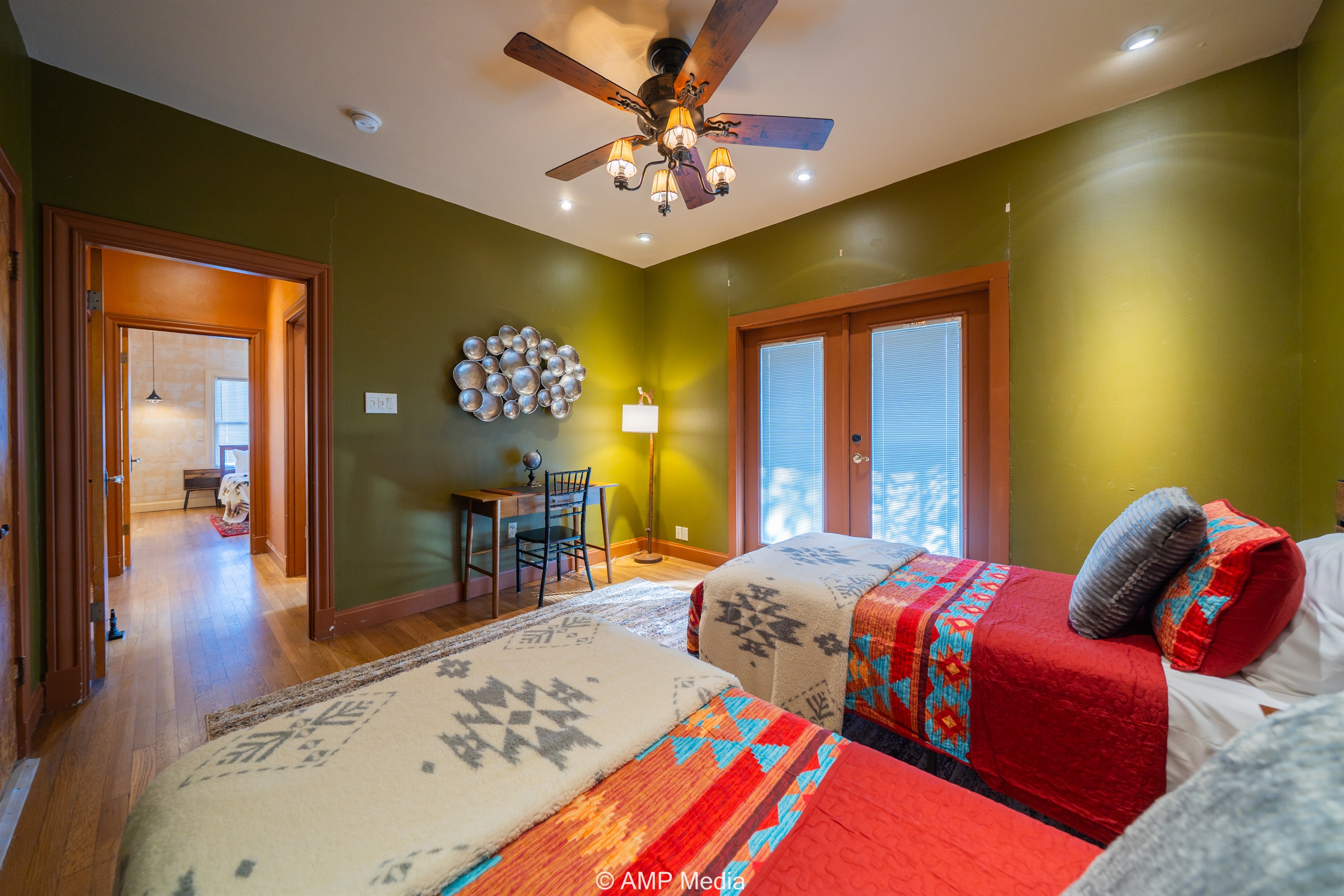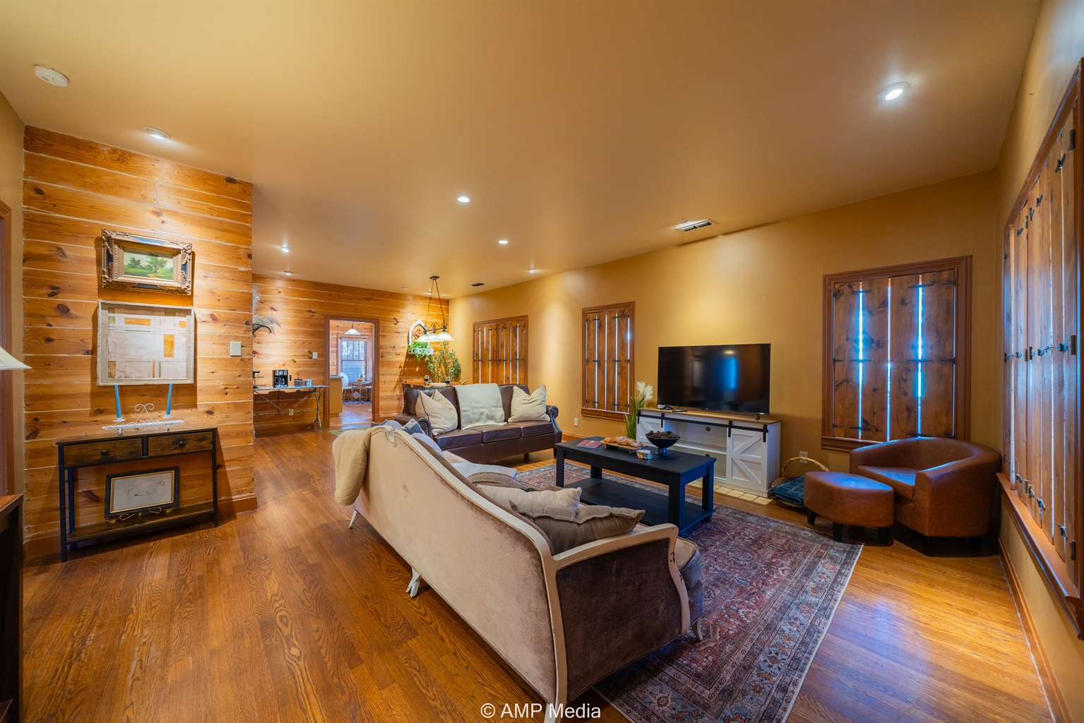 Step into a space where history meets comfort, with a king, queen and 2 single beds adorned the 3 bedrooms. The décor in the first bedroom is a tribute to our Native American heritage, with antique Navajo rugs, artwork, and captivating imagery. Hardwood floors, original wooden shiplap walls, and rustic, antique accessories create a warm log cabin ambiance, inviting you to unwind and make lasting memories.