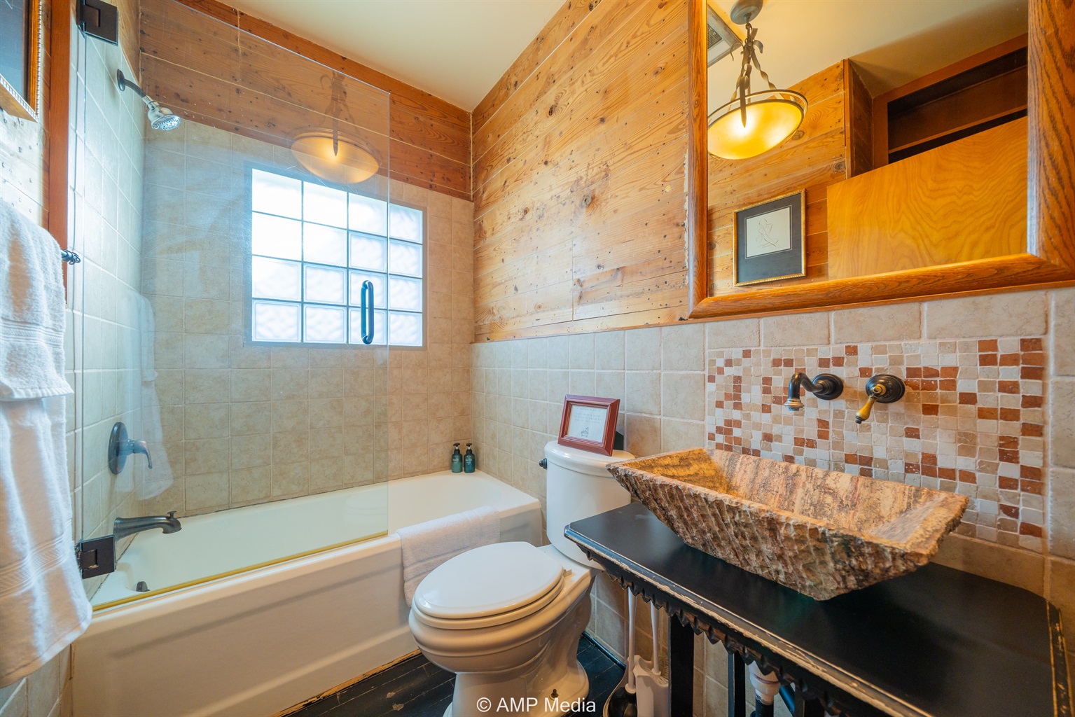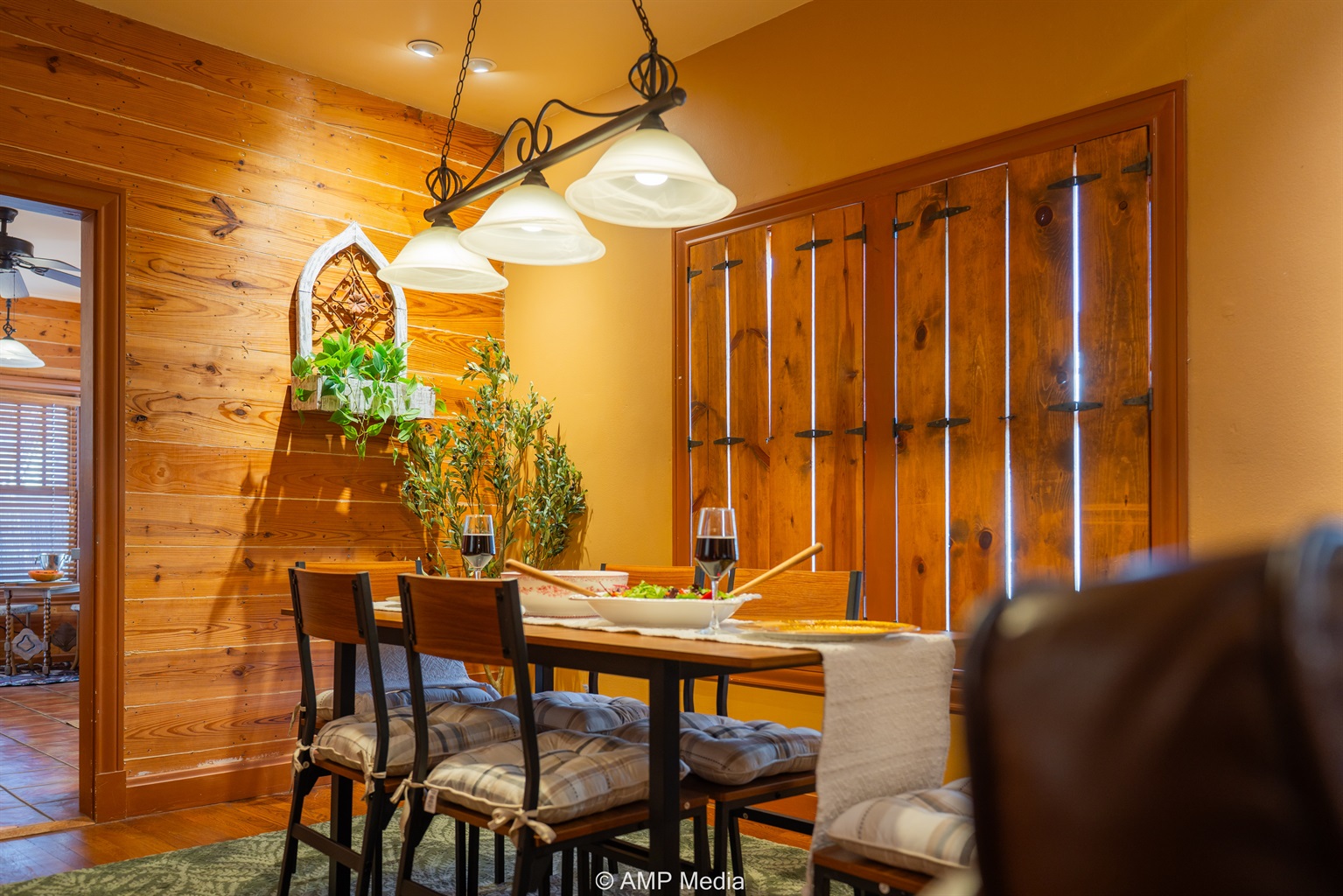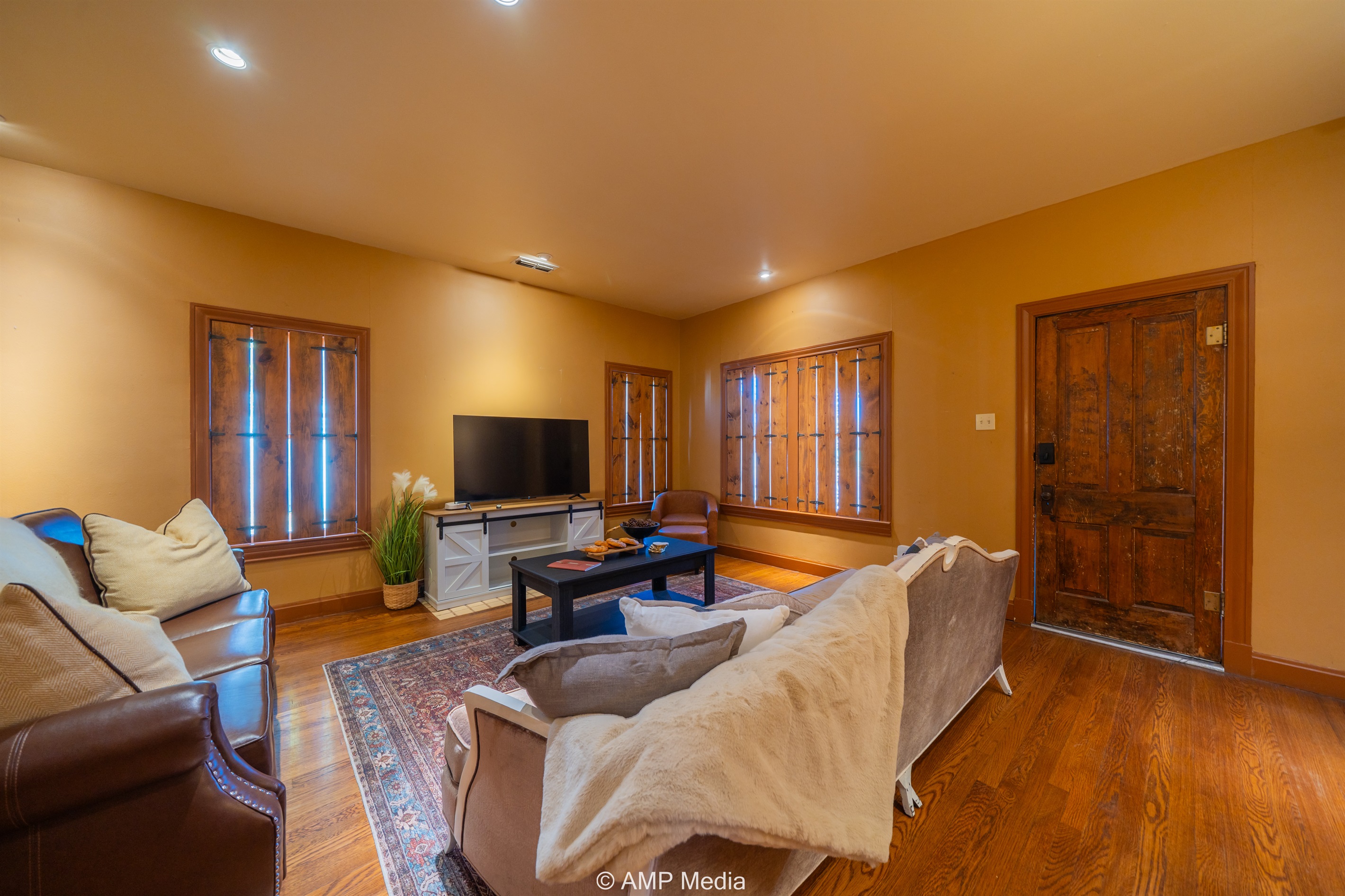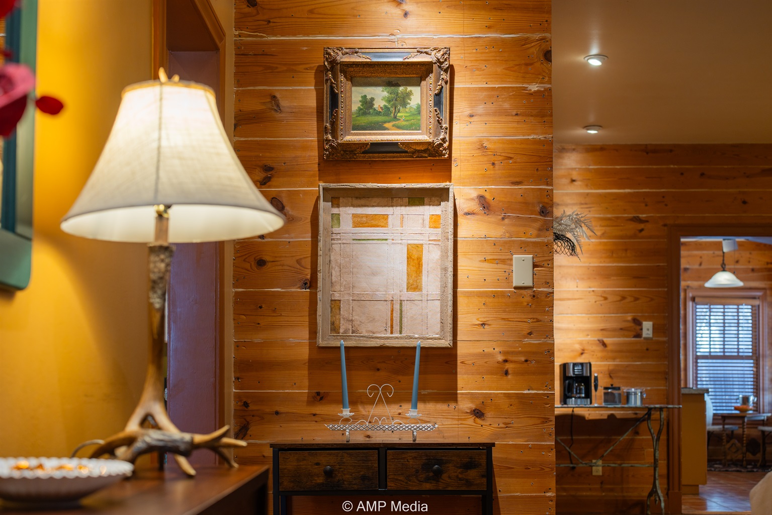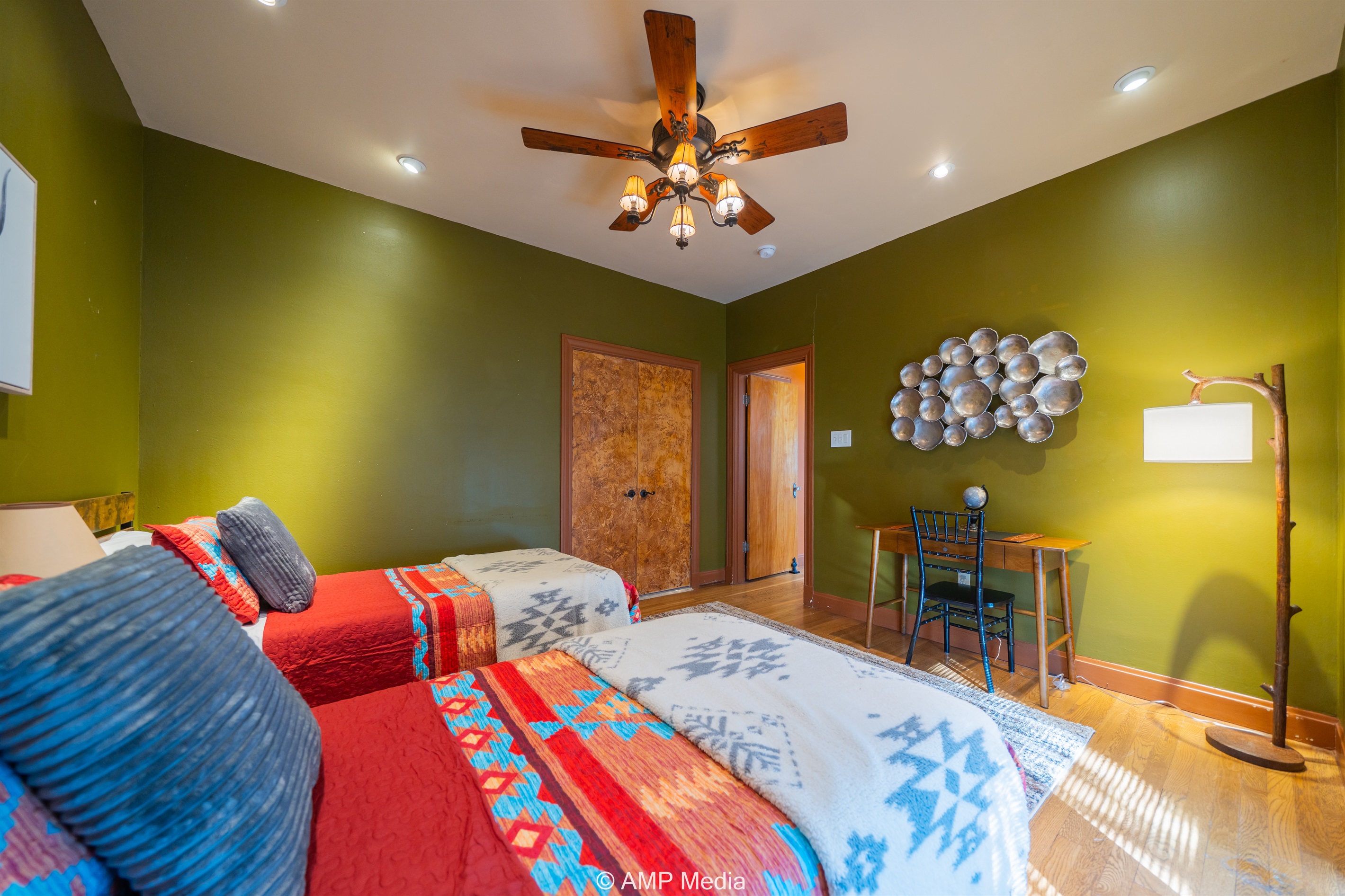 Step into a space where history meets comfort, with a king, queen and 2 single beds adorned the 3 bedrooms. The décor in the first bedroom is a tribute to our Native American heritage, with antique Navajo rugs, artwork, and captivating imagery. Hardwood floors, original wooden shiplap walls, and rustic, antique accessories create a warm log cabin ambiance, inviting you to unwind and make lasting memories.