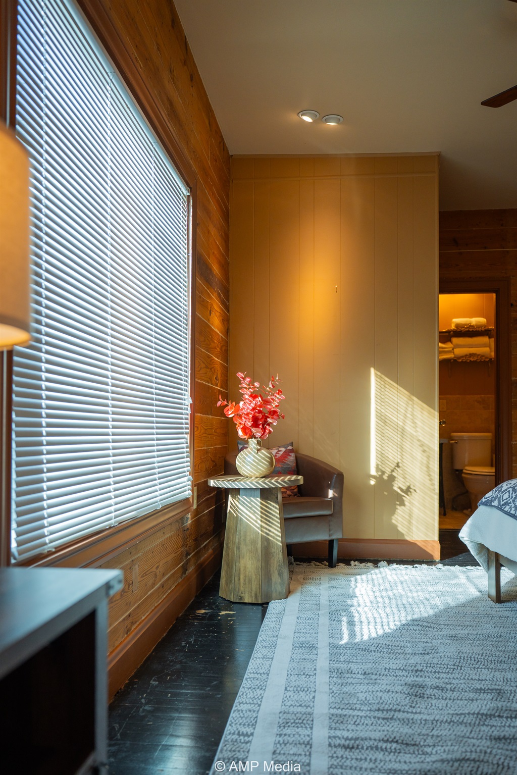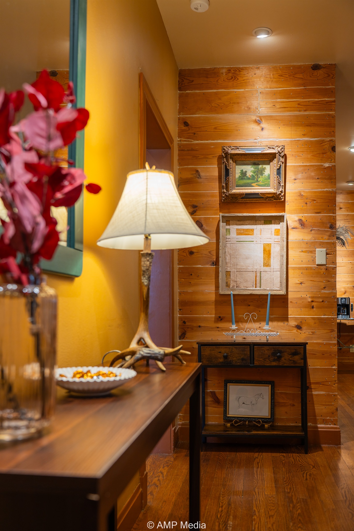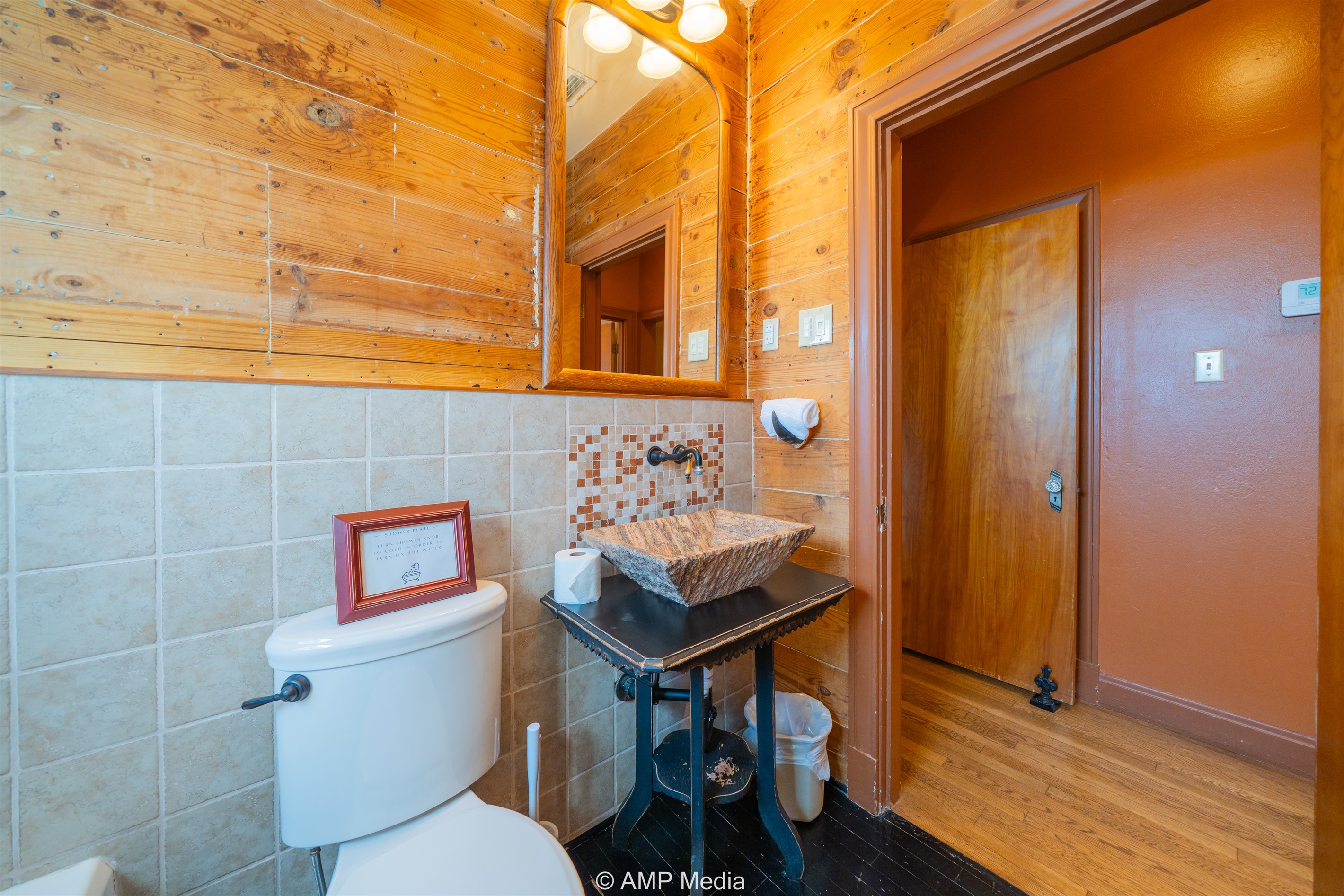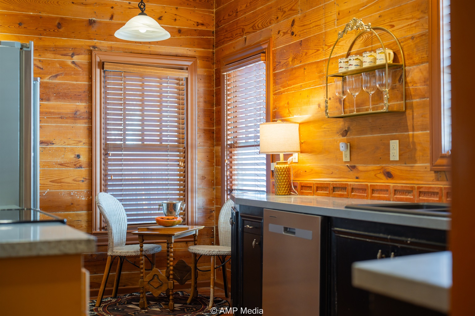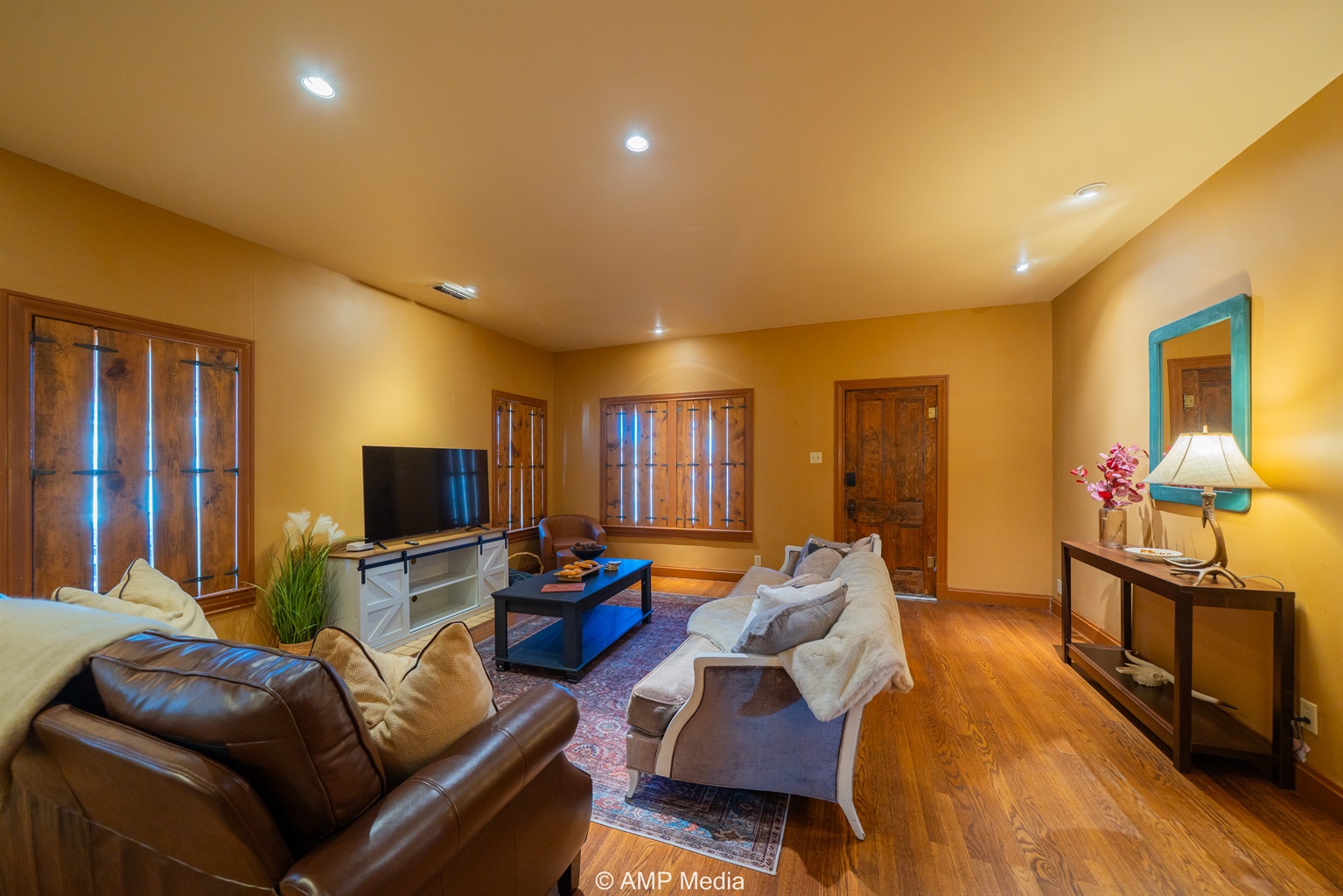 Step into a space where history meets comfort, with a king, queen and 2 single beds adorned the 3 bedrooms. The décor in the first bedroom is a tribute to our Native American heritage, with antique Navajo rugs, artwork, and captivating imagery. Hardwood floors, original wooden shiplap walls, and rustic, antique accessories create a warm log cabin ambiance, inviting you to unwind and make lasting memories.