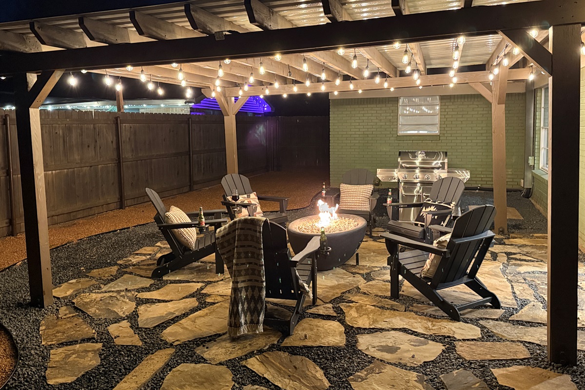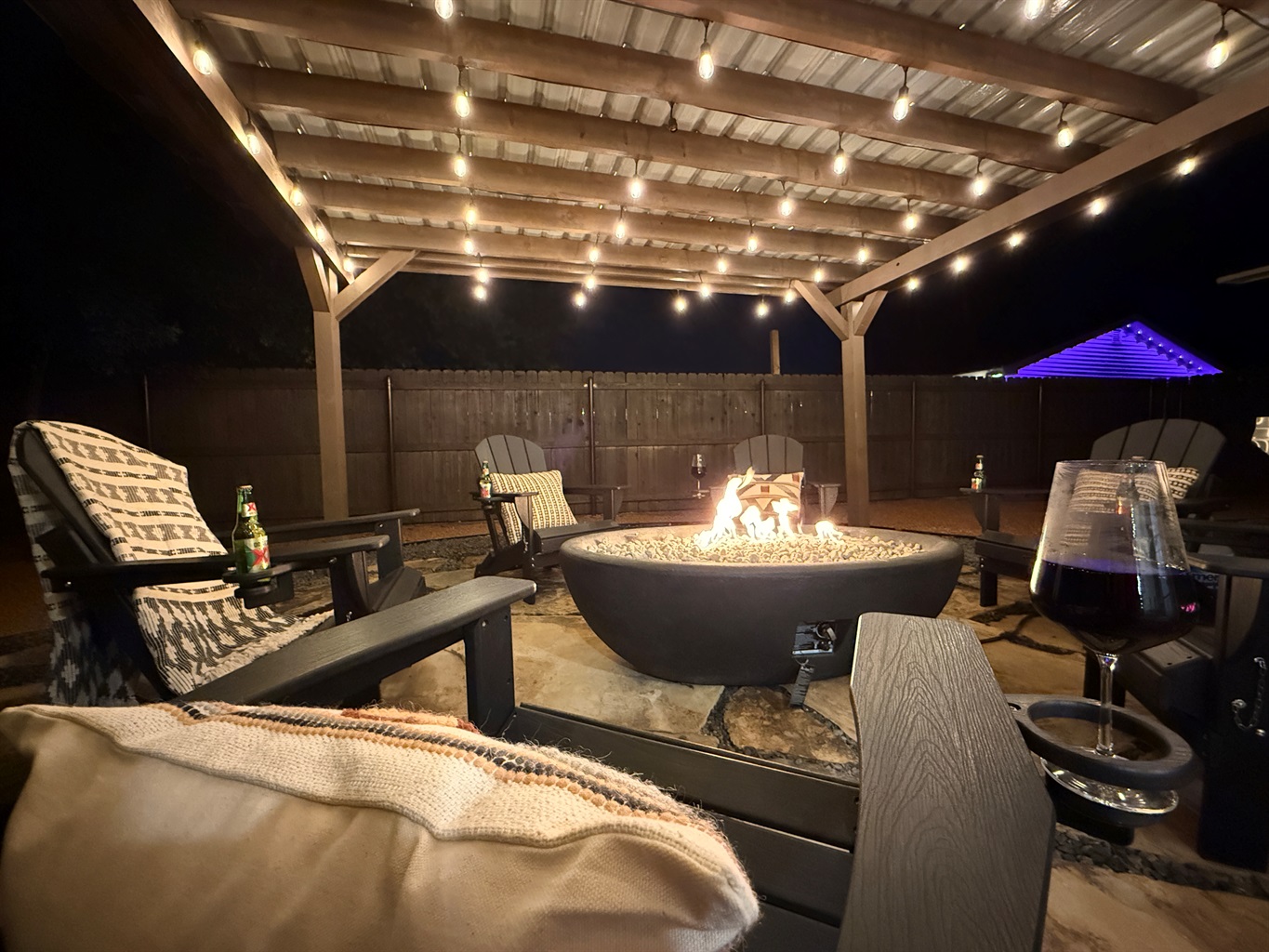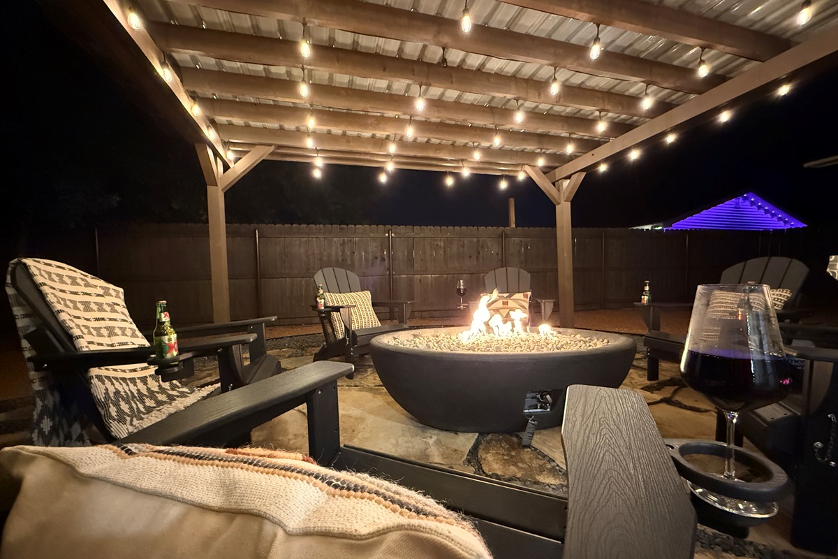 🔥 Fire Pit Oasis – Lighted pergola, 8 Adirondack chairs & twinkling Texas nights